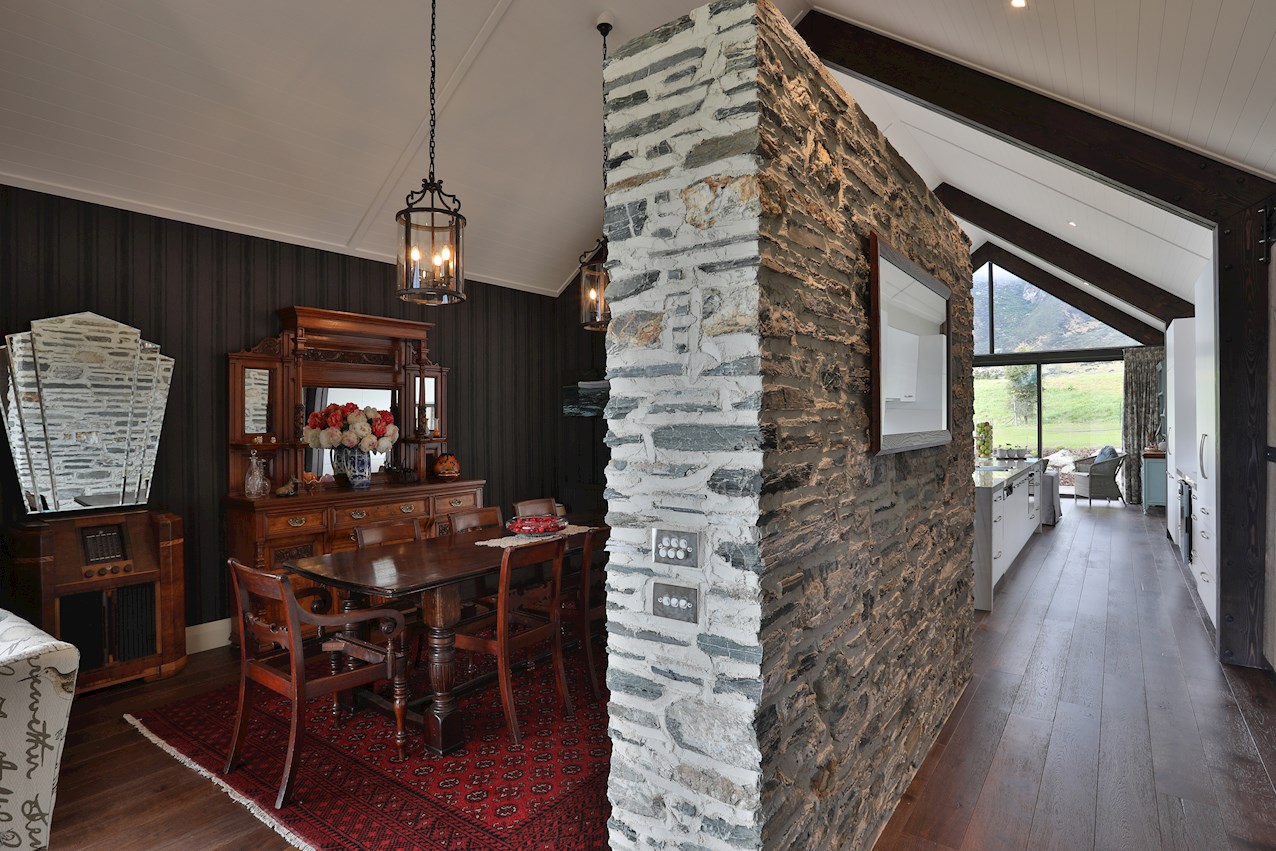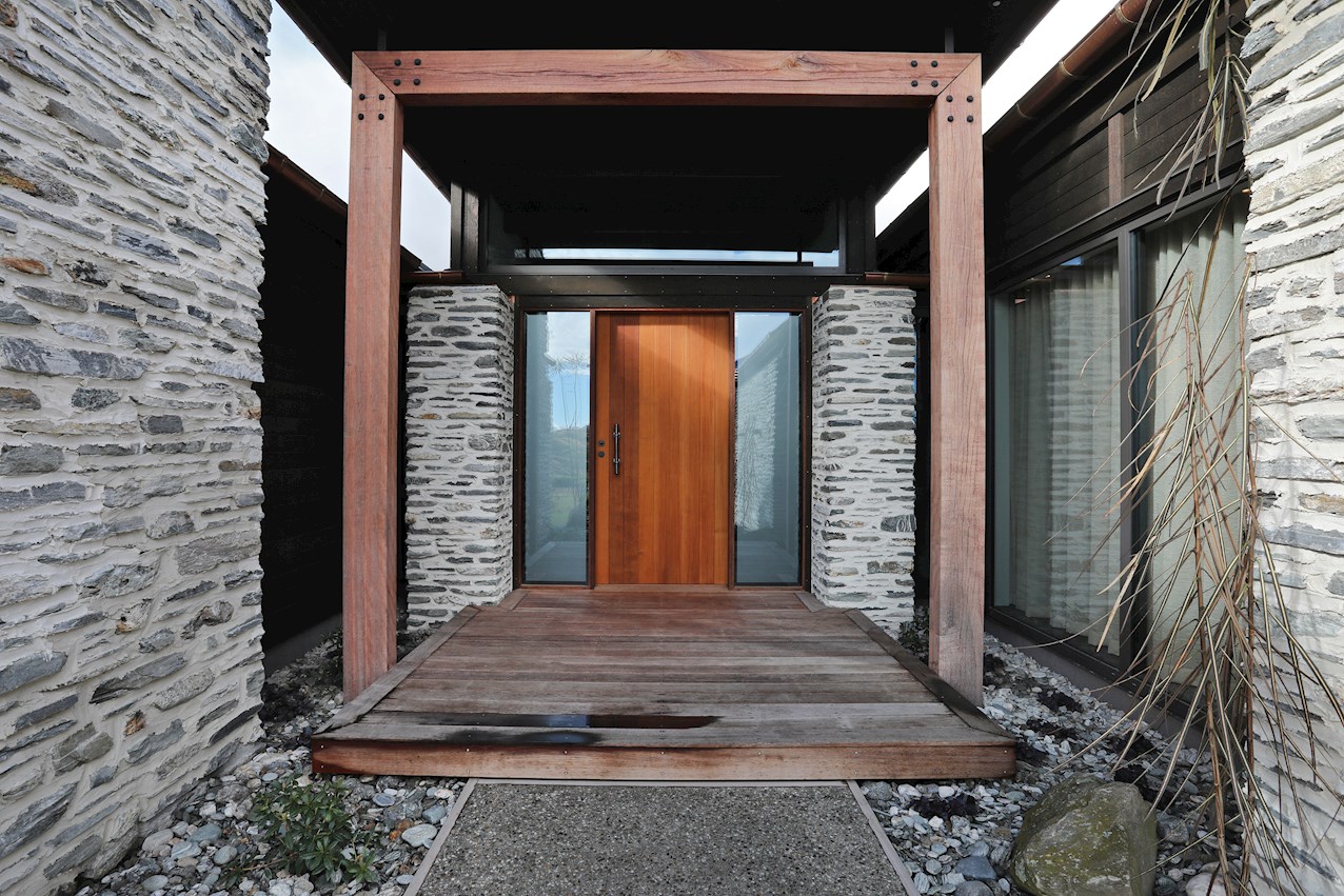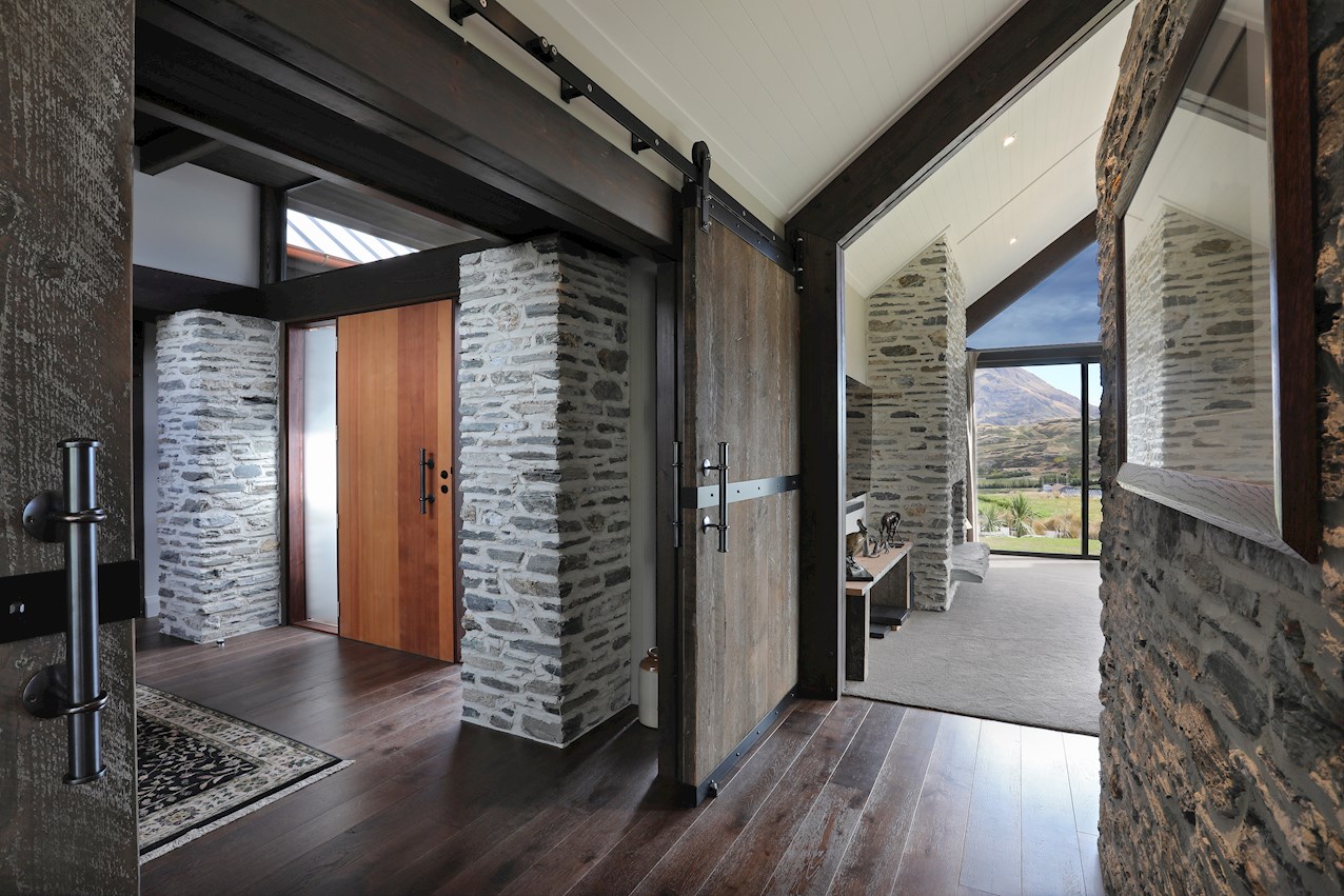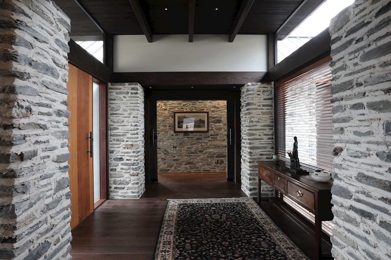 Neutral colours and natural materials ensure the home is in harmony with its environment. Timber and tone clad the exterior. Exposed frames and beams add beautiful depth to the open-plan living area and entry. Schist walls bridge the gap between inside and out.
