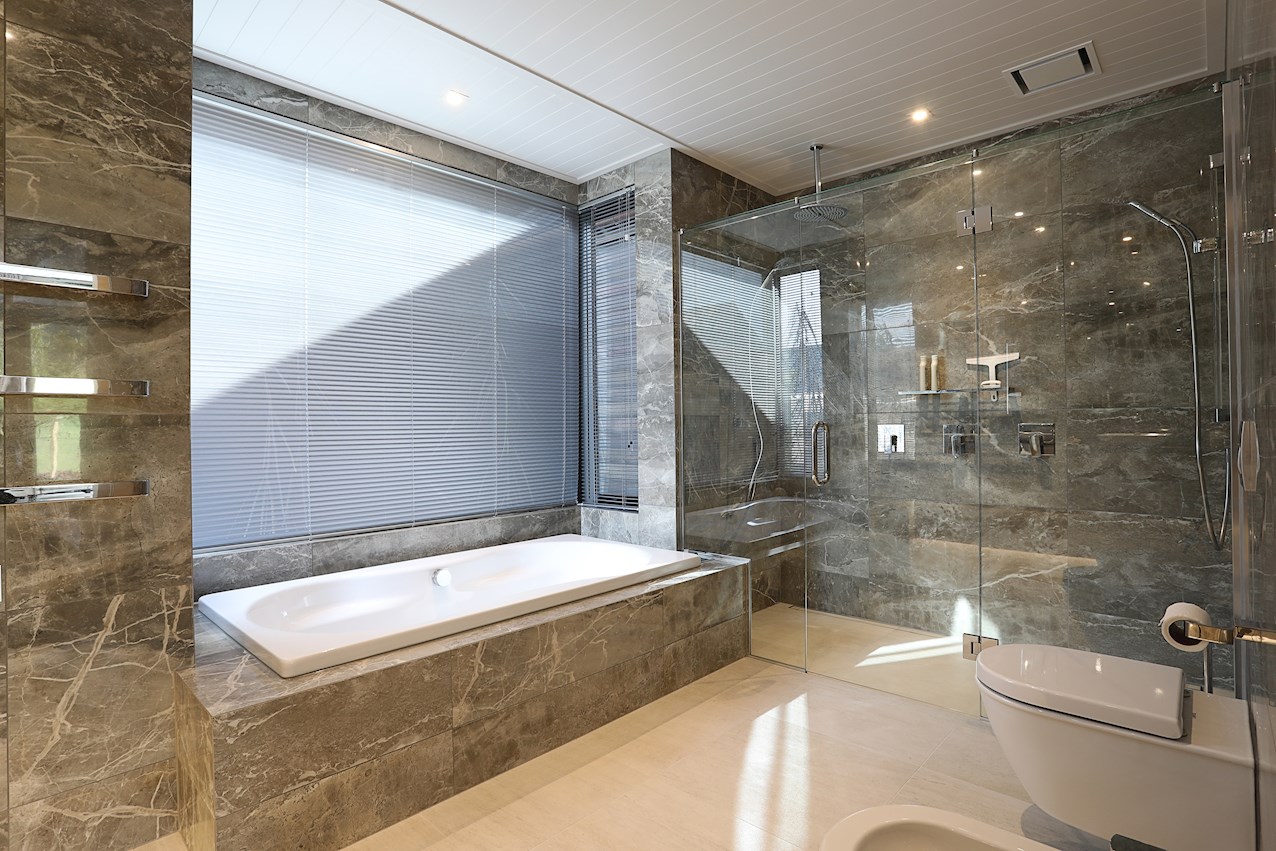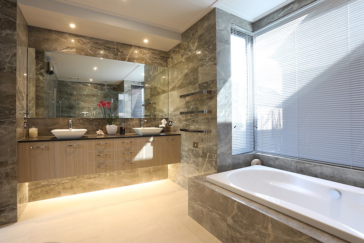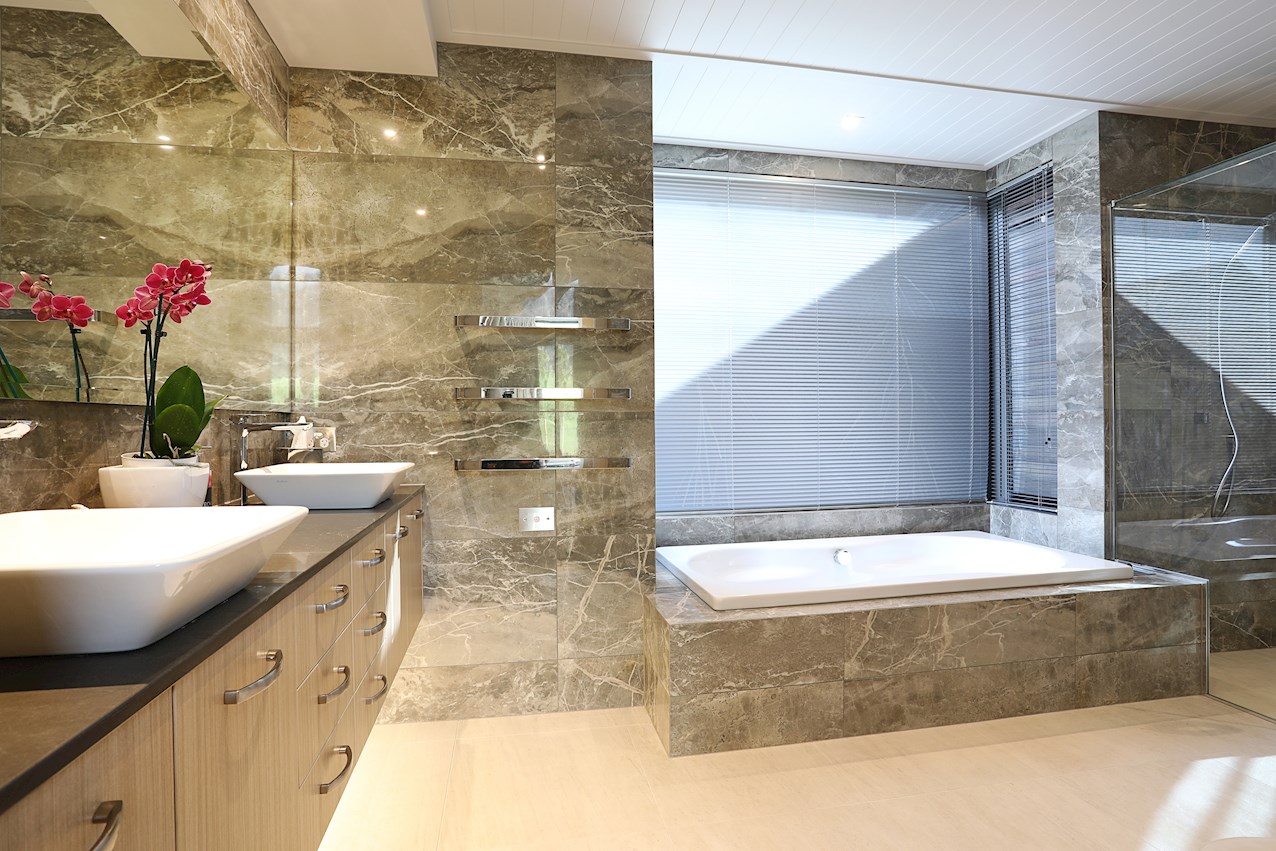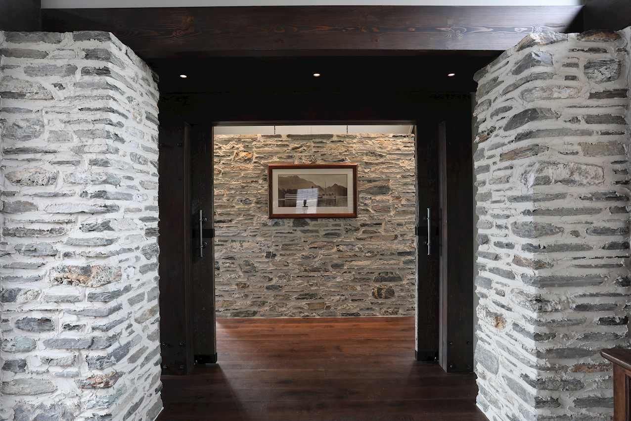 Neutral colours and natural materials ensure the home is in harmony with its environment. Timber and tone clad the exterior. Exposed frames and beams add beautiful depth to the open-plan living area and entry. Schist walls bridge the gap between inside and out.