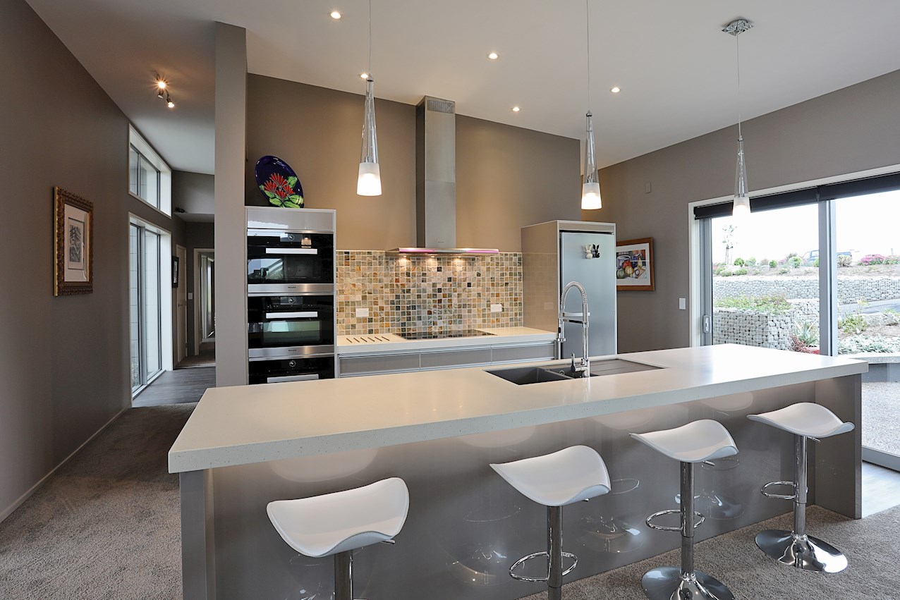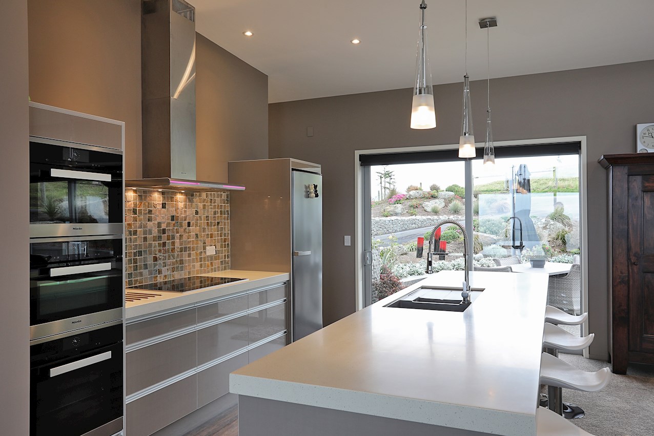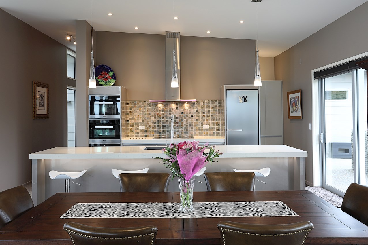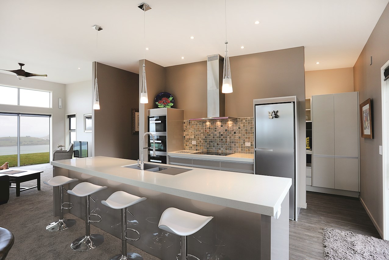 Central to the living spaces is the contemporary kitchen with island bench. Here, the resident entertainer can indulge their passion for cooking or cocktails. To ensure mess-free mingling, a scullery is concealed backstage.