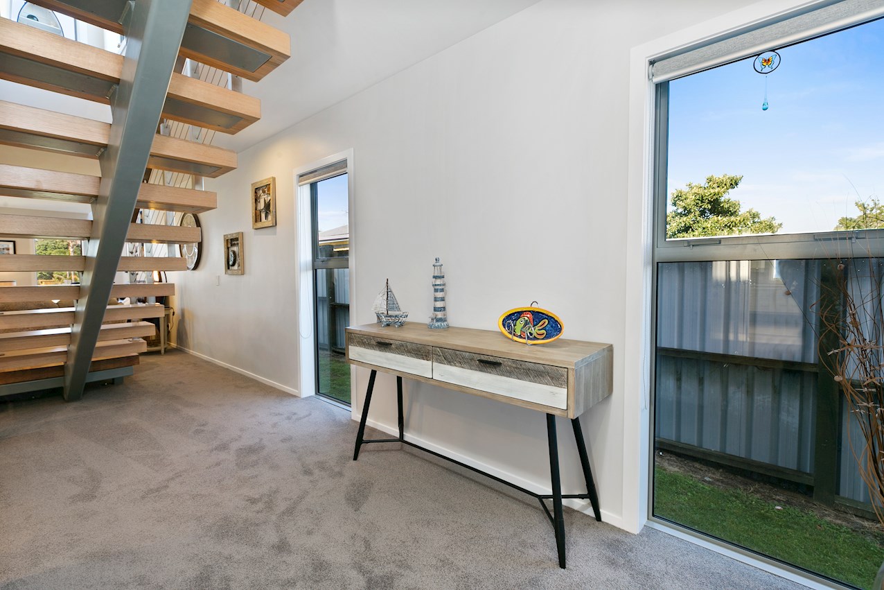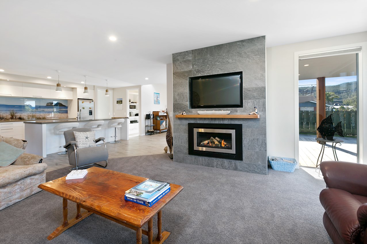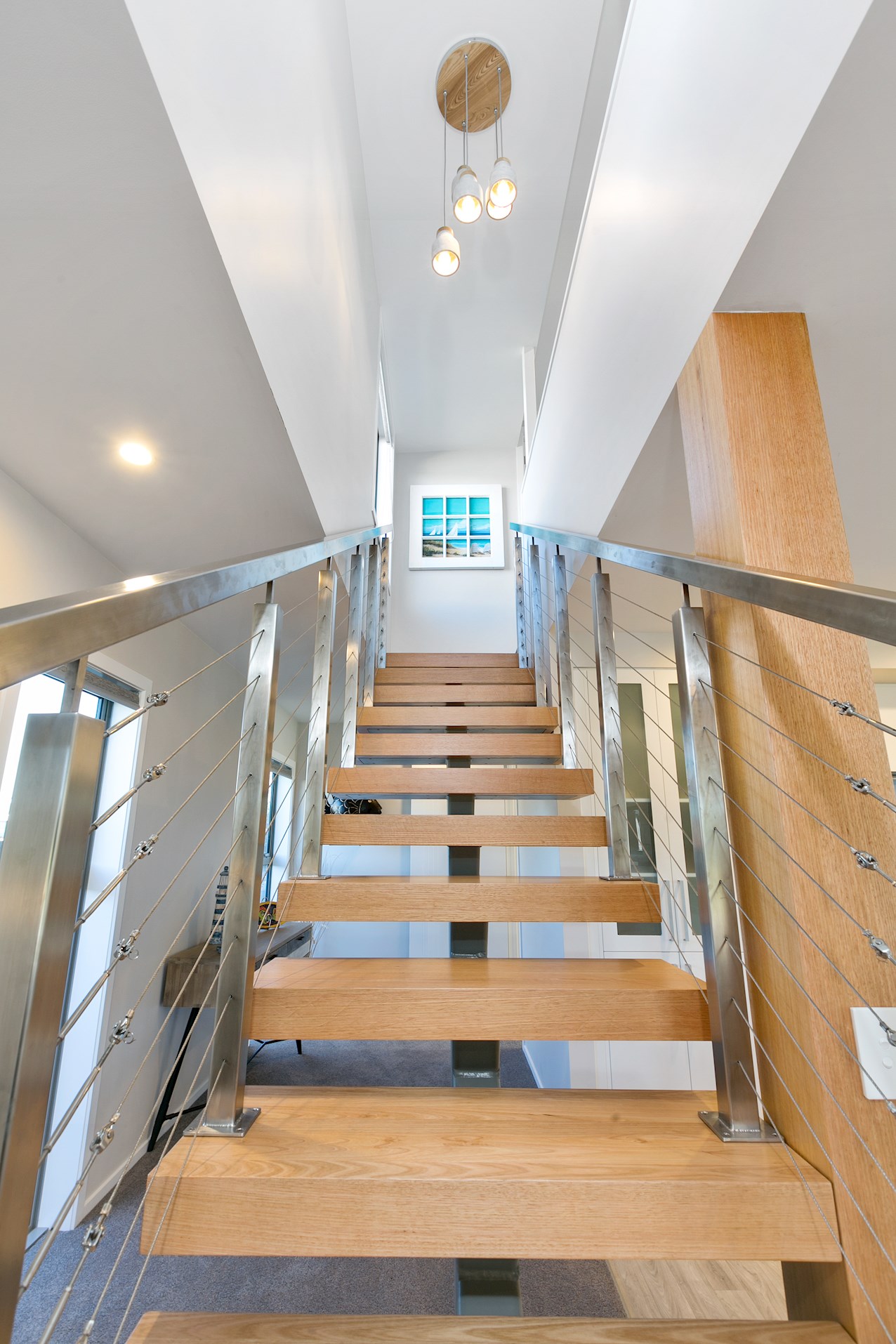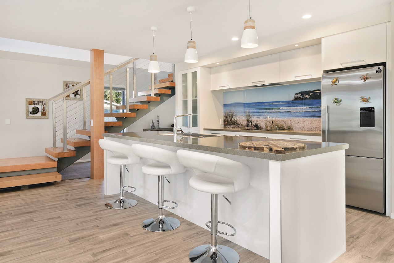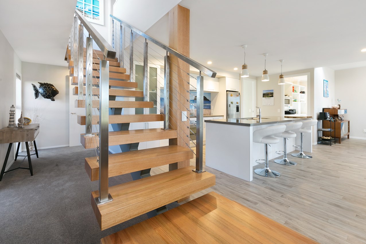 An exposed steel staircase with solid oak treads provides an elegant link between levels. A fireplace warms the downstairs living area. The modern kitchen delivers the photo finish – the splashback displays an image of the local beach, taken by the owner.