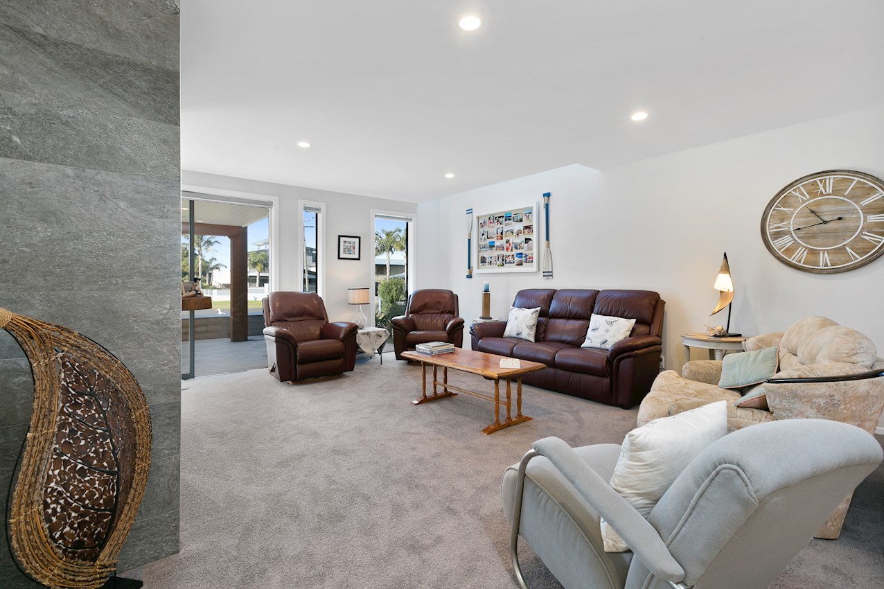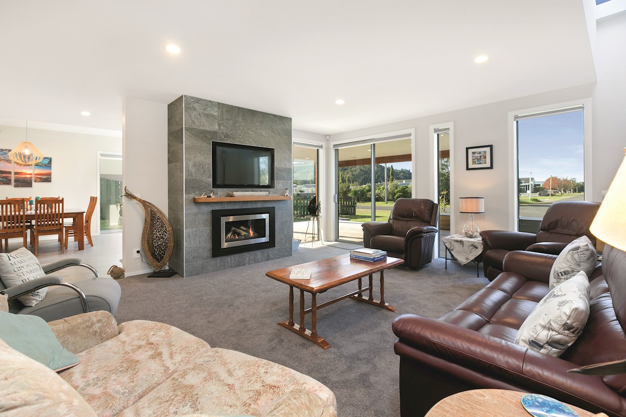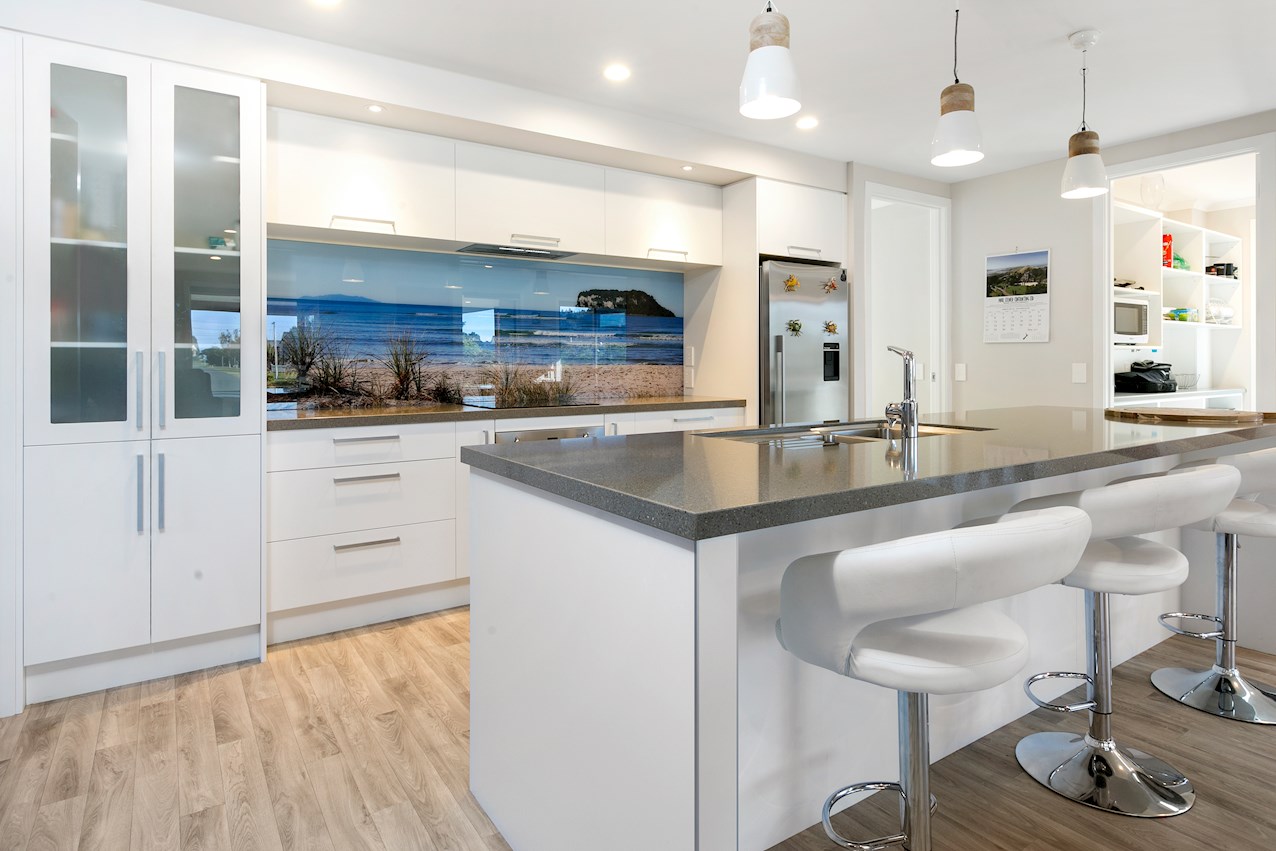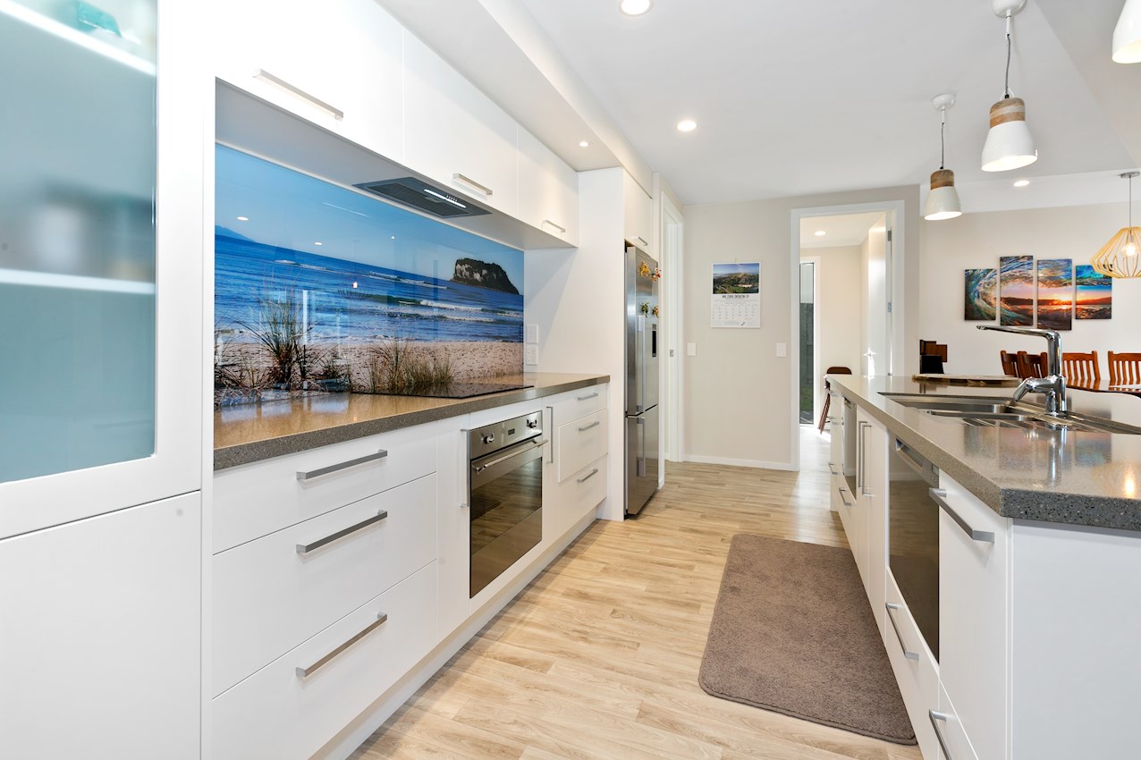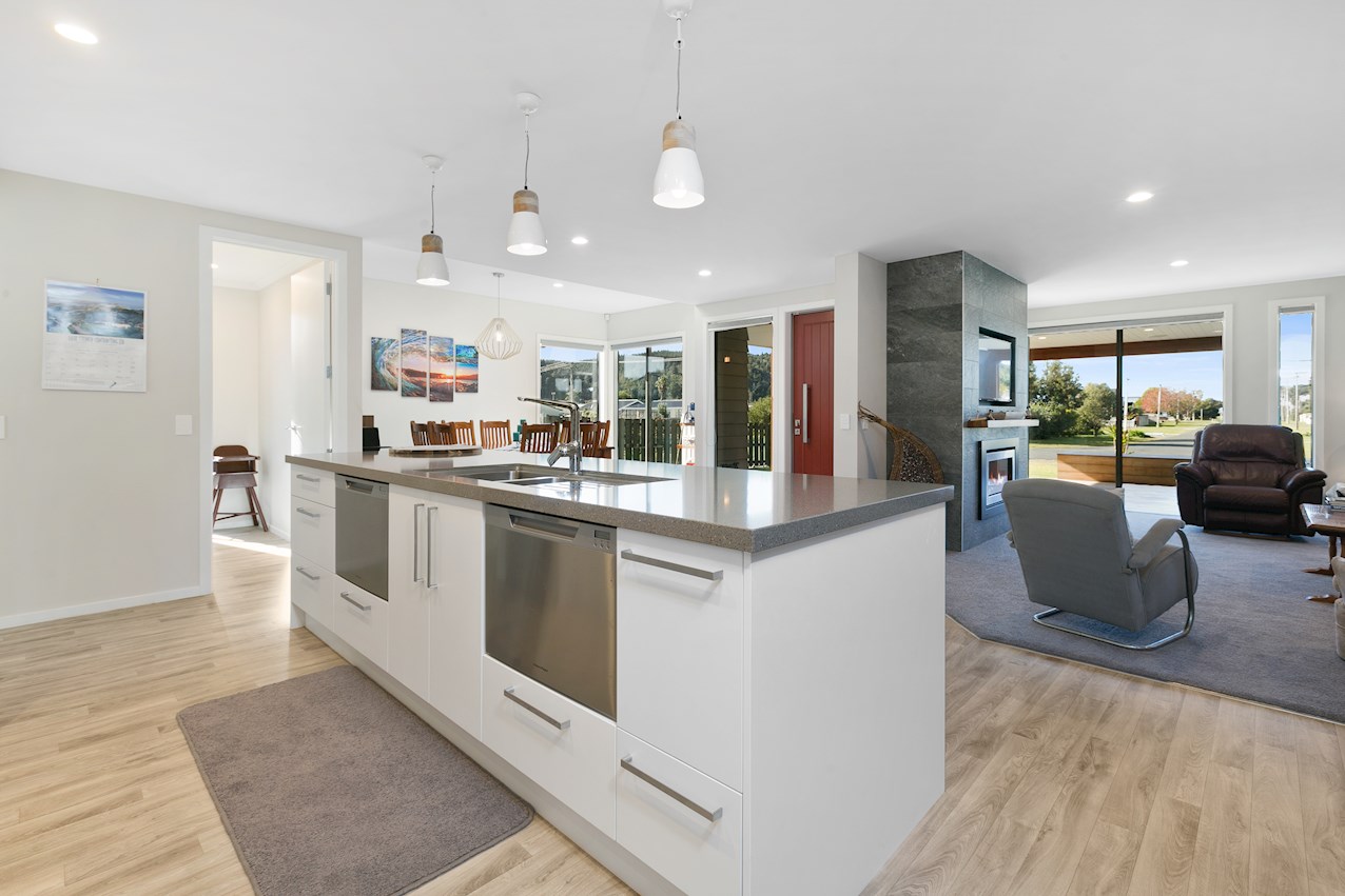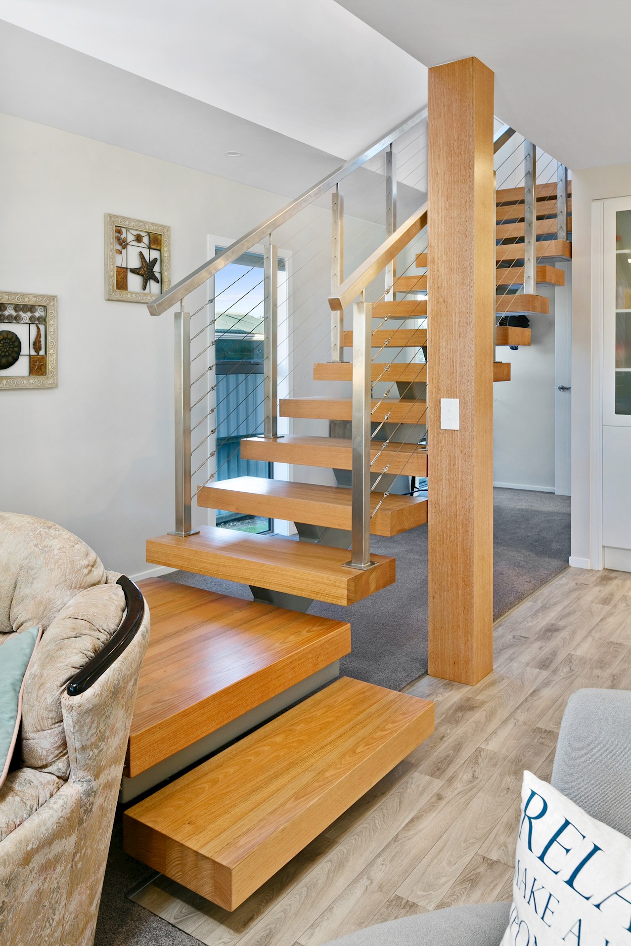 An exposed steel staircase with solid oak treads provides an elegant link between levels. A fireplace warms the downstairs living area. The modern kitchen delivers the photo finish – the splashback displays an image of the local beach, taken by the owner.