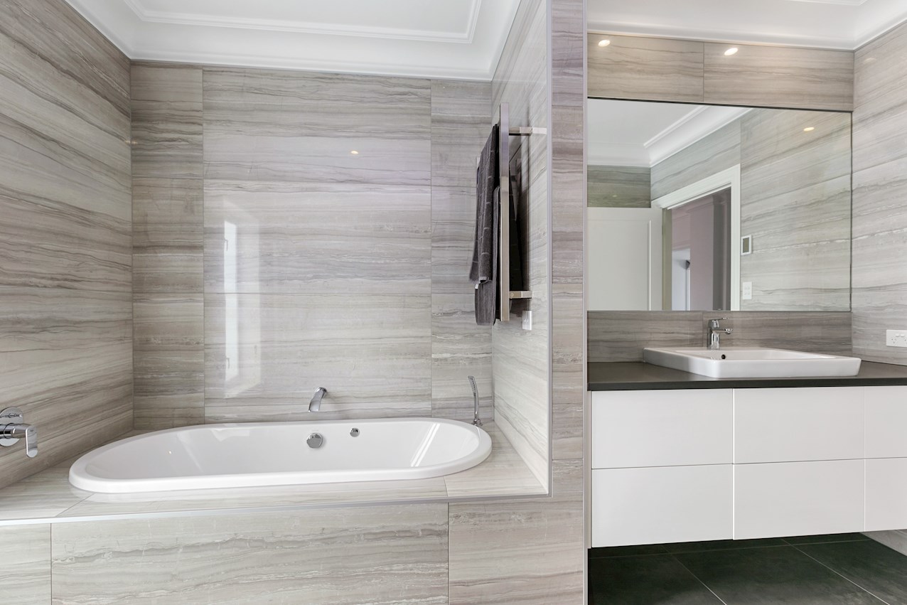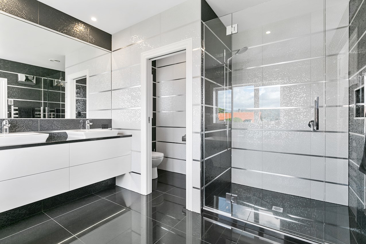 But you only need look at the kitchen and bathrooms to see that this home isn’t completely hung up on tradition. The latest appliances in the entertainer’s space and scullery cater to gatherings relaxed and refined. The master ensuite is dazzling in black and white. A glazed shower, double vanity, separate toilet and large mirror all enhance this retreat for two.