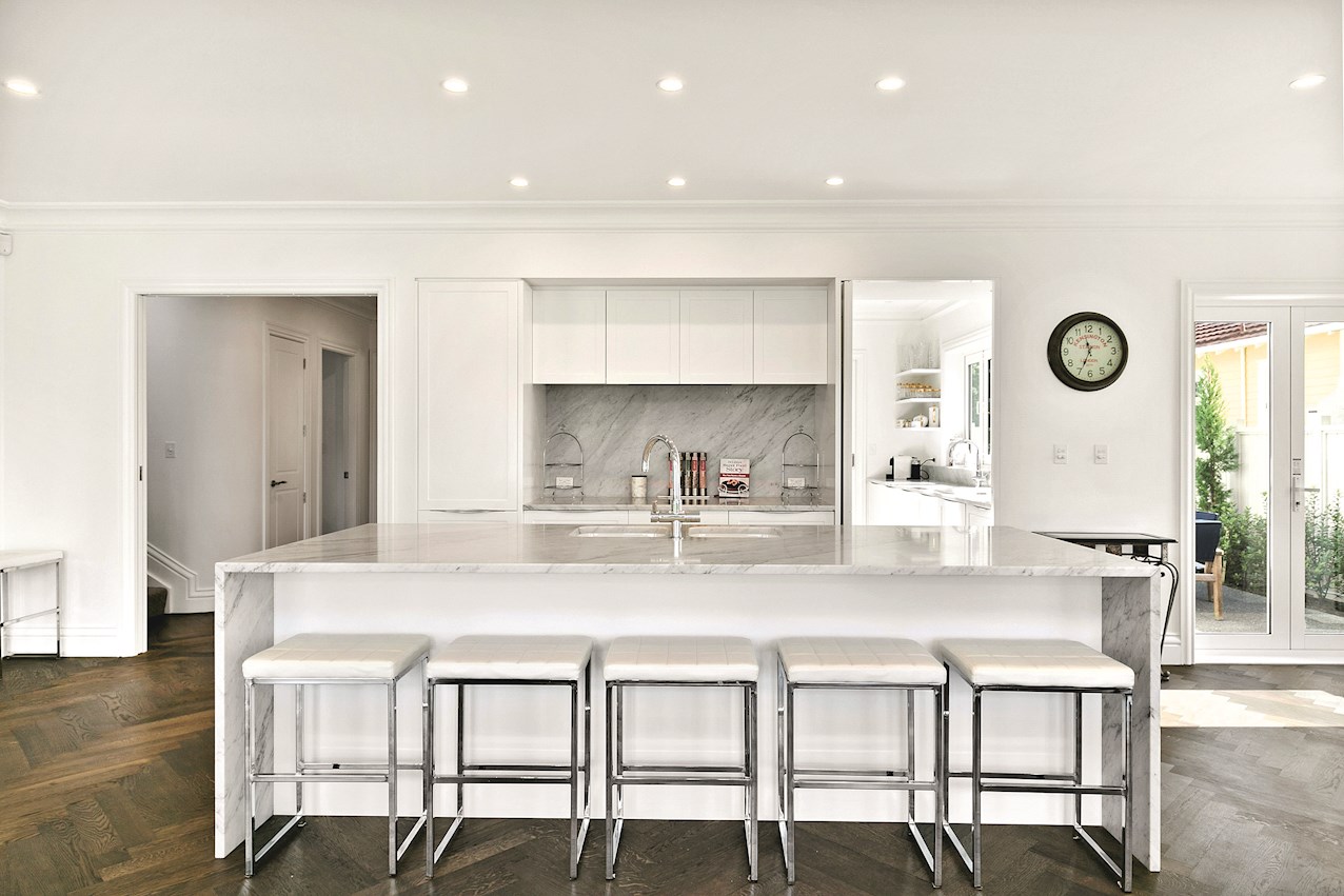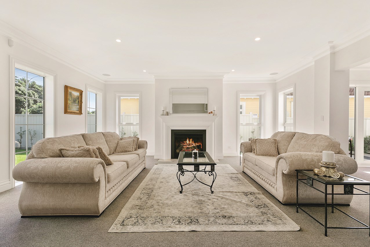 Parquet flooring steals the show at the entrance, drawing the eye through the spine of the home to the rear landscape. Downstairs living rooms branch off the main hallway, creating natural flow to these separated rooms. Moulded skirtings and inviting open fireplaces give a nod to the past.