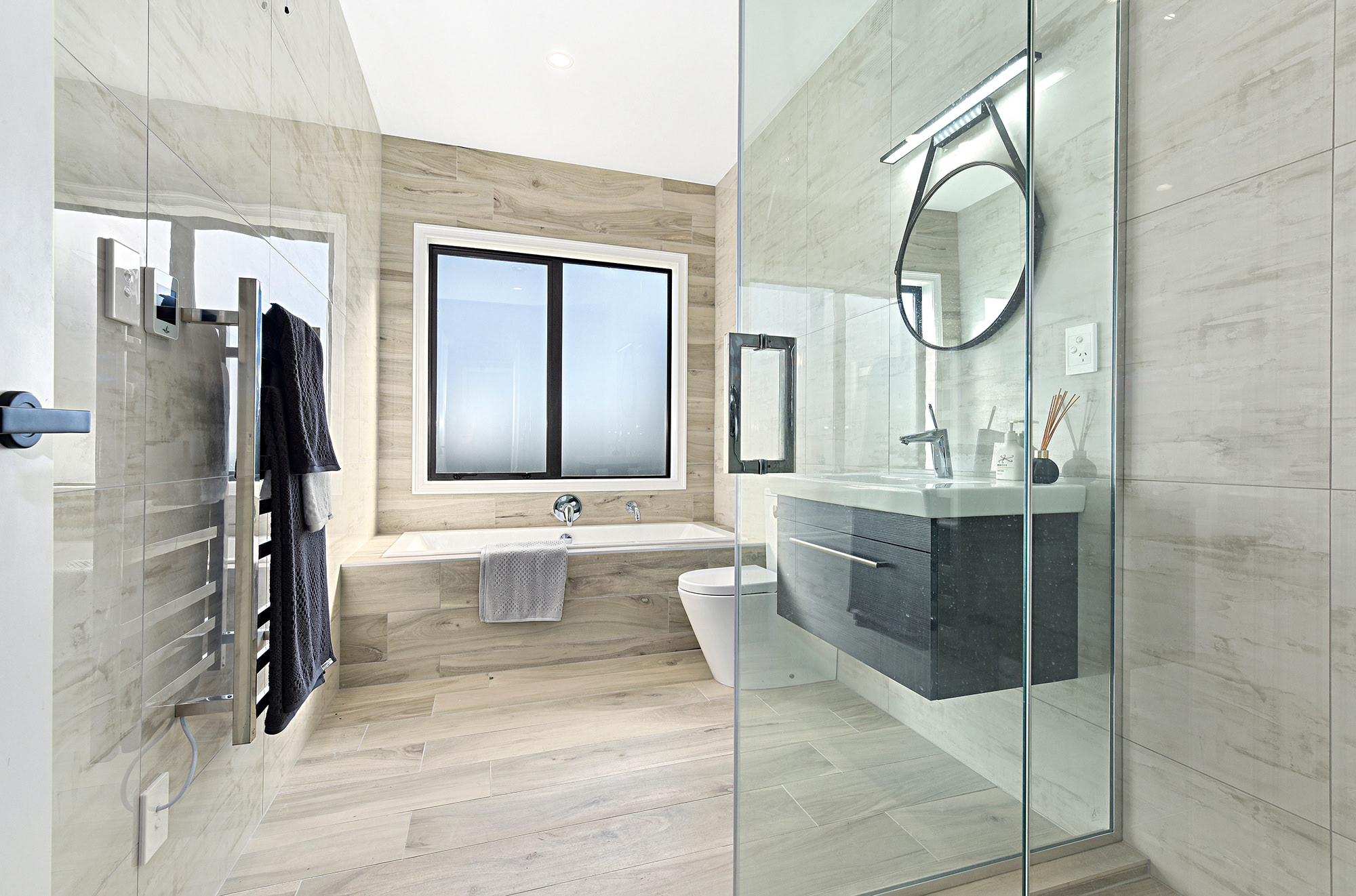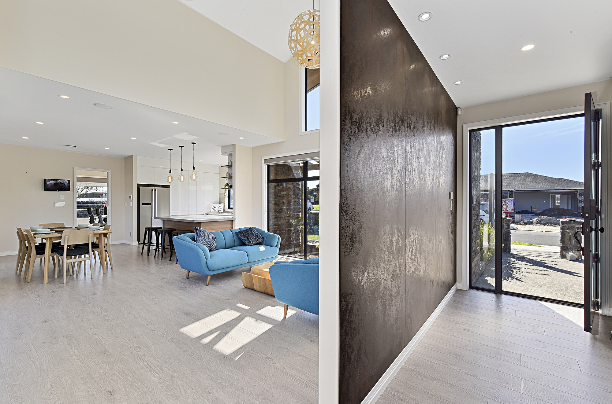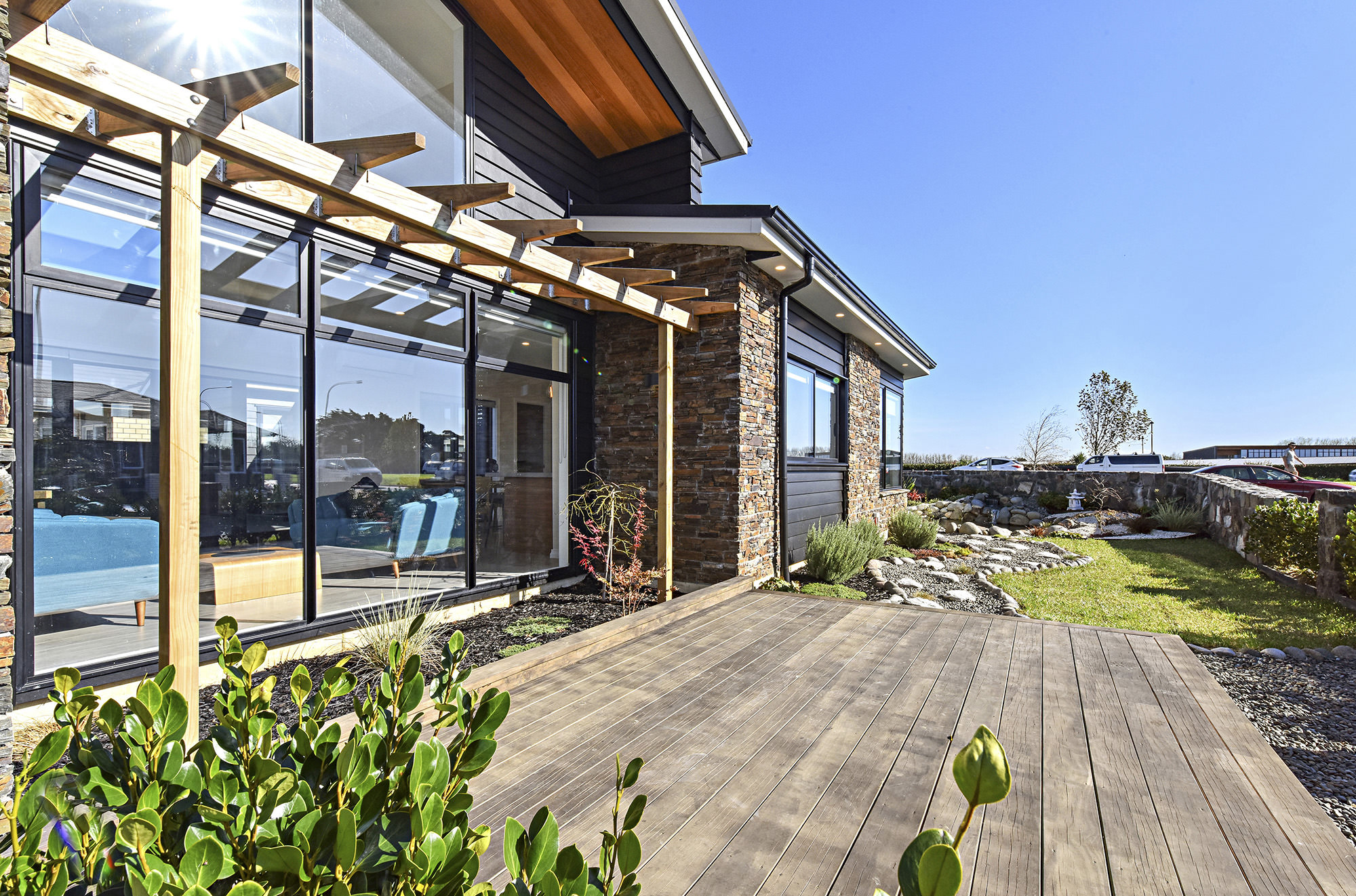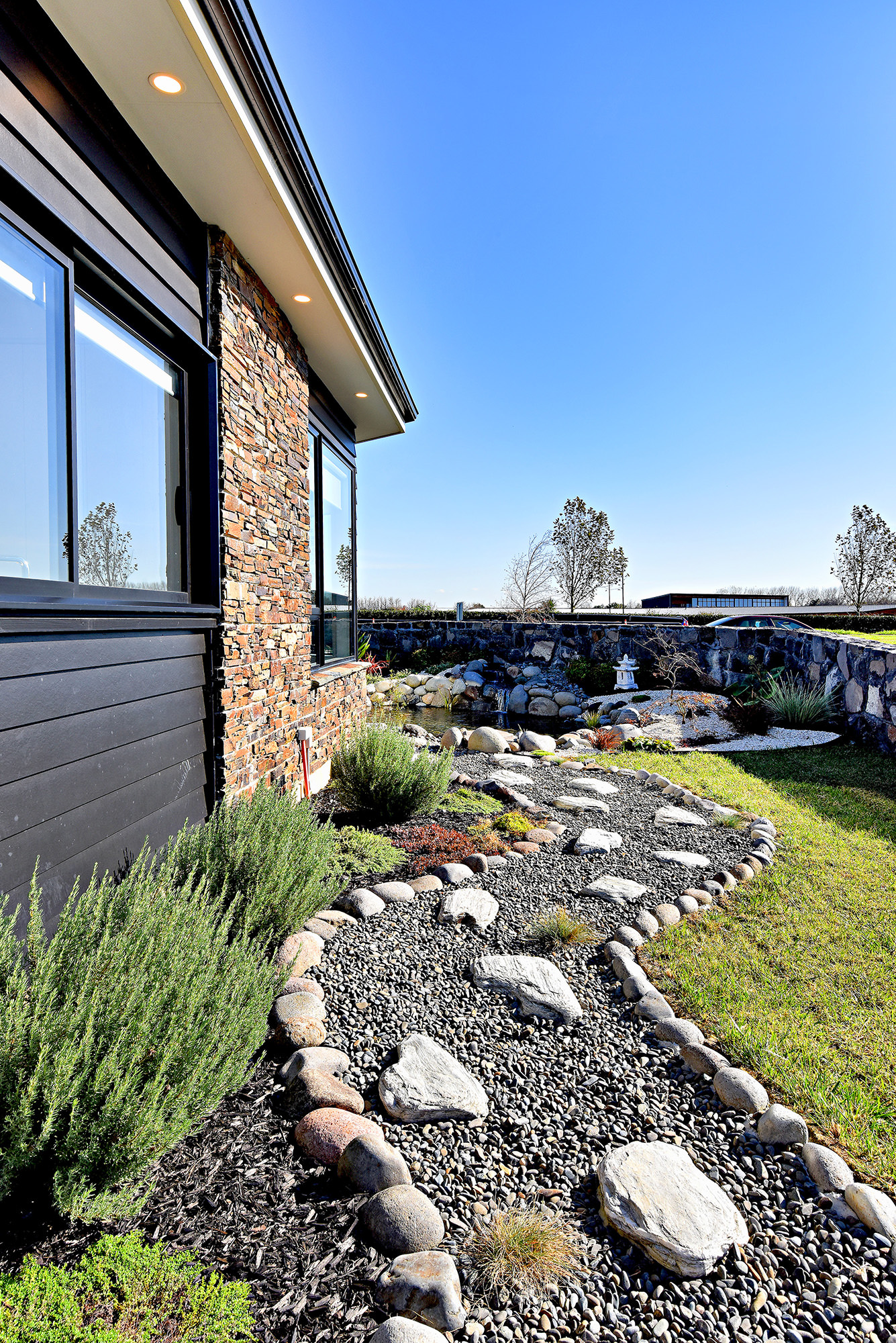 Located in the rolling green south of Auckland, this contemporary Zen masterpiece finds harmony in the meeting of traditional and modern design styles. Built with a natural flow in mind, the house features an eye-opening Caesarstone entry that moves right into the main living area. Here, super-high ceilings trap auspicious “chi”, drawing in a wealth of sunshine. Seamlessly integrated with an open kitchen, the main living space is relaxed and functional. The high raking ceiling gives this area a sense of lightness and spaciousness. The rooms in this property – four bedrooms, three bathrooms, two living areas – create a natural curve around the outdoor living area. This gives each one privacy, with a view to the contoured deck. At the front of the property, an intricately crafted Zen pond and fountain sit in absolute serenity to calmly welcome visitors. For a more immersive experience, retreat to the main bathroom. Light, wood-look tiling envelops the bathtub with a calming sense of nature.