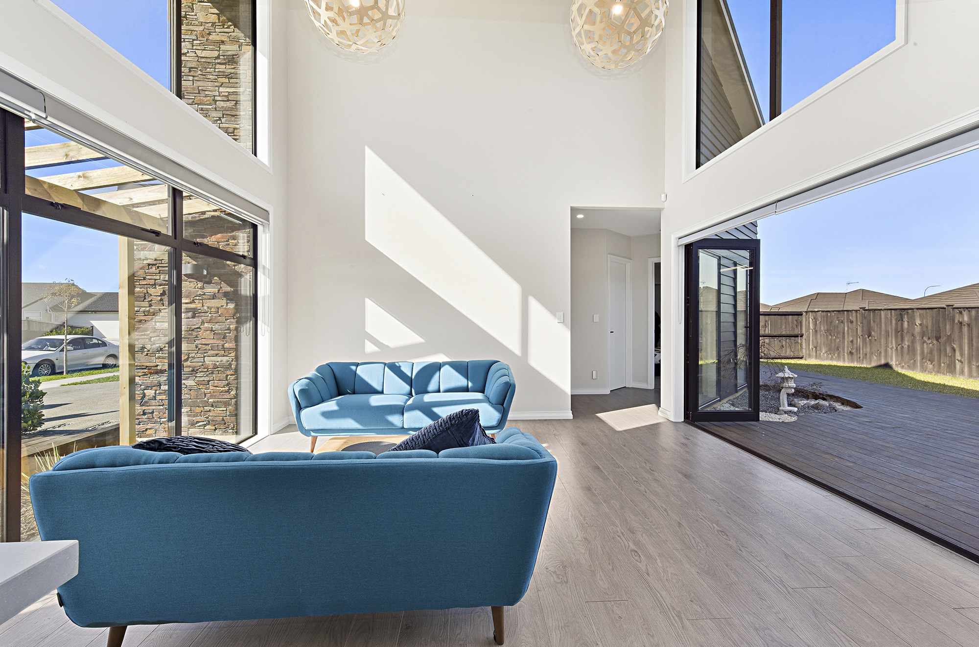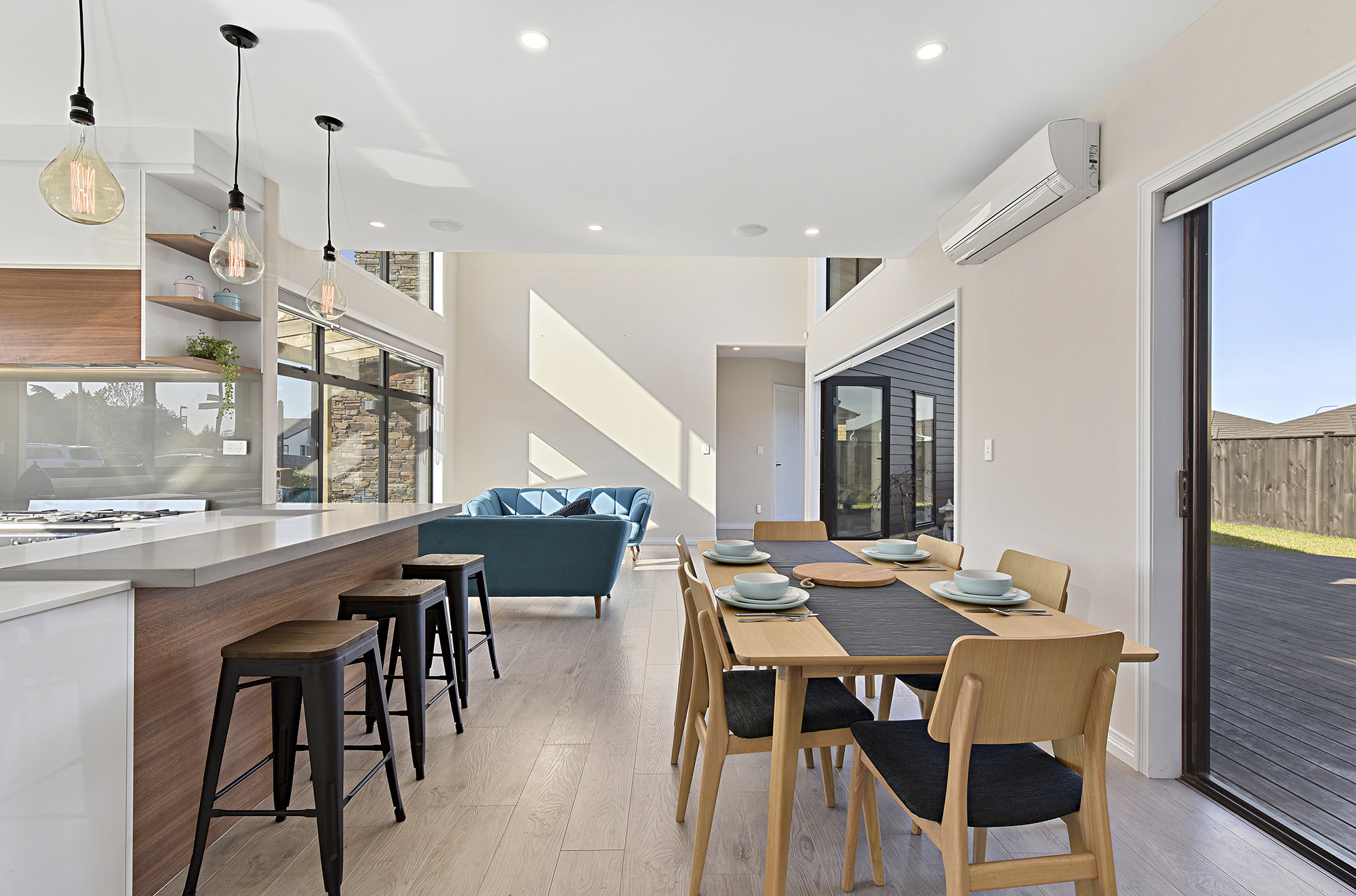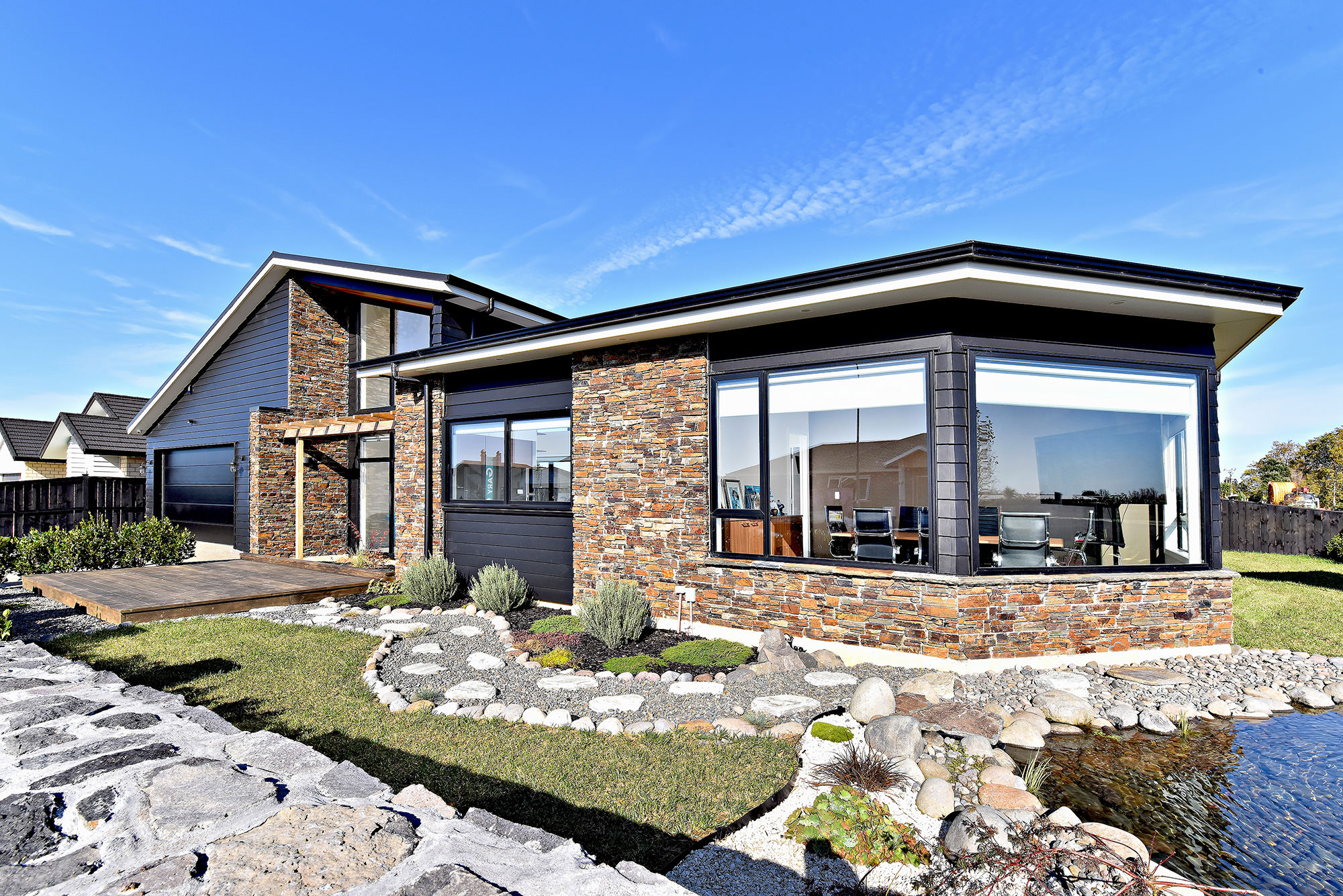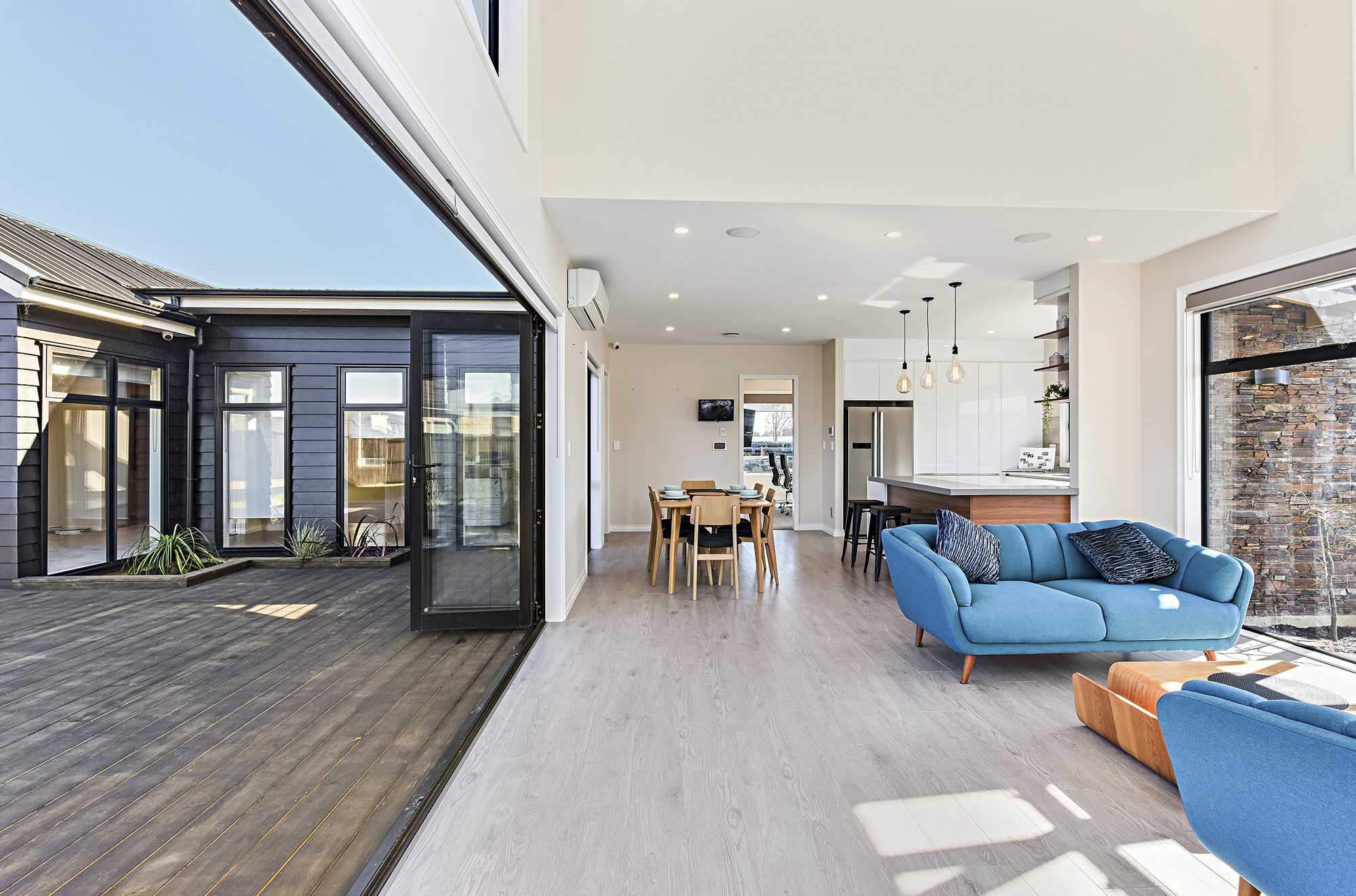 Located in the rolling green south of Auckland, this contemporary Zen masterpiece finds harmony in the meeting of traditional and modern design styles. Built with a natural flow in mind, the house features an eye-opening Caesarstone entry that moves right into the main living area. Here, super-high ceilings trap auspicious “chi”, drawing in a wealth of sunshine. Seamlessly integrated with an open kitchen, the main living space is relaxed and functional. The high raking ceiling gives this area a sense of lightness and spaciousness. The rooms in this property – four bedrooms, three bathrooms, two living areas – create a natural curve around the outdoor living area. This gives each one privacy, with a view to the contoured deck. At the front of the property, an intricately crafted Zen pond and fountain sit in absolute serenity to calmly welcome visitors. For a more immersive experience, retreat to the main bathroom. Light, wood-look tiling envelops the bathtub with a calming sense of nature.