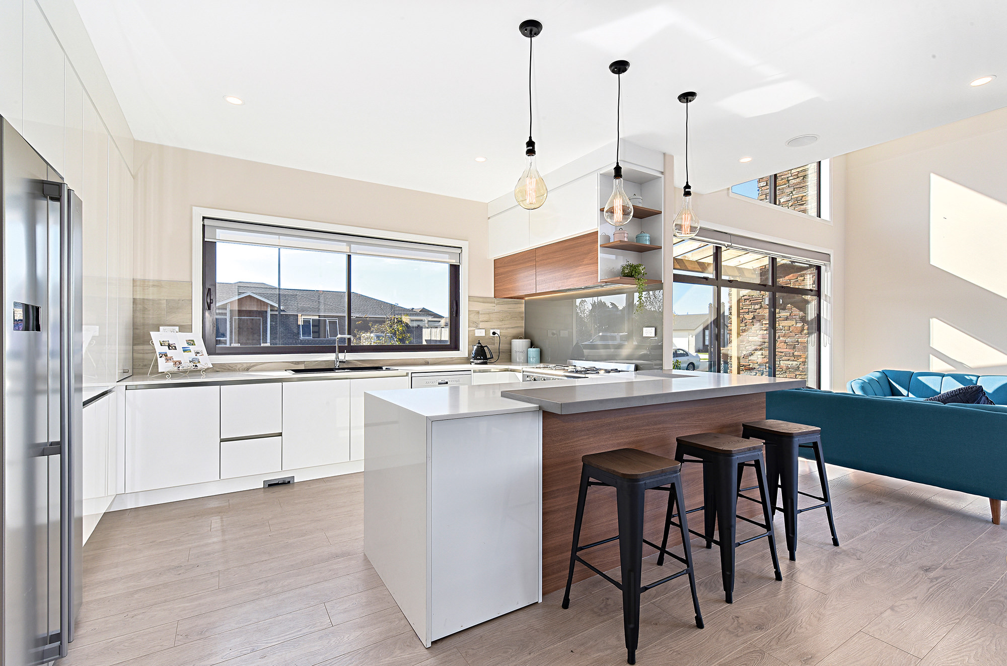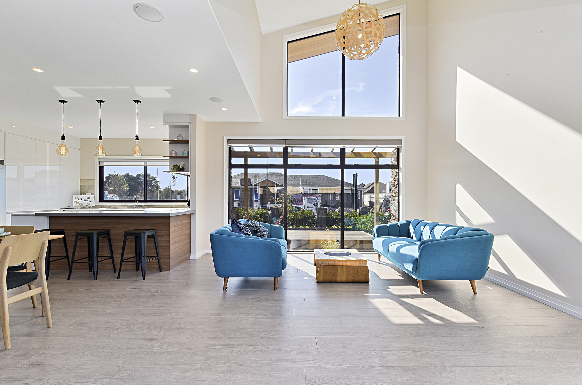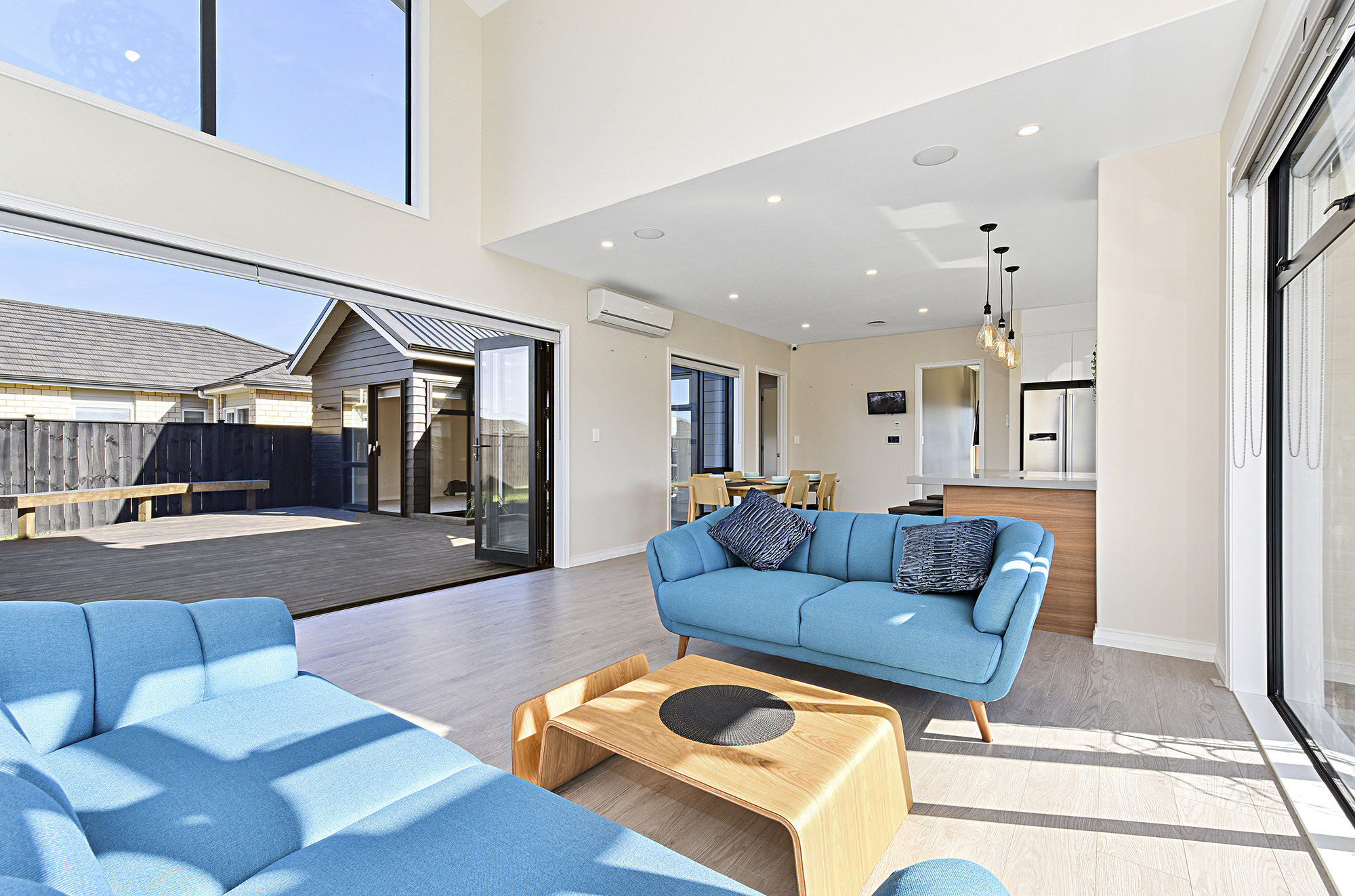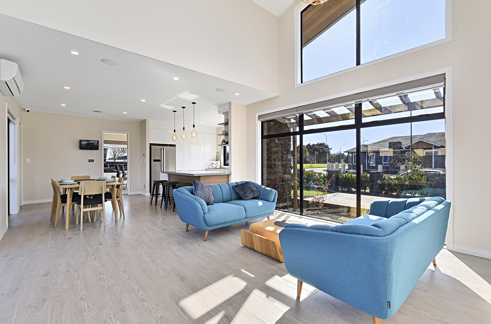 Located in the rolling green south of Auckland, this contemporary Zen masterpiece finds harmony in the meeting of traditional and modern design styles. Built with a natural flow in mind, the house features an eye-opening Caesarstone entry that moves right into the main living area. Here, super-high ceilings trap auspicious “chi”, drawing in a wealth of sunshine. Seamlessly integrated with an open kitchen, the main living space is relaxed and functional. The high raking ceiling gives this area a sense of lightness and spaciousness. The rooms in this property – four bedrooms, three bathrooms, two living areas – create a natural curve around the outdoor living area. This gives each one privacy, with a view to the contoured deck. At the front of the property, an intricately crafted Zen pond and fountain sit in absolute serenity to calmly welcome visitors. For a more immersive experience, retreat to the main bathroom. Light, wood-look tiling envelops the bathtub with a calming sense of nature.