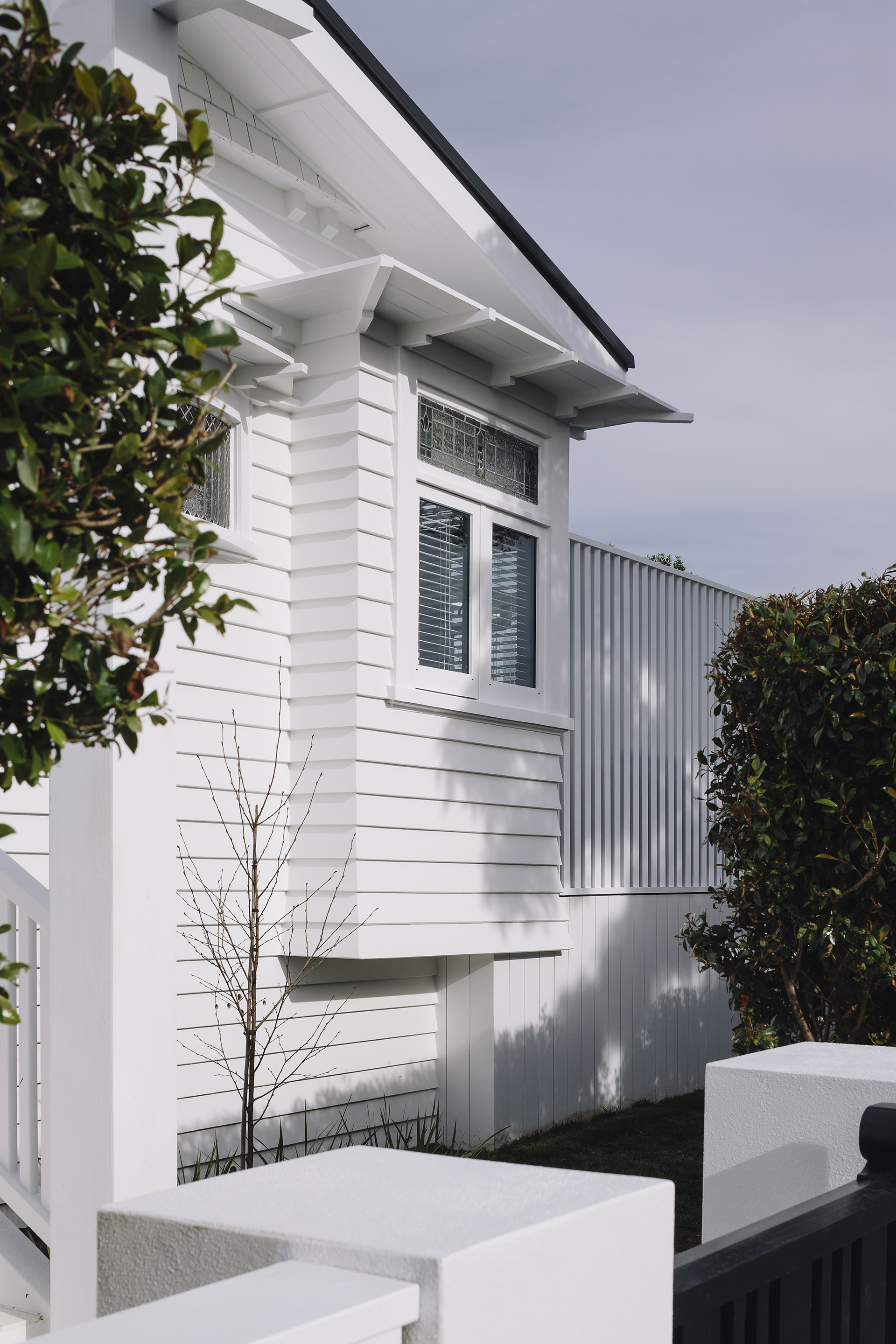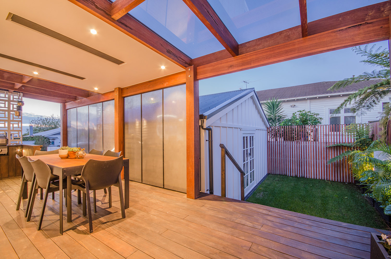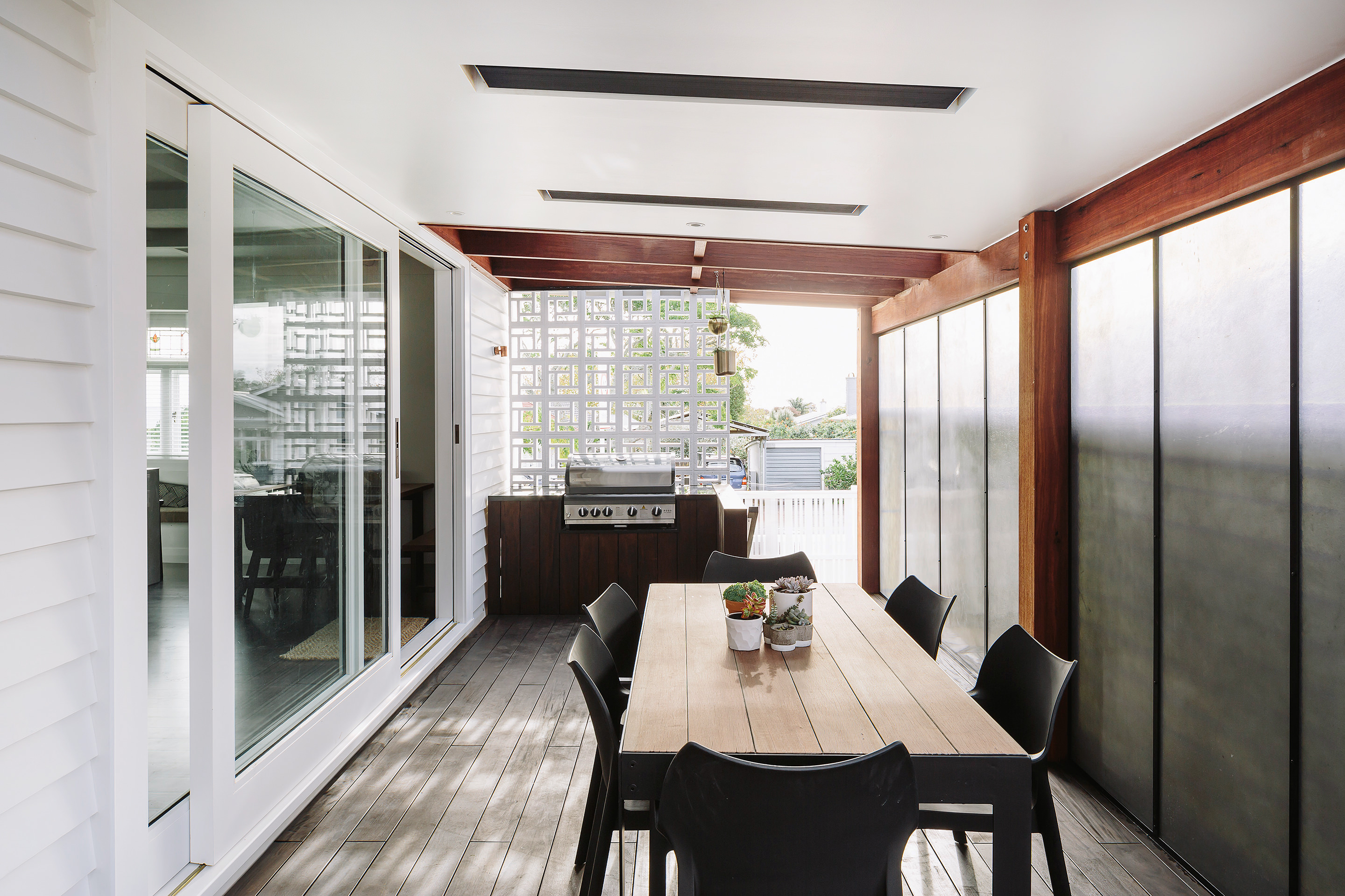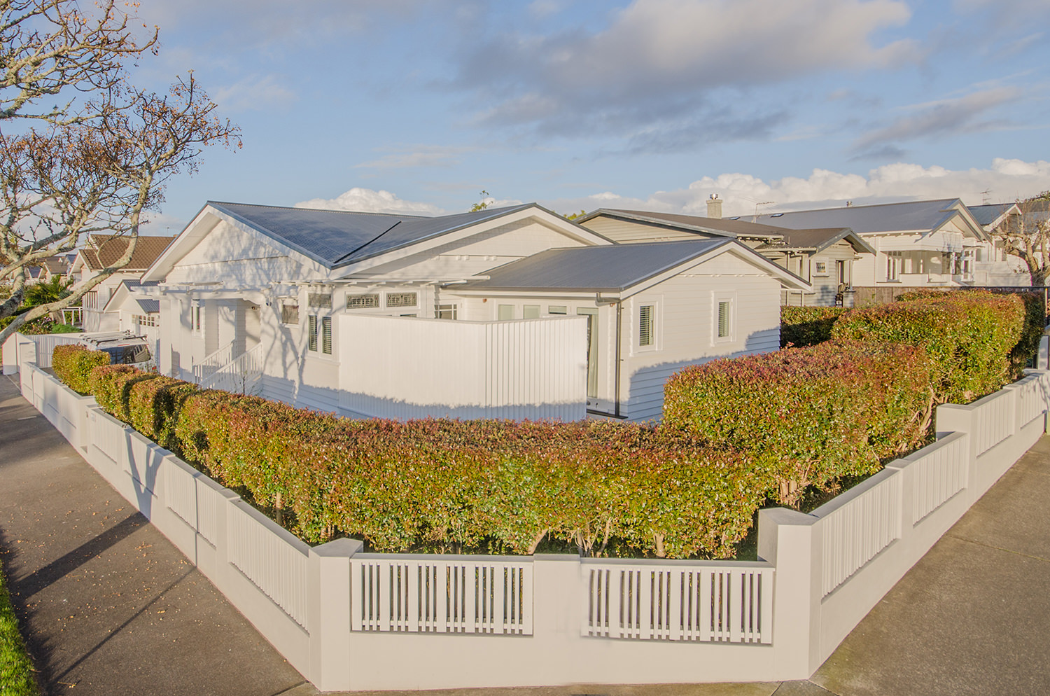 This iconic bungalow has been updated for modern living. Up a path of brushed-limestone pavers and through a stained glass door, this four-bedroom, two-bathroom family home has been redesigned with luxury fittings and decor. Light spills through the new double-glazed joinery into the living area, which retains original pressed ceilings and beams, but with new matai flooring. The newly installed Poggenpohl kitchen has a large gas hob set into the textured slate bench and splashback, and a special 6mm bead-blasted stainless steel island to complete the galley style, which flows out through large slider doors onto the deck. A hardwood pergola with glazed canopy provides sun screening and privacy for entertaining and there’s a custom built-in barbecue bench. The deck leads round to a tropical garden oasis for lounging in full sun. No stone has been left unturned to provide a quality environment with fully ducted air-conditioning and a temperature regulating and moisture control system, along with insulation throughout.