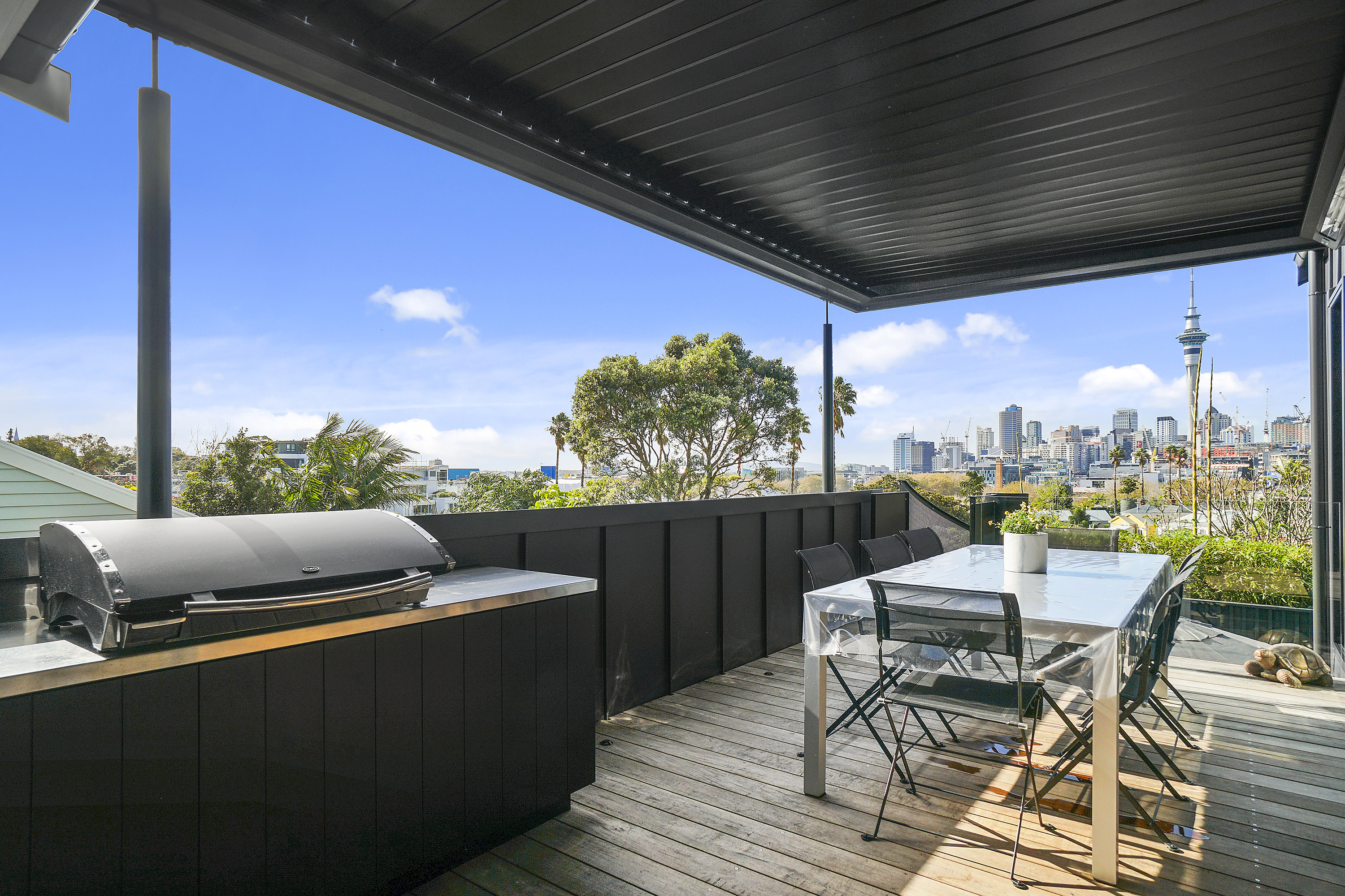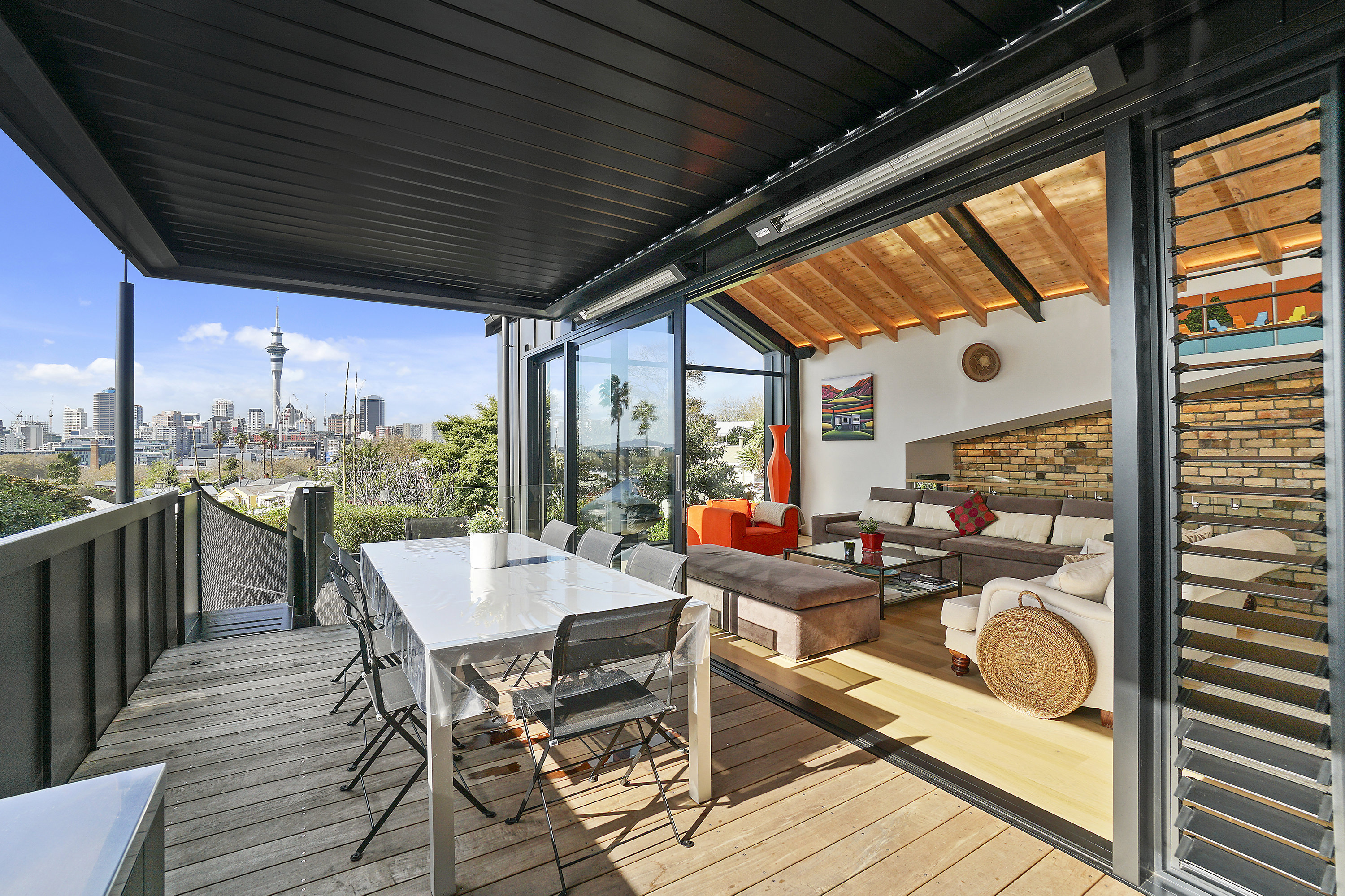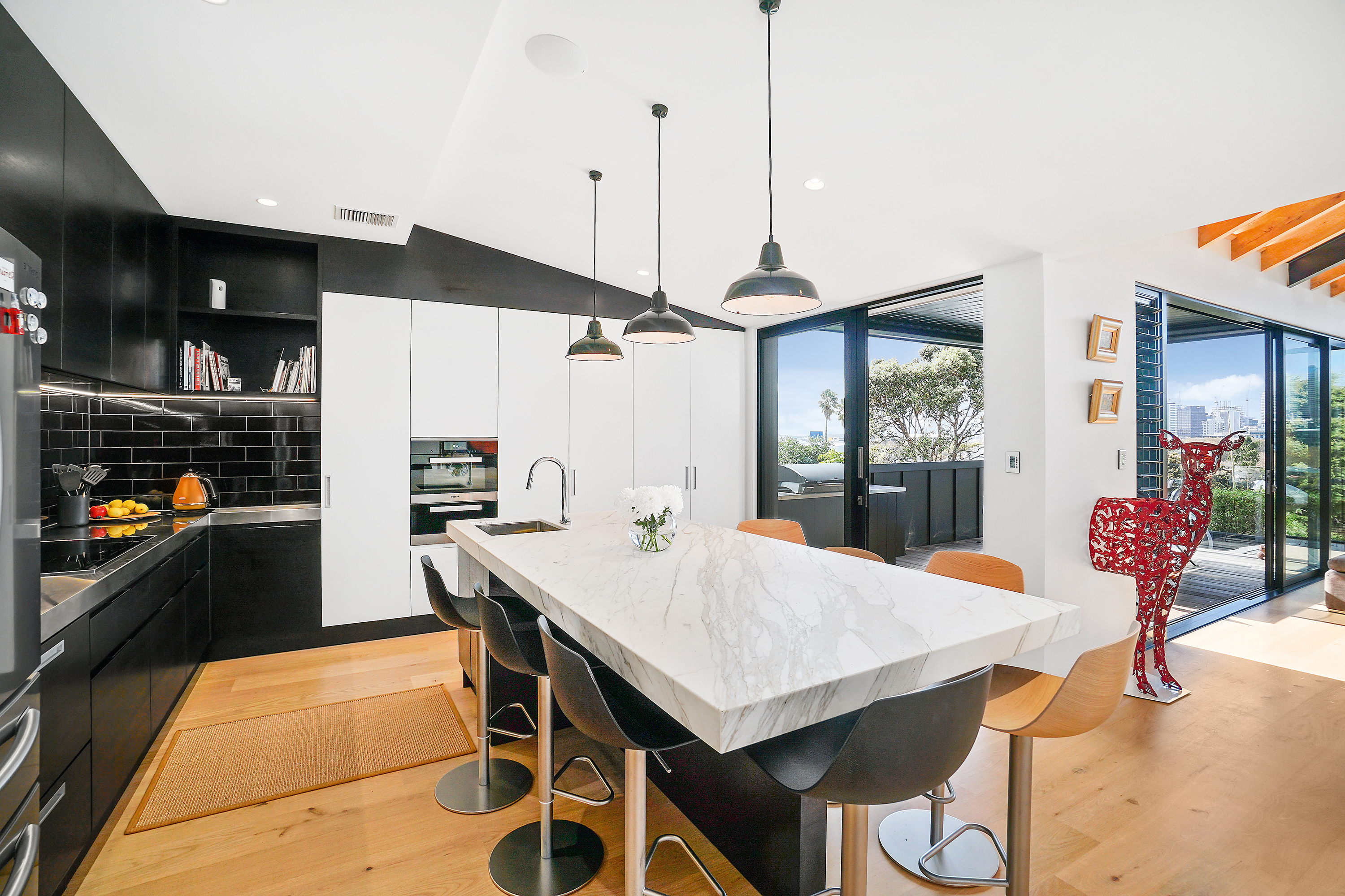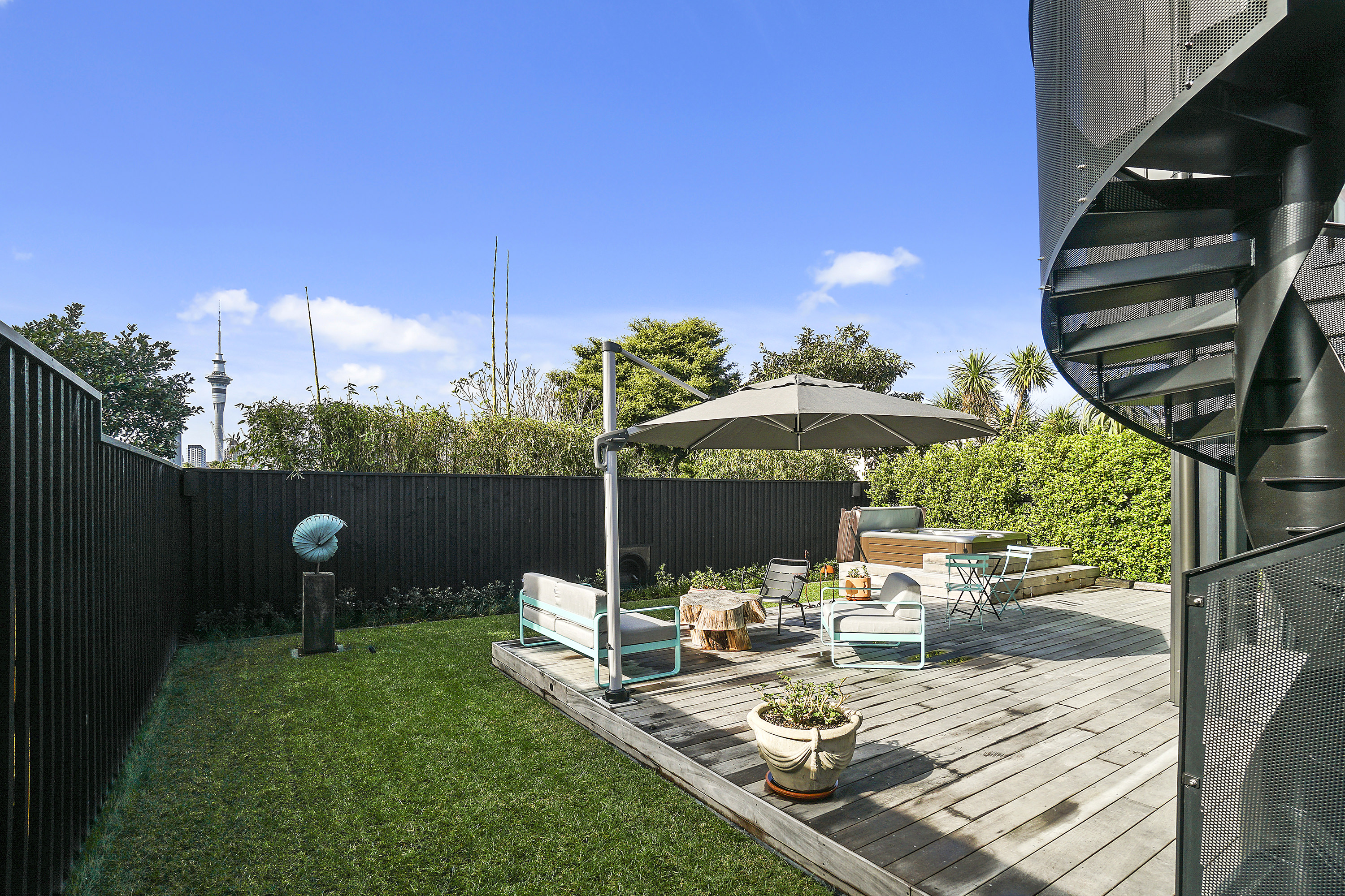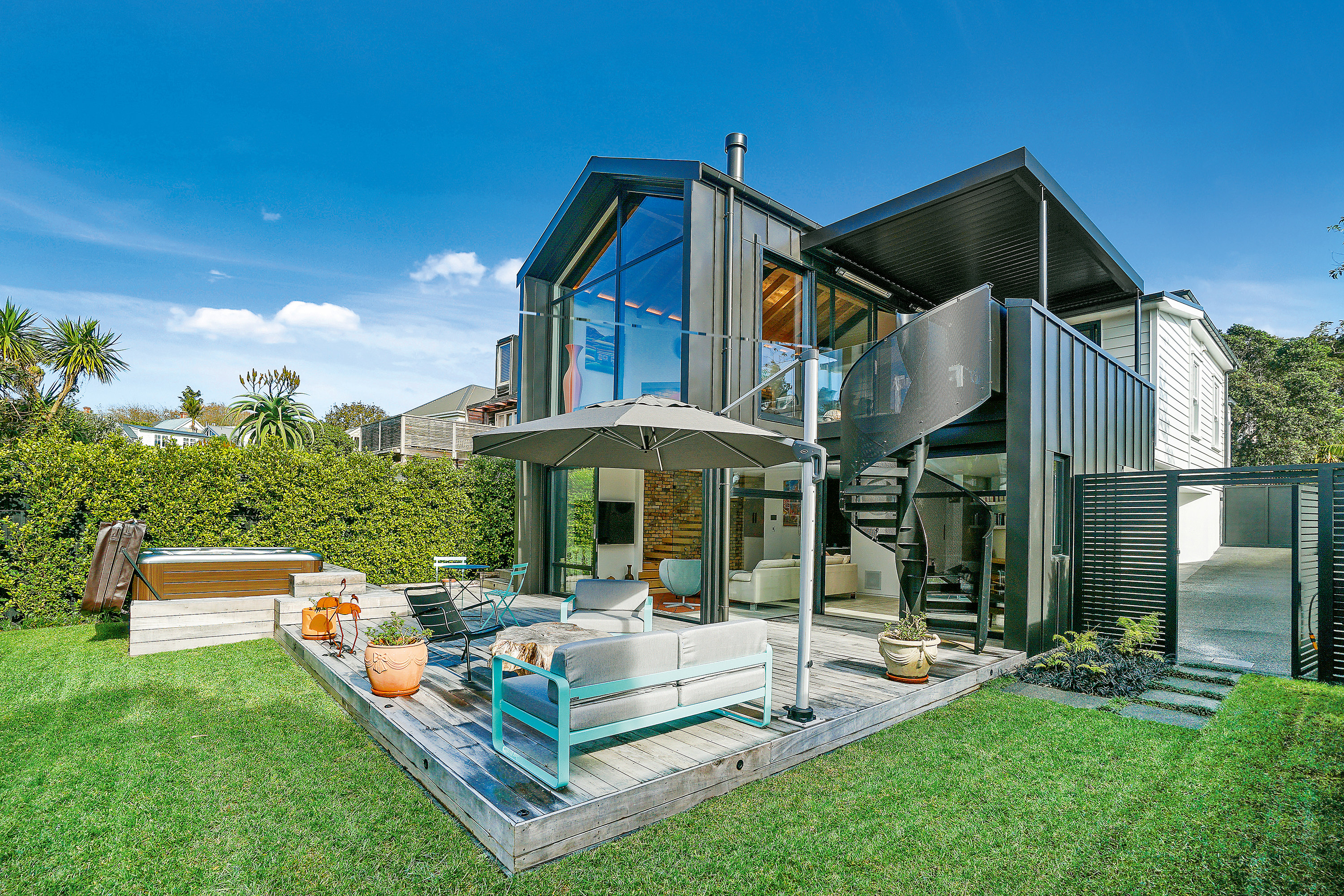 Nestled among heritage cottages in its historic inner-city Auckland suburb, this exceptional renovation delivers a hearty shot of adrenaline. Far from a simple makeover, the four-bedroom, three-bathroom masterpiece is a bold reflection of the owners’ interest in design, art and architecture. The front facade remains in tune with the streetscape. Defined by a black zinc-clad pavilion, the modern extension accommodates luxurious new living and kitchen areas. Natural light, warmth and city views flood in through masses of glass. Glazed sliding doors allow seamless flow to a large deck to the northwest. The existing cottage was reconfigured and renovated to provide new bedrooms and exquisite, extensively tiled bathrooms. Garaging and plenty of storage are neatly tucked away in the newly designed basement. Guests can enjoy their own room on the lower level, along with a separate living area which flows out onto an expansive northfacing deck and lawn. A sculptural black steel spiral staircase artfully links the outdoor living spaces.