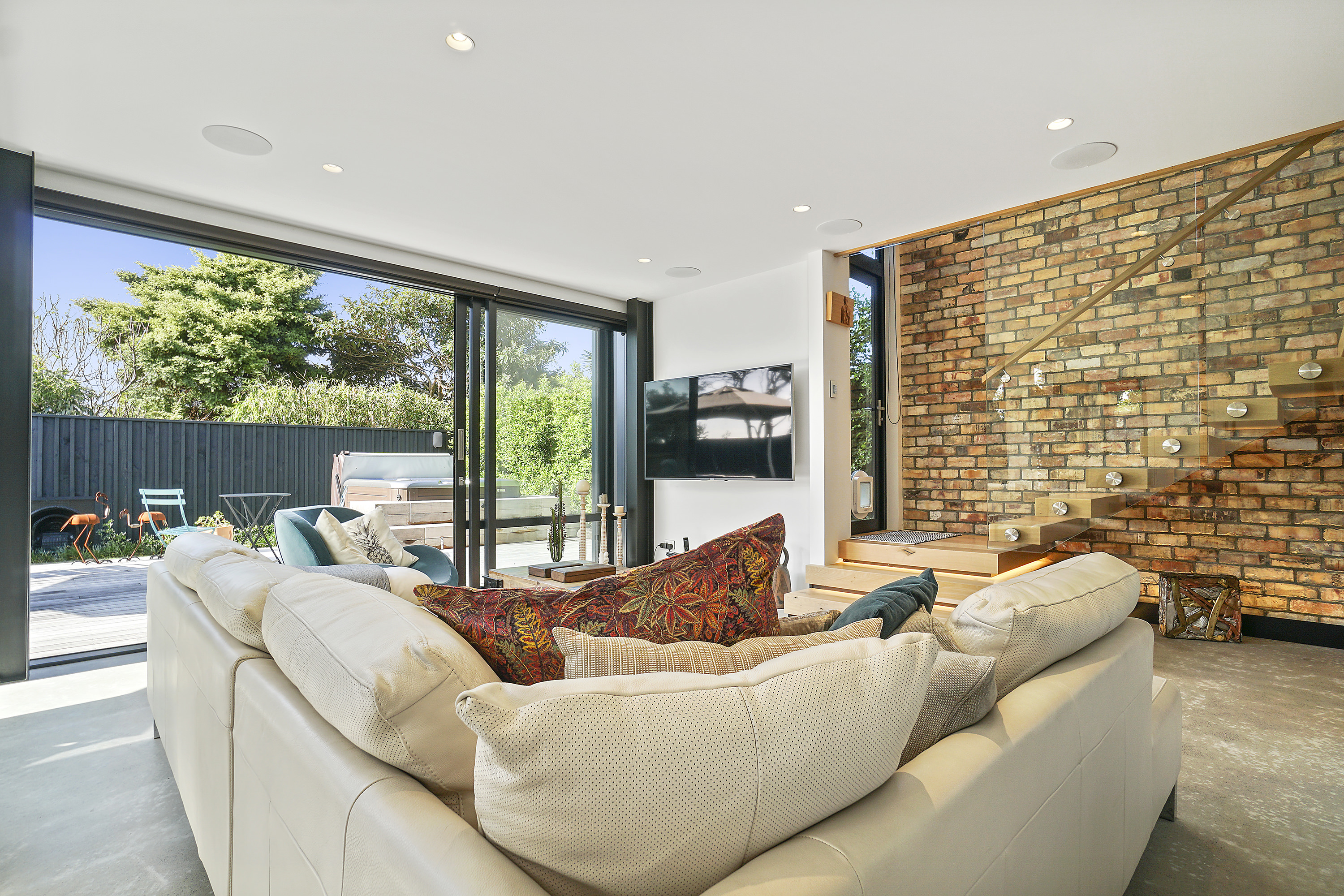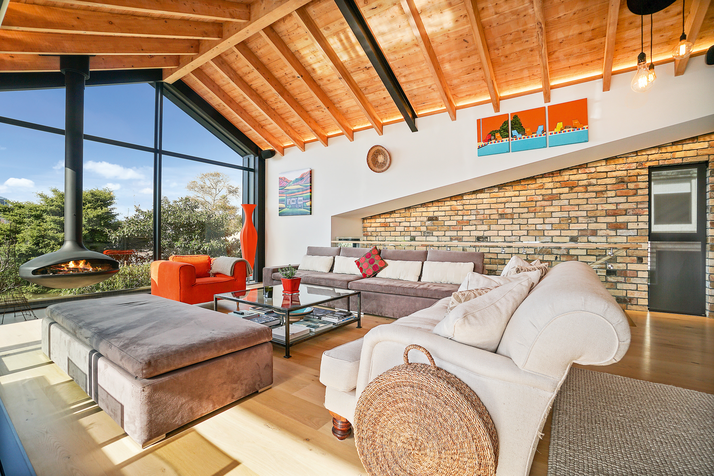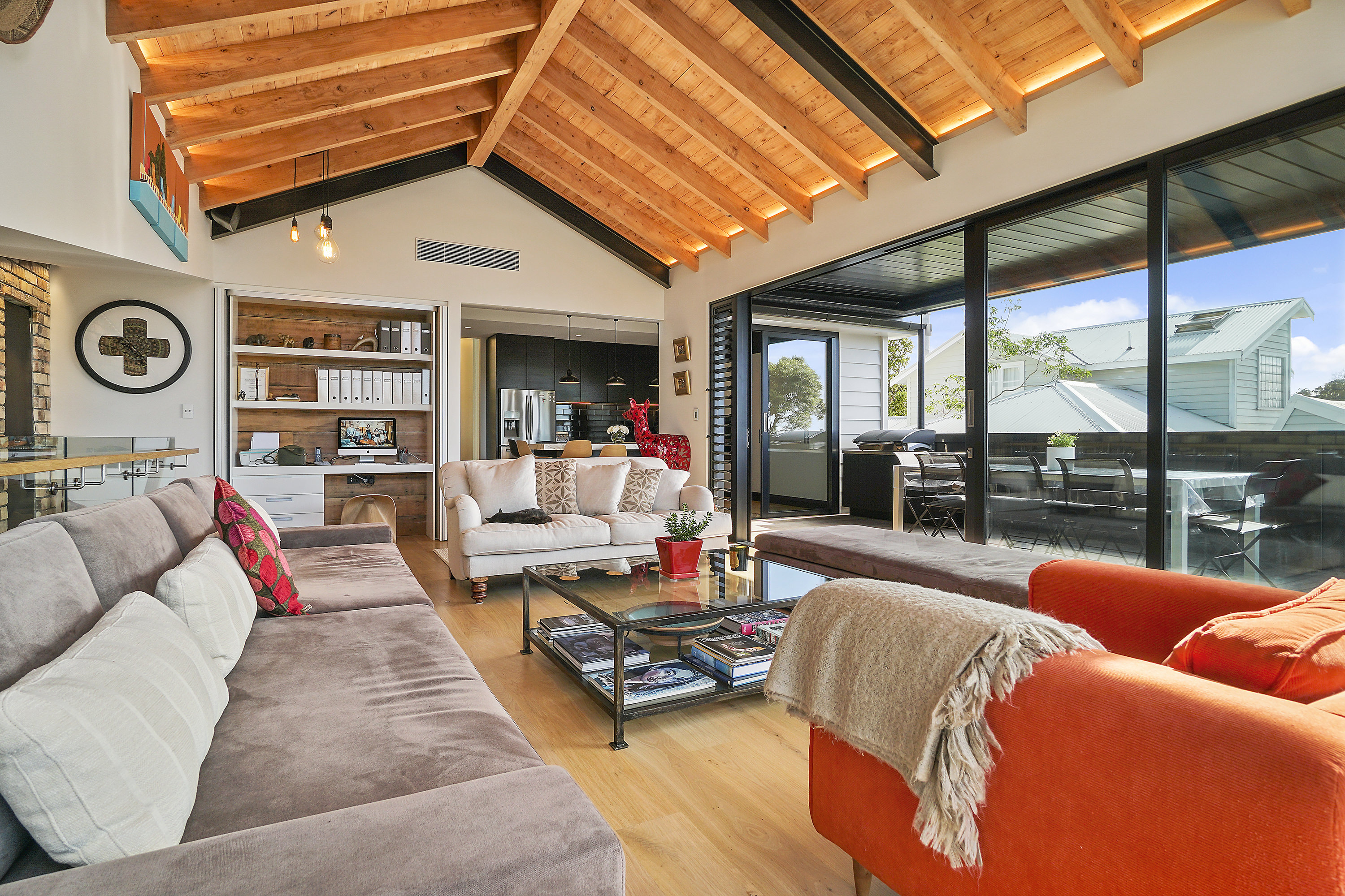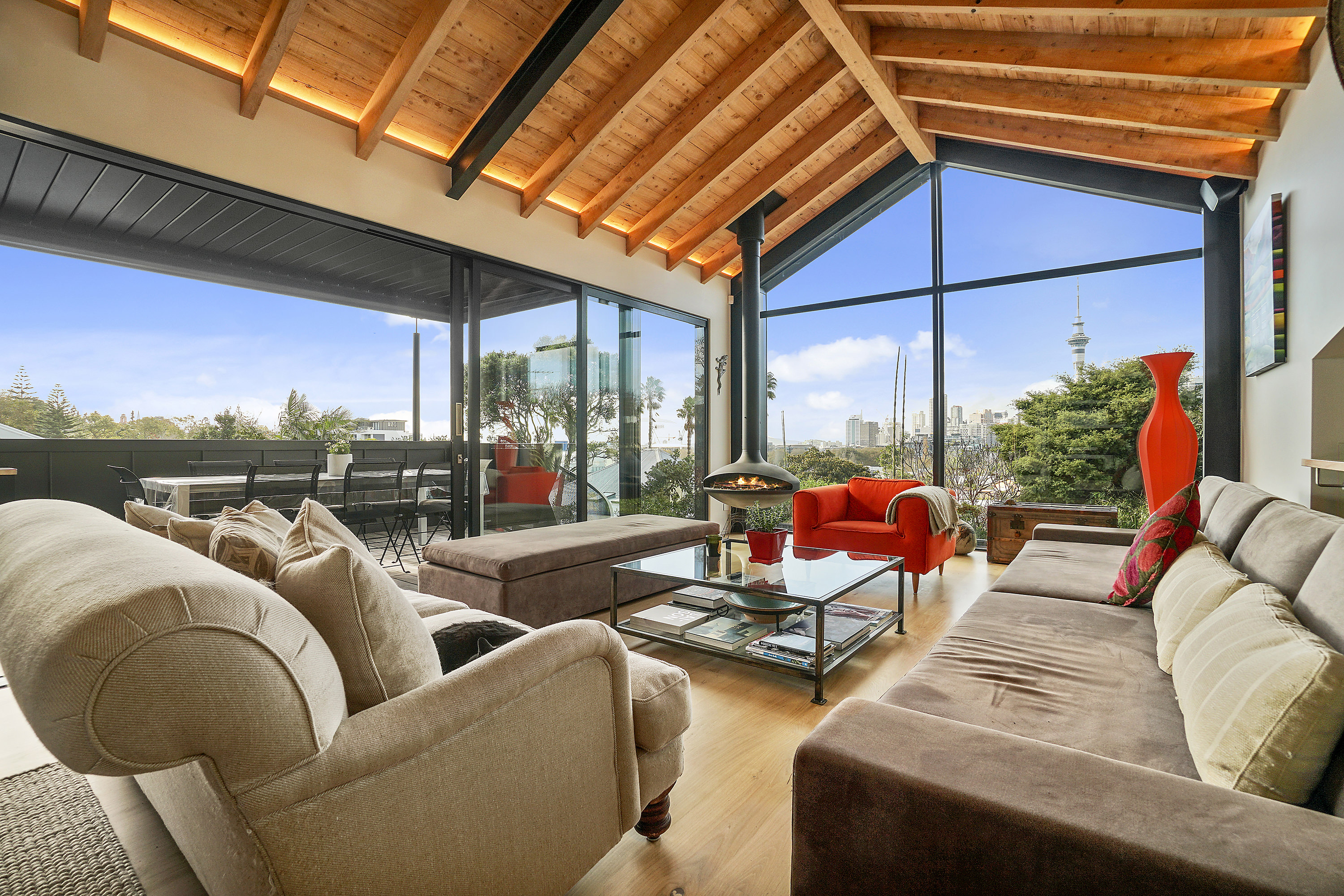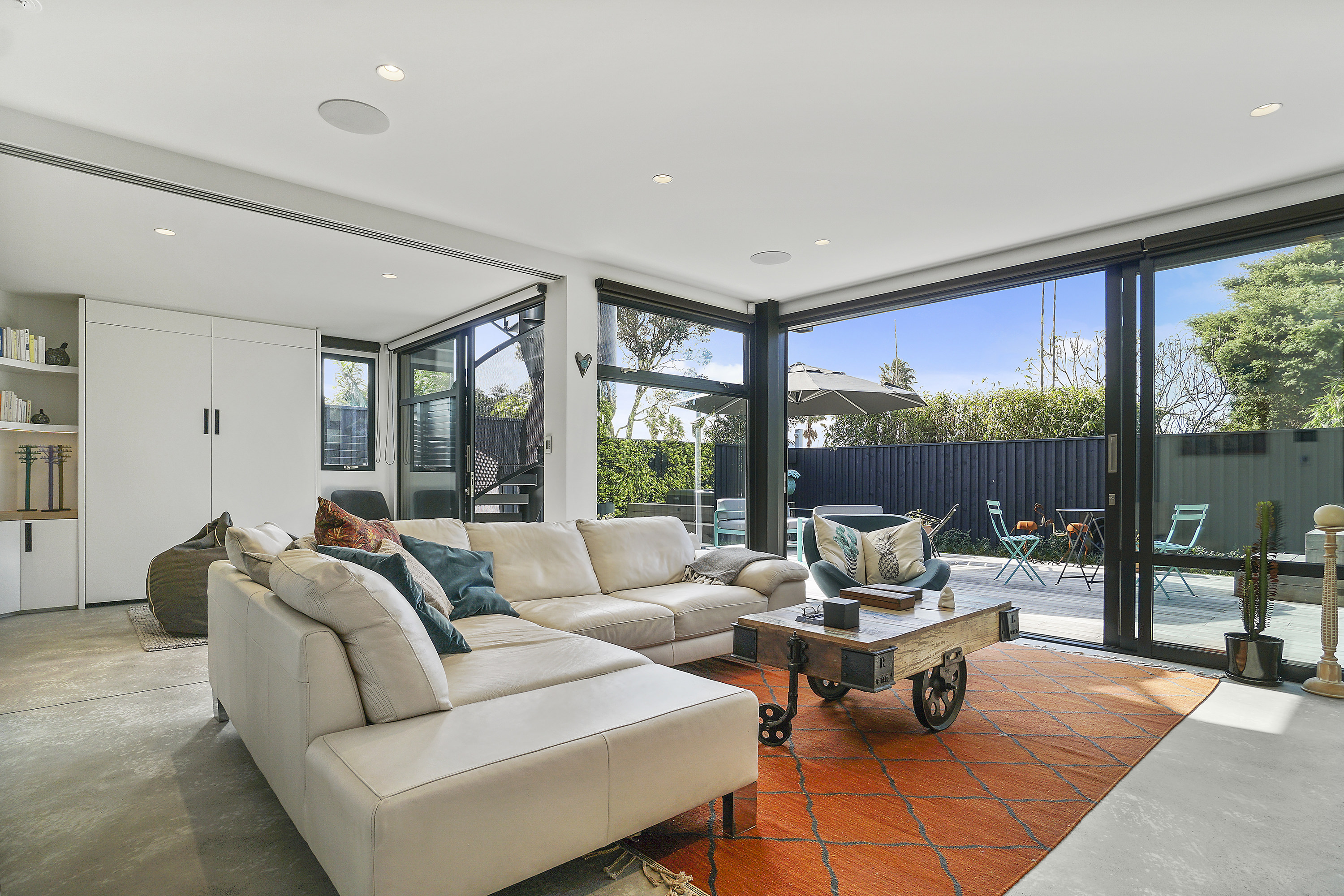 Nestled among heritage cottages in its historic inner-city Auckland suburb, this exceptional renovation delivers a hearty shot of adrenaline. Far from a simple makeover, the four-bedroom, three-bathroom masterpiece is a bold reflection of the owners’ interest in design, art and architecture. The front facade remains in tune with the streetscape. Defined by a black zinc-clad pavilion, the modern extension accommodates luxurious new living and kitchen areas. Natural light, warmth and city views flood in through masses of glass. Glazed sliding doors allow seamless flow to a large deck to the northwest. The existing cottage was reconfigured and renovated to provide new bedrooms and exquisite, extensively tiled bathrooms. Garaging and plenty of storage are neatly tucked away in the newly designed basement. Guests can enjoy their own room on the lower level, along with a separate living area which flows out onto an expansive northfacing deck and lawn. A sculptural black steel spiral staircase artfully links the outdoor living spaces.
