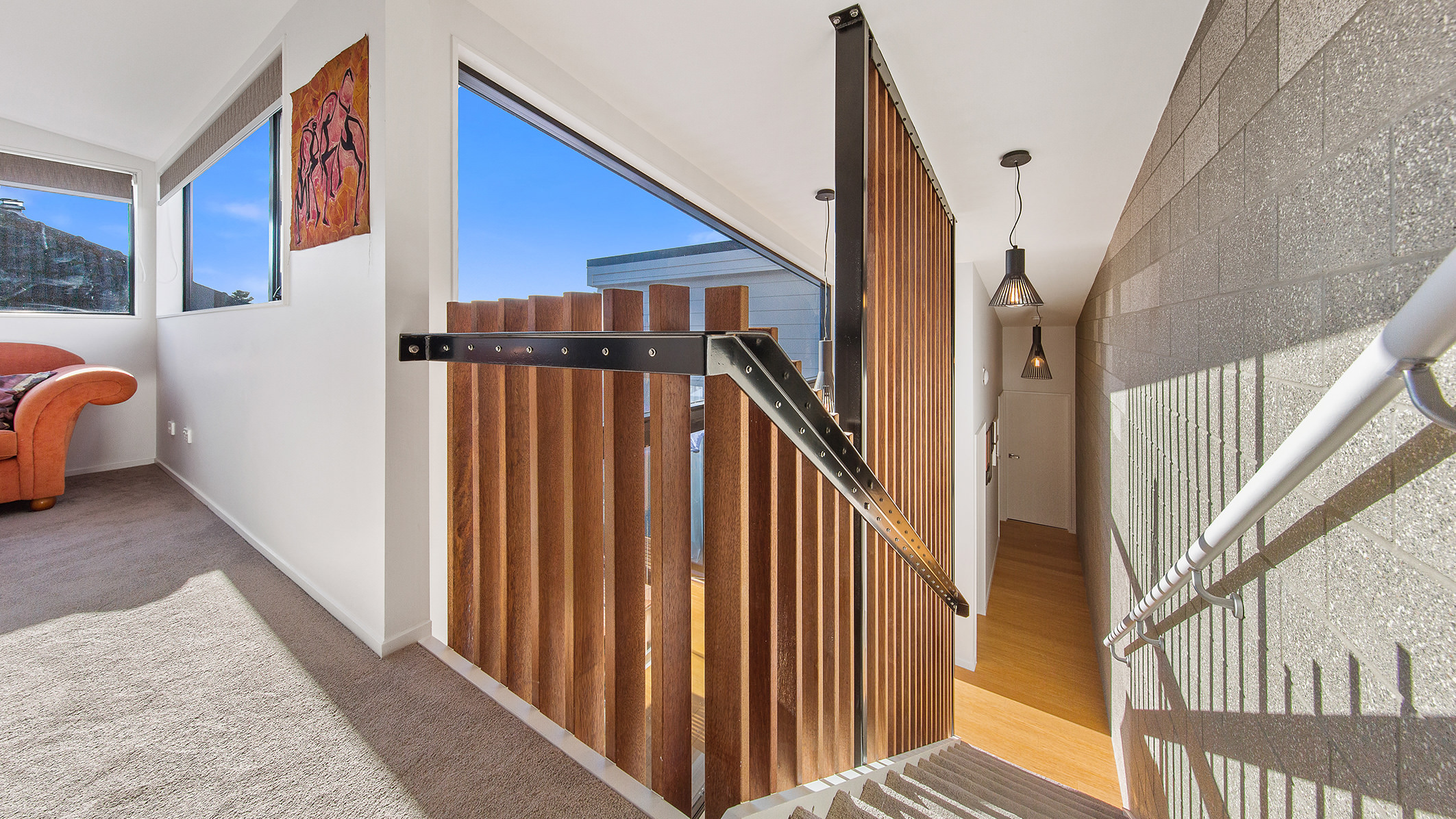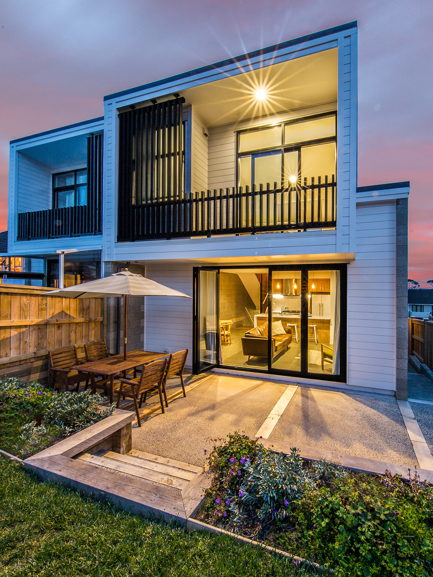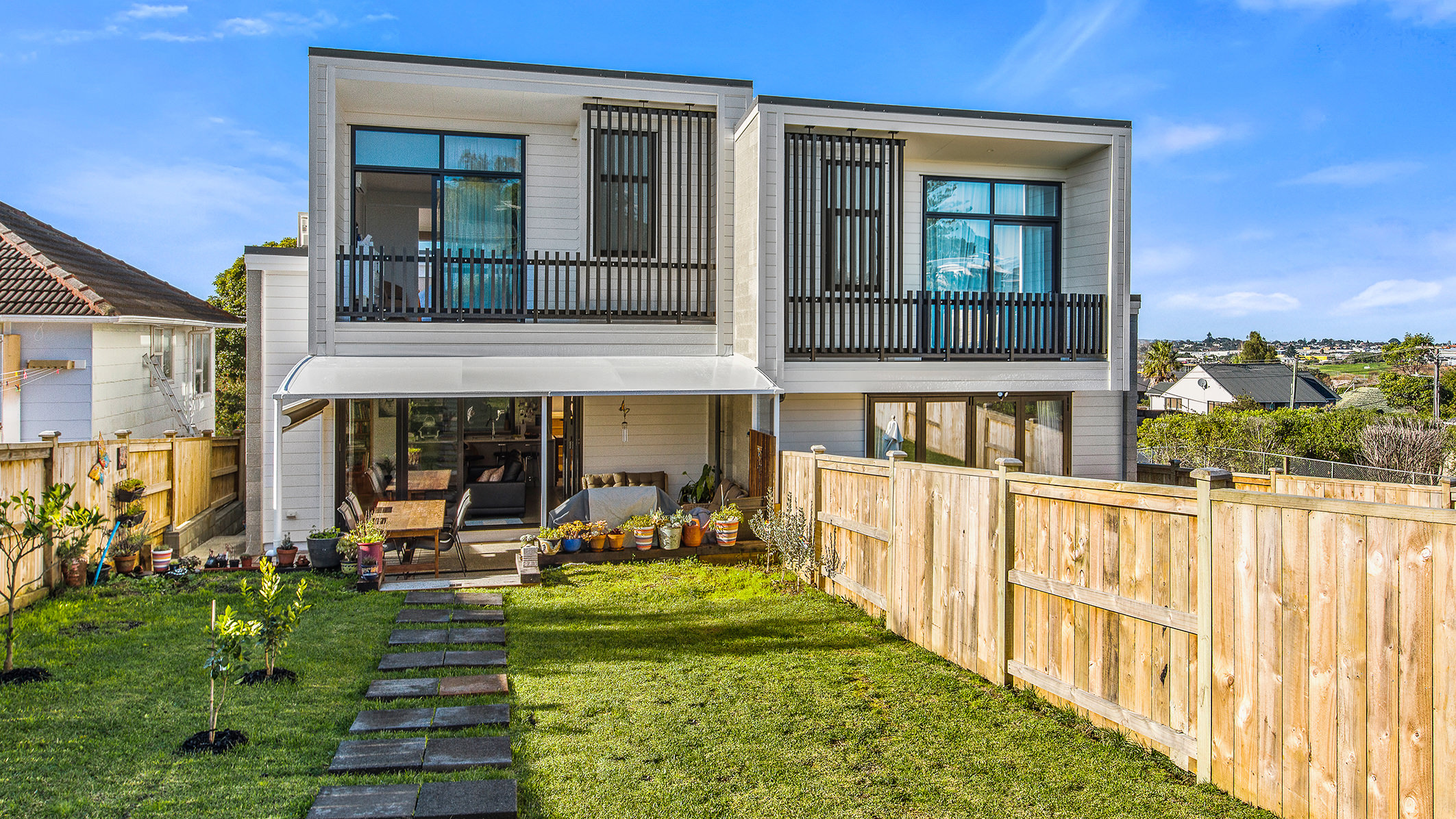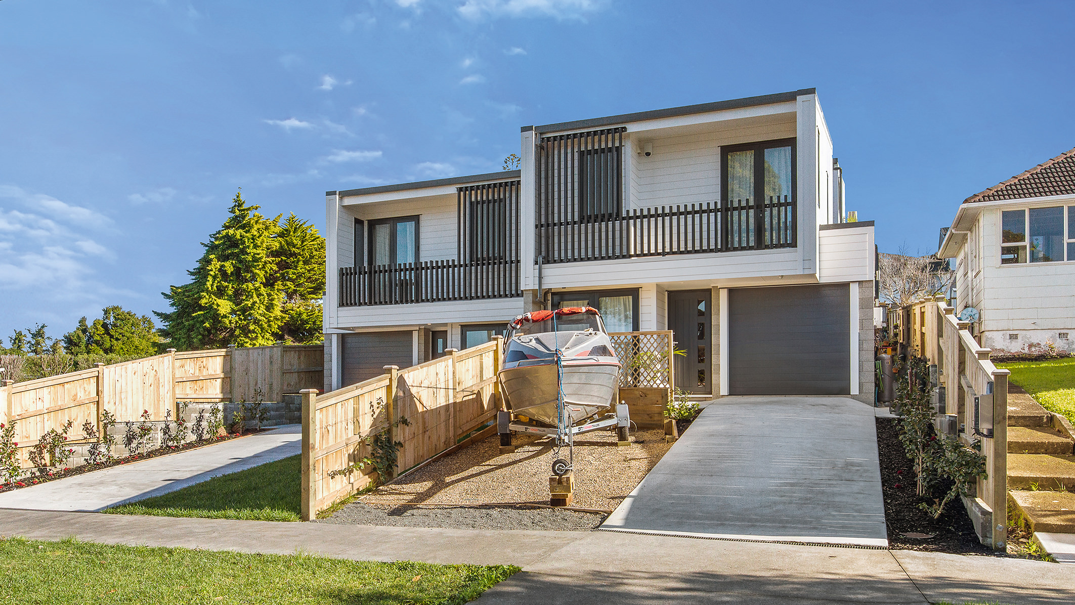 Connected by a concrete spine wall, these modern architecturally designed units are ready to rock in Auckland. The two main box volumes of each home interconnect to create a superb split-level layout. Three bedrooms and three bathrooms promise ease and convenience. Each dwelling mirrors the other. Open-plan living awaits at ground level. Polished concrete is smooth underfoot. Well-selected fixtures and finishes offer modern flair. The kitchen and scullery are designed for entertaining. A glass slider fosters flow to the alfresco patio and large lawn. Heading back into the heart of the home, a feature staircase basks in light from a central gallery. This opens to a private deck that’s sheltered from the elements on three sides. It also serves one of the bedrooms. The second and master bedrooms boast their own private decks with views. The chic master ensuite is a spacious retreat with large grey floor tiles. A wall of intricate white tiles creates a textural backdrop to the bathing area with its open shower and luxurious stand-alone bathtub.