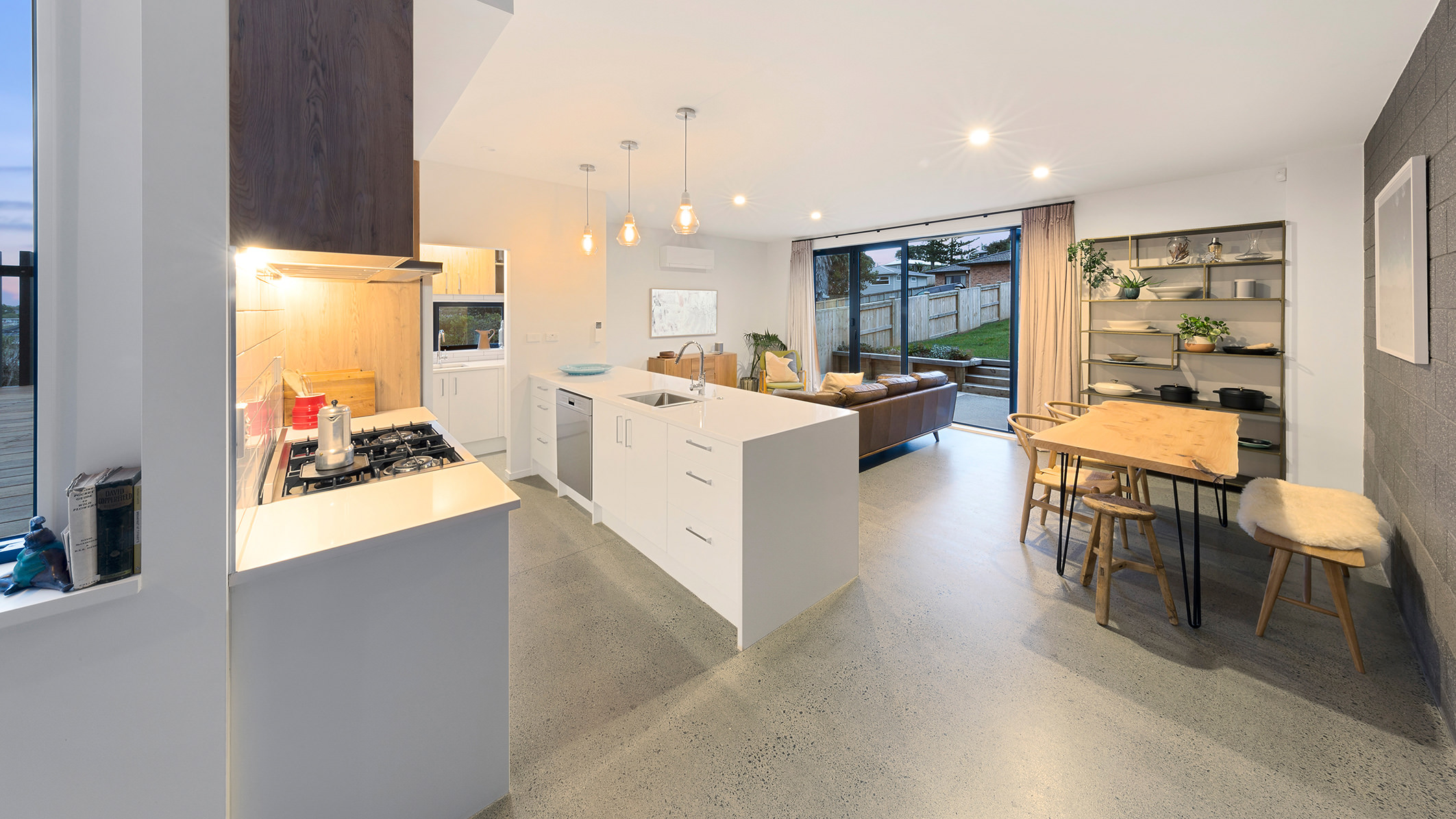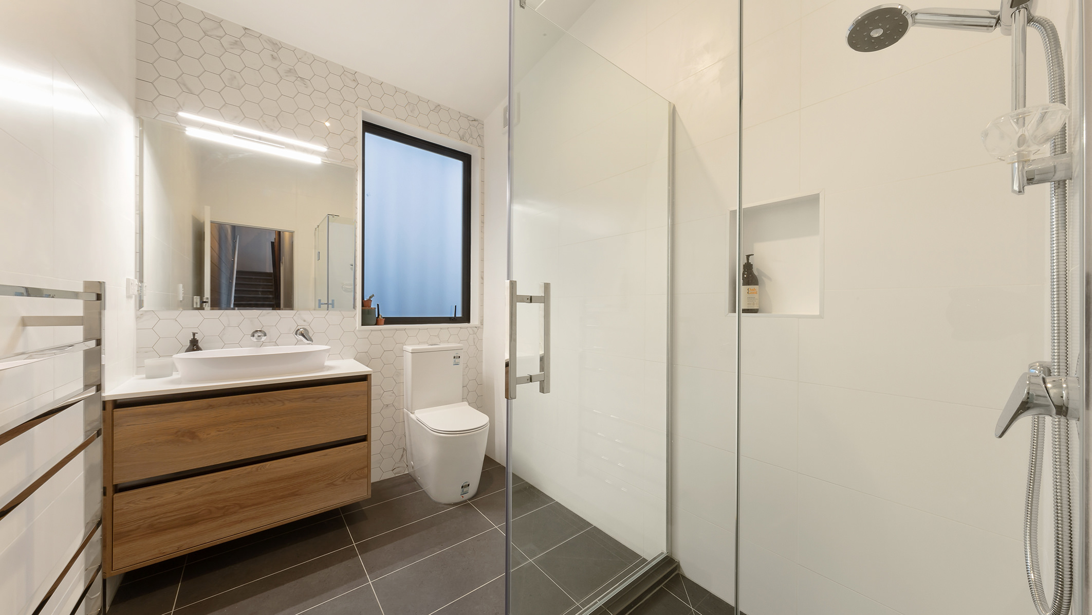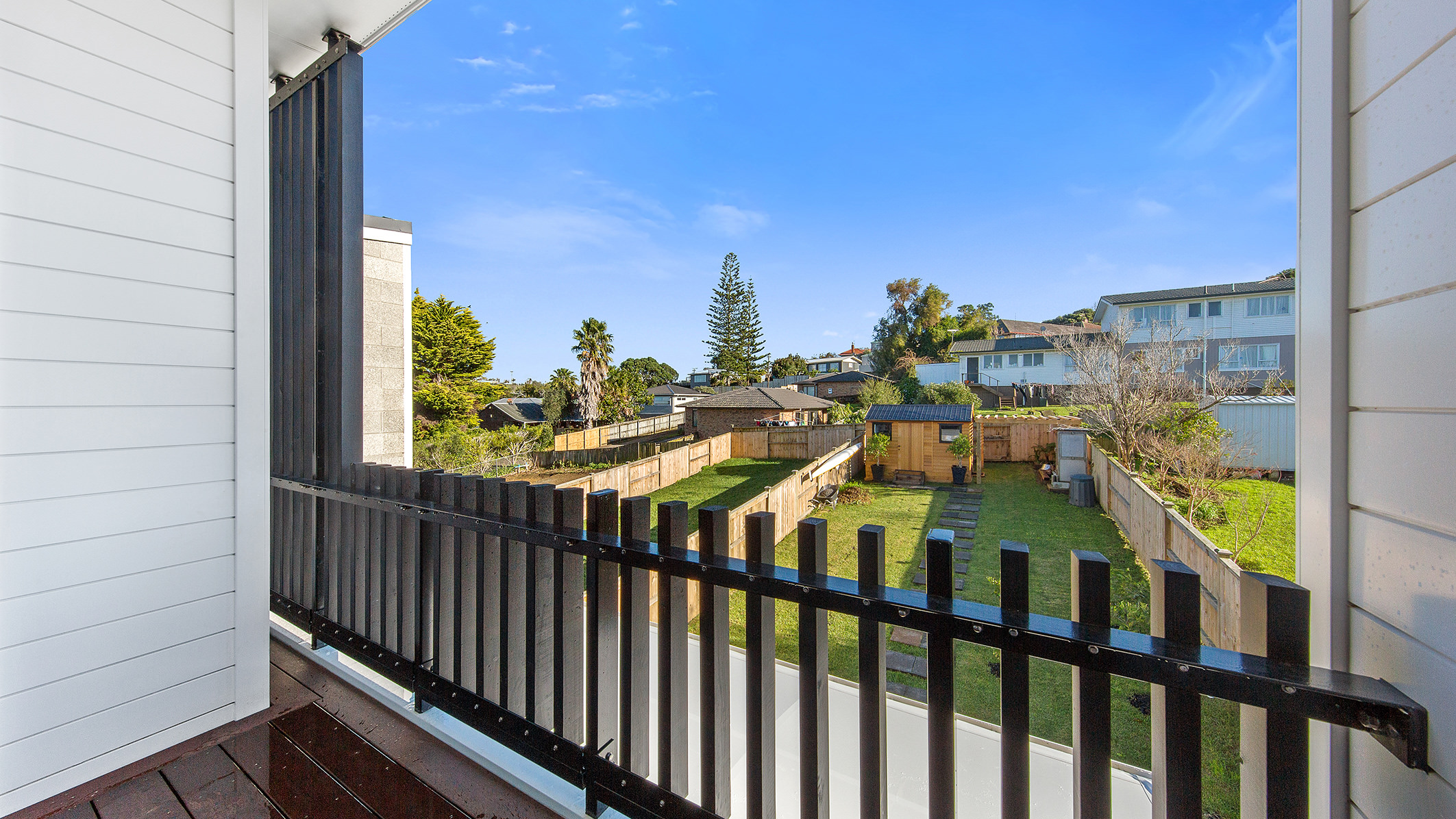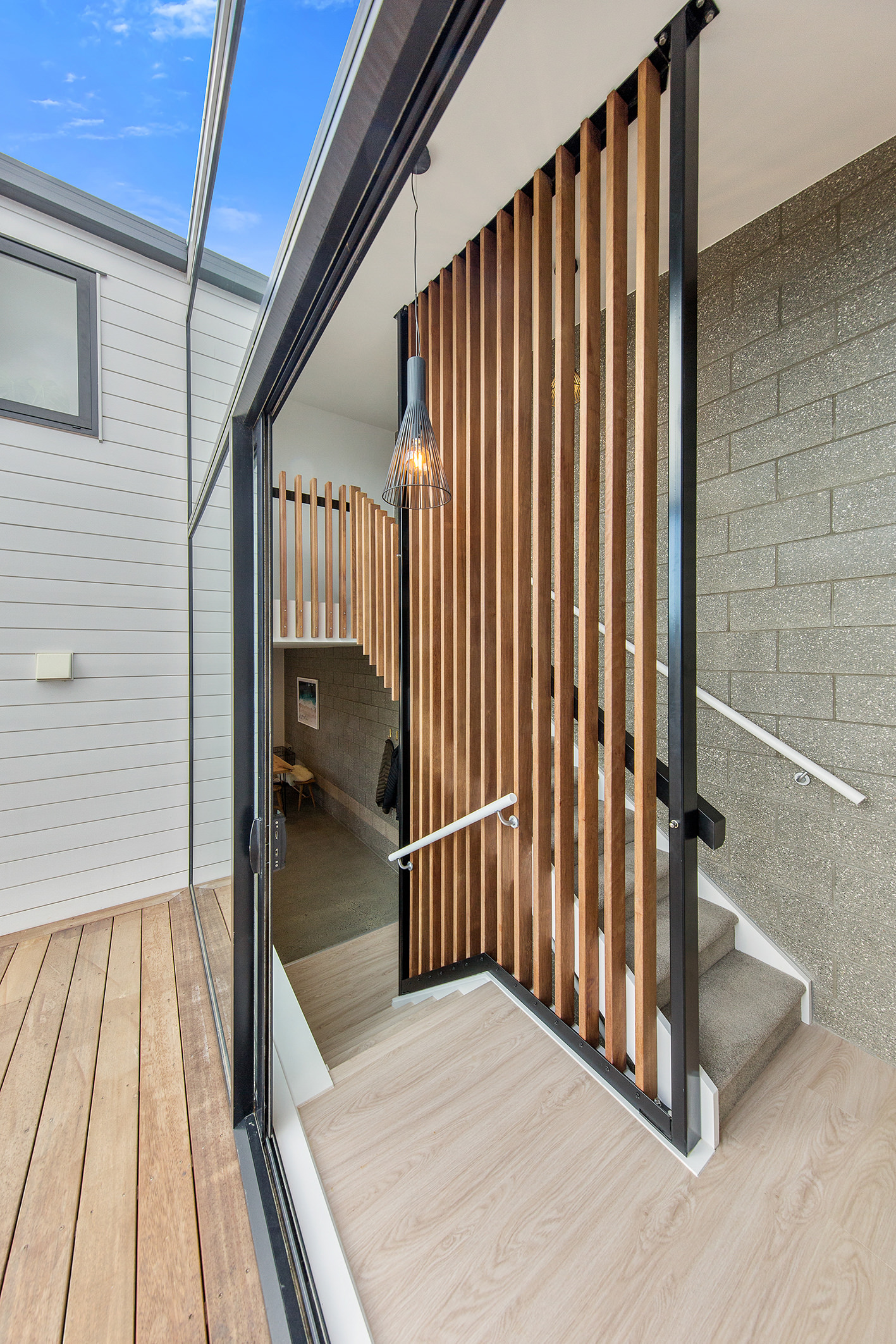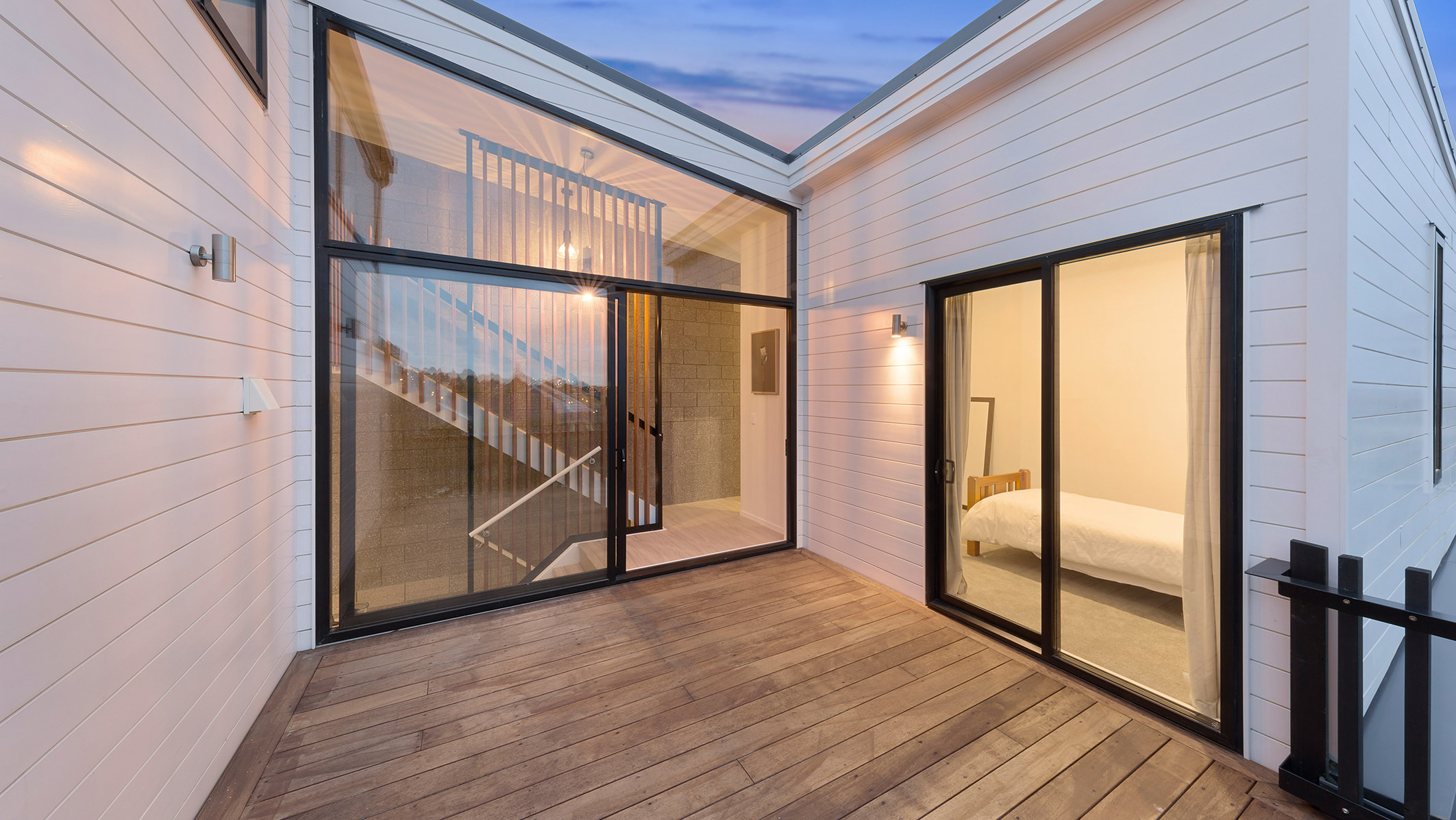 Connected by a concrete spine wall, these modern architecturally designed units are ready to rock in Auckland. The two main box volumes of each home interconnect to create a superb split-level layout. Three bedrooms and three bathrooms promise ease and convenience. Each dwelling mirrors the other. Open-plan living awaits at ground level. Polished concrete is smooth underfoot. Well-selected fixtures and finishes offer modern flair. The kitchen and scullery are designed for entertaining. A glass slider fosters flow to the alfresco patio and large lawn. Heading back into the heart of the home, a feature staircase basks in light from a central gallery. This opens to a private deck that’s sheltered from the elements on three sides. It also serves one of the bedrooms. The second and master bedrooms boast their own private decks with views. The chic master ensuite is a spacious retreat with large grey floor tiles. A wall of intricate white tiles creates a textural backdrop to the bathing area with its open shower and luxurious stand-alone bathtub.