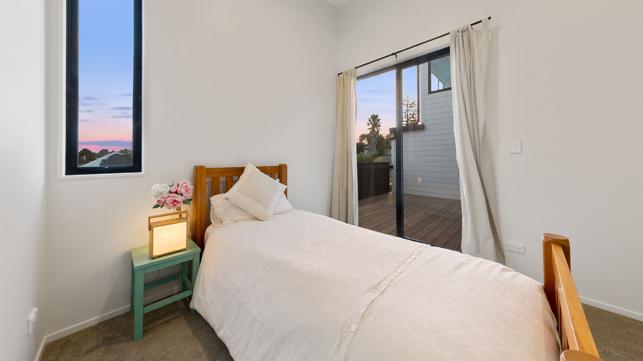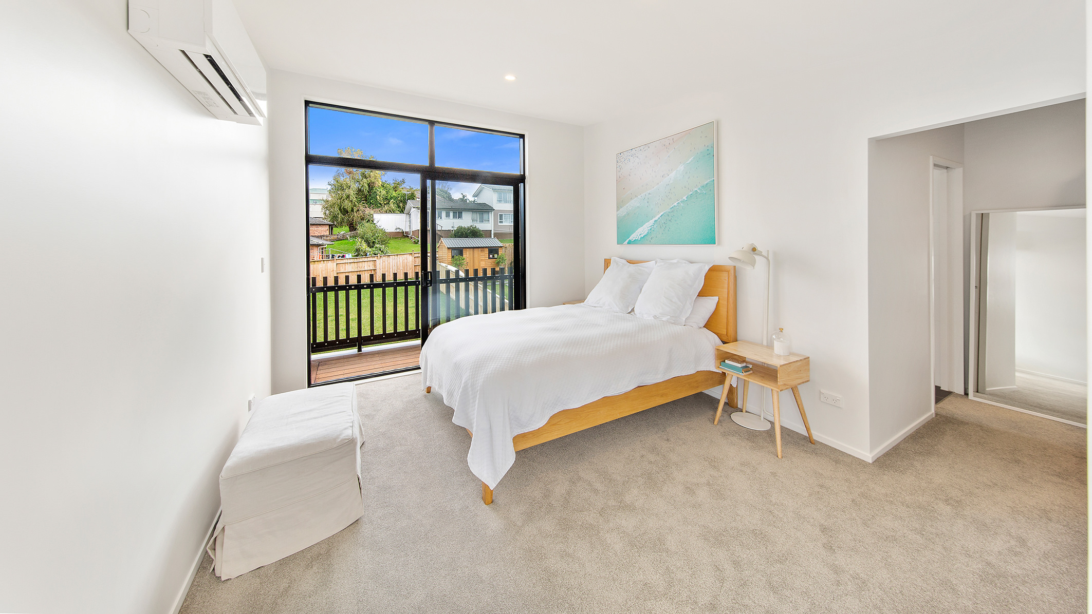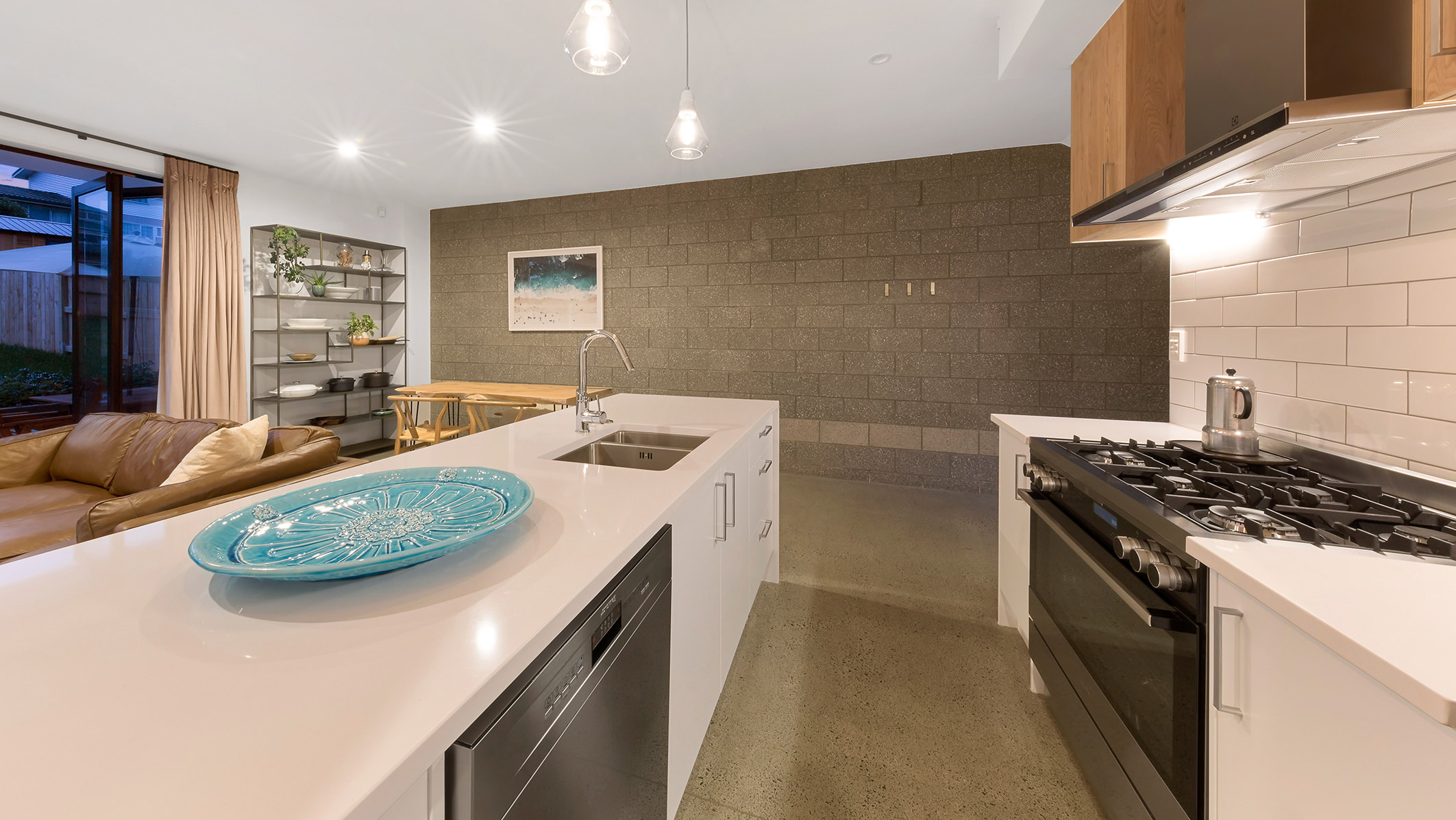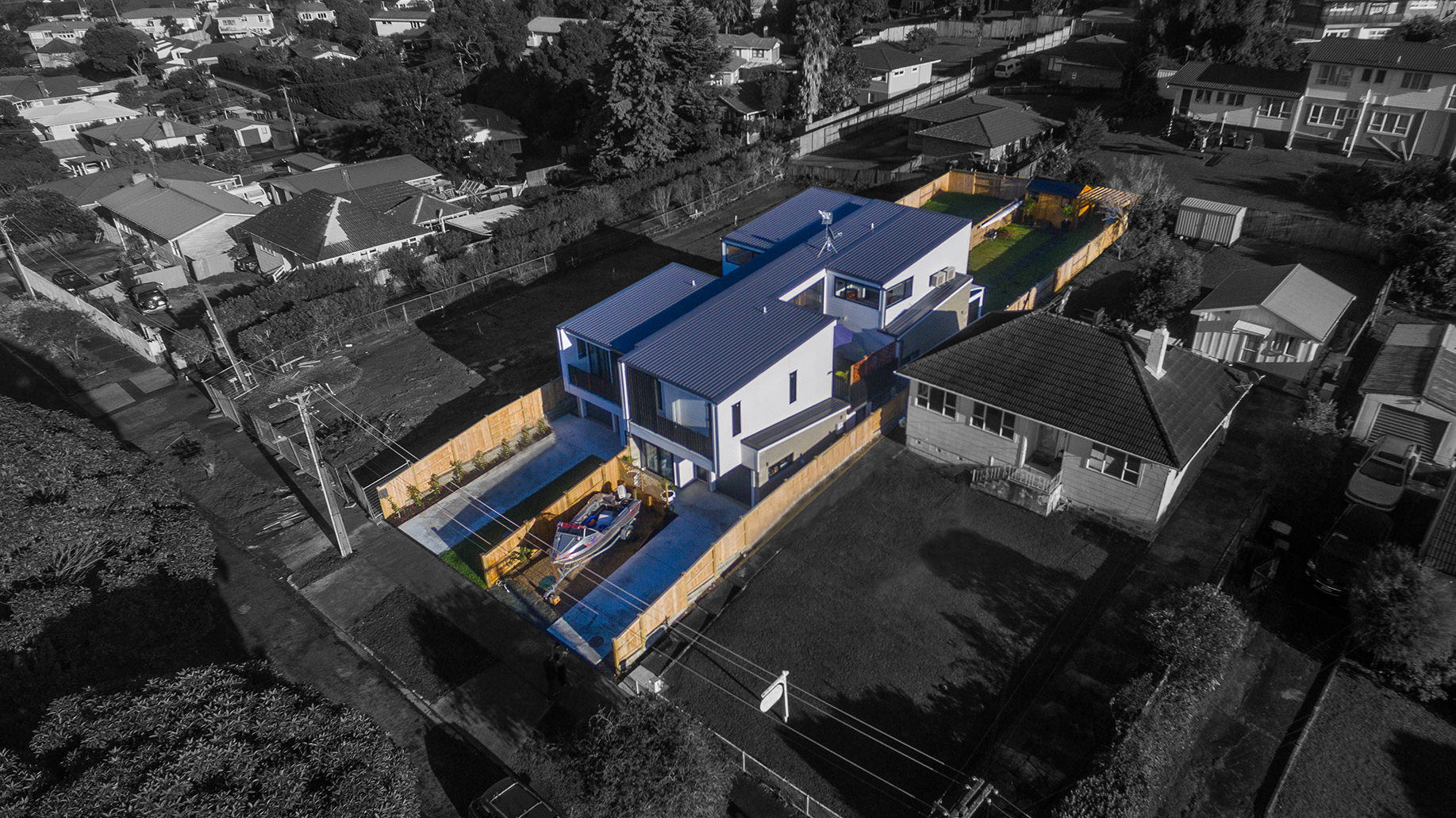 Connected by a concrete spine wall, these modern architecturally designed units are ready to rock in Auckland. The two main box volumes of each home interconnect to create a superb split-level layout. Three bedrooms and three bathrooms promise ease and convenience. Each dwelling mirrors the other. Open-plan living awaits at ground level. Polished concrete is smooth underfoot. Well-selected fixtures and finishes offer modern flair. The kitchen and scullery are designed for entertaining. A glass slider fosters flow to the alfresco patio and large lawn. Heading back into the heart of the home, a feature staircase basks in light from a central gallery. This opens to a private deck that’s sheltered from the elements on three sides. It also serves one of the bedrooms. The second and master bedrooms boast their own private decks with views. The chic master ensuite is a spacious retreat with large grey floor tiles. A wall of intricate white tiles creates a textural backdrop to the bathing area with its open shower and luxurious stand-alone bathtub.