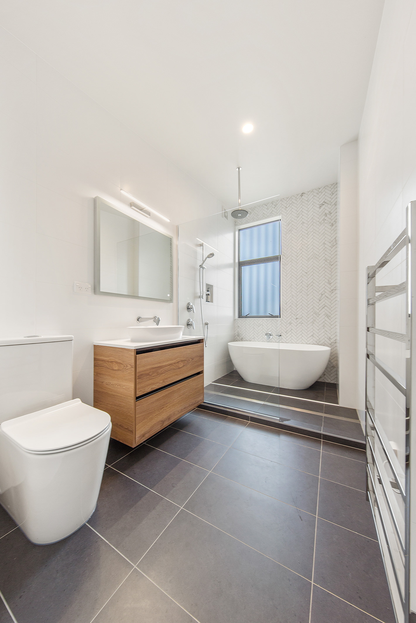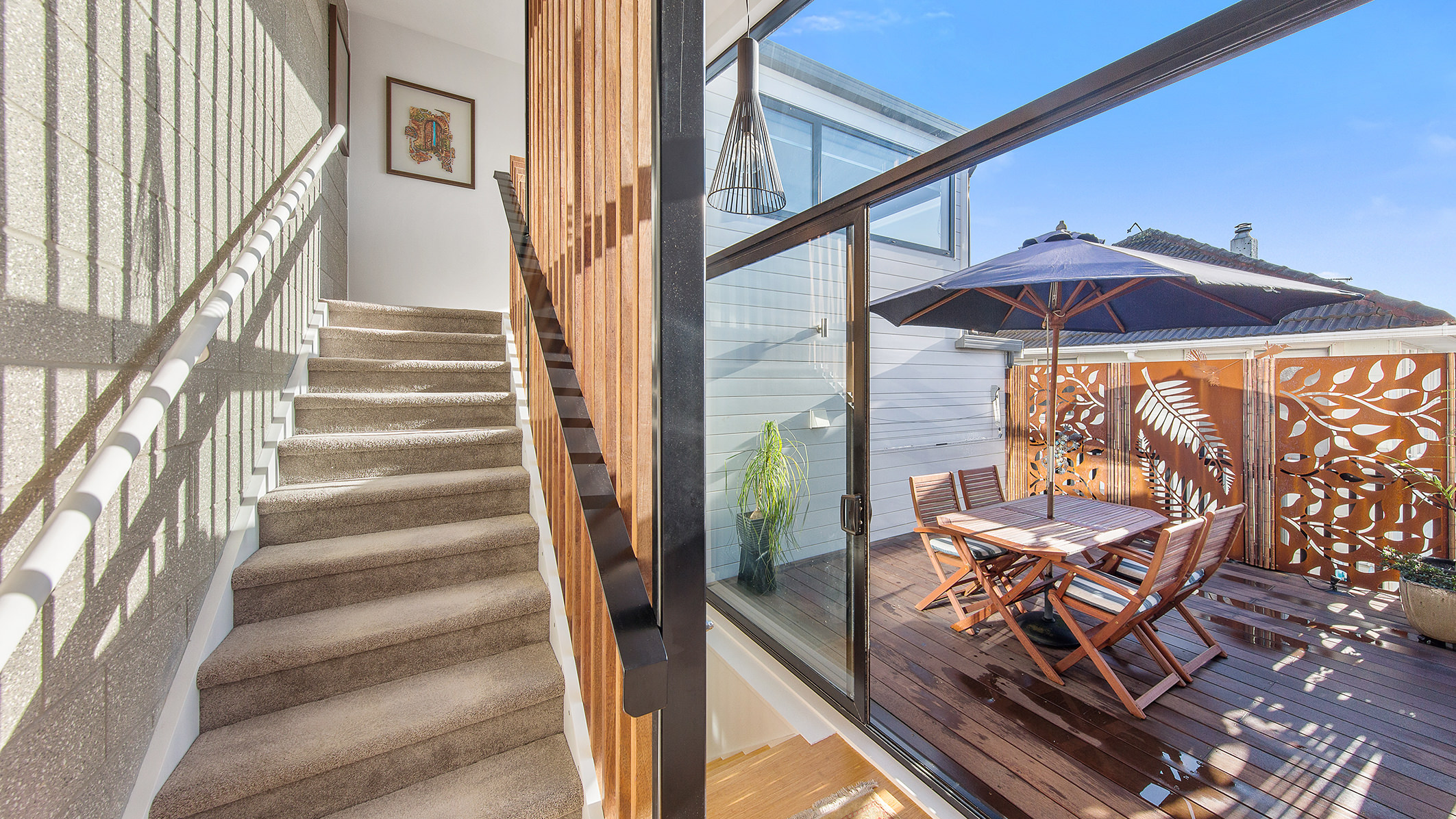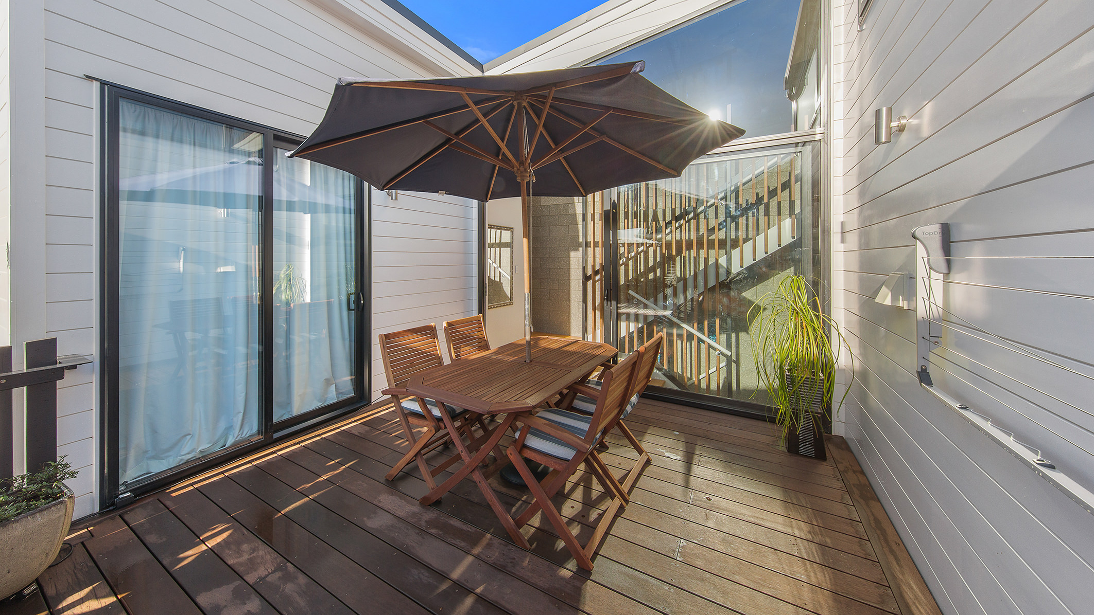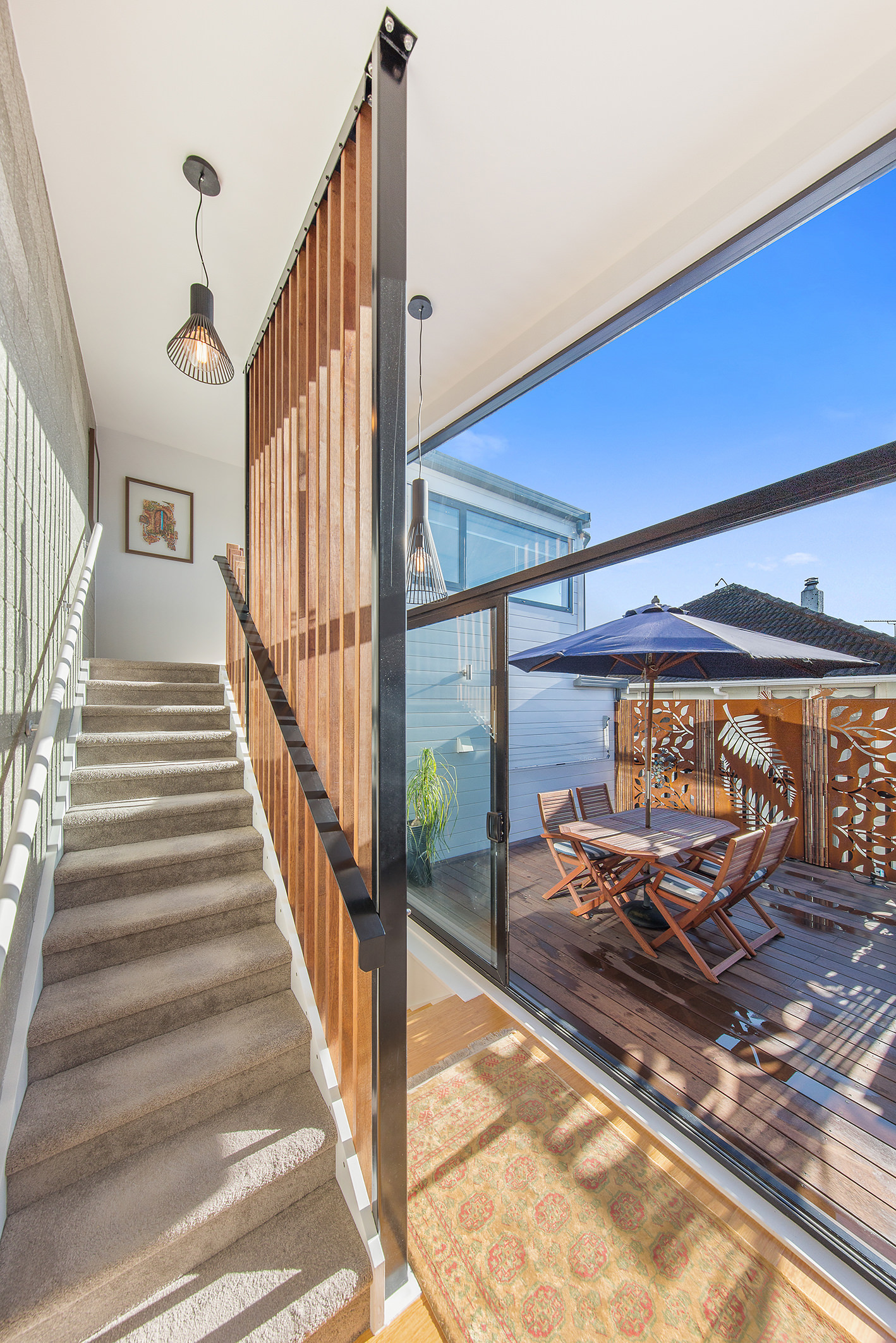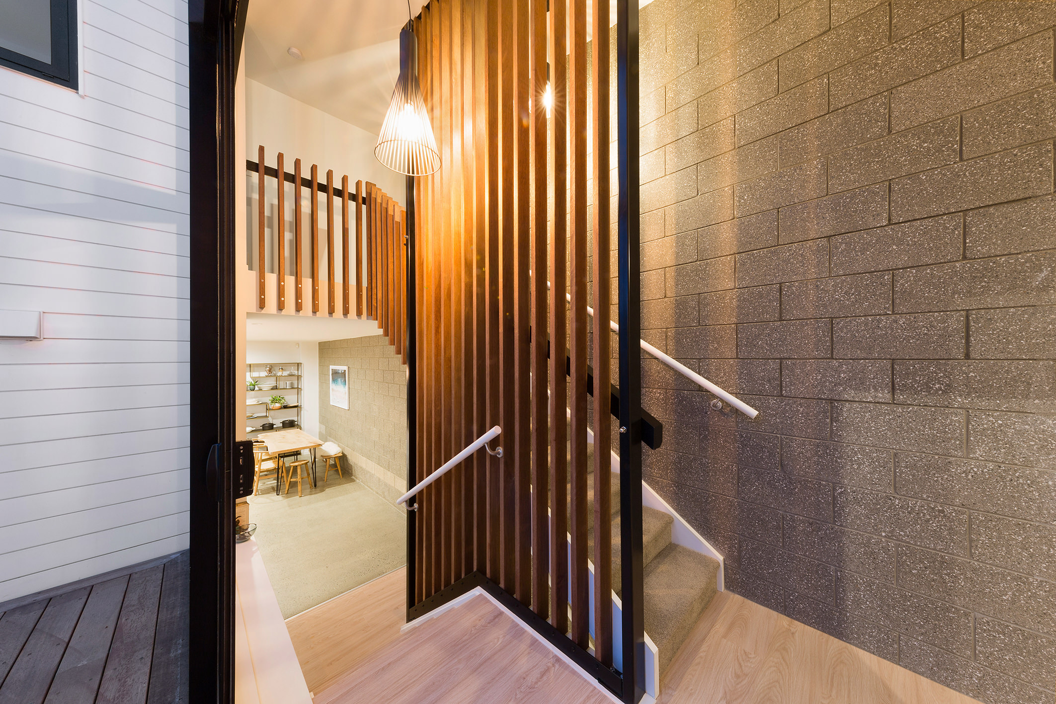 Connected by a concrete spine wall, these modern architecturally designed units are ready to rock in Auckland. The two main box volumes of each home interconnect to create a superb split-level layout. Three bedrooms and three bathrooms promise ease and convenience. Each dwelling mirrors the other. Open-plan living awaits at ground level. Polished concrete is smooth underfoot. Well-selected fixtures and finishes offer modern flair. The kitchen and scullery are designed for entertaining. A glass slider fosters flow to the alfresco patio and large lawn. Heading back into the heart of the home, a feature staircase basks in light from a central gallery. This opens to a private deck that’s sheltered from the elements on three sides. It also serves one of the bedrooms. The second and master bedrooms boast their own private decks with views. The chic master ensuite is a spacious retreat with large grey floor tiles. A wall of intricate white tiles creates a textural backdrop to the bathing area with its open shower and luxurious stand-alone bathtub.