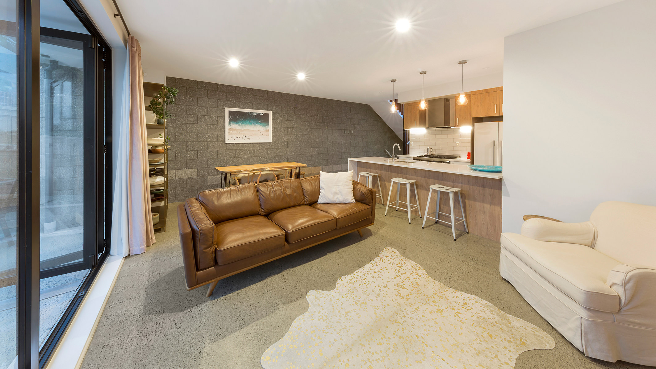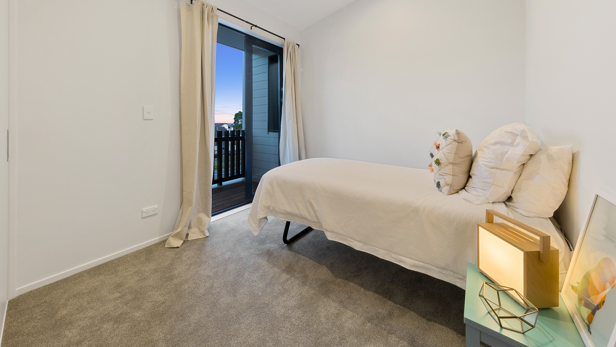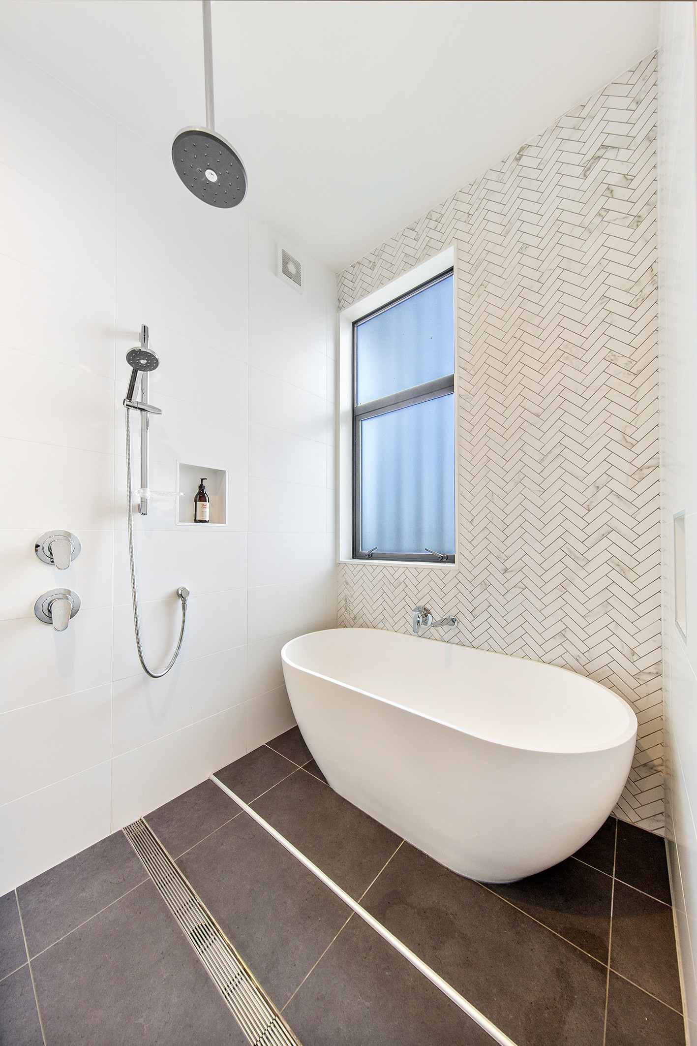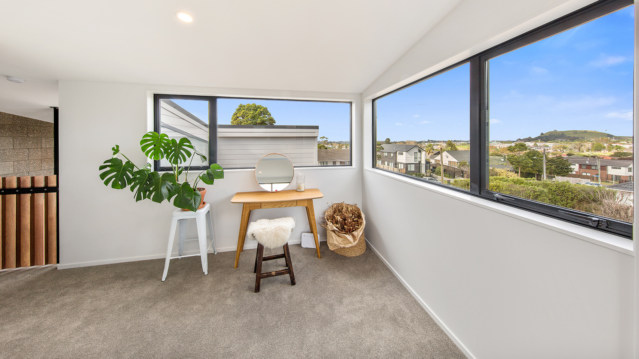 Connected by a concrete spine wall, these modern architecturally designed units are ready to rock in Auckland. The two main box volumes of each home interconnect to create a superb split-level layout. Three bedrooms and three bathrooms promise ease and convenience. Each dwelling mirrors the other. Open-plan living awaits at ground level. Polished concrete is smooth underfoot. Well-selected fixtures and finishes offer modern flair. The kitchen and scullery are designed for entertaining. A glass slider fosters flow to the alfresco patio and large lawn. Heading back into the heart of the home, a feature staircase basks in light from a central gallery. This opens to a private deck that’s sheltered from the elements on three sides. It also serves one of the bedrooms. The second and master bedrooms boast their own private decks with views. The chic master ensuite is a spacious retreat with large grey floor tiles. A wall of intricate white tiles creates a textural backdrop to the bathing area with its open shower and luxurious stand-alone bathtub.