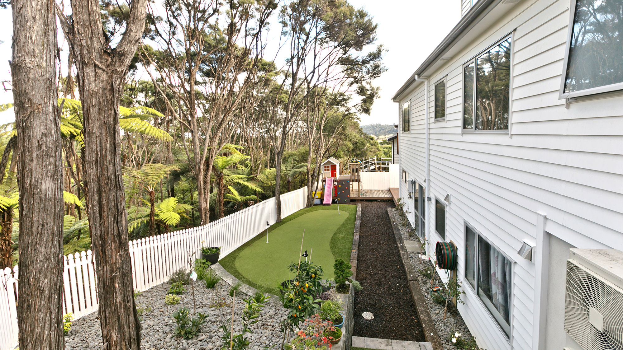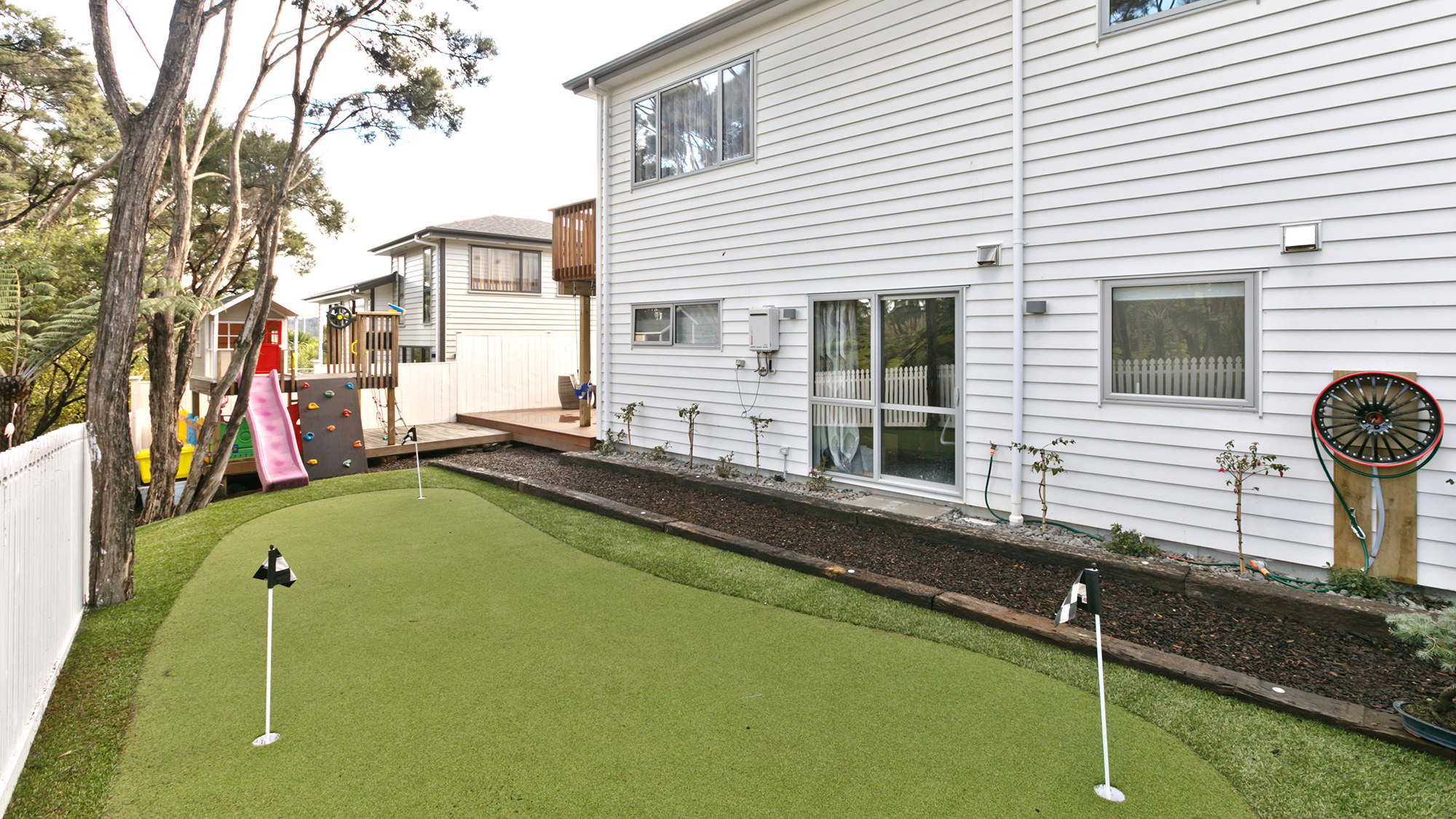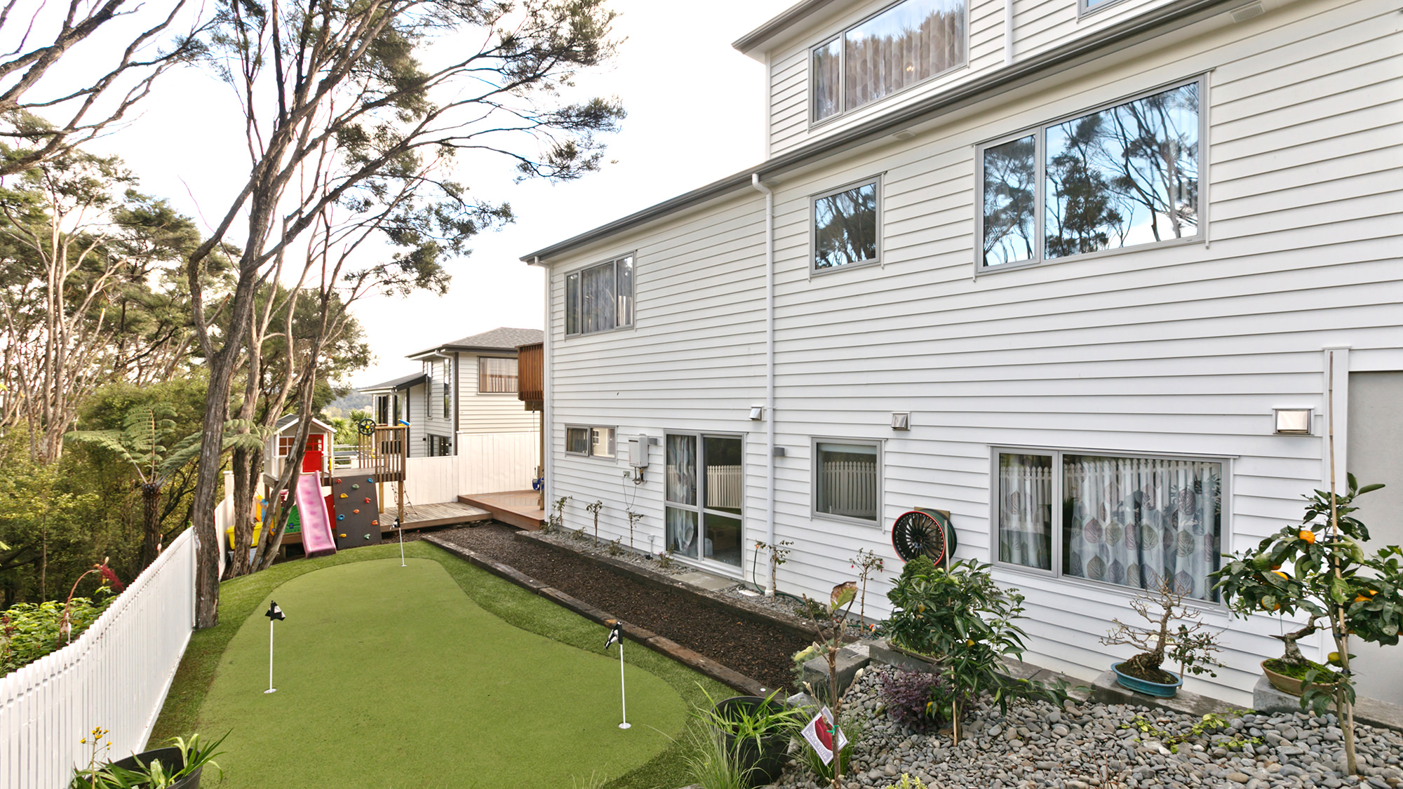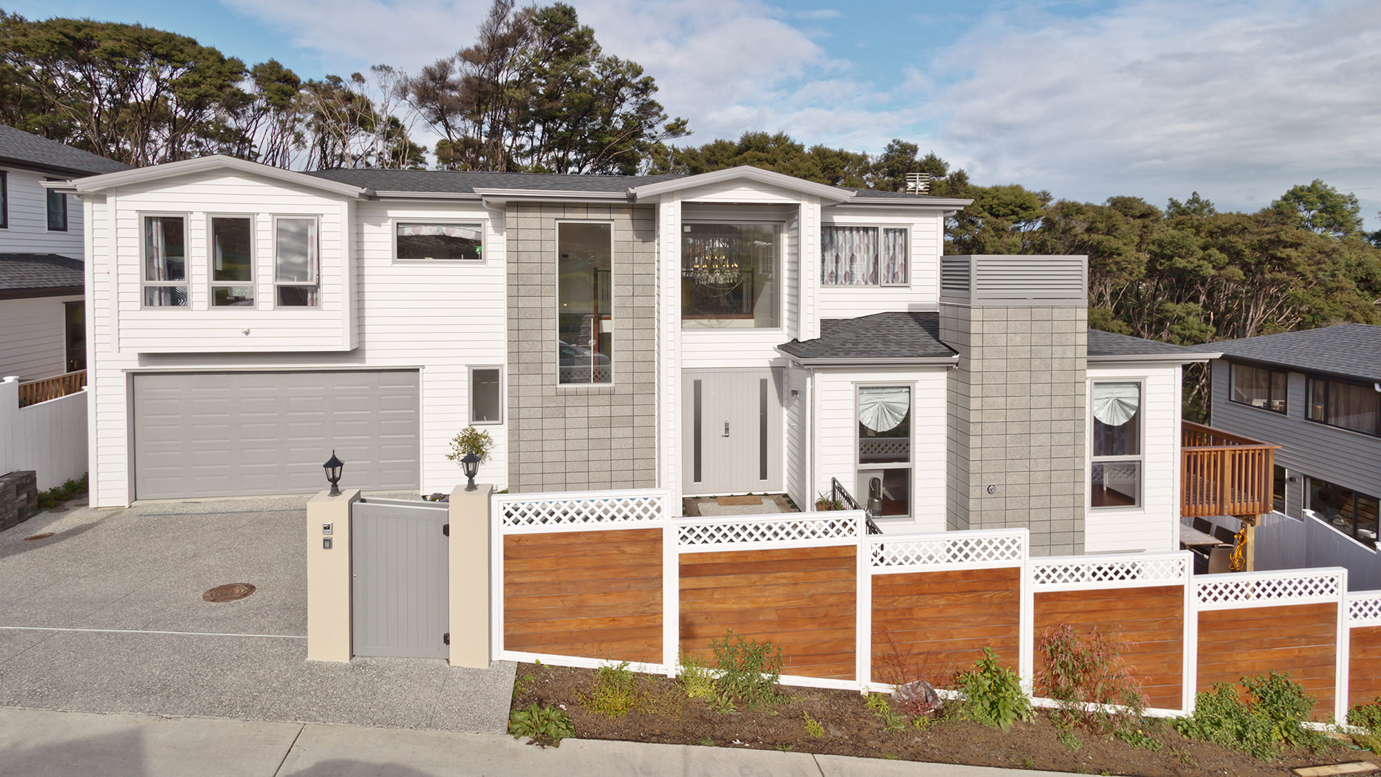 Distinct volumes in crisp weatherboard and exposed stack-bonded brick create striking street appeal on the North Shore. The varied and architecturally appealing exterior speaks of spacious interiors and one look inside delivers the goods. The double-height entrance foyer contains an eye-catching turned staircase. A generous 389sqm floor plan serves up five bedrooms, four bathrooms and three living spaces over three levels. With modern styling and high-spec fixtures and finishes throughout, the interior shows a keen eye for quality and design. The grey and white kitchen is the fine focal point of everyday living in the open-plan area. Handles and appliances are integrated into the cabinetry ensuring clean lines. Clever lighting design subtly enhances ambience. A secondary work kitchen serves as a further space for benchtop appliances. Family fun and entertainment await outside, where there is ample decking, big enough for kids to ride their bikes on, a fortress playhouse and a putting green. This home suits its owners to a tee.