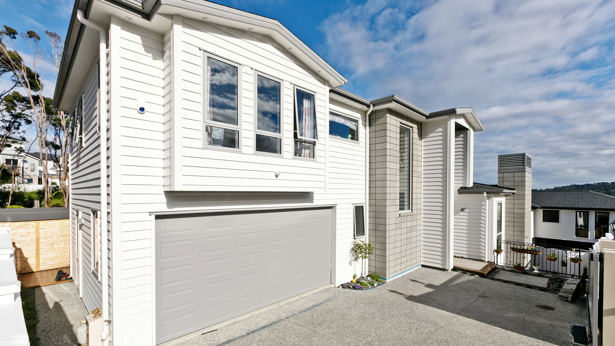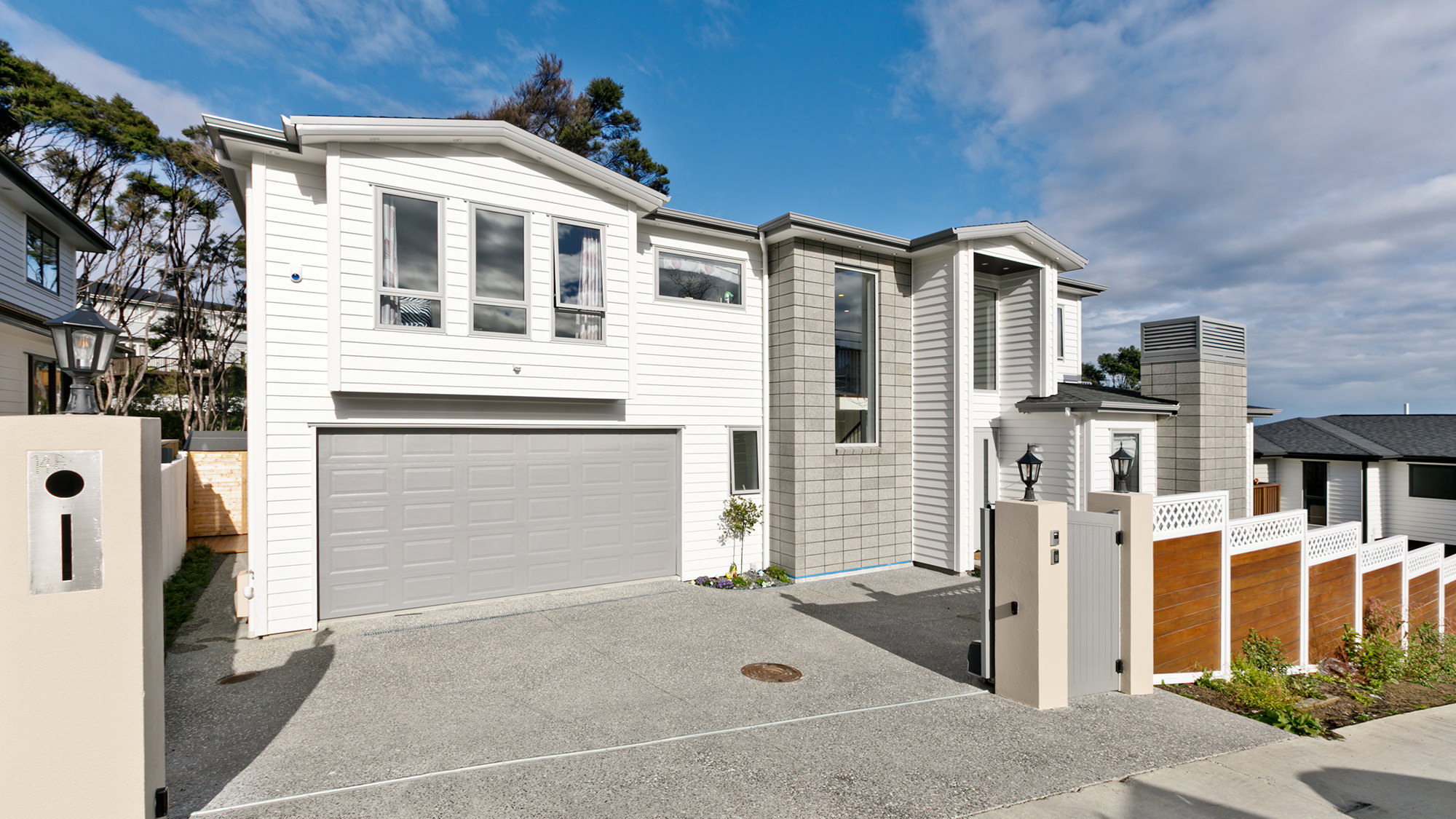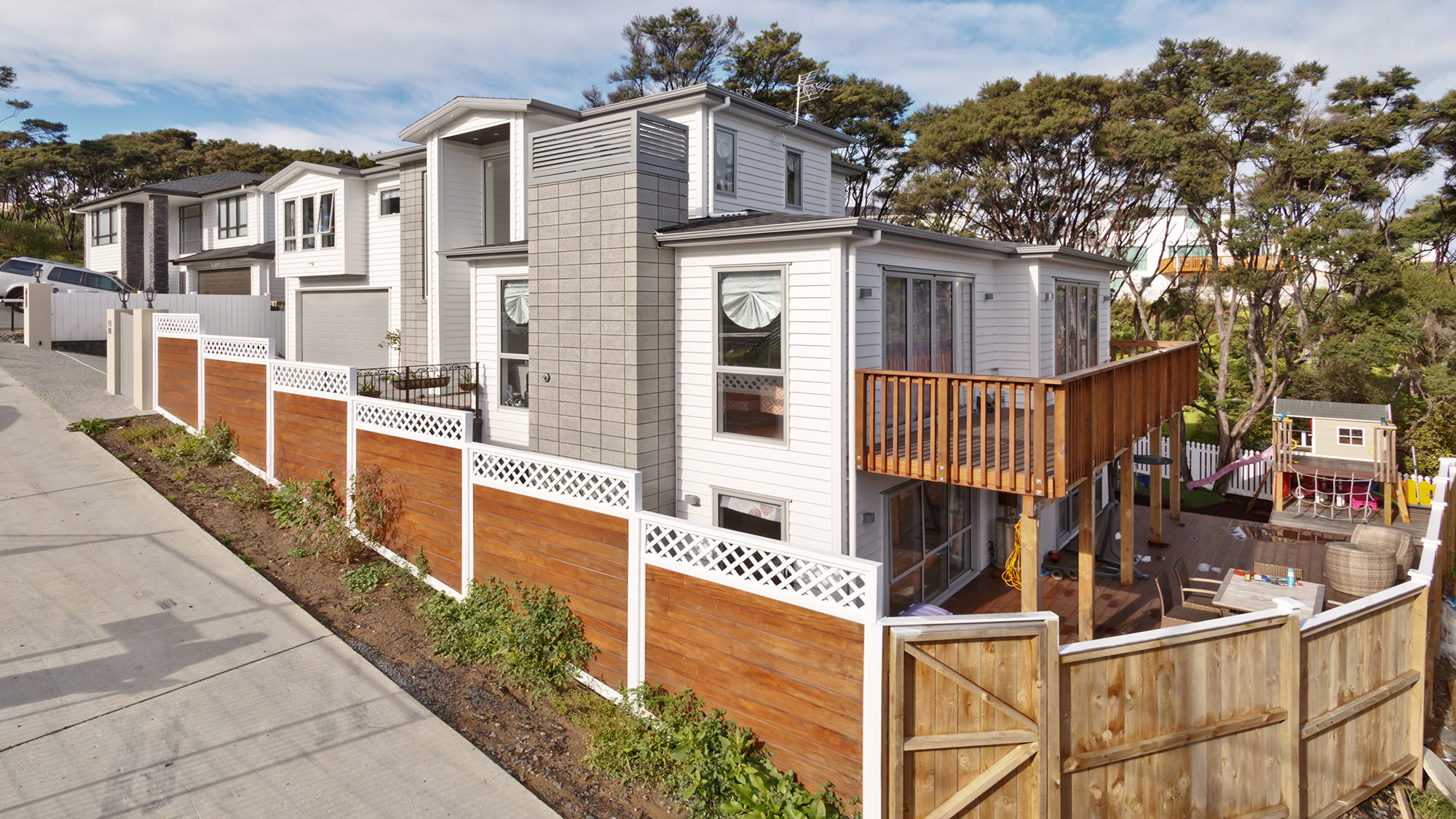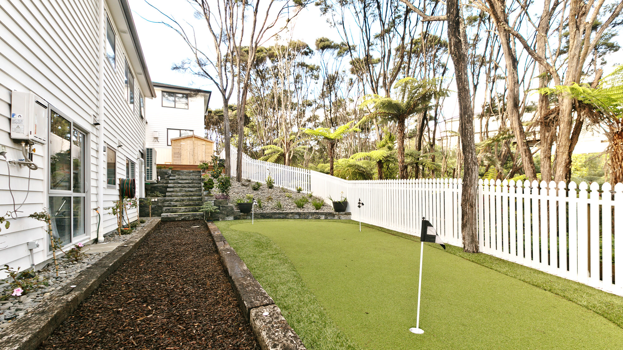 Distinct volumes in crisp weatherboard and exposed stack-bonded brick create striking street appeal on the North Shore. The varied and architecturally appealing exterior speaks of spacious interiors and one look inside delivers the goods. The double-height entrance foyer contains an eye-catching turned staircase. A generous 389sqm floor plan serves up five bedrooms, four bathrooms and three living spaces over three levels. With modern styling and high-spec fixtures and finishes throughout, the interior shows a keen eye for quality and design. The grey and white kitchen is the fine focal point of everyday living in the open-plan area. Handles and appliances are integrated into the cabinetry ensuring clean lines. Clever lighting design subtly enhances ambience. A secondary work kitchen serves as a further space for benchtop appliances. Family fun and entertainment await outside, where there is ample decking, big enough for kids to ride their bikes on, a fortress playhouse and a putting green. This home suits its owners to a tee.