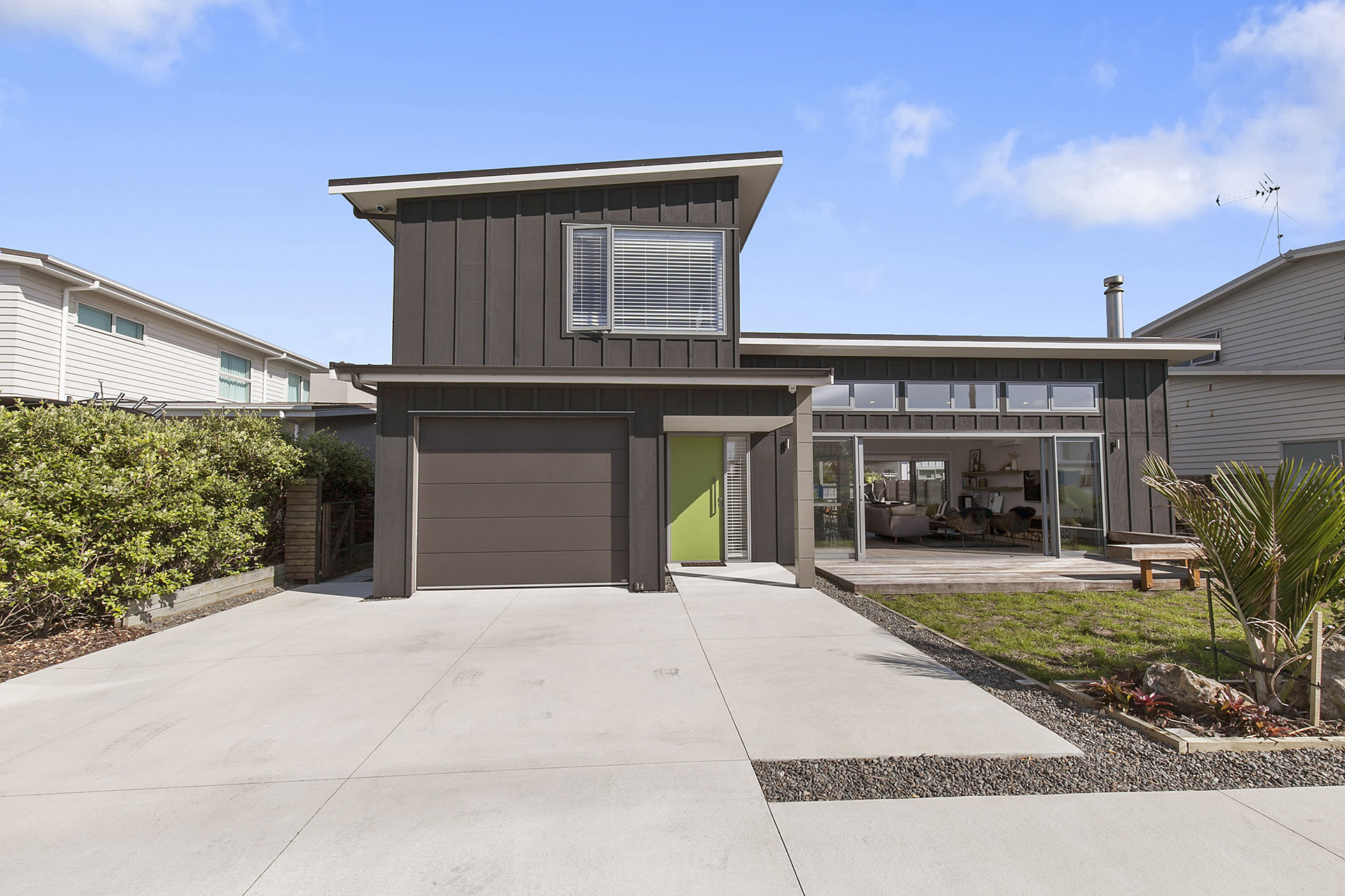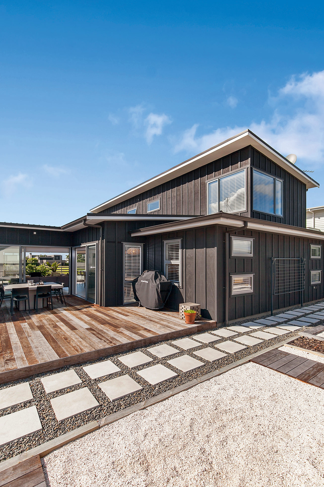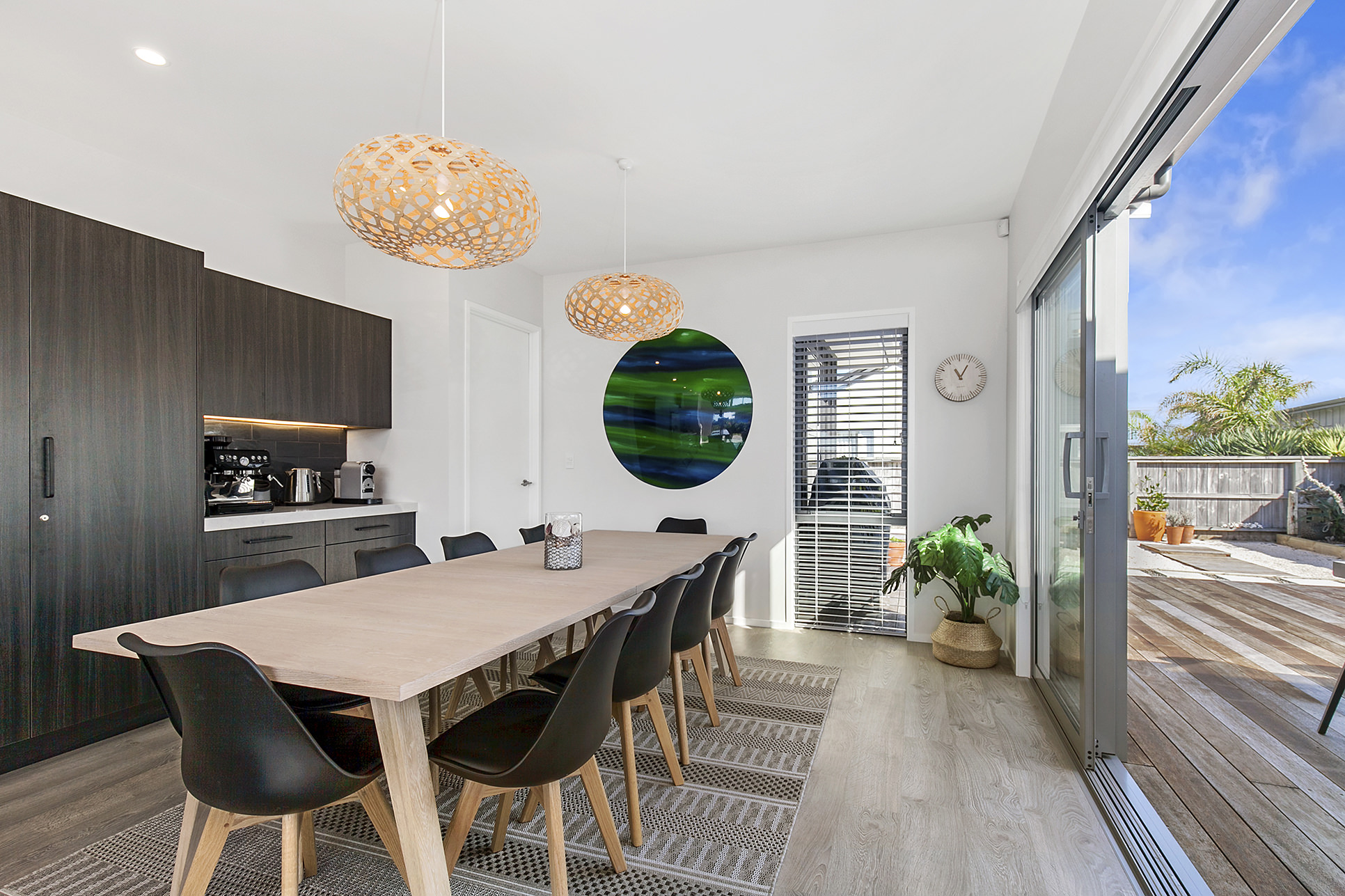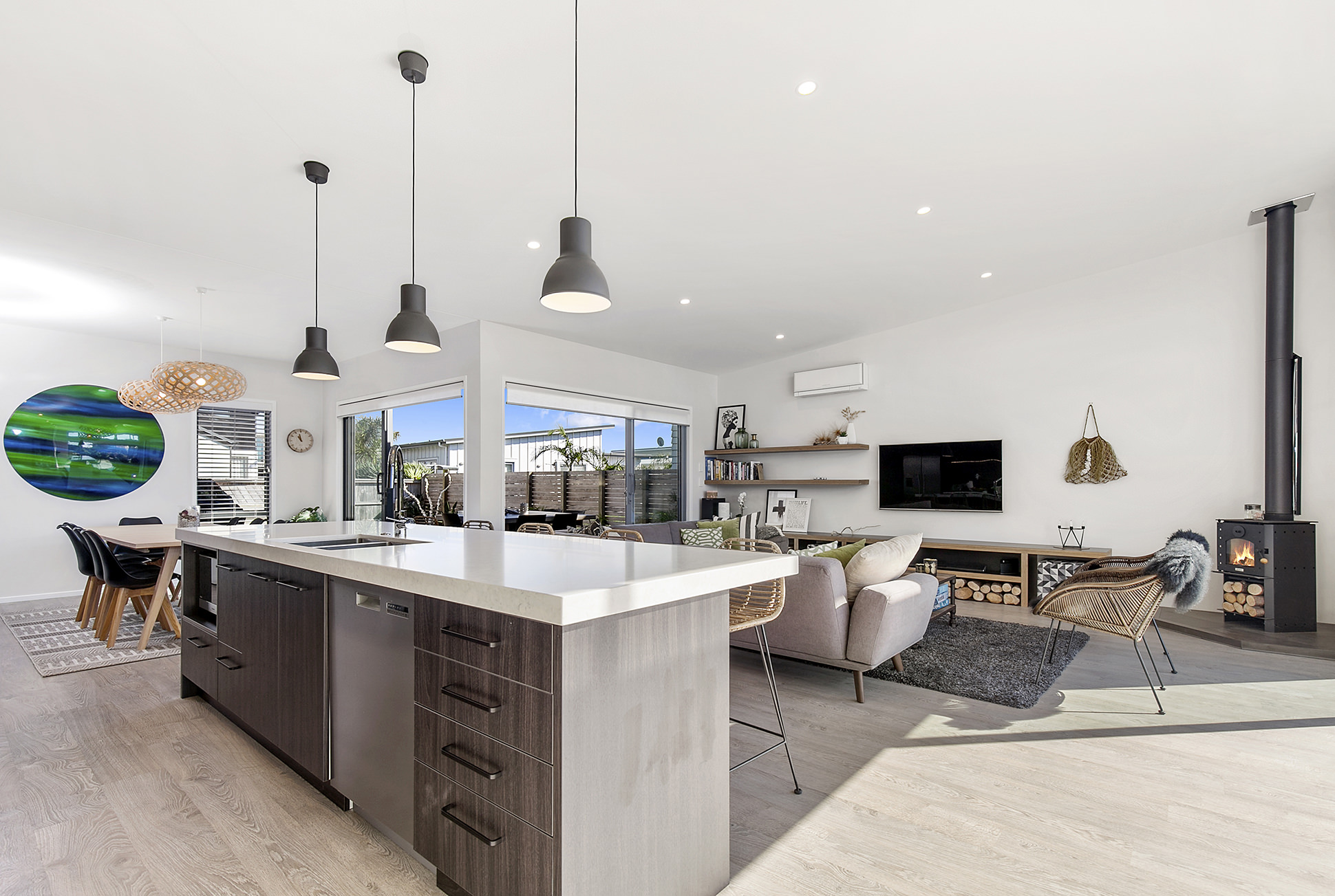 Designed for family fun with potential for short-term rental, this beach house has a breezy relaxed feel and plenty of smart user-friendly features. Gentle contemporary lines, board-and-batten cladding and plenty of glass characterise the exterior. Indoor-outdoor flow to east and west alfresco spaces cleverly dodges a neighbouring house to the north. Spacious yet compact, this home boasts a generous kitchen in its open-plan living area, fostering family interaction. A raking ceiling provides drama. Clerestory windows let in light and create excellent passive ventilation in summer. A wood-burning fire ensures winter stays are just as enjoyable. Four bedrooms and three bathrooms include two master-style retreats with ensuites and walk-in wardrobes. Space for suitcases is a plus for visitors. The downstairs bunk room sleeps four while the fourth bedroom is a double. Key arrangements allow the home to be rented out in one-to-four-bedroom confi gurations, minimising housekeeping. They’ve thought of everything.