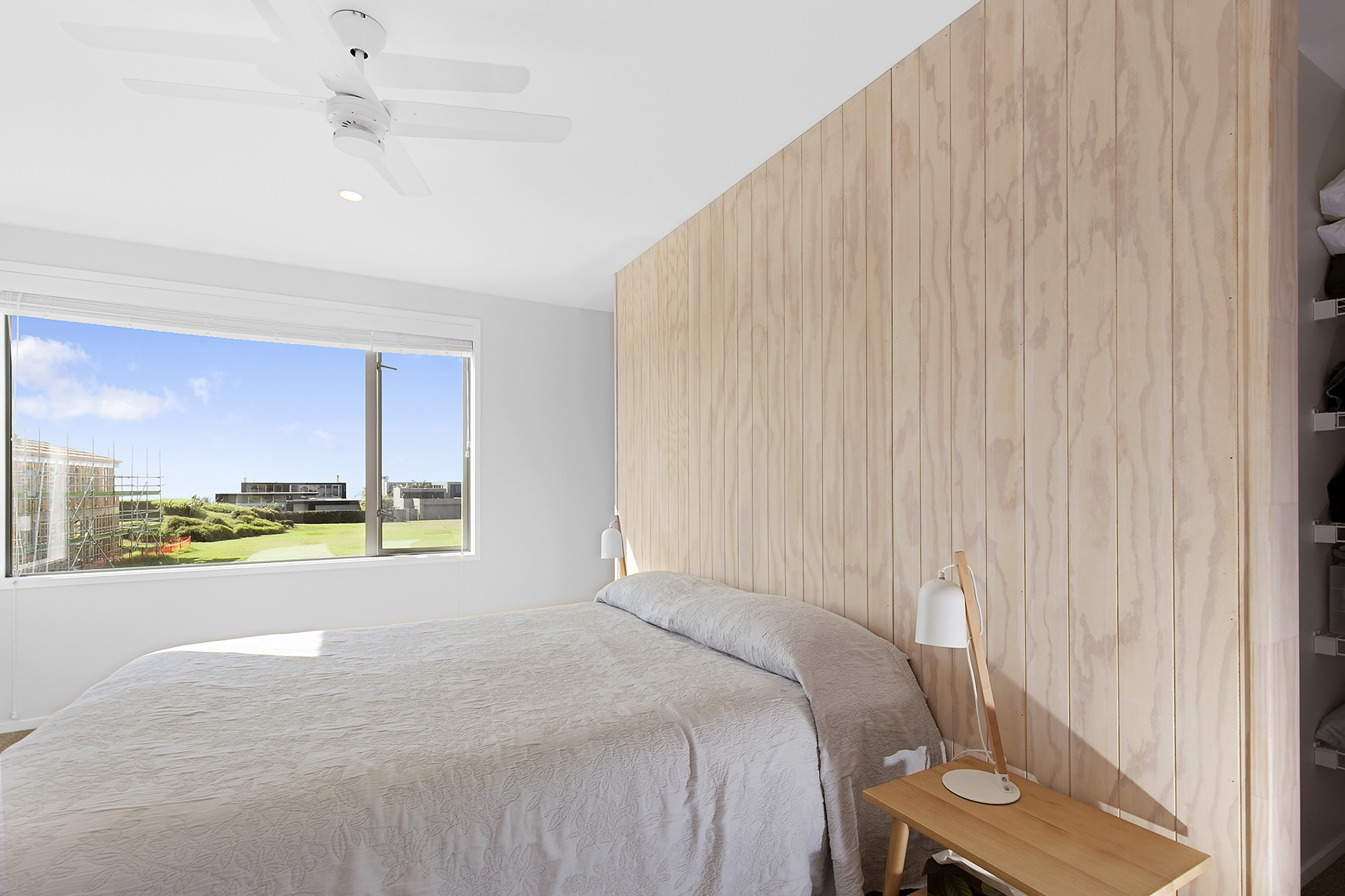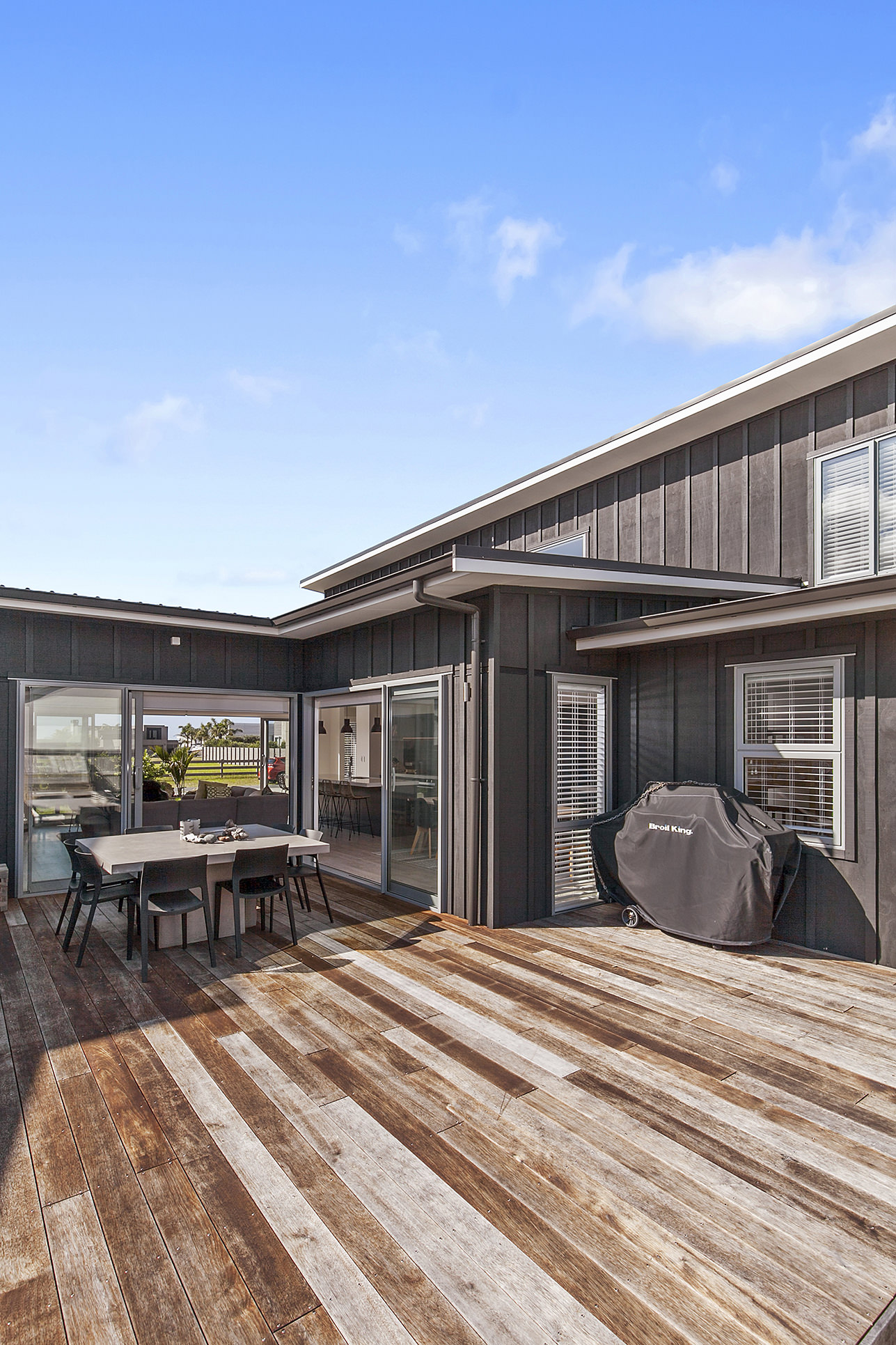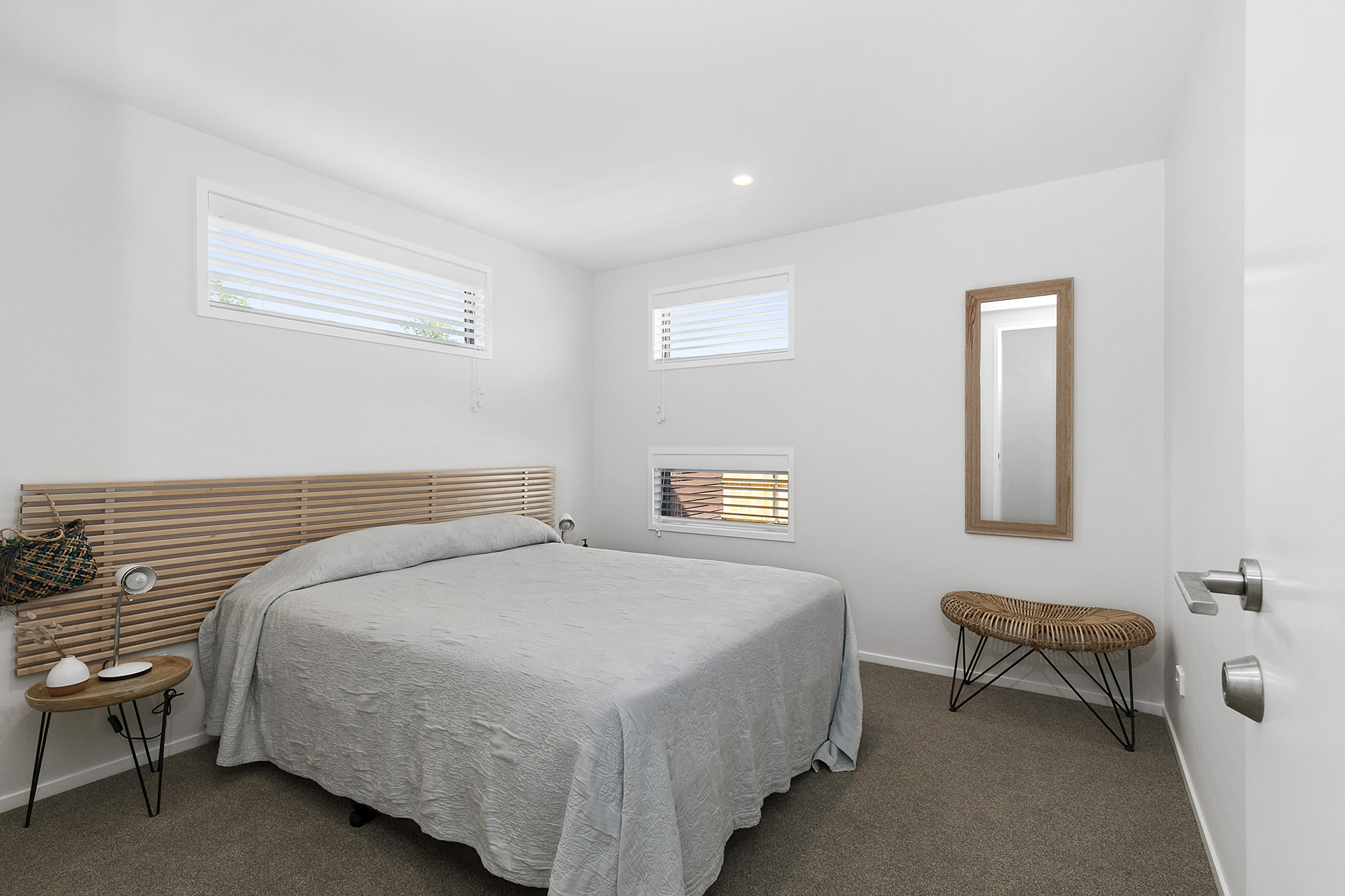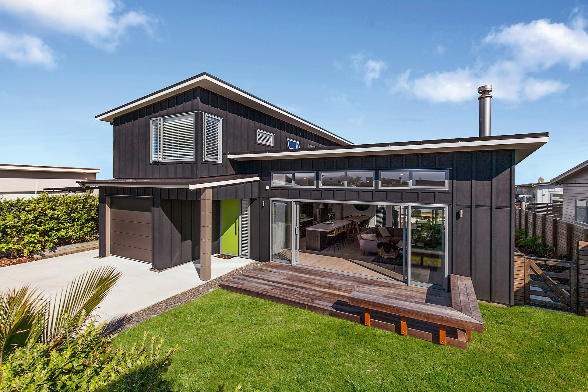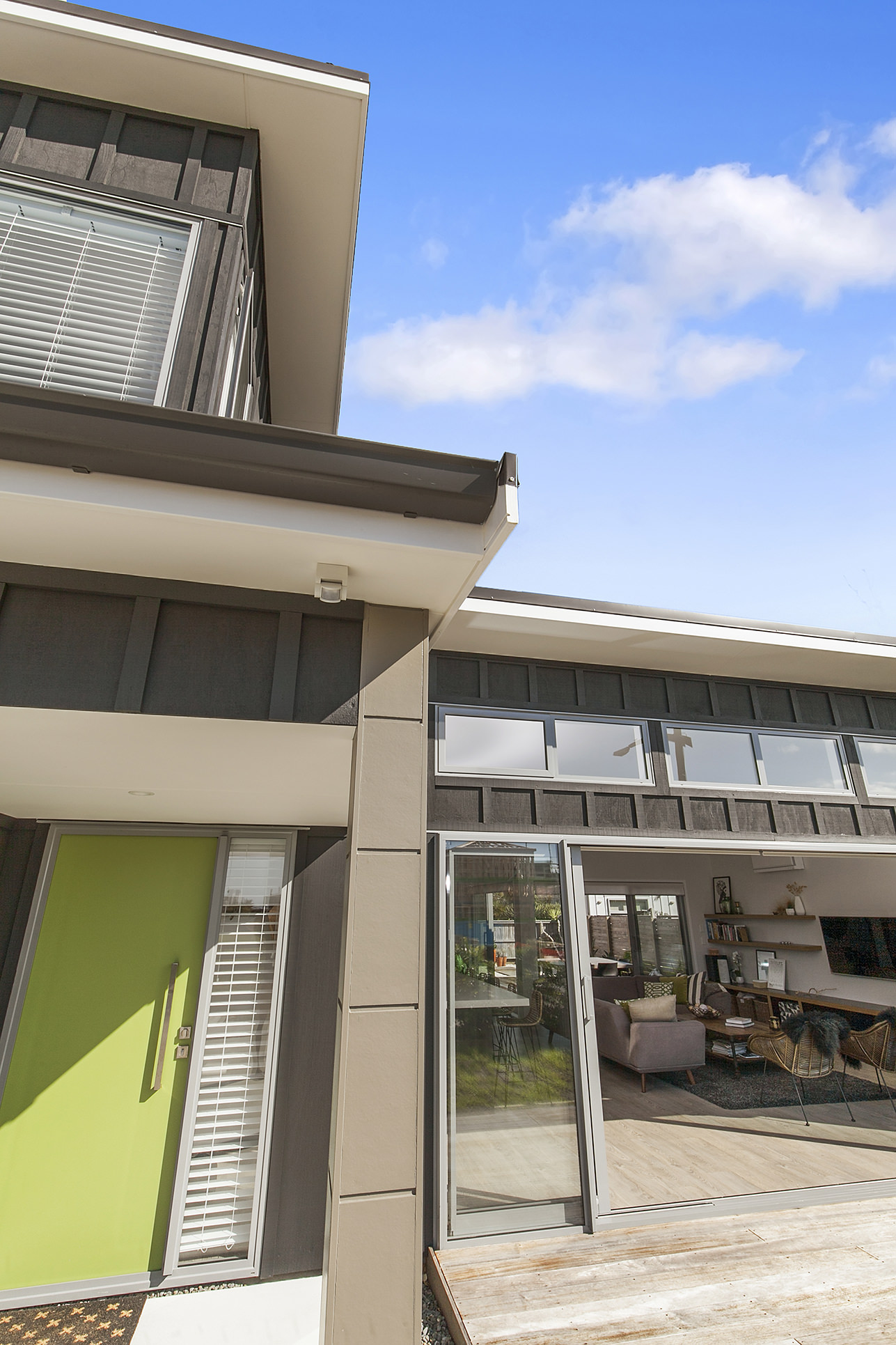 Designed for family fun with potential for short-term rental, this beach house has a breezy relaxed feel and plenty of smart user-friendly features. Gentle contemporary lines, board-and-batten cladding and plenty of glass characterise the exterior. Indoor-outdoor flow to east and west alfresco spaces cleverly dodges a neighbouring house to the north. Spacious yet compact, this home boasts a generous kitchen in its open-plan living area, fostering family interaction. A raking ceiling provides drama. Clerestory windows let in light and create excellent passive ventilation in summer. A wood-burning fire ensures winter stays are just as enjoyable. Four bedrooms and three bathrooms include two master-style retreats with ensuites and walk-in wardrobes. Space for suitcases is a plus for visitors. The downstairs bunk room sleeps four while the fourth bedroom is a double. Key arrangements allow the home to be rented out in one-to-four-bedroom confi gurations, minimising housekeeping. They’ve thought of everything.