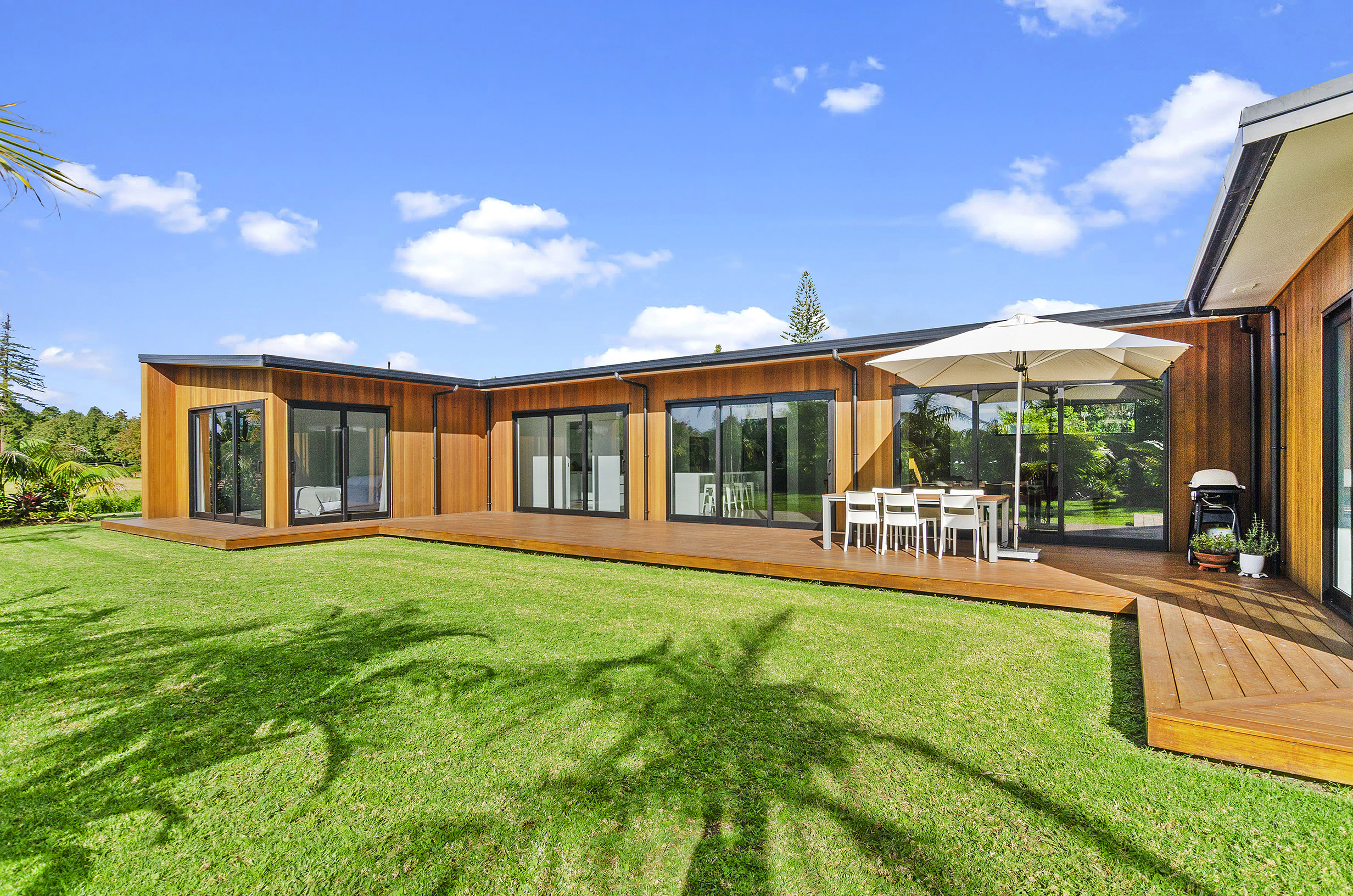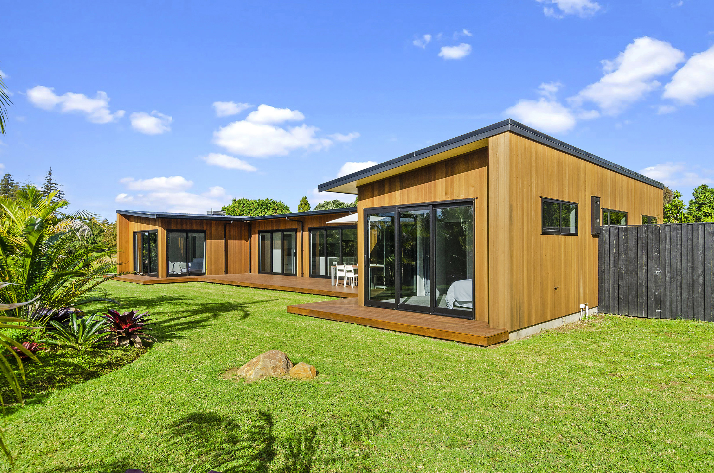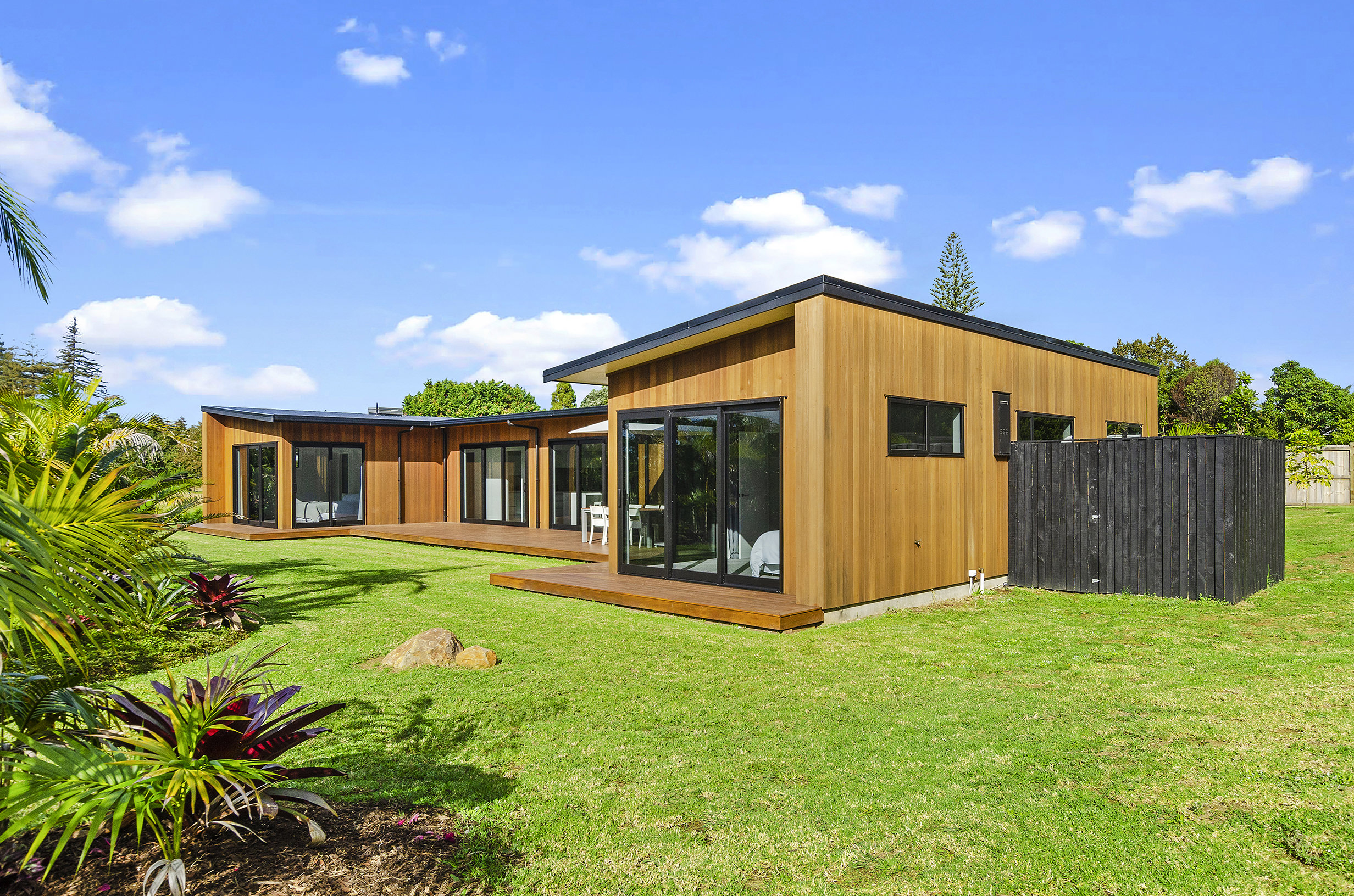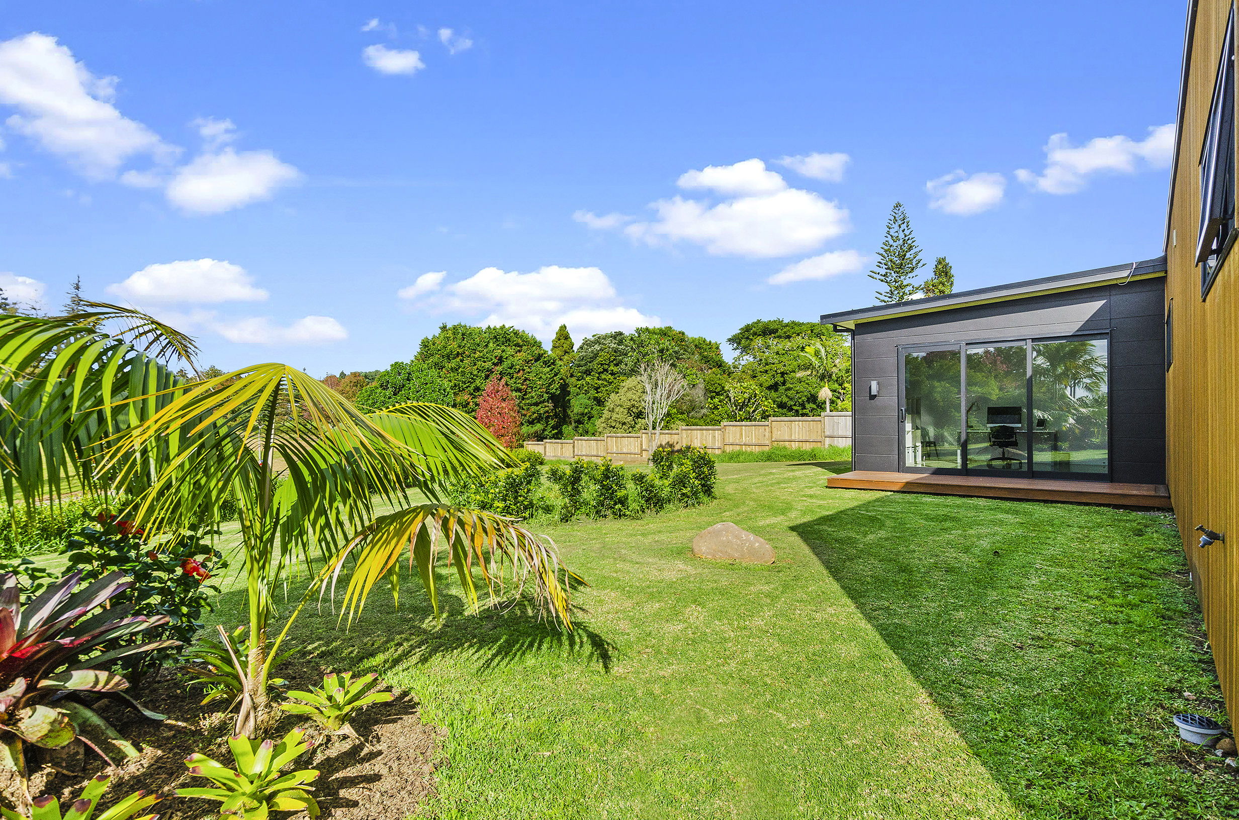 Clad in a warm golden wood, this Northland home sits in harmony with its surrounds. A real nature lover, its large windows and glass sliding doors bring the outdoors in and foster flow to exterior living options. Extensive decks to the north bask in all-day sun. Polished concrete provides a durable and functional stage for family life and entertaining in the open-plan area. The hard-working material laps up solar gain, taking hold of the heat and releasing it into the evening. A wood screen provides subtle separation between family and living spaces. The theatre room and bedrooms are carpeted for extra comfort. The scullery and laundry are discreetly tucked away between the kitchen and garage. The master with ensuite and studio reside in one wing, while two further bedrooms and a modern bathroom are located in the other. The 252sqm layout ensures good separation for busy family life. A freestanding bathtub beckons for luxurious soaking with that open-air feel. A huge picture window frames a lush garden view.
