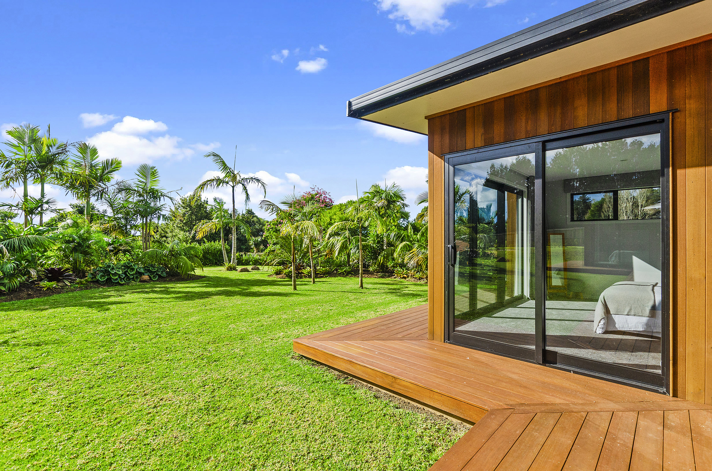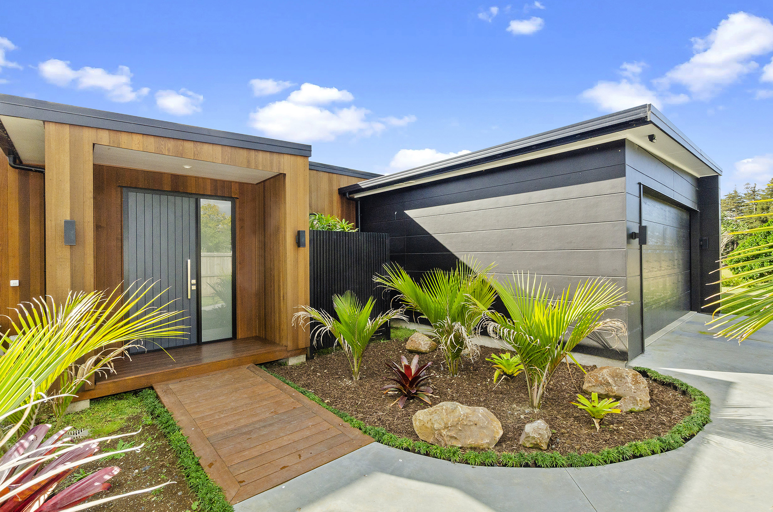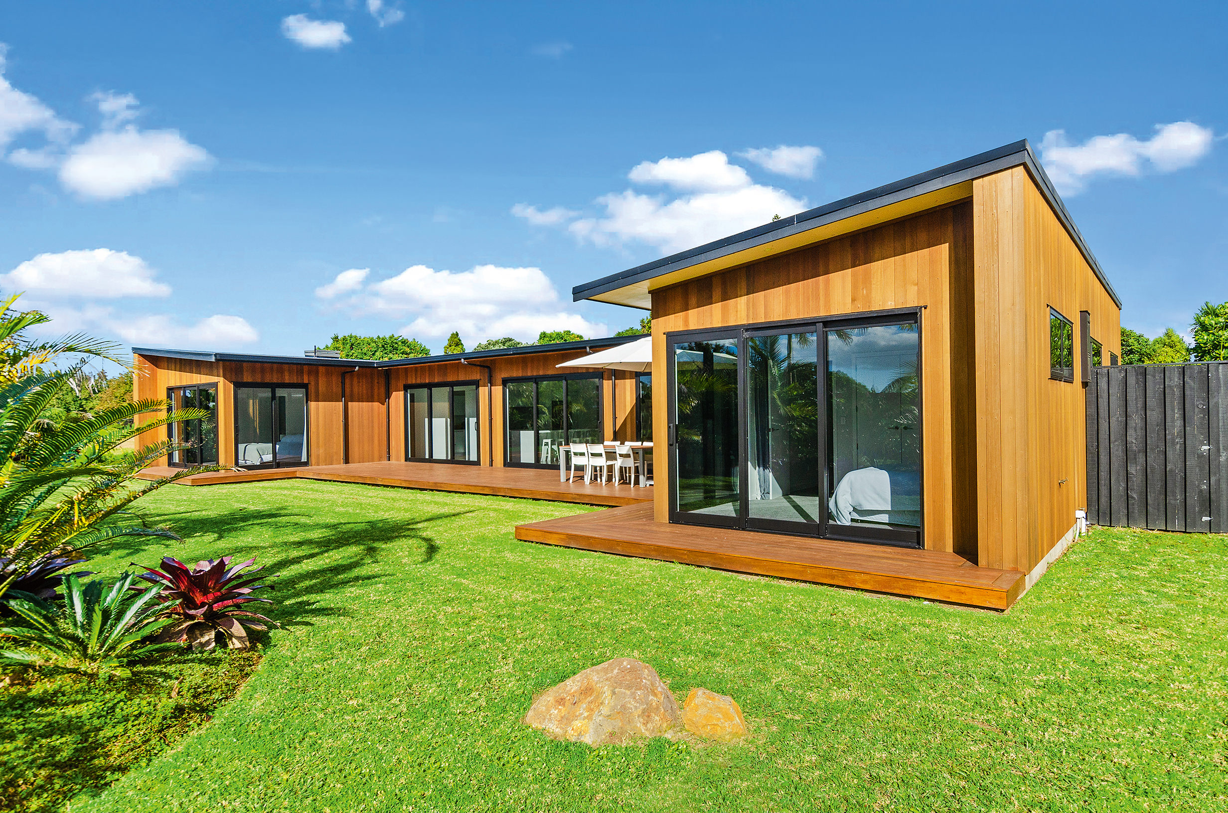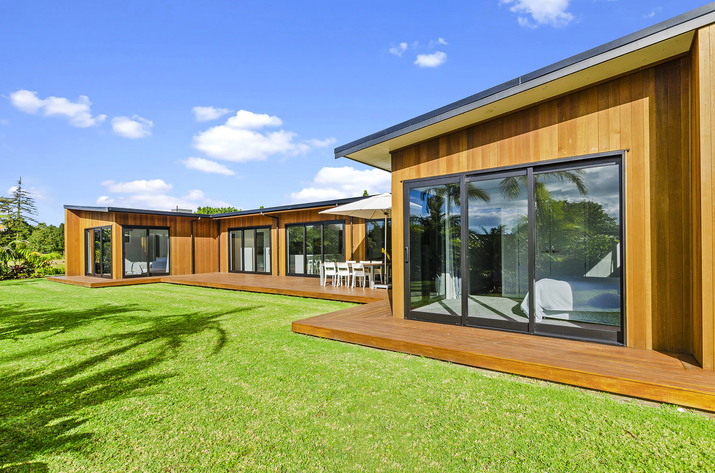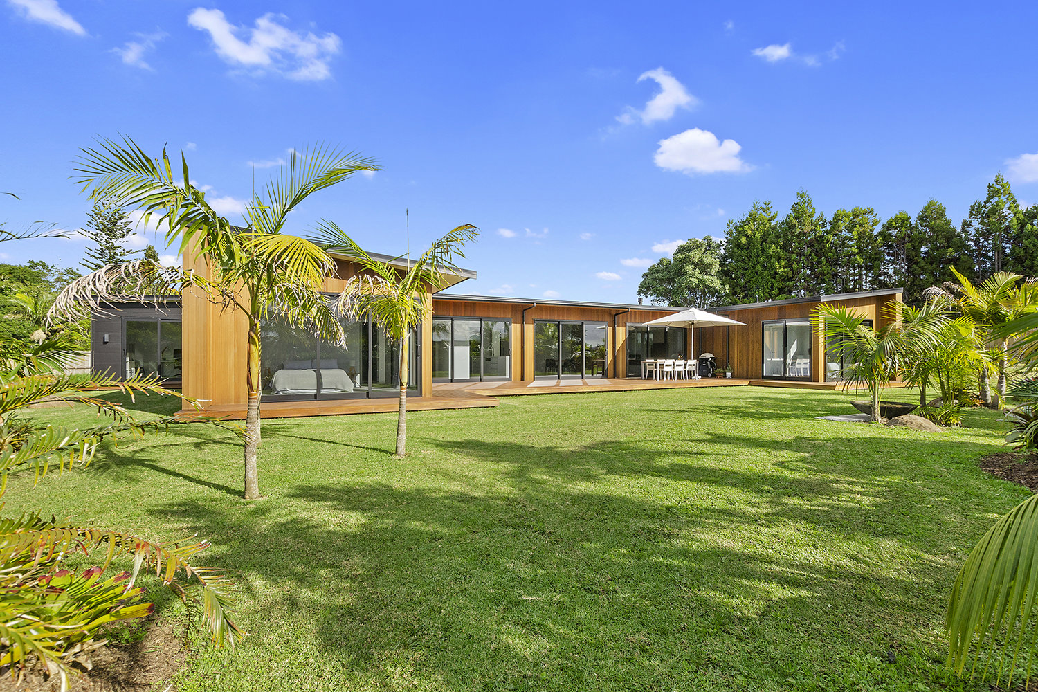 Clad in a warm golden wood, this Northland home sits in harmony with its surrounds. A real nature lover, its large windows and glass sliding doors bring the outdoors in and foster flow to exterior living options. Extensive decks to the north bask in all-day sun. Polished concrete provides a durable and functional stage for family life and entertaining in the open-plan area. The hard-working material laps up solar gain, taking hold of the heat and releasing it into the evening. A wood screen provides subtle separation between family and living spaces. The theatre room and bedrooms are carpeted for extra comfort. The scullery and laundry are discreetly tucked away between the kitchen and garage. The master with ensuite and studio reside in one wing, while two further bedrooms and a modern bathroom are located in the other. The 252sqm layout ensures good separation for busy family life. A freestanding bathtub beckons for luxurious soaking with that open-air feel. A huge picture window frames a lush garden view.