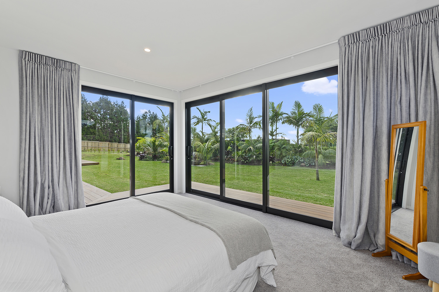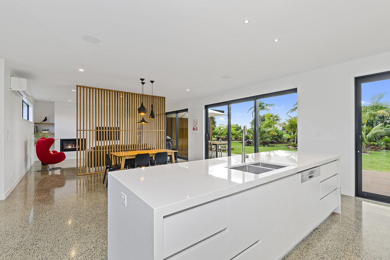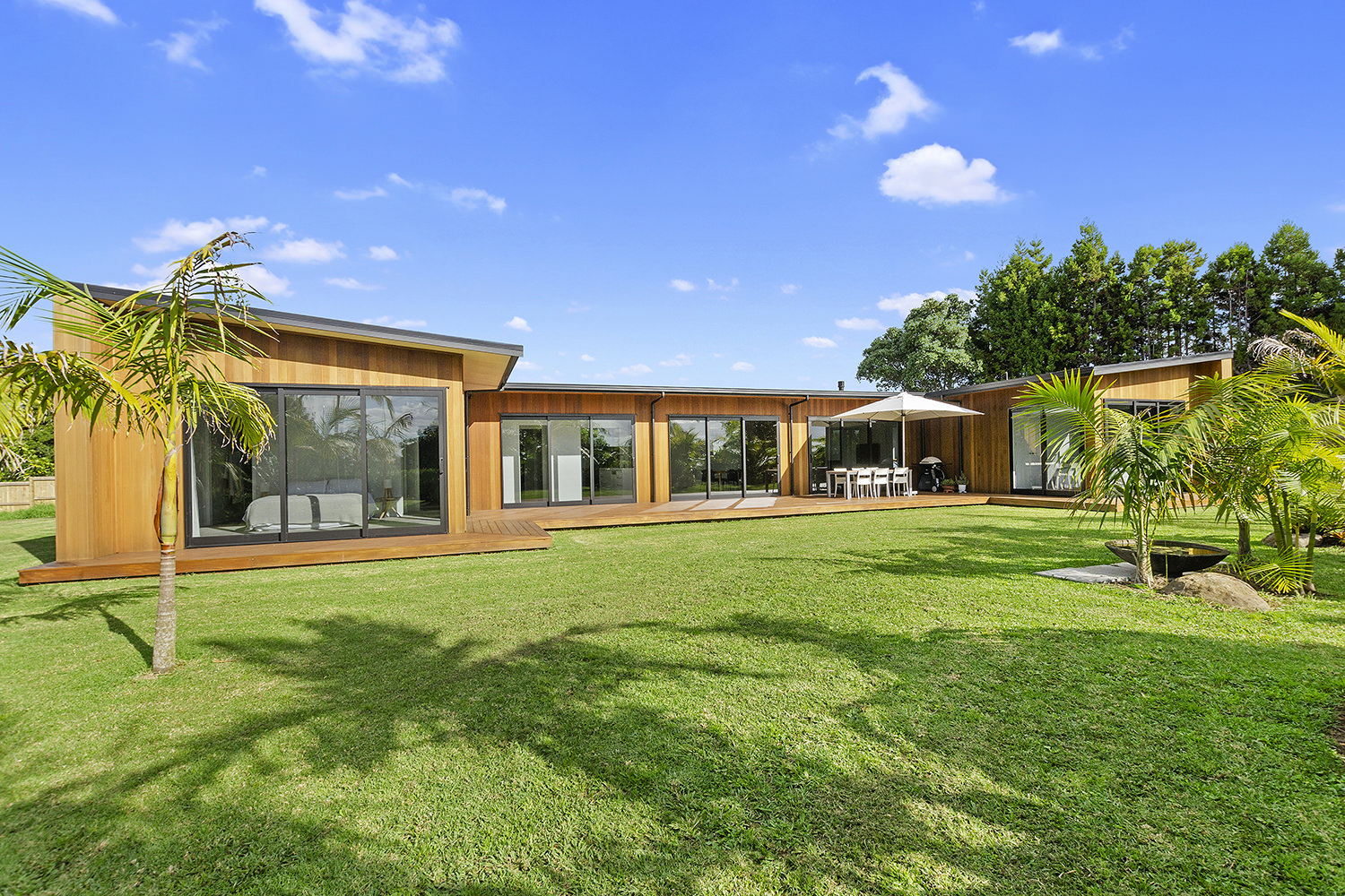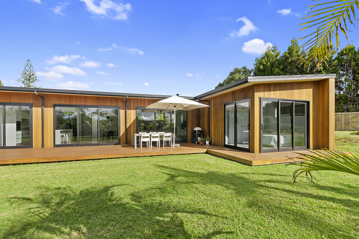 Clad in a warm golden wood, this Northland home sits in harmony with its surrounds. A real nature lover, its large windows and glass sliding doors bring the outdoors in and foster flow to exterior living options. Extensive decks to the north bask in all-day sun. Polished concrete provides a durable and functional stage for family life and entertaining in the open-plan area. The hard-working material laps up solar gain, taking hold of the heat and releasing it into the evening. A wood screen provides subtle separation between family and living spaces. The theatre room and bedrooms are carpeted for extra comfort. The scullery and laundry are discreetly tucked away between the kitchen and garage. The master with ensuite and studio reside in one wing, while two further bedrooms and a modern bathroom are located in the other. The 252sqm layout ensures good separation for busy family life. A freestanding bathtub beckons for luxurious soaking with that open-air feel. A huge picture window frames a lush garden view.