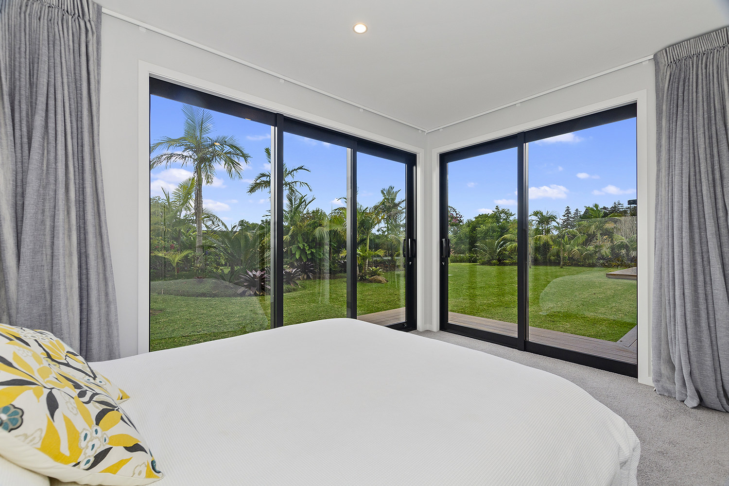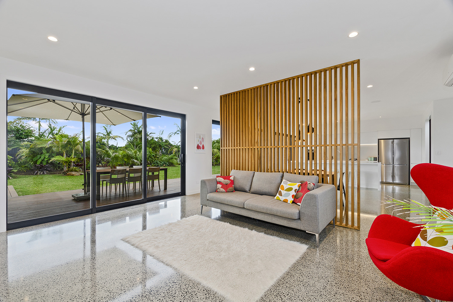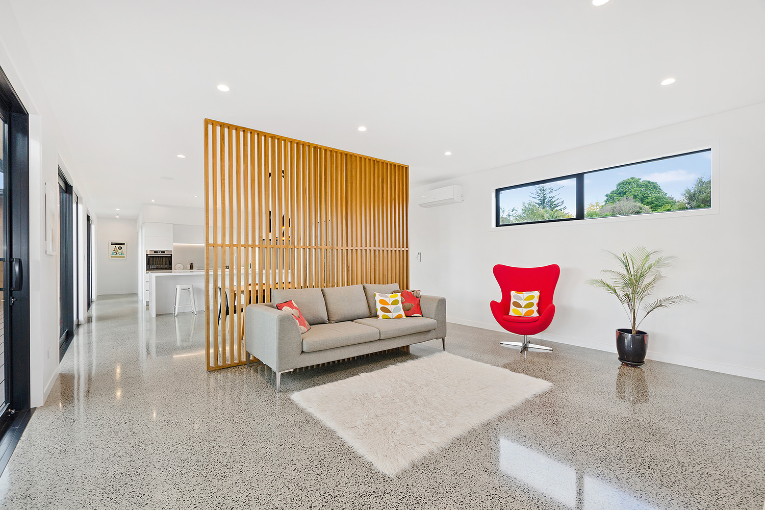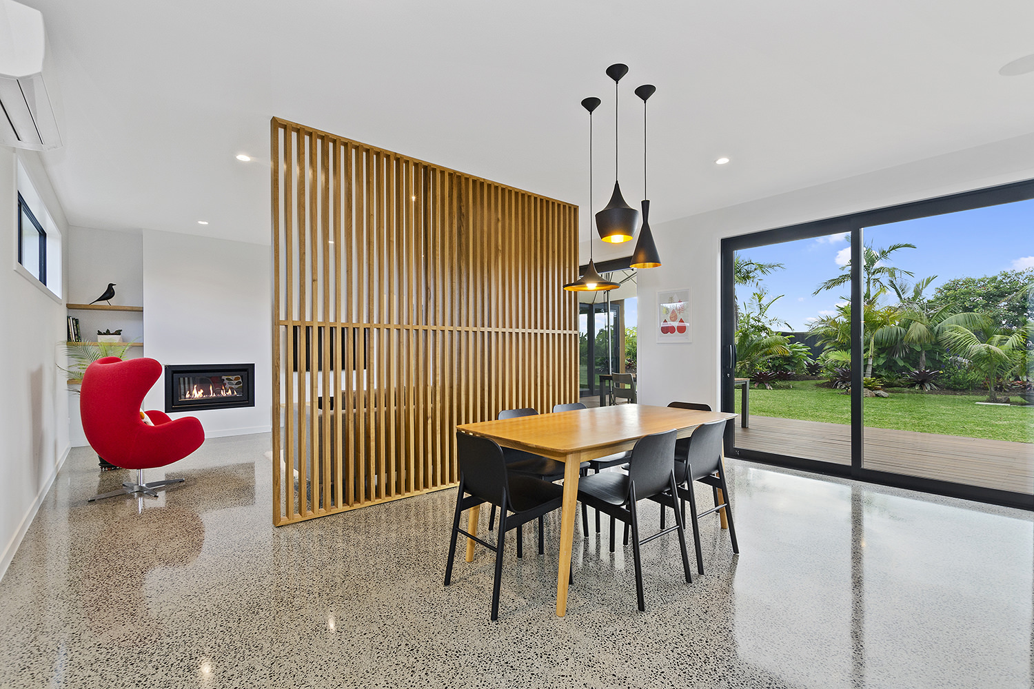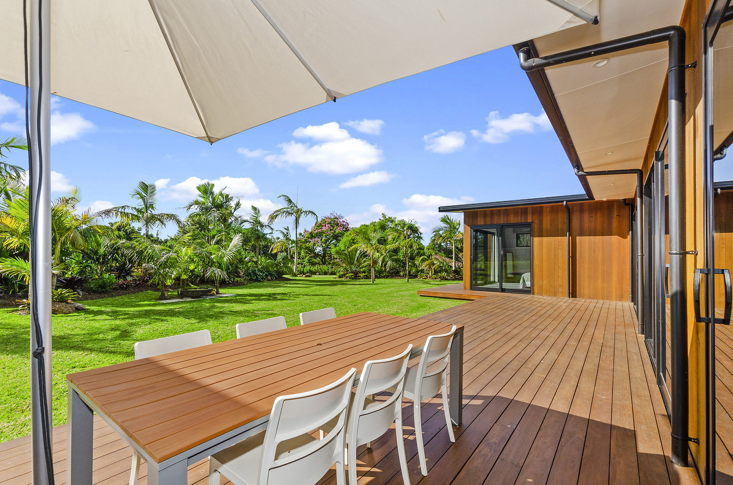 Clad in a warm golden wood, this Northland home sits in harmony with its surrounds. A real nature lover, its large windows and glass sliding doors bring the outdoors in and foster flow to exterior living options. Extensive decks to the north bask in all-day sun. Polished concrete provides a durable and functional stage for family life and entertaining in the open-plan area. The hard-working material laps up solar gain, taking hold of the heat and releasing it into the evening. A wood screen provides subtle separation between family and living spaces. The theatre room and bedrooms are carpeted for extra comfort. The scullery and laundry are discreetly tucked away between the kitchen and garage. The master with ensuite and studio reside in one wing, while two further bedrooms and a modern bathroom are located in the other. The 252sqm layout ensures good separation for busy family life. A freestanding bathtub beckons for luxurious soaking with that open-air feel. A huge picture window frames a lush garden view.