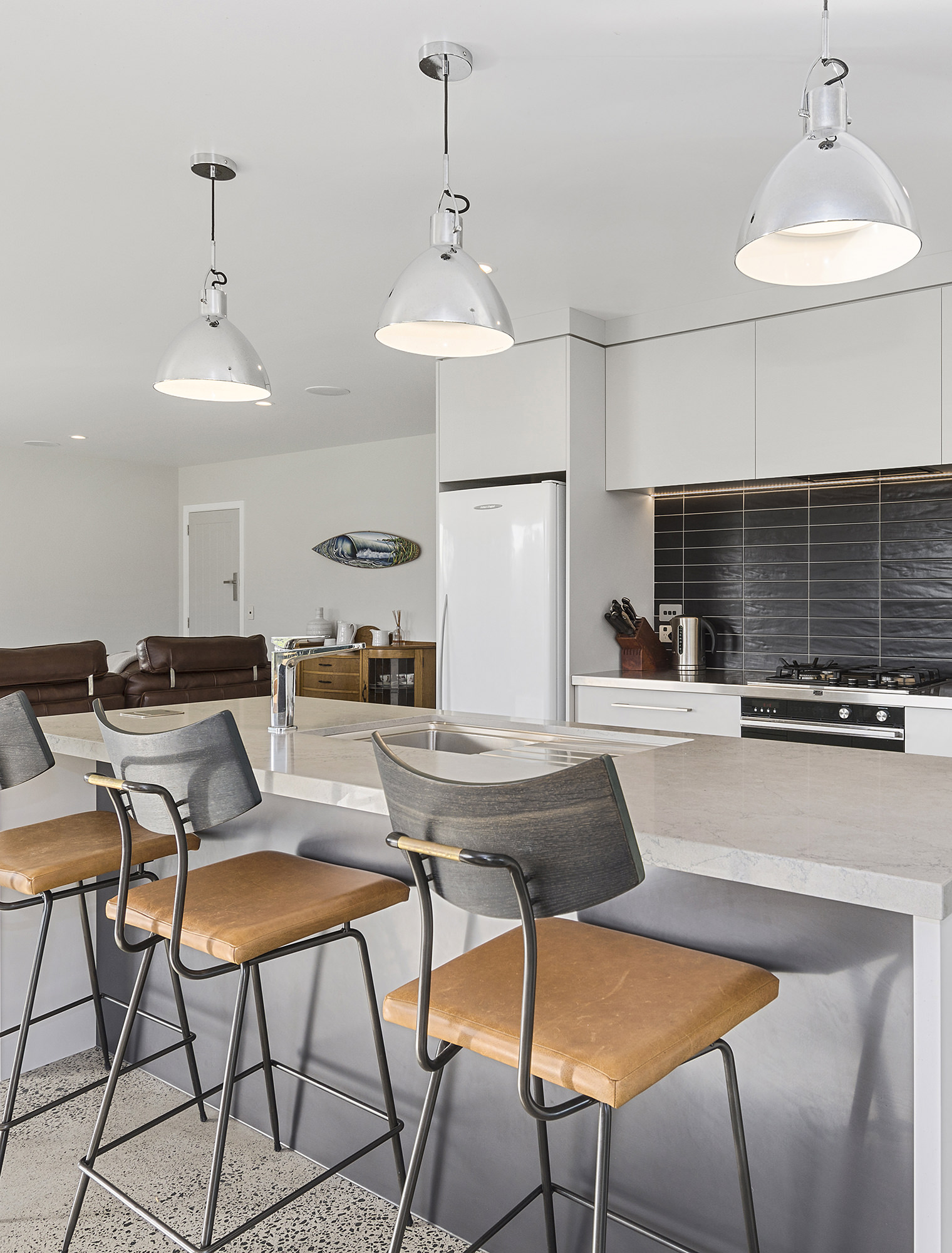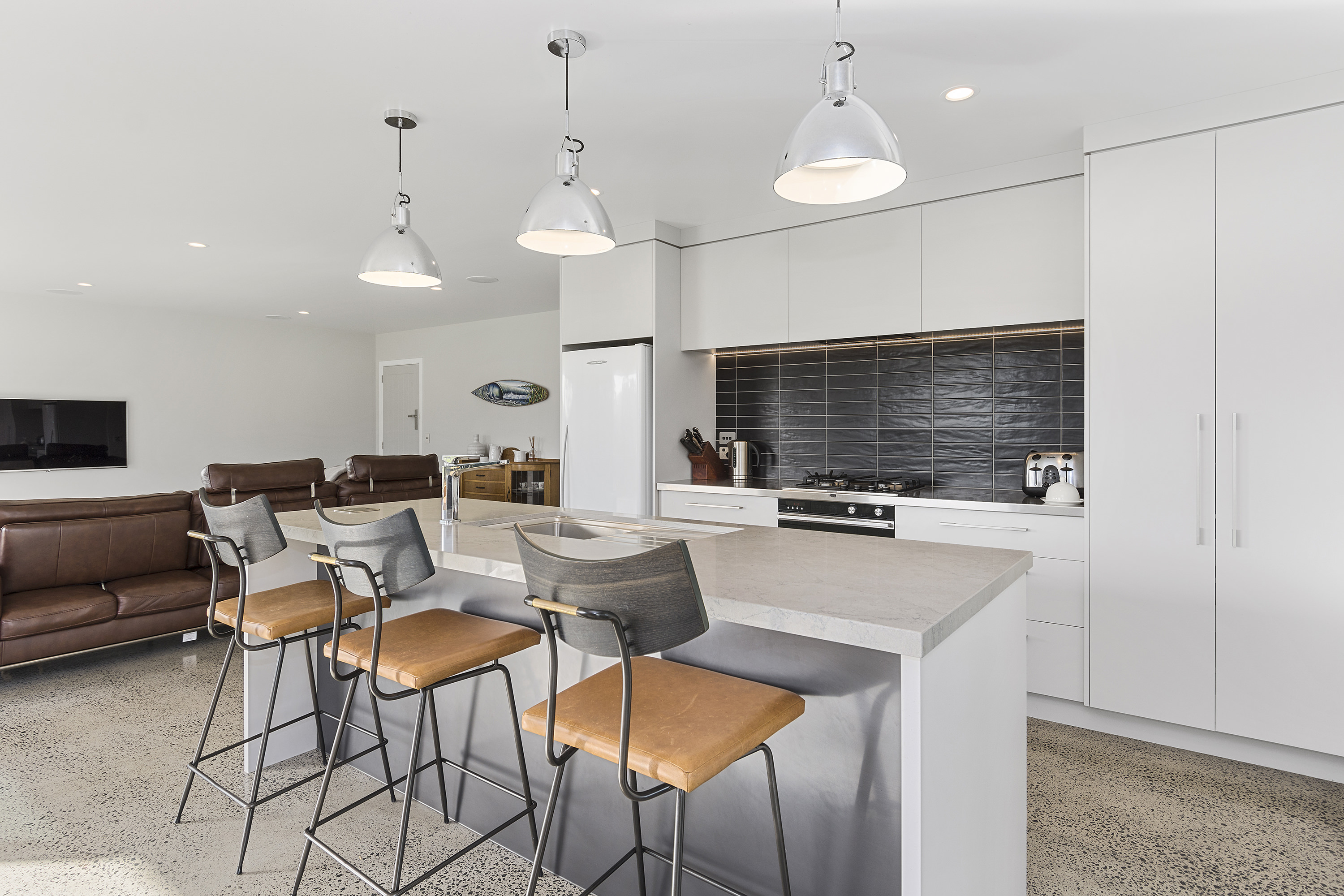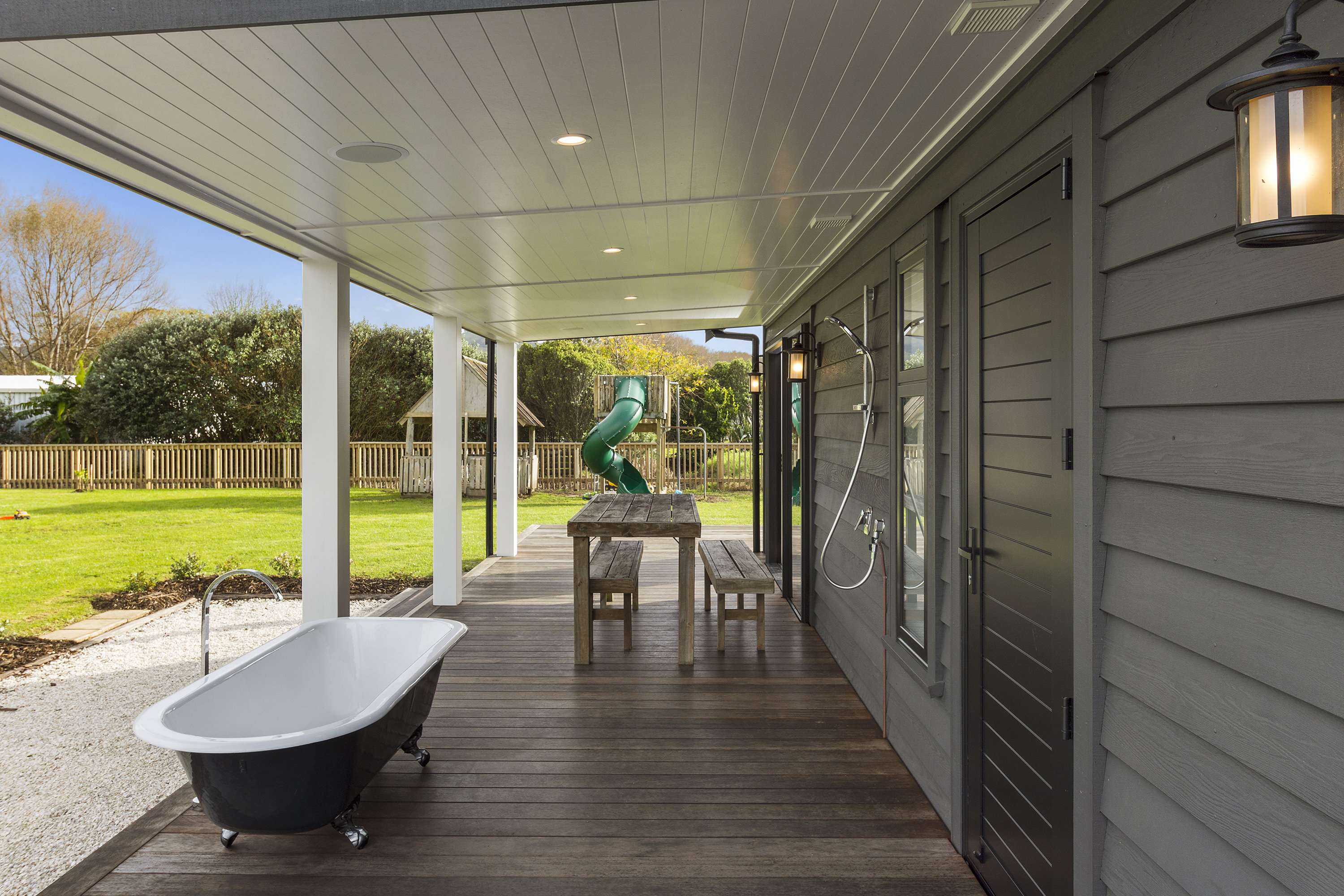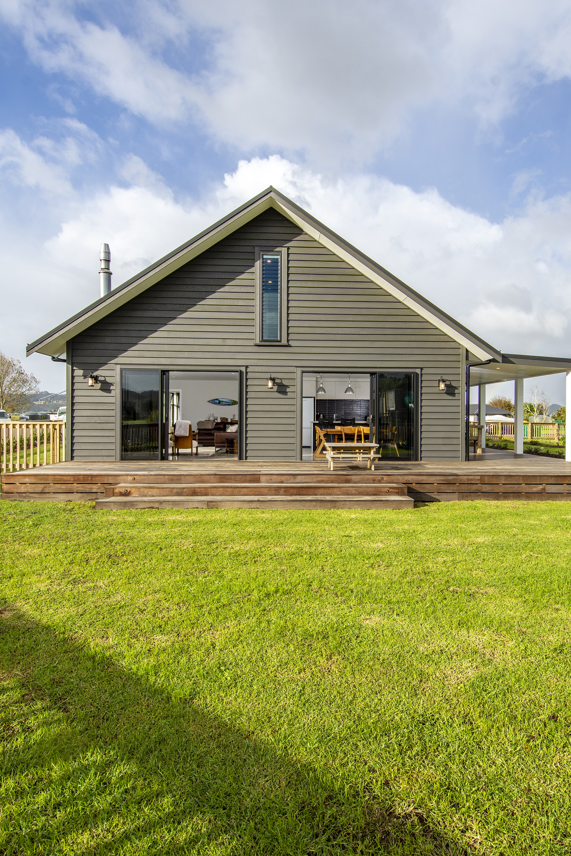 Thanks to clever use of trusses, three of the bedrooms in this four-bedroom Whitianga beach house are located in the roof space. Now that’s what you call using your head. A spacious open-plan kitchen/dining/living area accommodates everyday play and relaxation on the ground floor. It’s beautifully equipped for serving the masses. Large glazed sliding doors ensure the home remains connected to the outdoors. North and westfacing decks provide options for alfresco entertaining. An outdoor shower and clawfoot bath set under the veranda deliver the ultimate in open-air indulgence. Sunlight spills onto polished concrete which harnesses the heat to release it in the evening. A wood burner turns up the cosiness for super-snug winter stays. A games room provides endless fun, while bunks bed-down the inevitable overflow of guests. Fully insulated and clad with cedar, this low-key yet luxurious home is in tune not only with the environment, but with the needs of owners and guests.