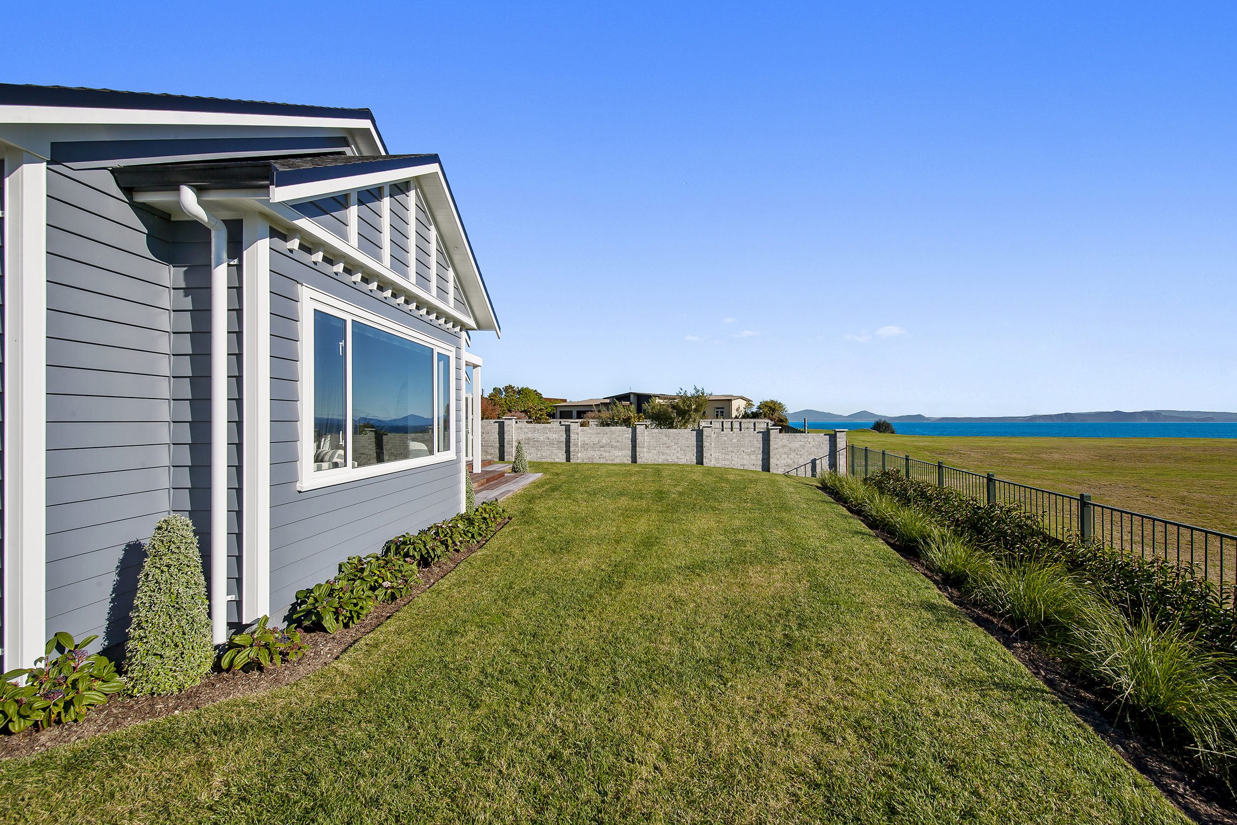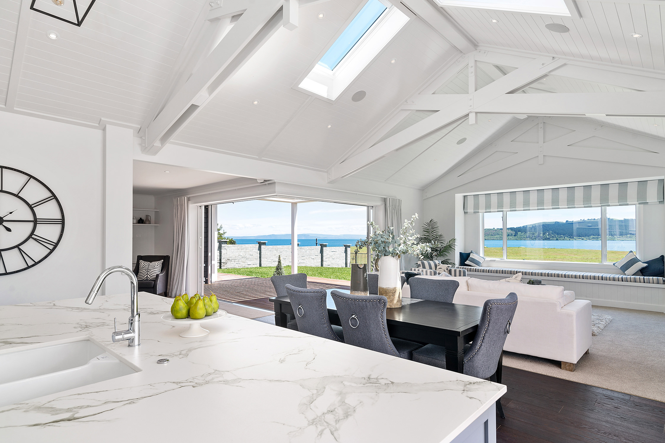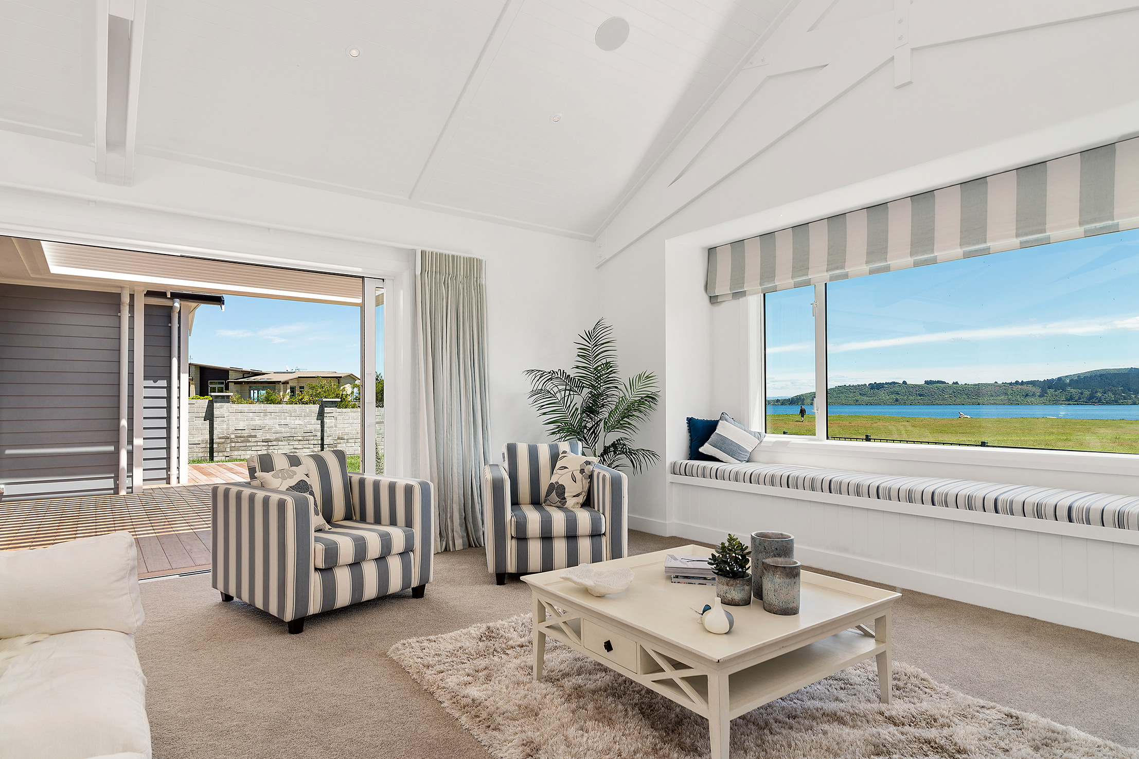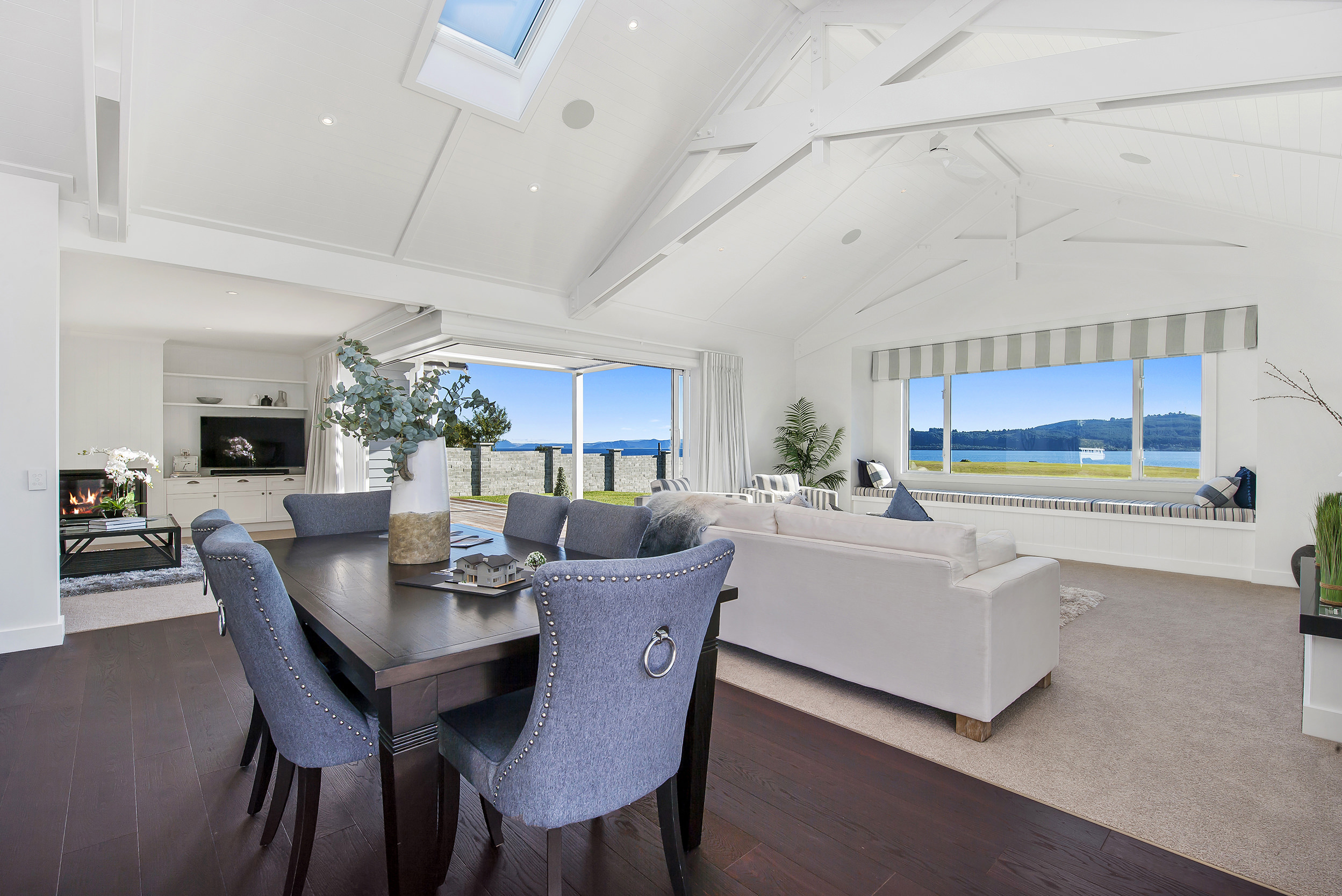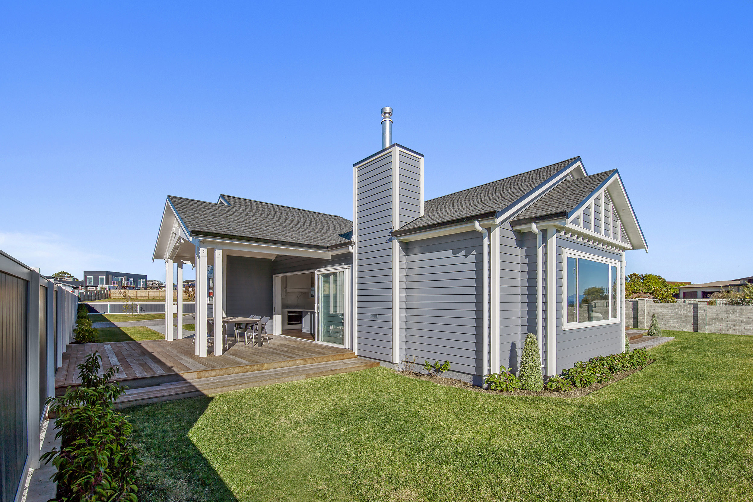The epitome of elegant, laidback lakeside living, this timeless family home rests on the water’s edge in Wharewaka Point. The four-bedroom, three-bathroom residence opens beautifully to the outdoors, making the most of its stunning location. Inside, all manner of modern convenience awaits, from the contemporary entertainer’s kitchen to the well-appointed bathrooms including master ensuite. A chic palette of whites and greys creates a relaxed atmosphere throughout, enhanced by loads of natural light. Dark wood floors are a grounding force. Built in an established residential subdivision, the home offers privacy while remaining connected to views and alfresco living. The 303sqm layout forms two core wings, with outdoor living options to both the east and west of the open-plan space. Pillarless corner sliders make indoor-outdoor entertaining a breeze. Weatherboard cladding with gable detailing, an asphalt shingle roof, and barn-style garage and front doors all lend themselves to the traditional homely feel of this warm and inviting abode.