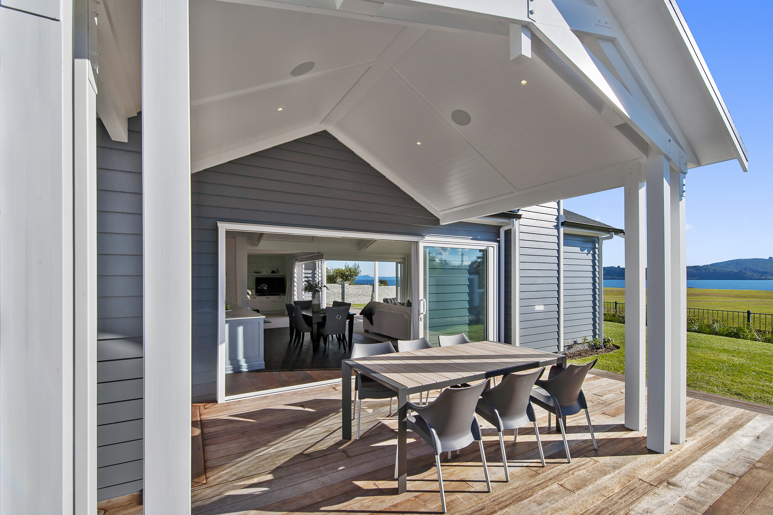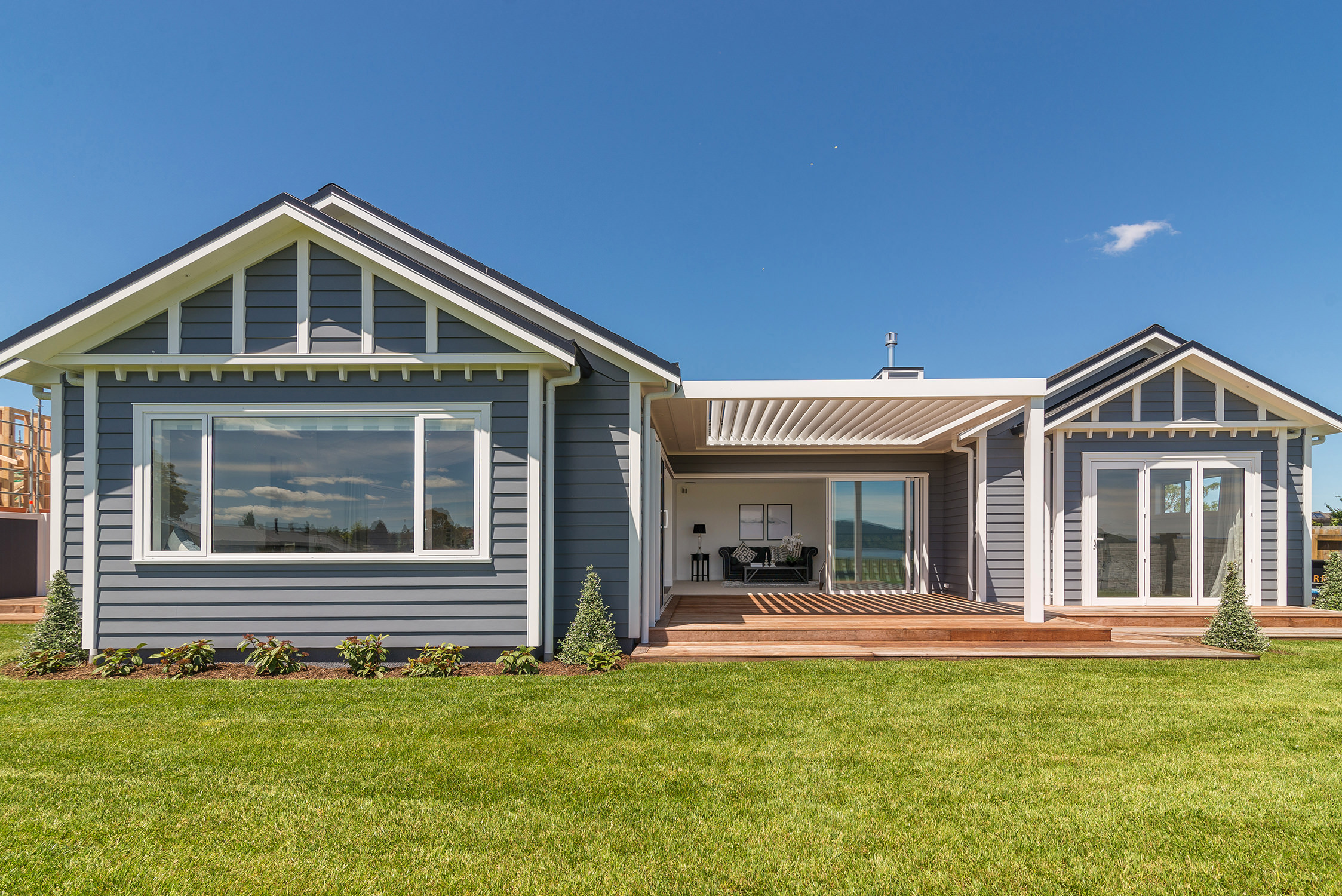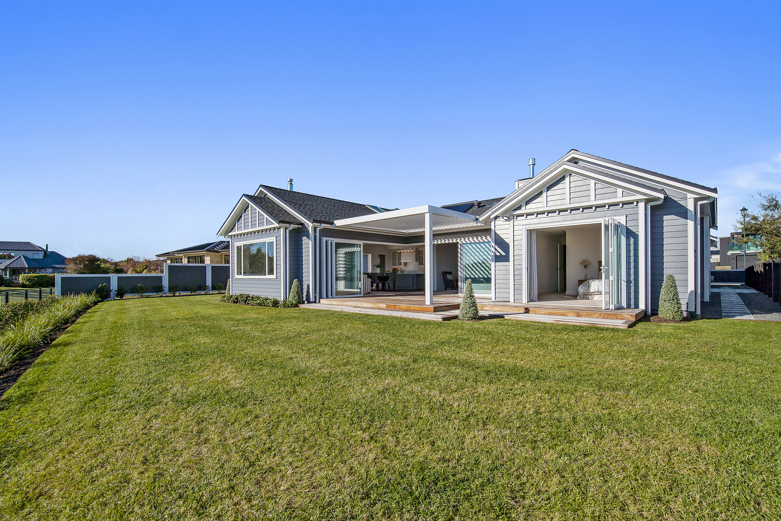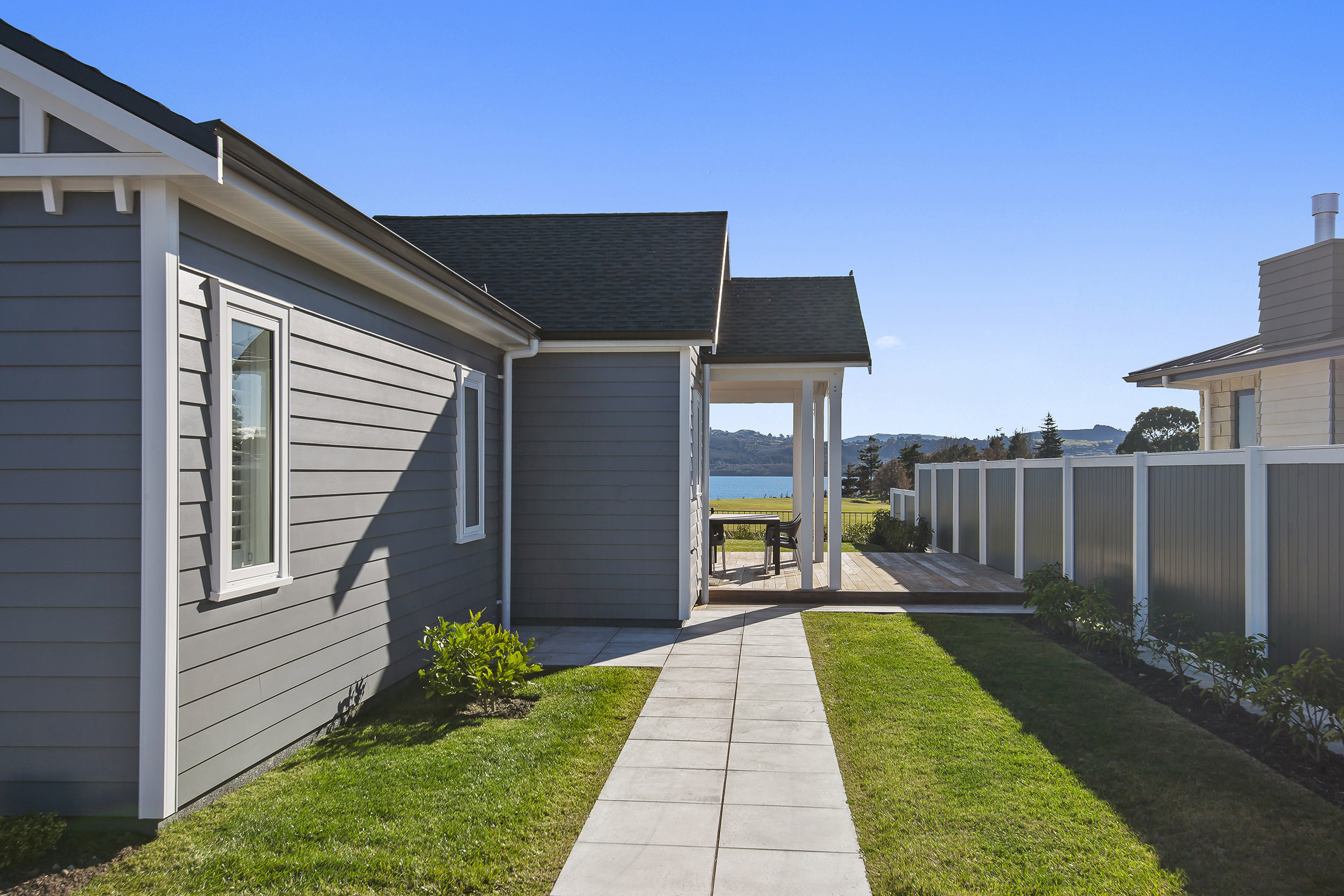 The epitome of elegant, laidback lakeside living, this timeless family home rests on the water’s edge in Wharewaka Point. The four-bedroom, three-bathroom residence opens beautifully to the outdoors, making the most of its stunning location. Inside, all manner of modern convenience awaits, from the contemporary entertainer’s kitchen to the well-appointed bathrooms including master ensuite. A chic palette of whites and greys creates a relaxed atmosphere throughout, enhanced by loads of natural light. Dark wood floors are a grounding force. Built in an established residential subdivision, the home offers privacy while remaining connected to views and alfresco living. The 303sqm layout forms two core wings, with outdoor living options to both the east and west of the open-plan space. Pillarless corner sliders make indoor-outdoor entertaining a breeze. Weatherboard cladding with gable detailing, an asphalt shingle roof, and barn-style garage and front doors all lend themselves to the traditional homely feel of this warm and inviting abode.