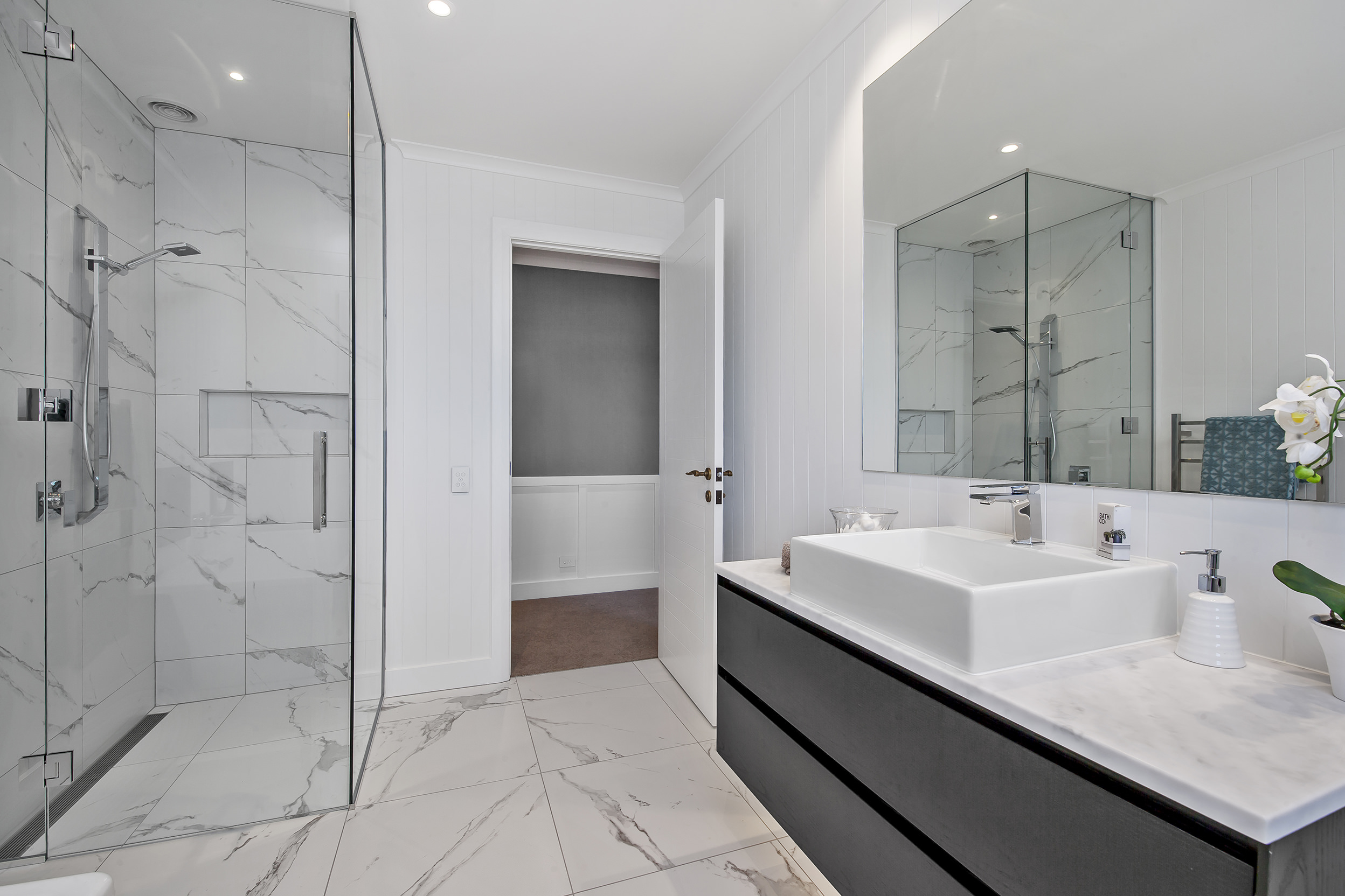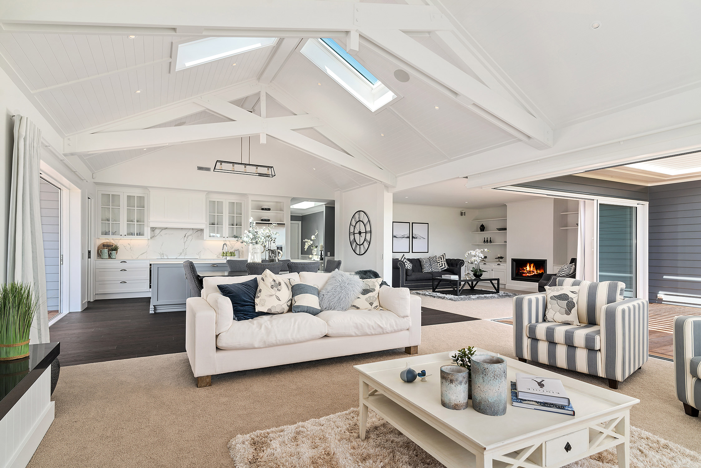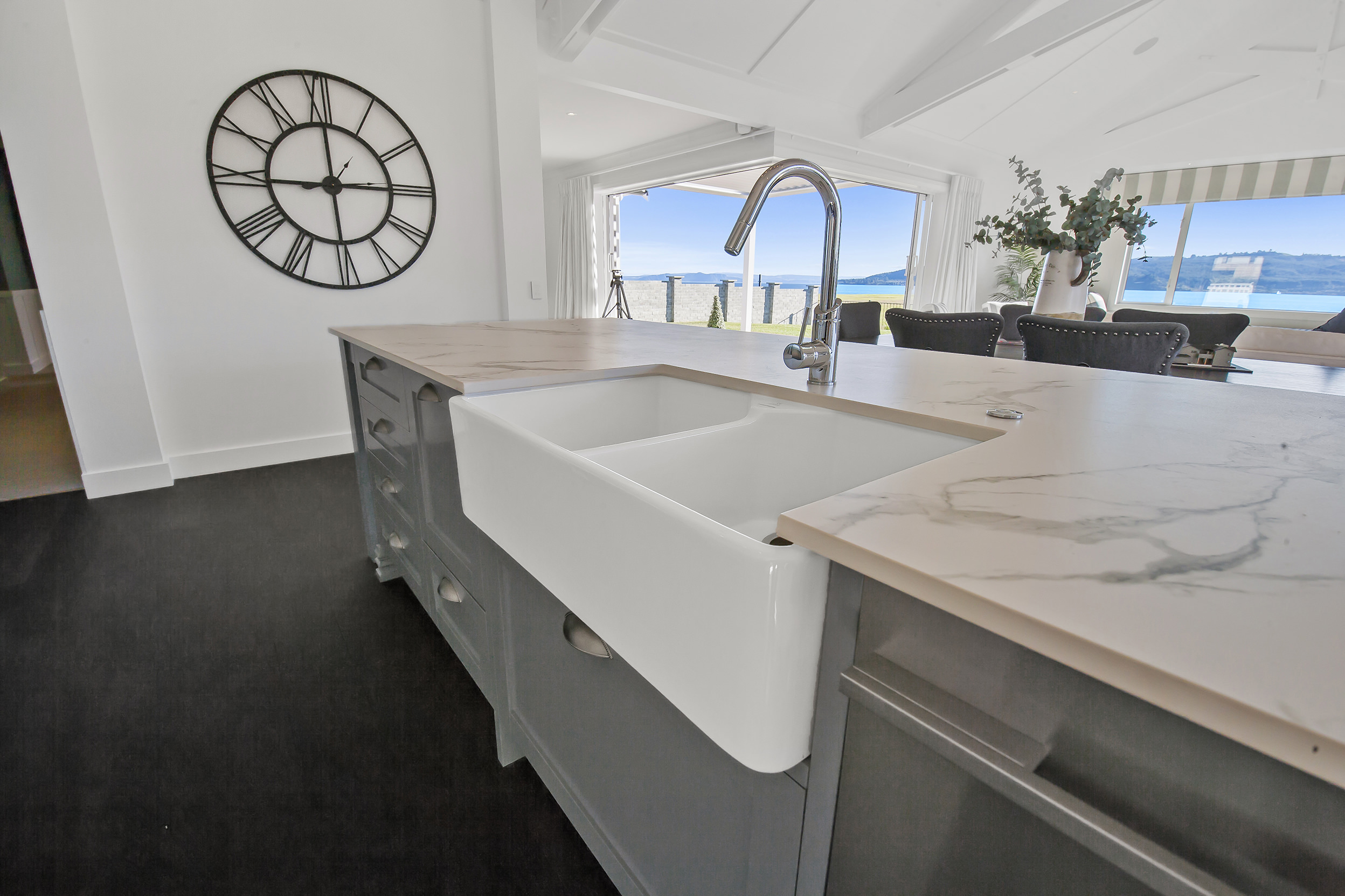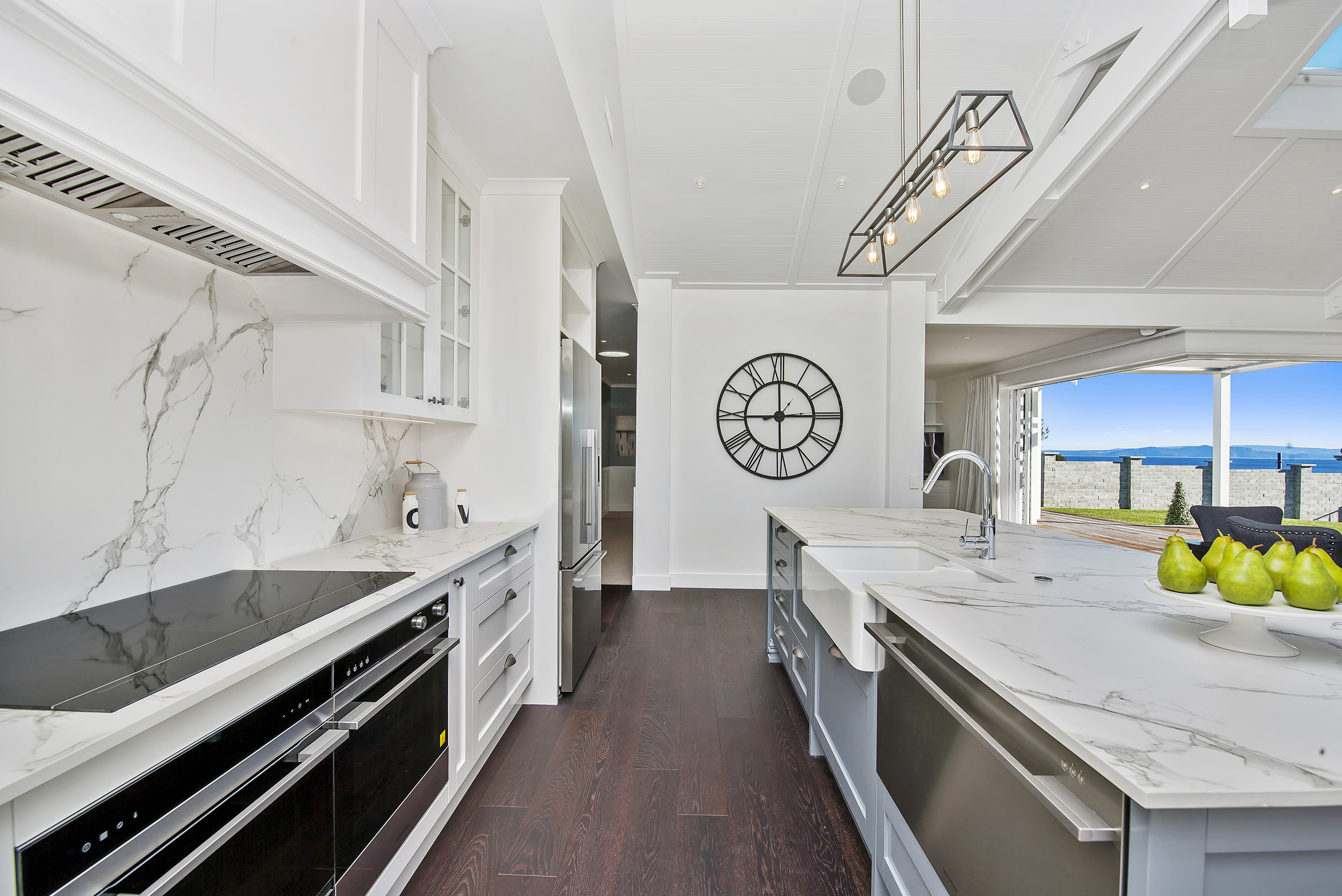 The epitome of elegant, laidback lakeside living, this timeless family home rests on the water’s edge in Wharewaka Point. The four-bedroom, three-bathroom residence opens beautifully to the outdoors, making the most of its stunning location. Inside, all manner of modern convenience awaits, from the contemporary entertainer’s kitchen to the well-appointed bathrooms including master ensuite. A chic palette of whites and greys creates a relaxed atmosphere throughout, enhanced by loads of natural light. Dark wood floors are a grounding force. Built in an established residential subdivision, the home offers privacy while remaining connected to views and alfresco living. The 303sqm layout forms two core wings, with outdoor living options to both the east and west of the open-plan space. Pillarless corner sliders make indoor-outdoor entertaining a breeze. Weatherboard cladding with gable detailing, an asphalt shingle roof, and barn-style garage and front doors all lend themselves to the traditional homely feel of this warm and inviting abode.