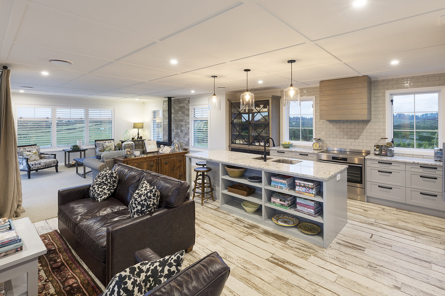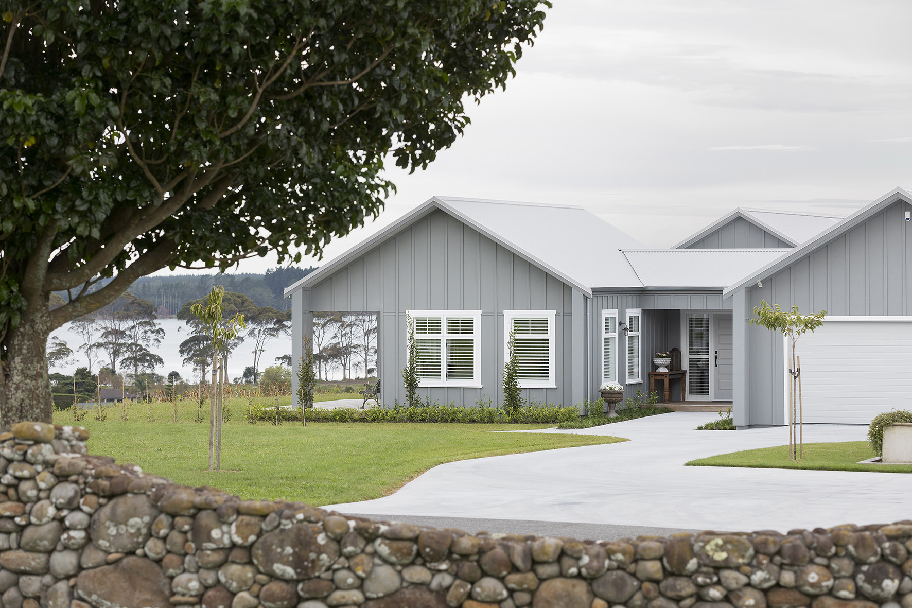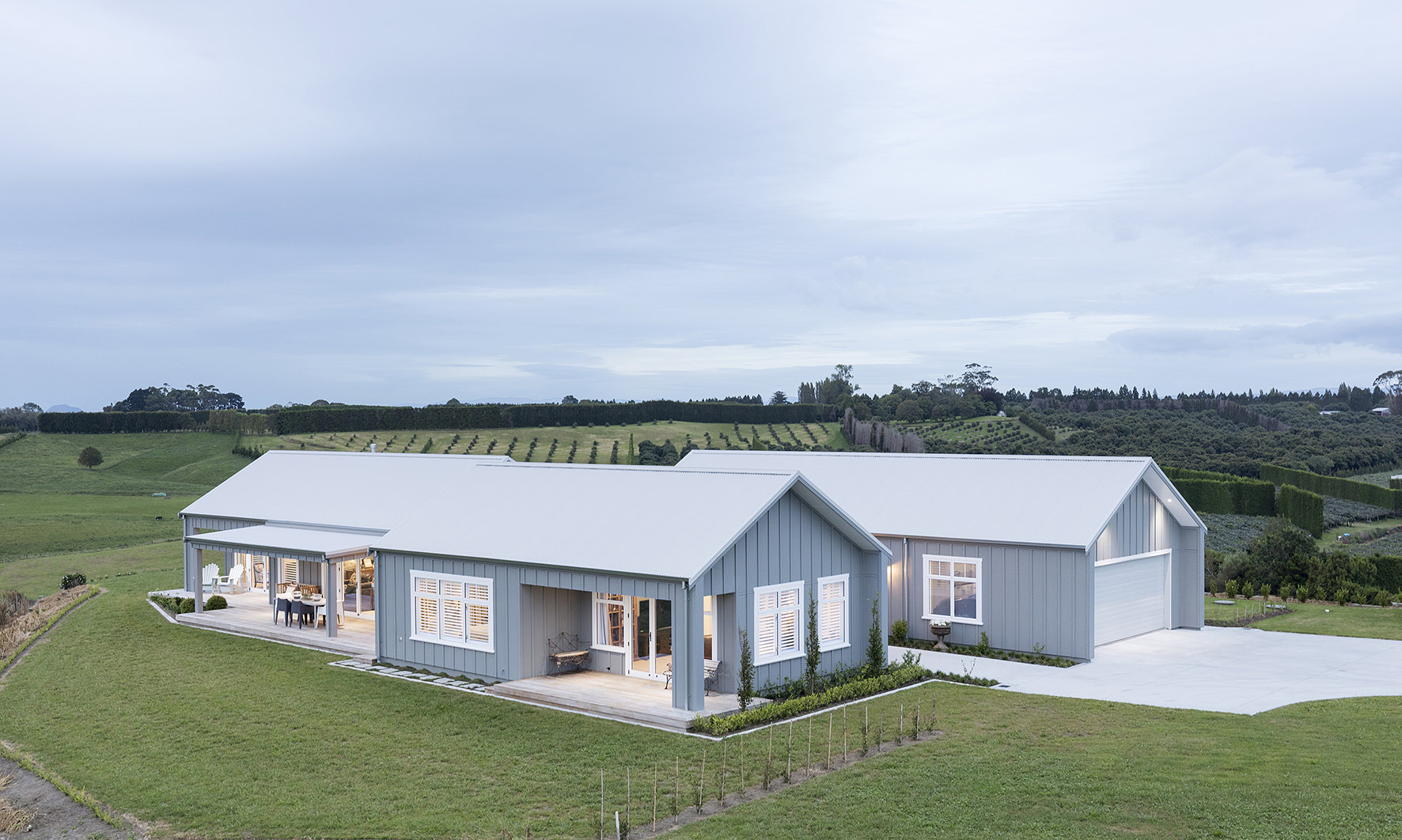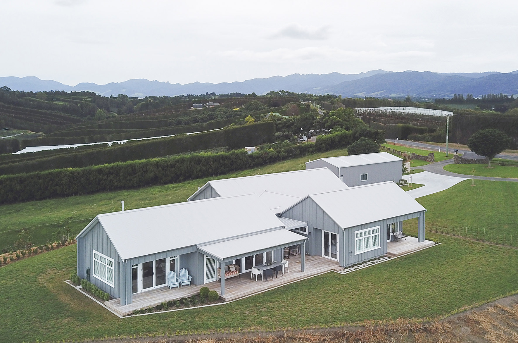 Built for an interior designer, this spacious Katikati home was destined to break rules. Transcending eras and continents, the end product fuses elements from the past with today’s craftsmanship. Inspired by a classic Kiwi schoolhouse and a favourite vineyard, the house comprises three living pods, each with a gable roof. Inside, four bedrooms, two bathrooms and two living areas serve modern life. Band-sawn board-and-batten is painted rather than stained. Practicality called for aluminium joinery, boxed with rough-sawn frames and sills; nail holes deliberately indented to add character. Galvanised spouting continues the traditional theme. The interior showcases the owners’ love of travel and innate sense of colour, texture and styling. Notable features include flat batten ceilings in the family pod, Italian tiled flooring that mimics distressed timber planking, hand-washed French linen drapes, heritage tapware in the powder room, and Soho tiling that replicates old New York brickwork around the gas fire. An innovative approach, executed with aplomb.
