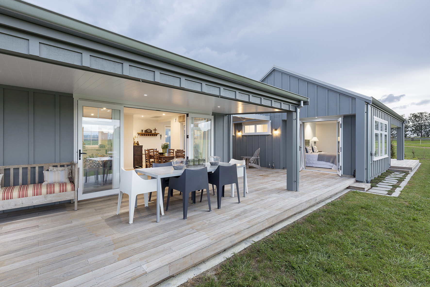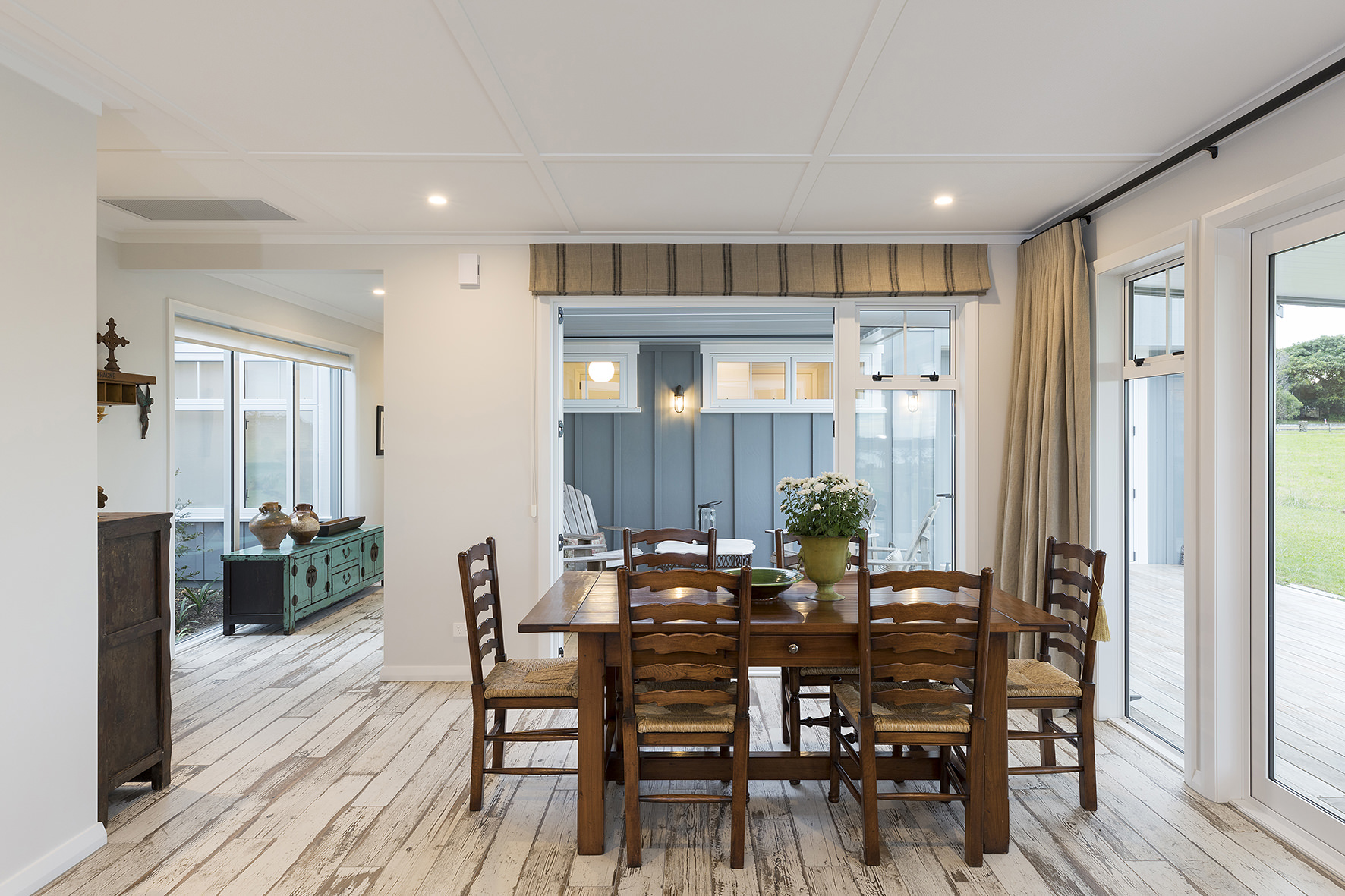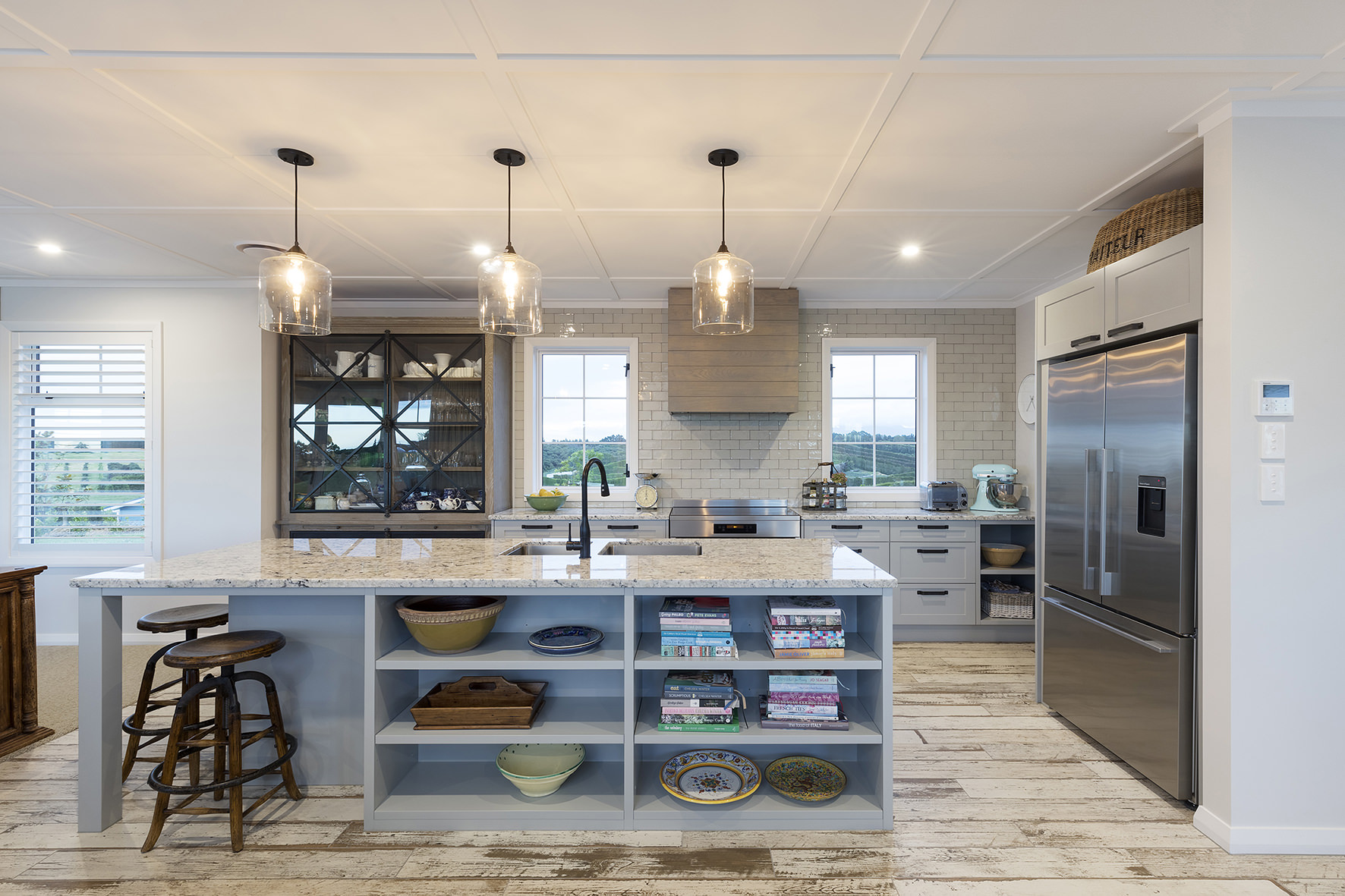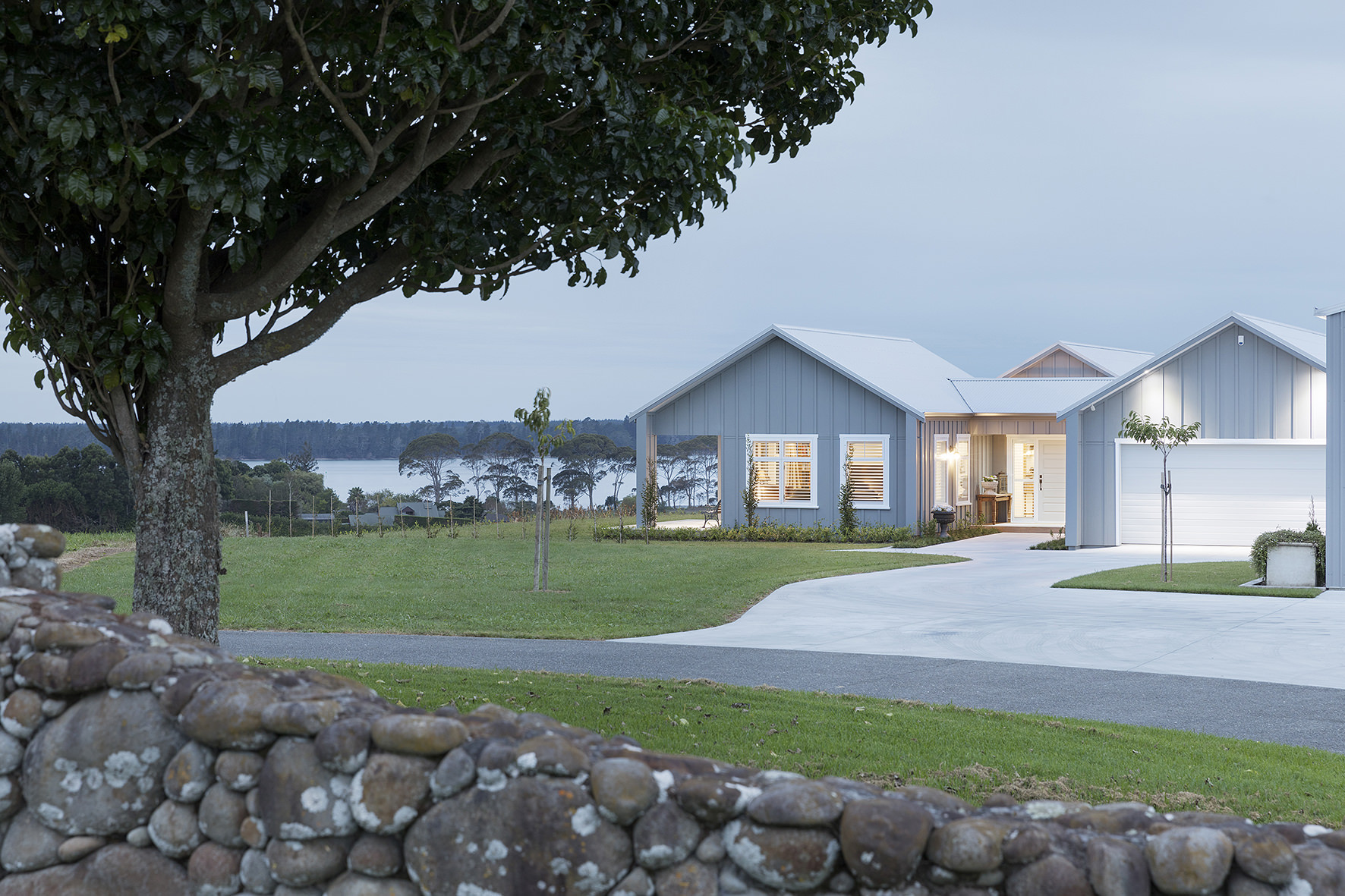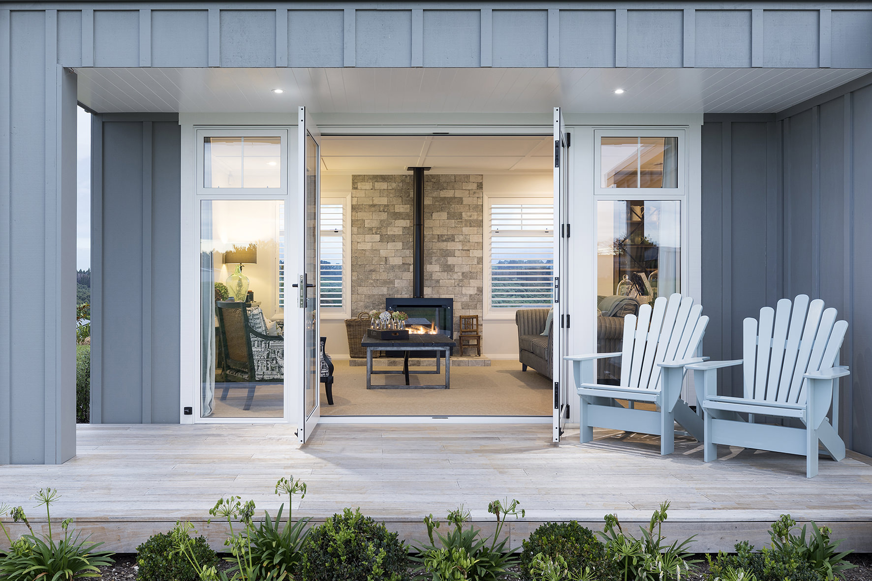 Built for an interior designer, this spacious Katikati home was destined to break rules. Transcending eras and continents, the end product fuses elements from the past with today’s craftsmanship. Inspired by a classic Kiwi schoolhouse and a favourite vineyard, the house comprises three living pods, each with a gable roof. Inside, four bedrooms, two bathrooms and two living areas serve modern life. Band-sawn board-and-batten is painted rather than stained. Practicality called for aluminium joinery, boxed with rough-sawn frames and sills; nail holes deliberately indented to add character. Galvanised spouting continues the traditional theme. The interior showcases the owners’ love of travel and innate sense of colour, texture and styling. Notable features include flat batten ceilings in the family pod, Italian tiled flooring that mimics distressed timber planking, hand-washed French linen drapes, heritage tapware in the powder room, and Soho tiling that replicates old New York brickwork around the gas fire. An innovative approach, executed with aplomb.