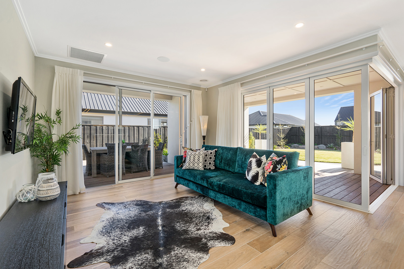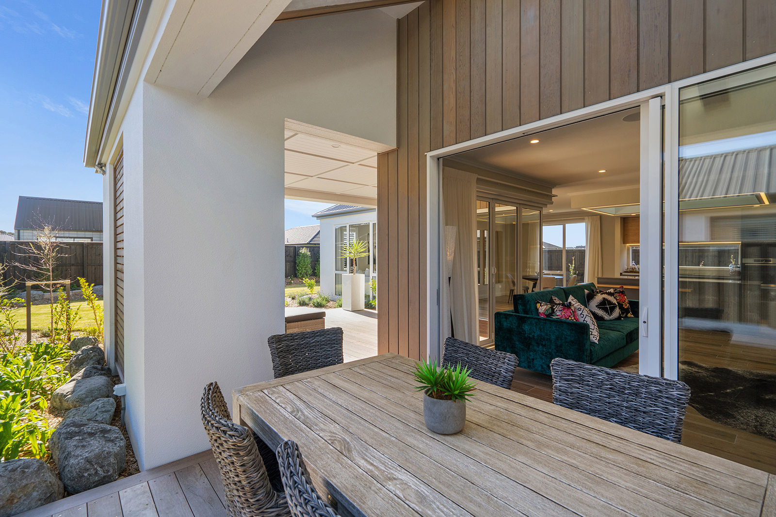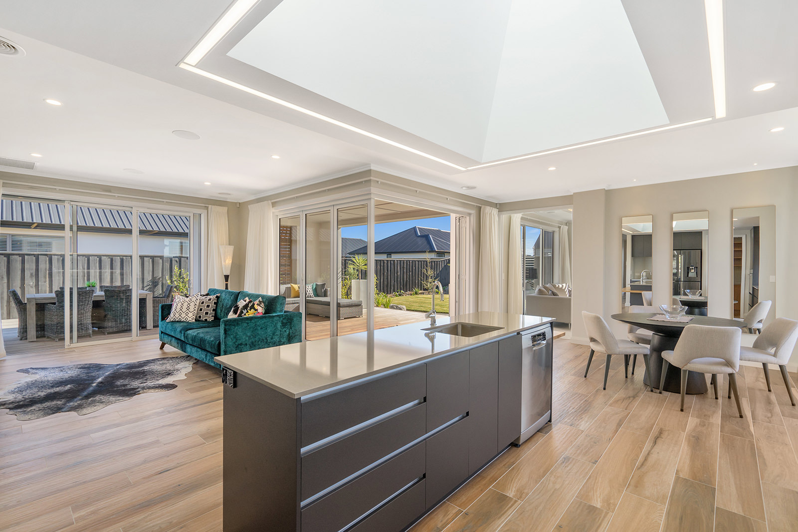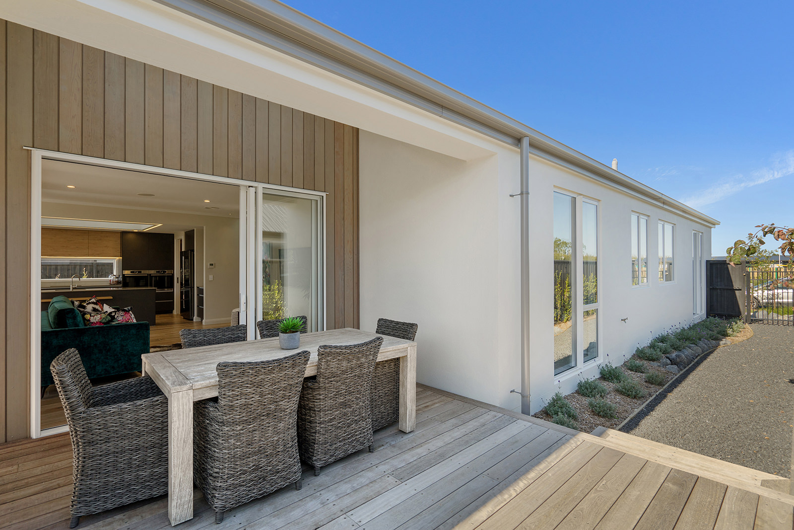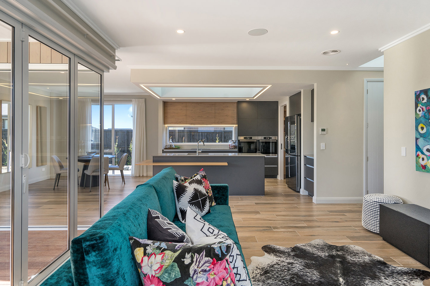 L is for living in this four-bedroom show home with large alfresco area just south of Christchurch. The hub is centred around the gourmet kitchen which connects the family room to dining and out to a sheltered space through two bifold doors, which open to an entire corner. Three solar skylights take pride of place in the kitchen and the shaft is framed around with LED recess track lights. The walk-in pantry is large enough to cater for all comers, so there’s no need to rush out when unexpected guests pop by. A computer alcove is located close to the kitchen so you can help kids doing homework. The lounge has a large in-built wall cabinet that slides open to a reveal a collection of precious objects. Three bedrooms are located in a separate wing of the home, with the fourth bedroom or study conveniently off the passage way. This is a functional home, which balances family living and technology with clever ways to make the most of the sun and environment.