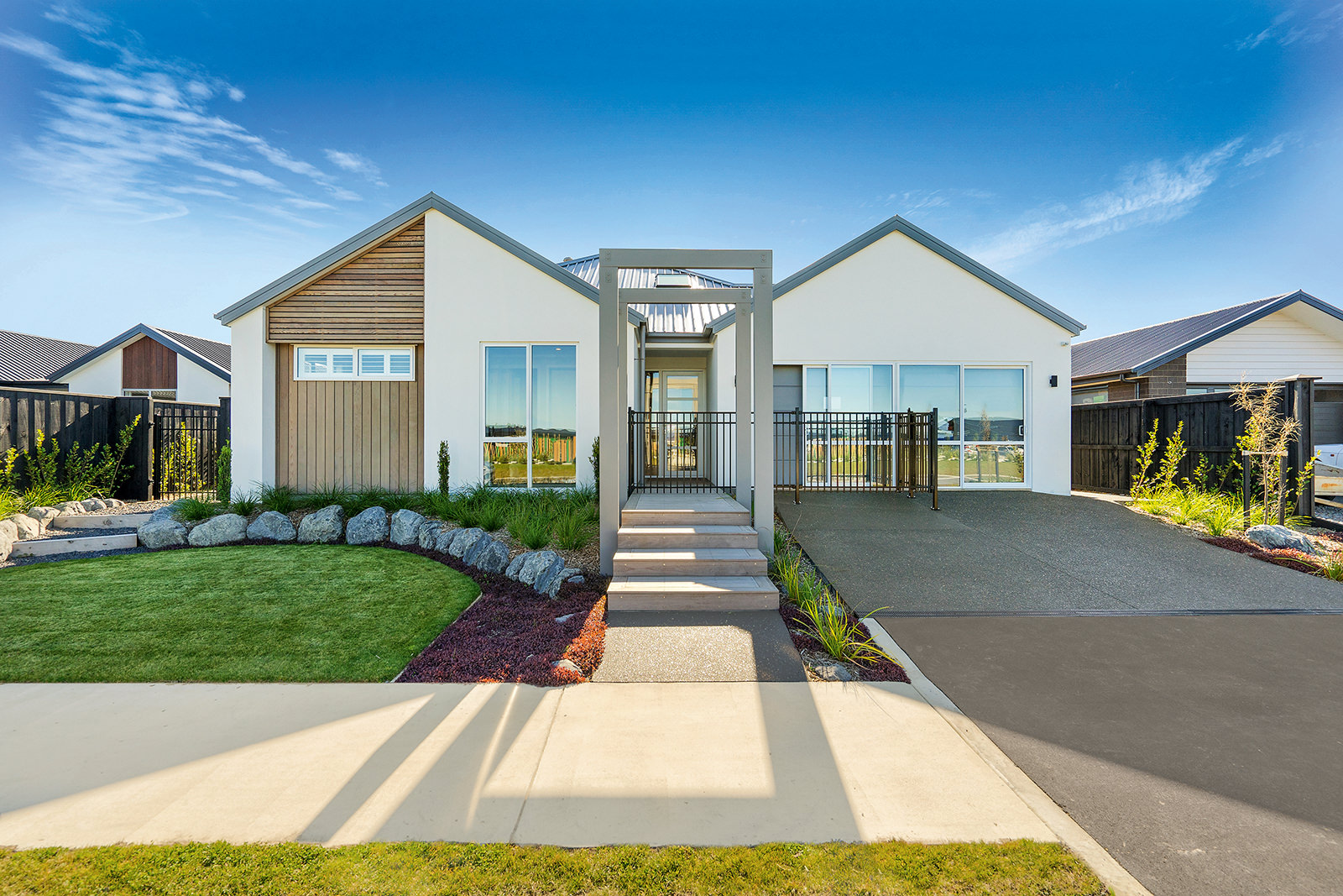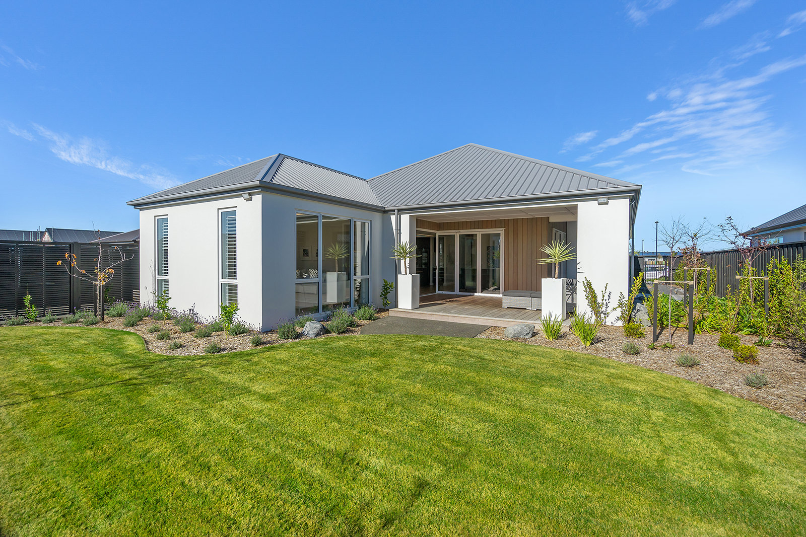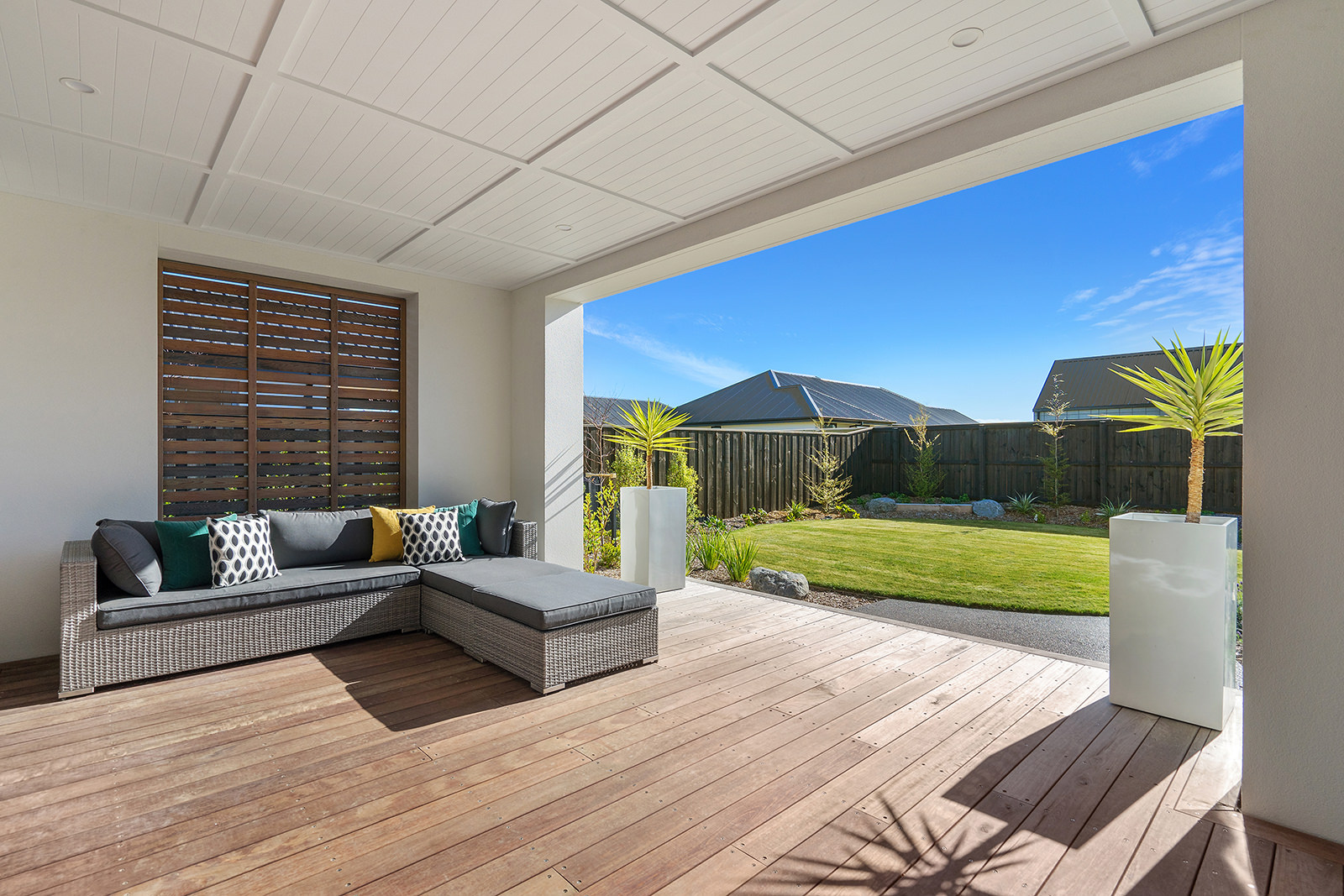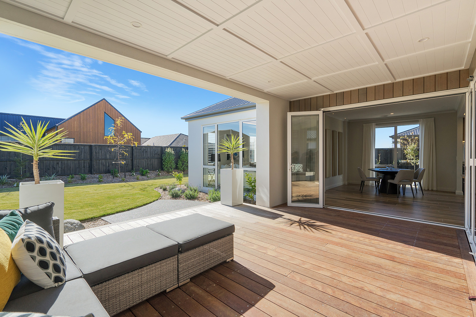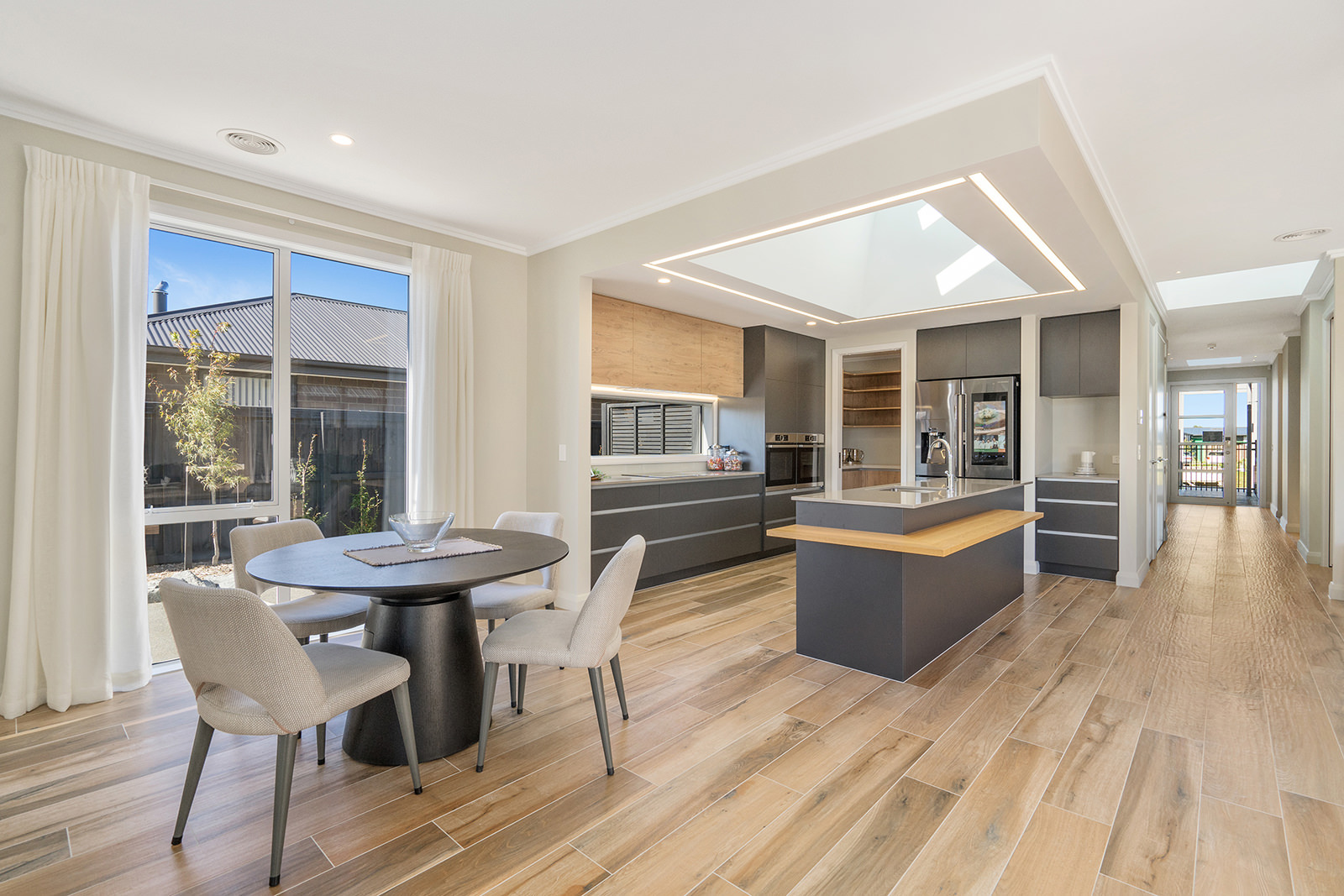 L is for living in this four-bedroom show home with large alfresco area just south of Christchurch. The hub is centred around the gourmet kitchen which connects the family room to dining and out to a sheltered space through two bifold doors, which open to an entire corner. Three solar skylights take pride of place in the kitchen and the shaft is framed around with LED recess track lights. The walk-in pantry is large enough to cater for all comers, so there’s no need to rush out when unexpected guests pop by. A computer alcove is located close to the kitchen so you can help kids doing homework. The lounge has a large in-built wall cabinet that slides open to a reveal a collection of precious objects. Three bedrooms are located in a separate wing of the home, with the fourth bedroom or study conveniently off the passage way. This is a functional home, which balances family living and technology with clever ways to make the most of the sun and environment.