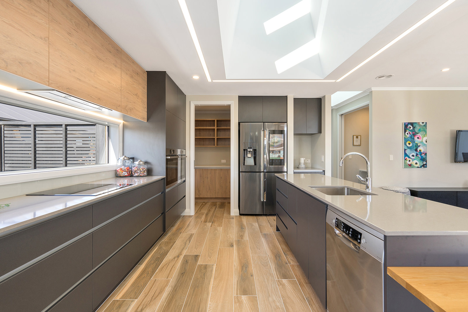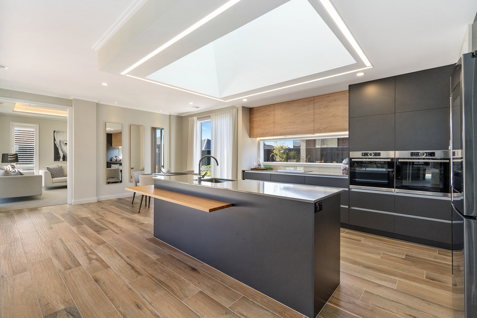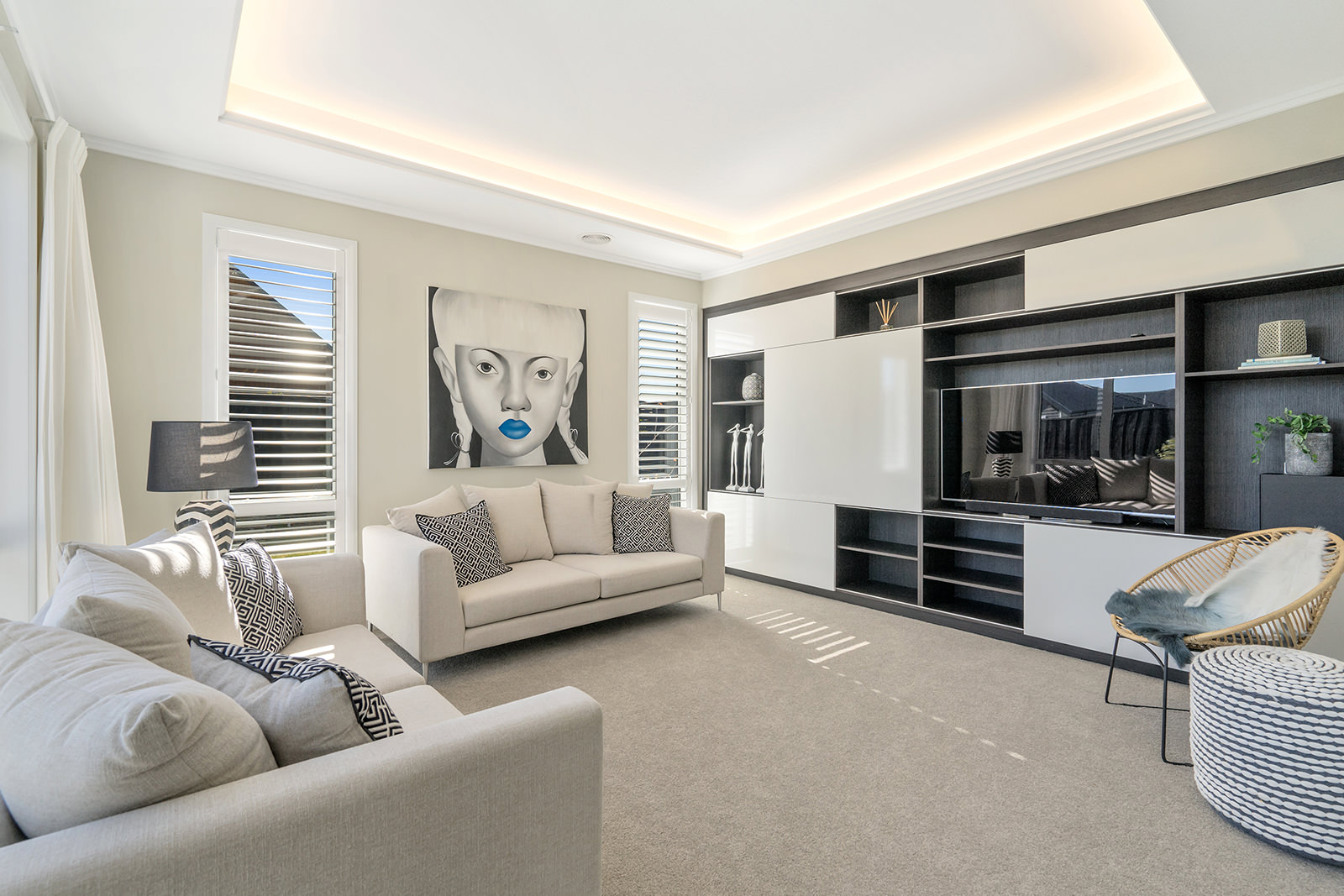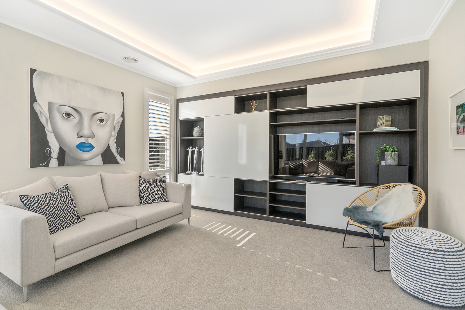 L is for living in this four-bedroom show home with large alfresco area just south of Christchurch. The hub is centred around the gourmet kitchen which connects the family room to dining and out to a sheltered space through two bifold doors, which open to an entire corner. Three solar skylights take pride of place in the kitchen and the shaft is framed around with LED recess track lights. The walk-in pantry is large enough to cater for all comers, so there’s no need to rush out when unexpected guests pop by. A computer alcove is located close to the kitchen so you can help kids doing homework. The lounge has a large in-built wall cabinet that slides open to a reveal a collection of precious objects. Three bedrooms are located in a separate wing of the home, with the fourth bedroom or study conveniently off the passage way. This is a functional home, which balances family living and technology with clever ways to make the most of the sun and environment.