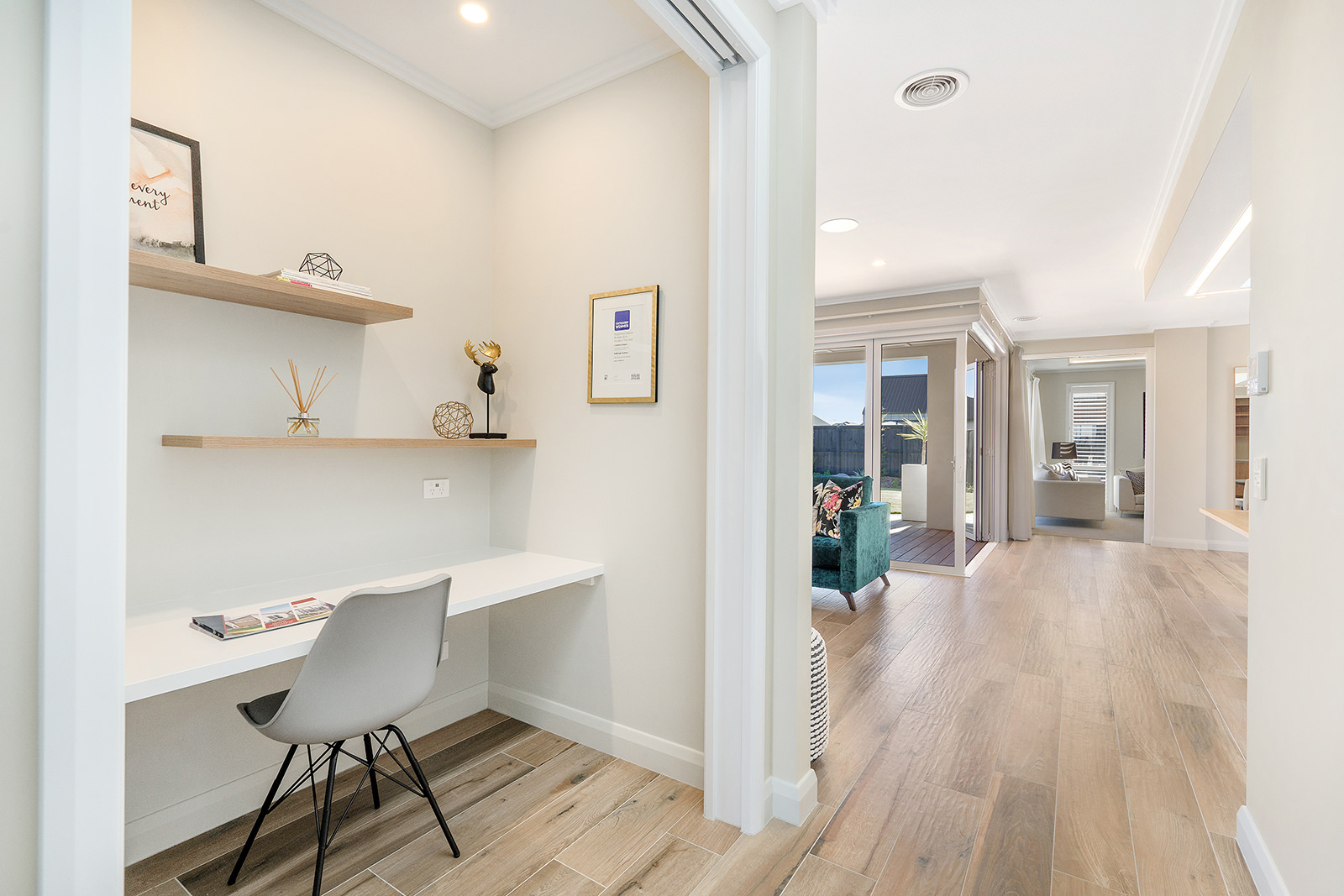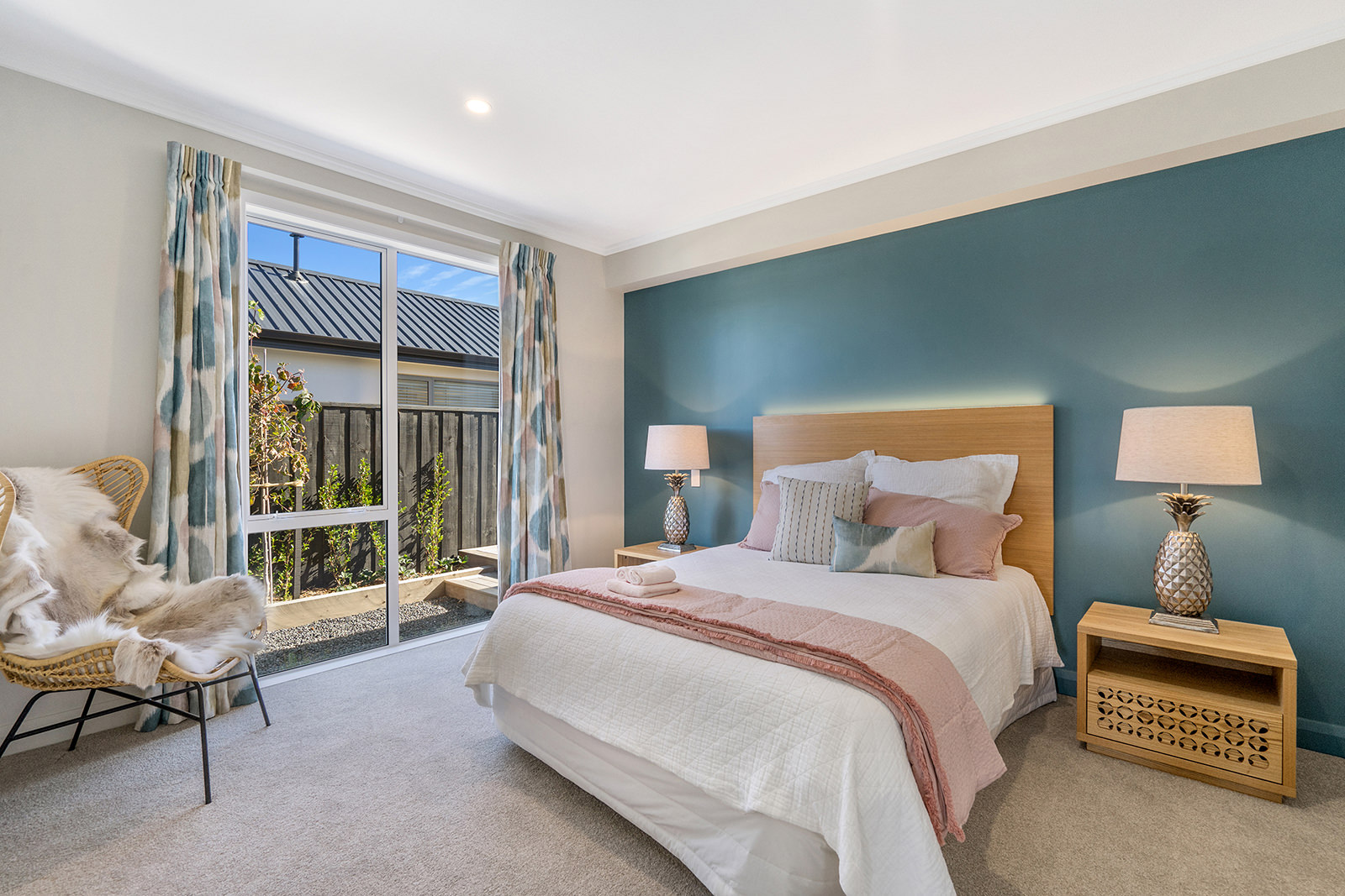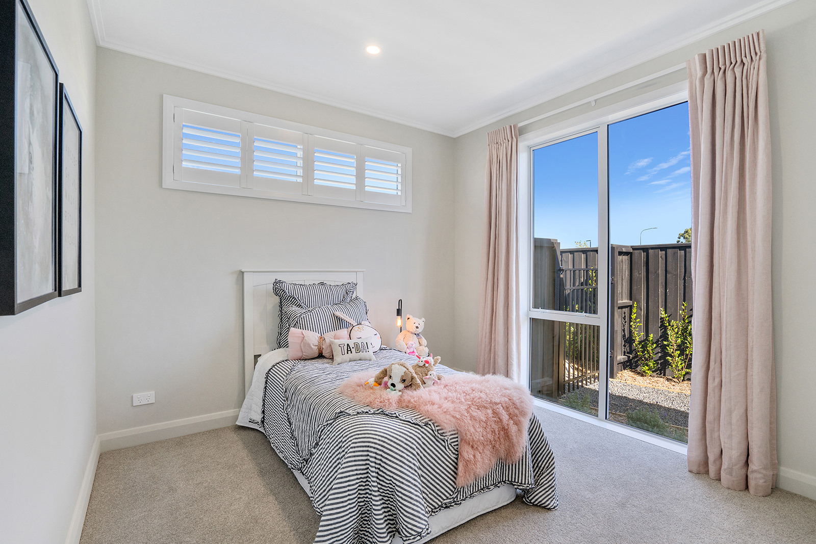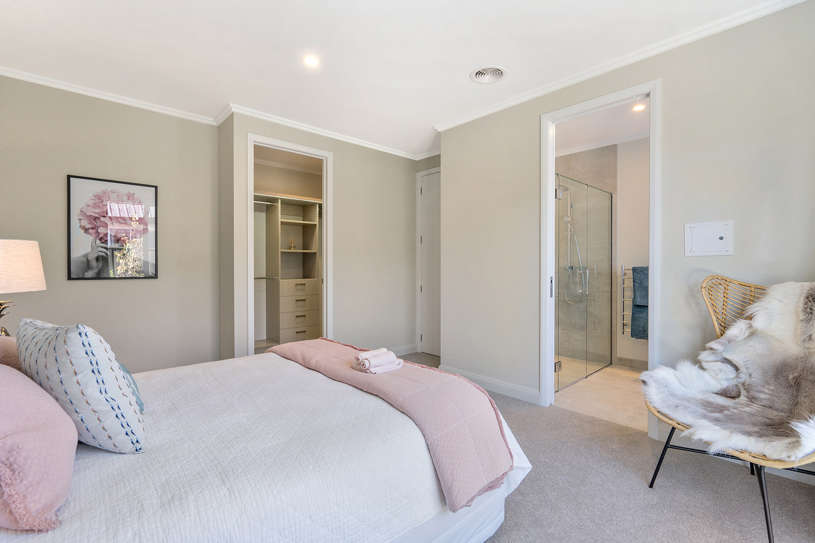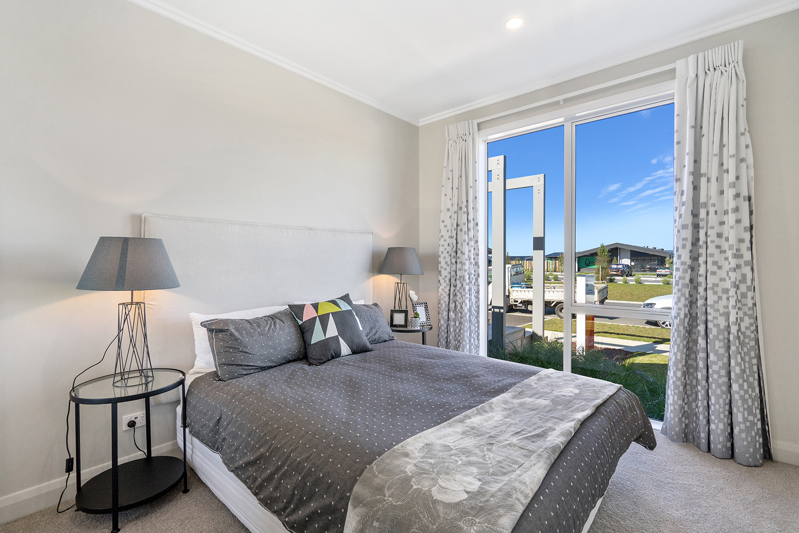 L is for living in this four-bedroom show home with large alfresco area just south of Christchurch. The hub is centred around the gourmet kitchen which connects the family room to dining and out to a sheltered space through two bifold doors, which open to an entire corner. Three solar skylights take pride of place in the kitchen and the shaft is framed around with LED recess track lights. The walk-in pantry is large enough to cater for all comers, so there’s no need to rush out when unexpected guests pop by. A computer alcove is located close to the kitchen so you can help kids doing homework. The lounge has a large in-built wall cabinet that slides open to a reveal a collection of precious objects. Three bedrooms are located in a separate wing of the home, with the fourth bedroom or study conveniently off the passage way. This is a functional home, which balances family living and technology with clever ways to make the most of the sun and environment.