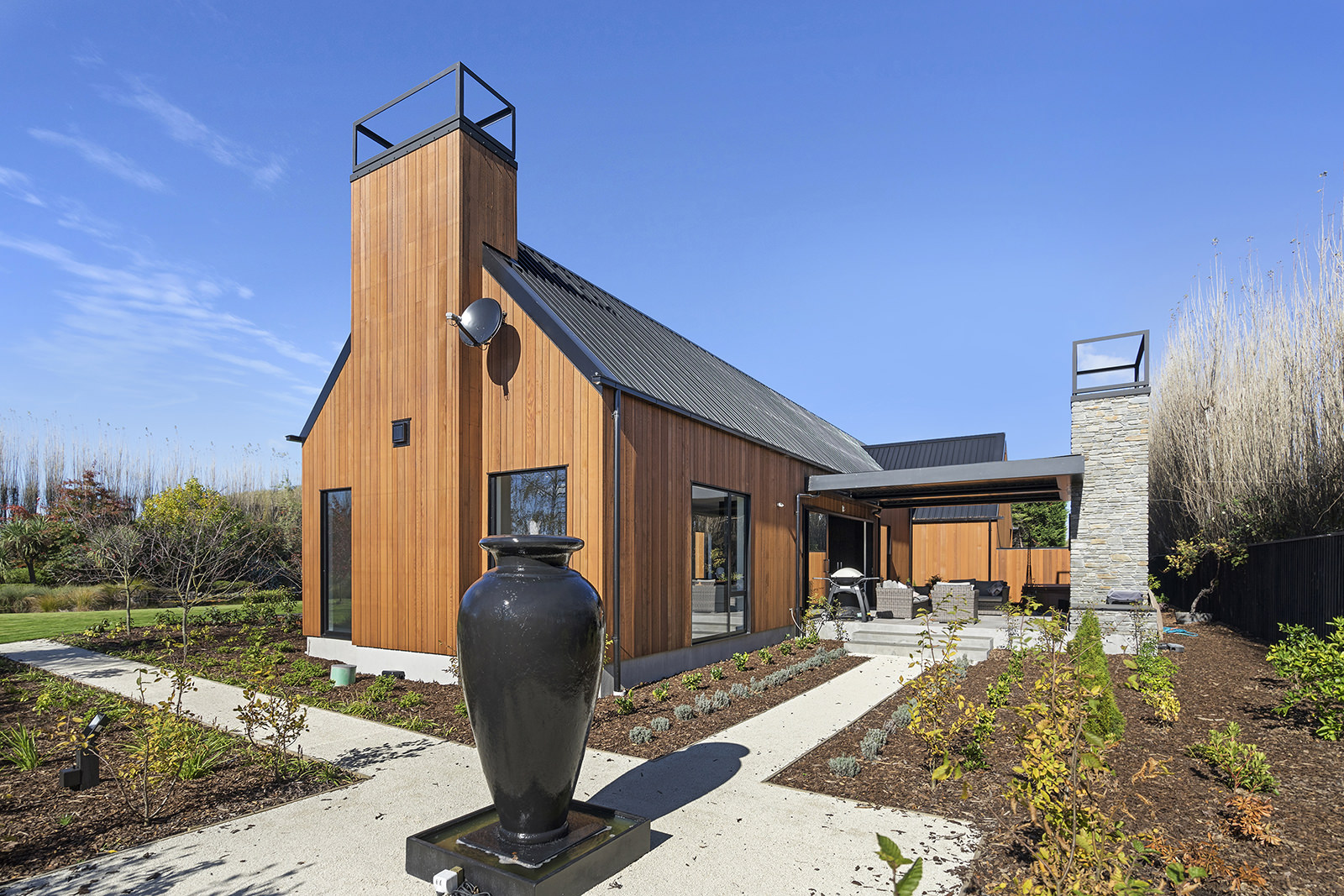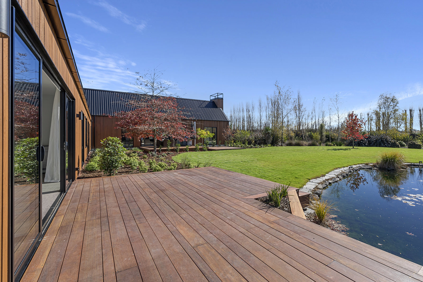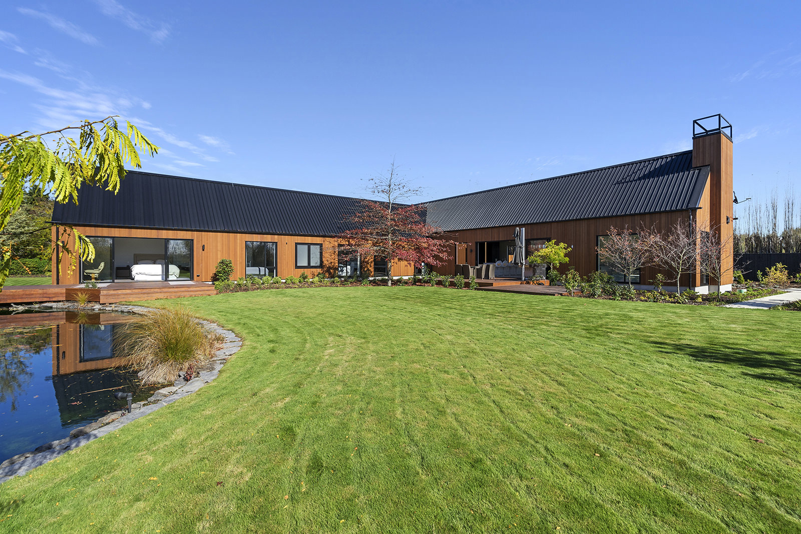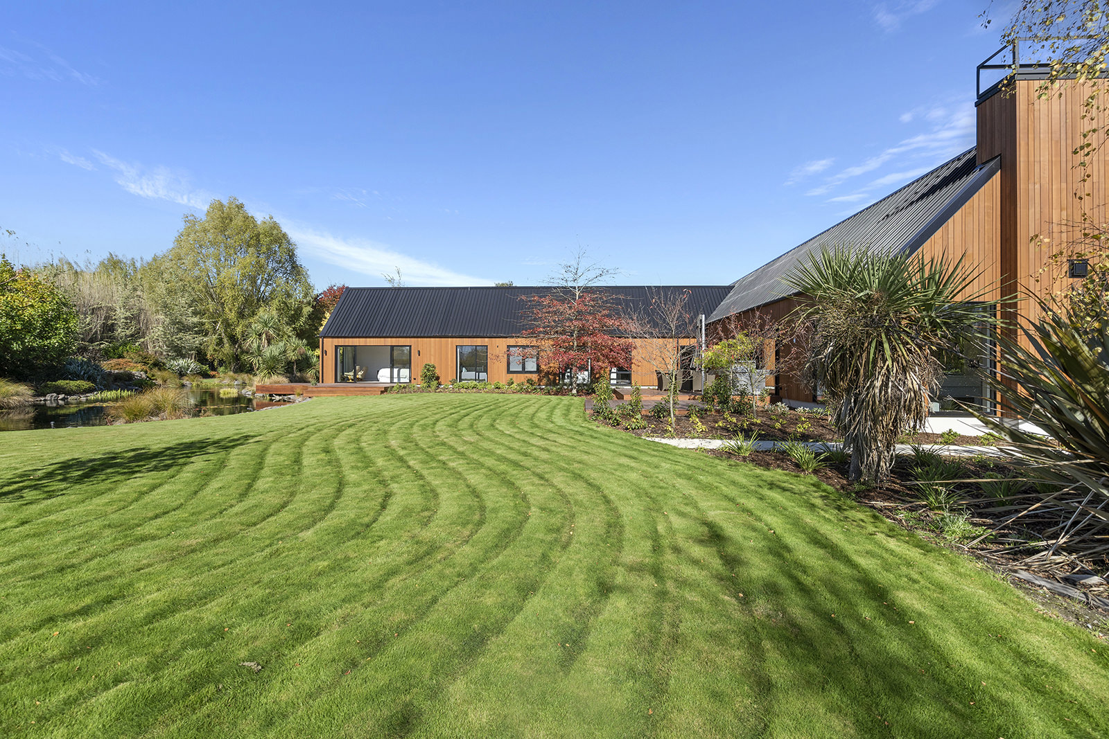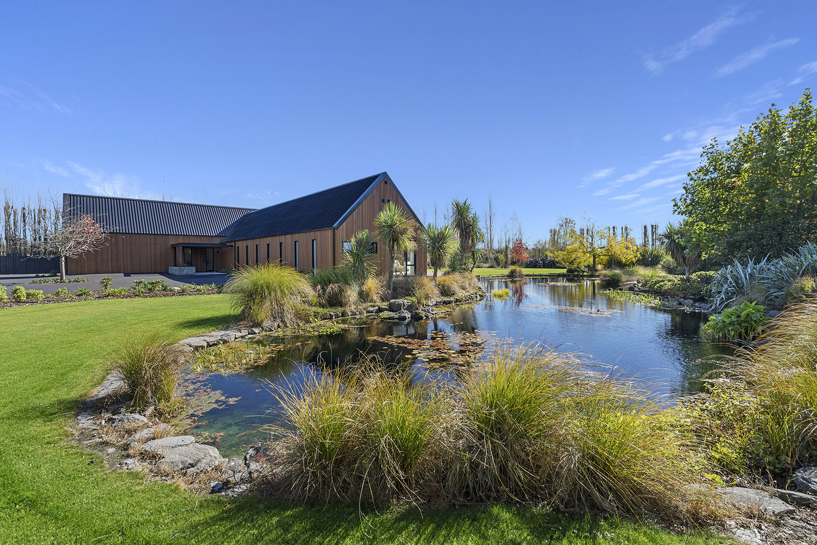 First impressions count as you drive up past the pond to reach this one-level double pavilion-style home. An expansive 373sqm, with loft space for storage above the garage, the Christchurch house’s vertical cedar shiplap weatherboard exterior is imposing. Pass through the grand entrance, which includes a pergola, garden feature and substantial wooden front door, to two living areas (one a full media room), then to a monotone kitchen with walk-through scullery and dining area for an enviably configured family living space. Through a vast slider there is an impressive all-weather outdoor dining area and fireplace. Three light and airy bedrooms are sanctuaries for family members wanting quiet time. The master bedroom is a self-contained retreat, complete with a walk-in robe, ensuite, tea and coffee station and private outdoor deck. The dark wood and crisp white colour features throughout the house create a cohesive and harmonious feel.