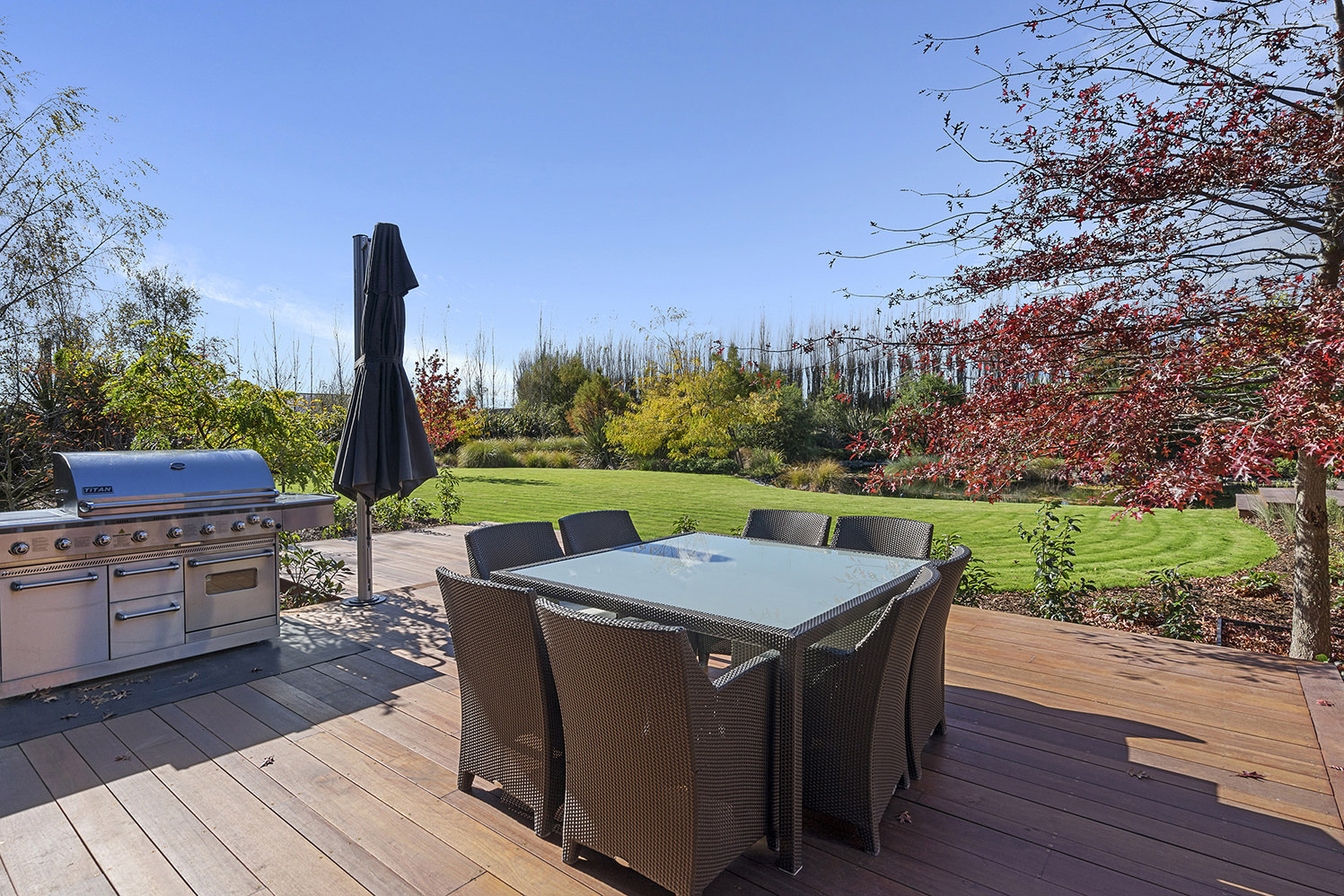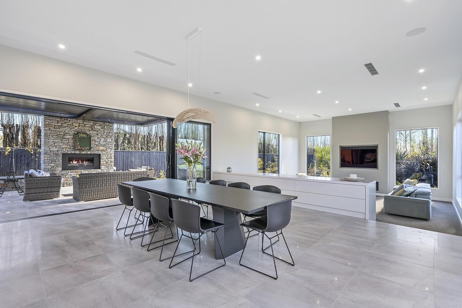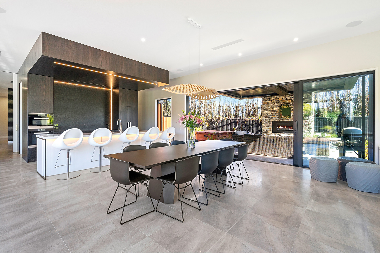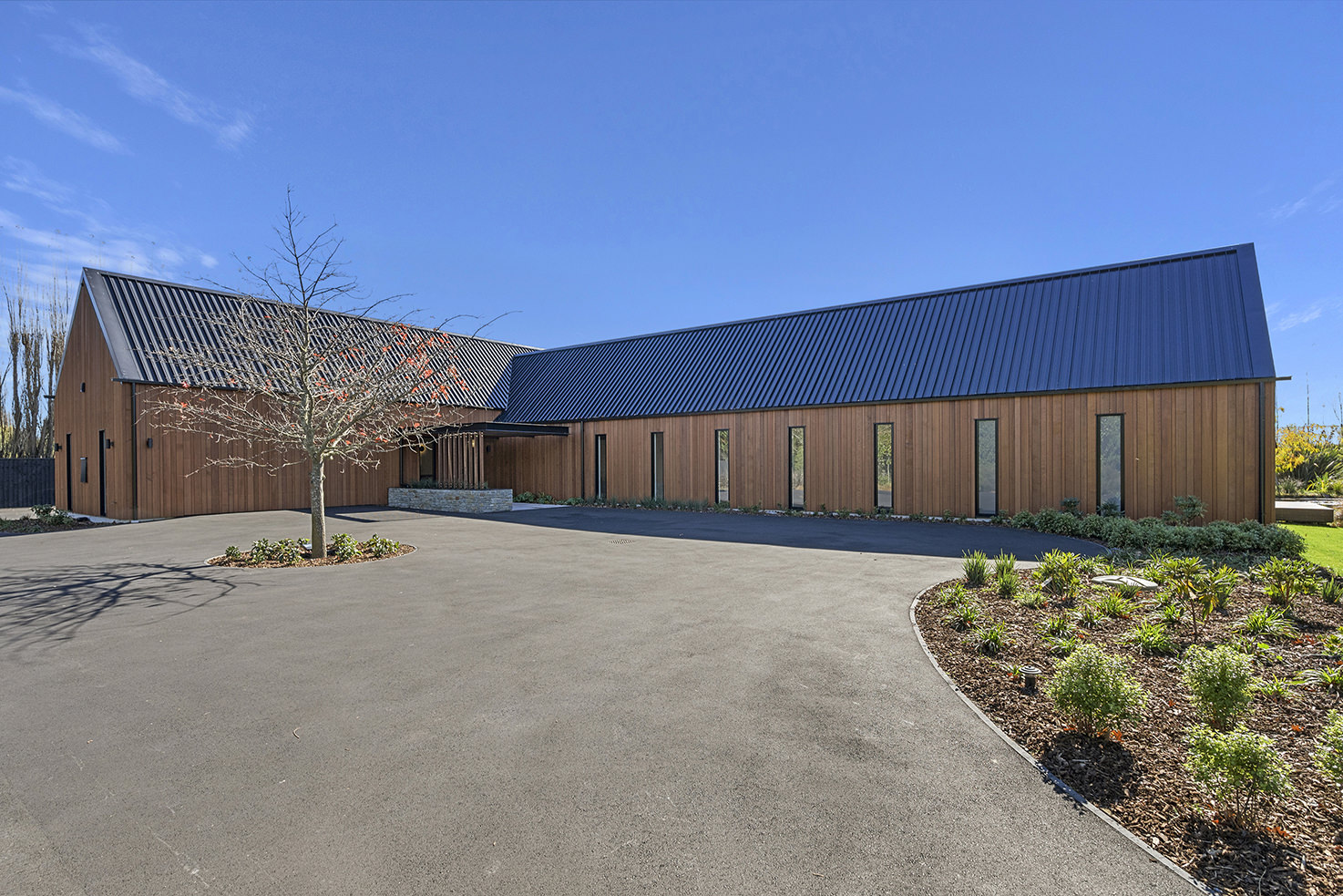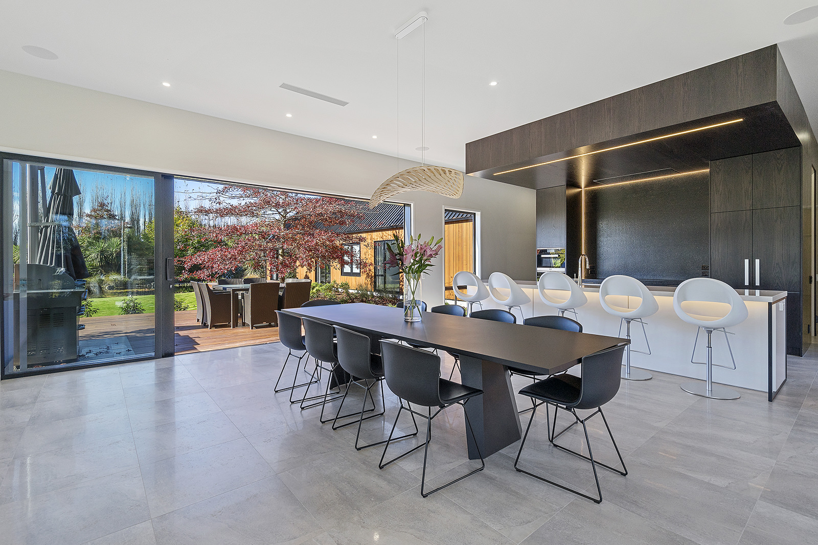 First impressions count as you drive up past the pond to reach this one-level double pavilion-style home. An expansive 373sqm, with loft space for storage above the garage, the Christchurch house’s vertical cedar shiplap weatherboard exterior is imposing. Pass through the grand entrance, which includes a pergola, garden feature and substantial wooden front door, to two living areas (one a full media room), then to a monotone kitchen with walk-through scullery and dining area for an enviably configured family living space. Through a vast slider there is an impressive all-weather outdoor dining area and fireplace. Three light and airy bedrooms are sanctuaries for family members wanting quiet time. The master bedroom is a self-contained retreat, complete with a walk-in robe, ensuite, tea and coffee station and private outdoor deck. The dark wood and crisp white colour features throughout the house create a cohesive and harmonious feel.