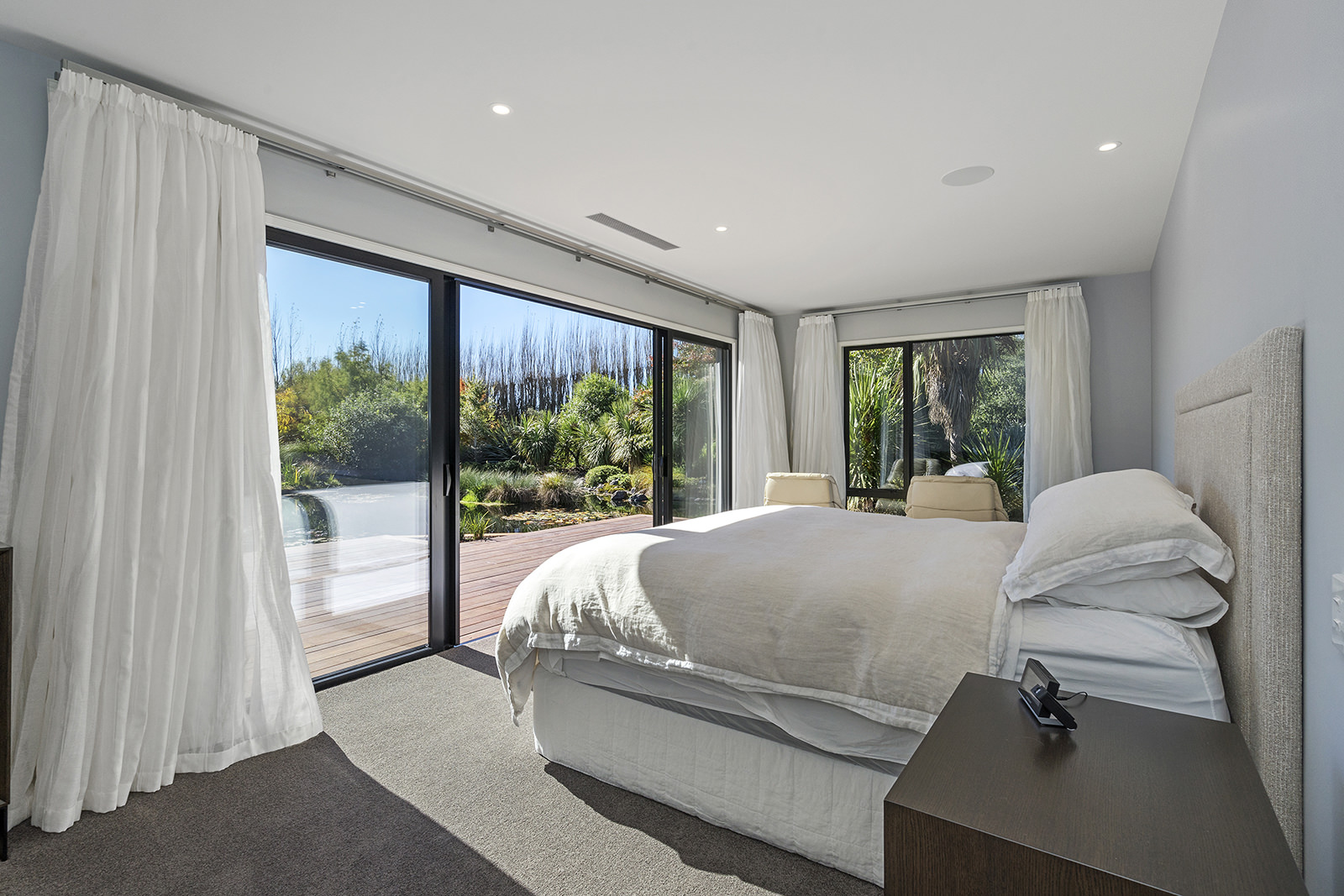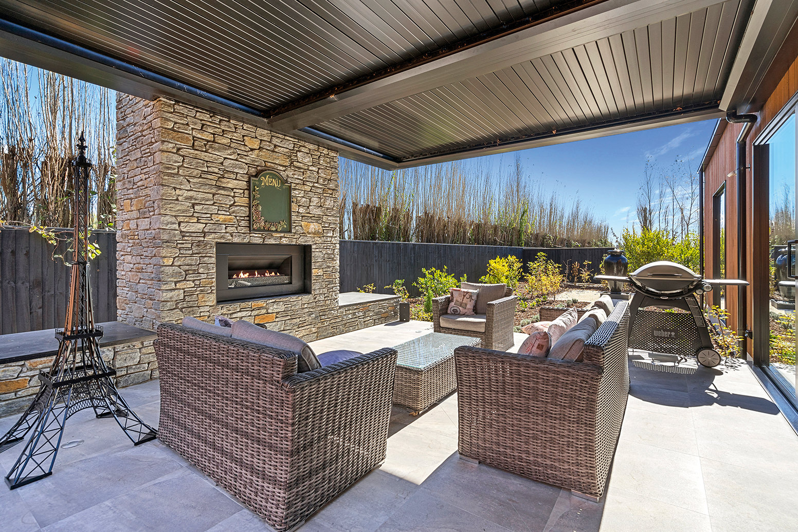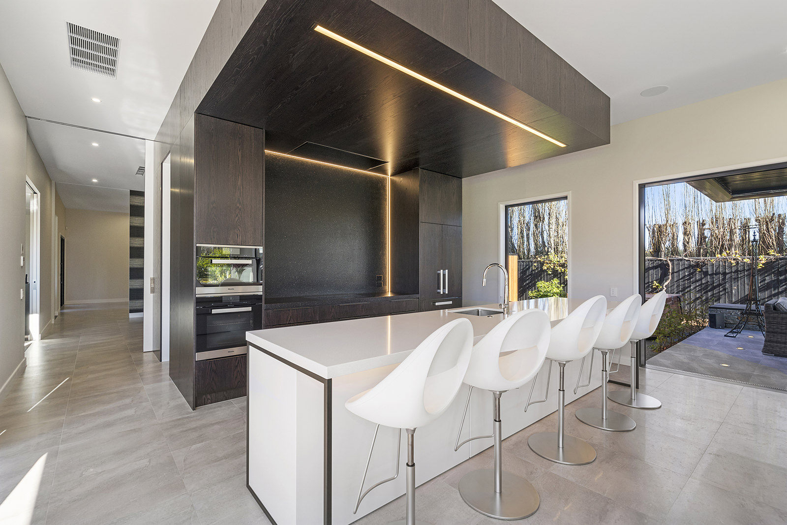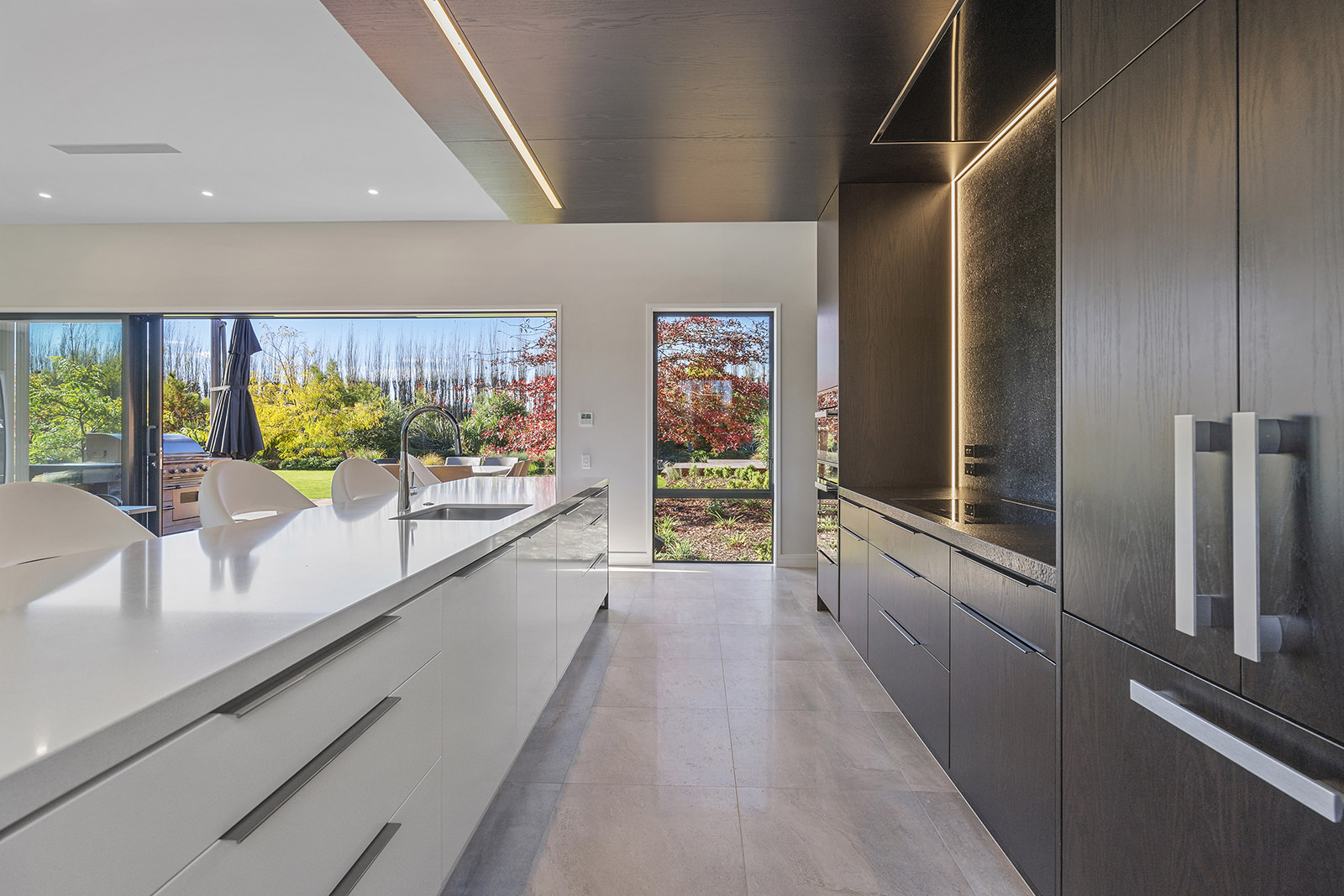 First impressions count as you drive up past the pond to reach this one-level double pavilion-style home. An expansive 373sqm, with loft space for storage above the garage, the Christchurch house’s vertical cedar shiplap weatherboard exterior is imposing. Pass through the grand entrance, which includes a pergola, garden feature and substantial wooden front door, to two living areas (one a full media room), then to a monotone kitchen with walk-through scullery and dining area for an enviably configured family living space. Through a vast slider there is an impressive all-weather outdoor dining area and fireplace. Three light and airy bedrooms are sanctuaries for family members wanting quiet time. The master bedroom is a self-contained retreat, complete with a walk-in robe, ensuite, tea and coffee station and private outdoor deck. The dark wood and crisp white colour features throughout the house create a cohesive and harmonious feel.
