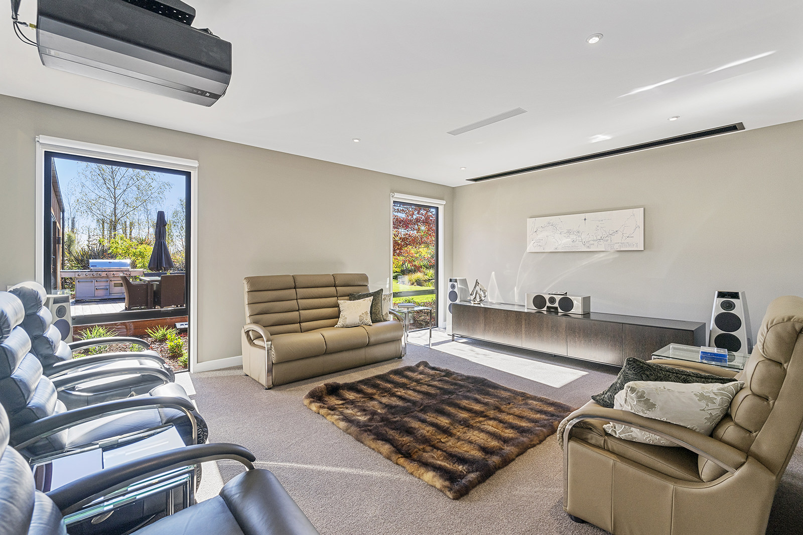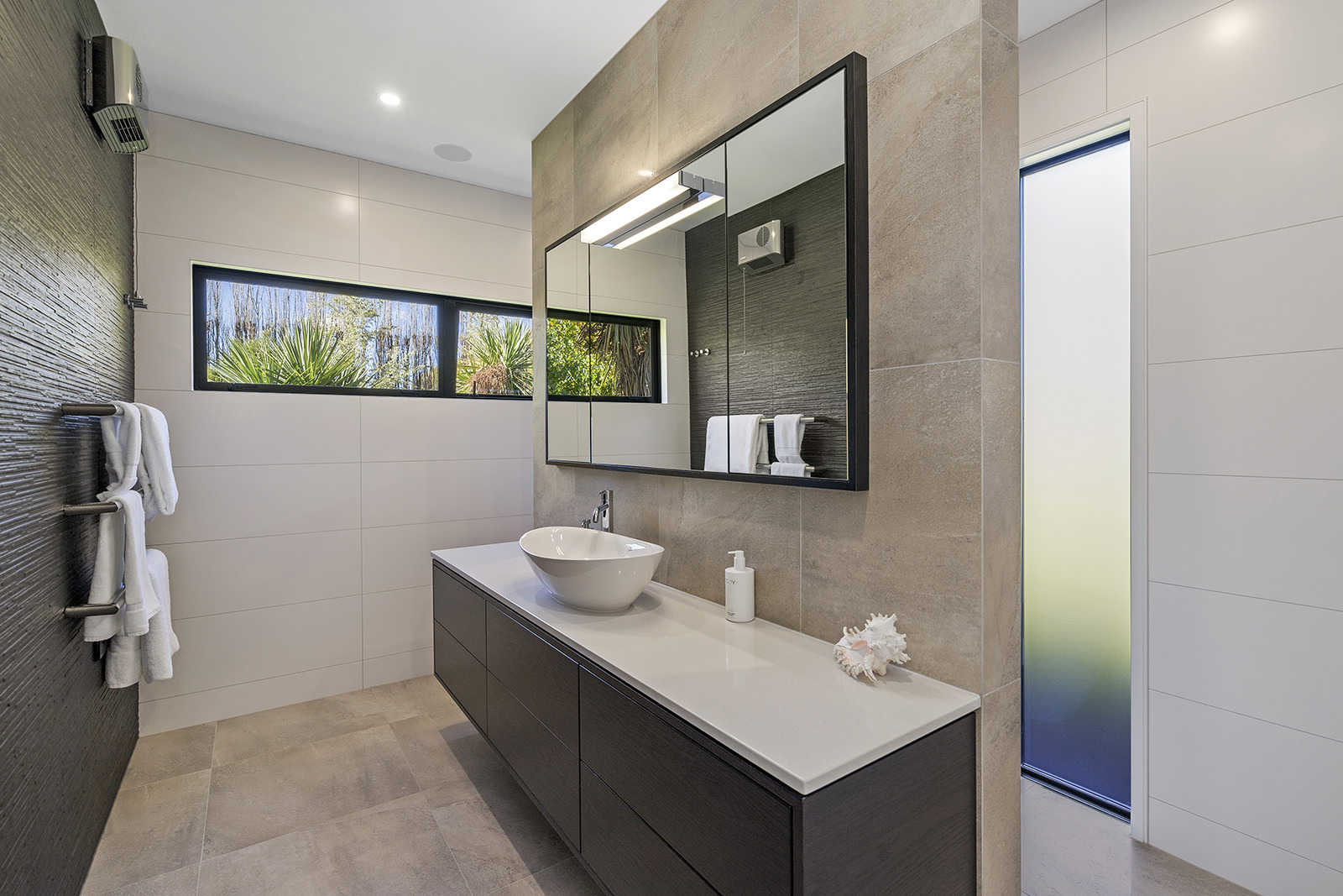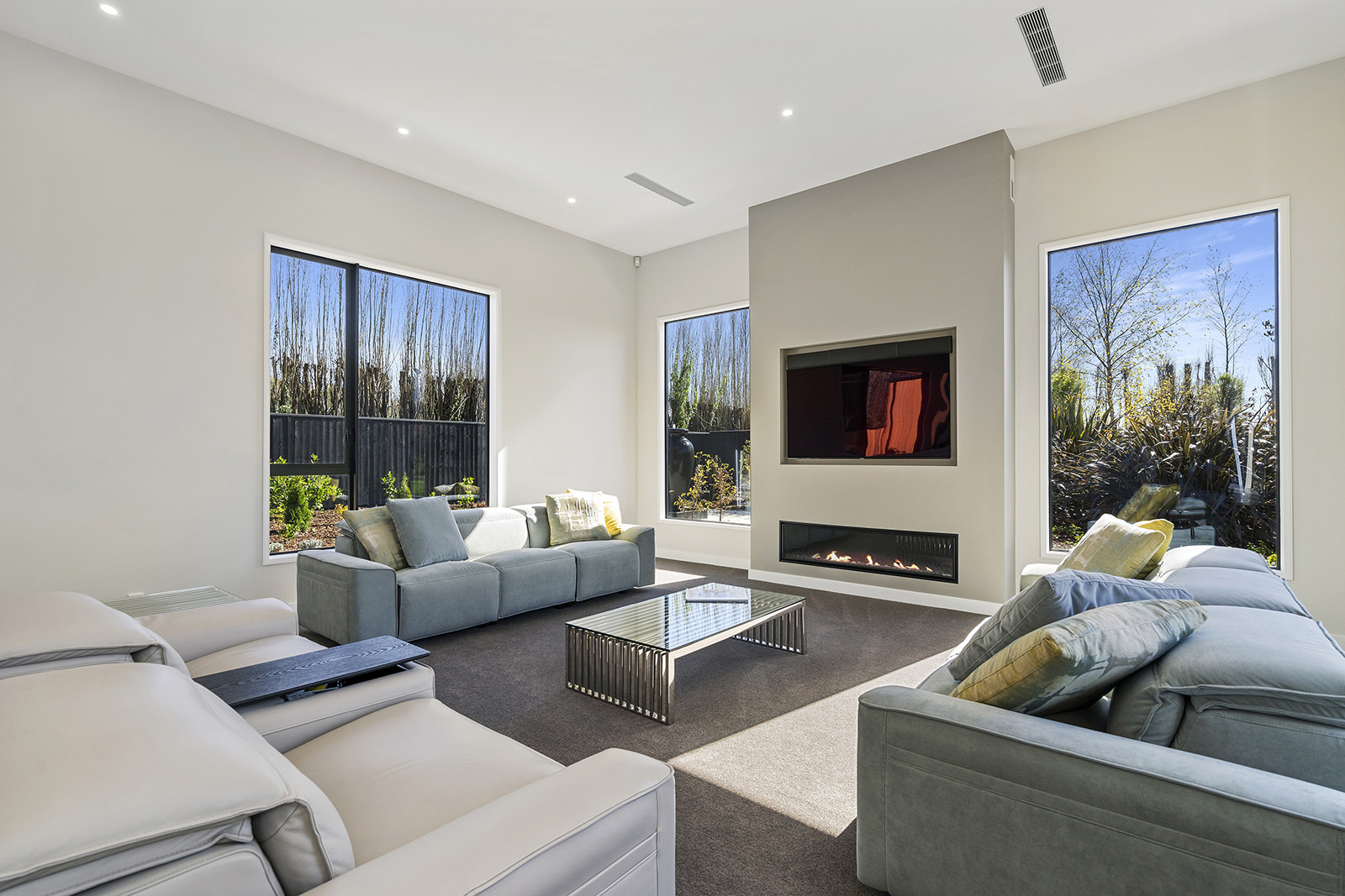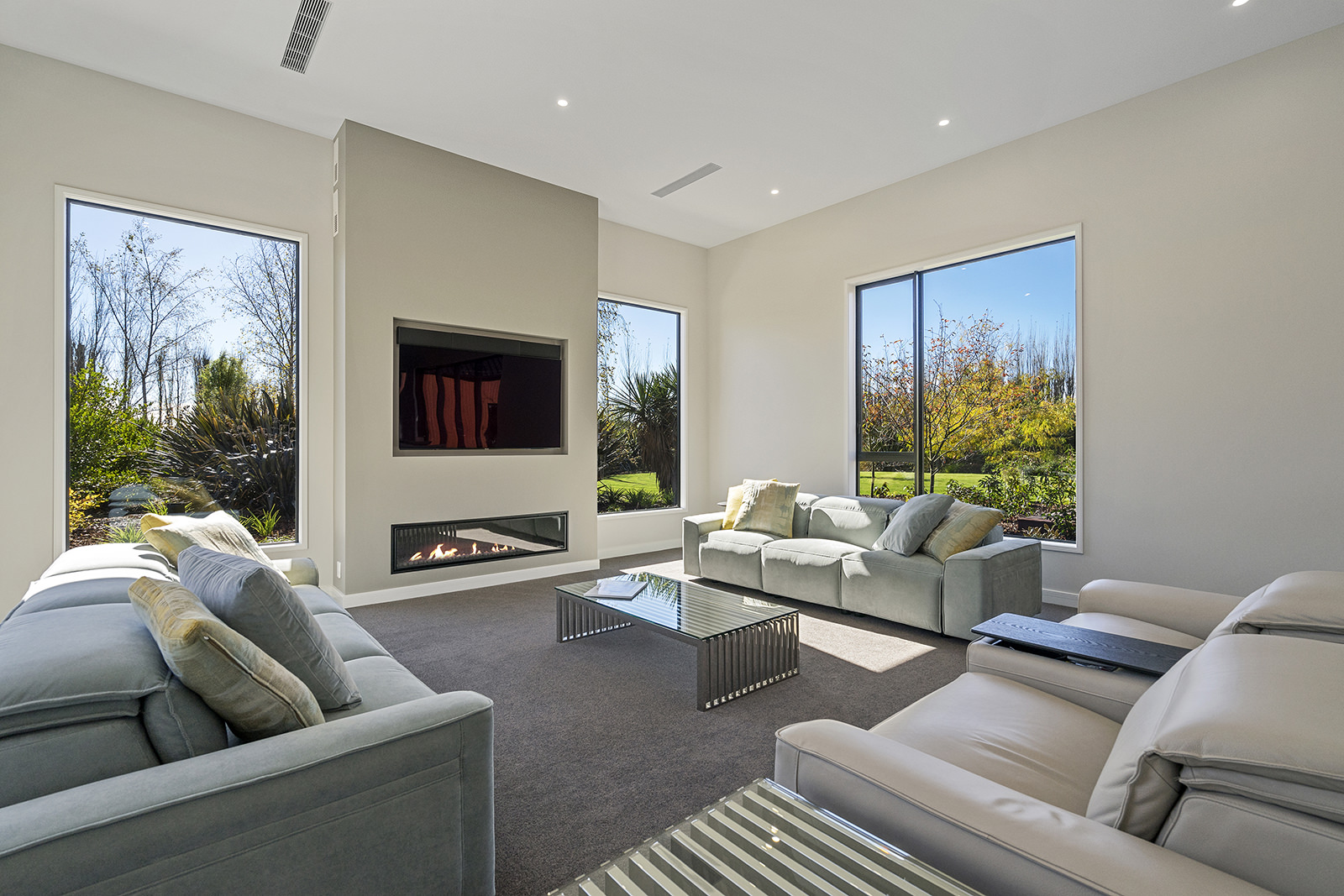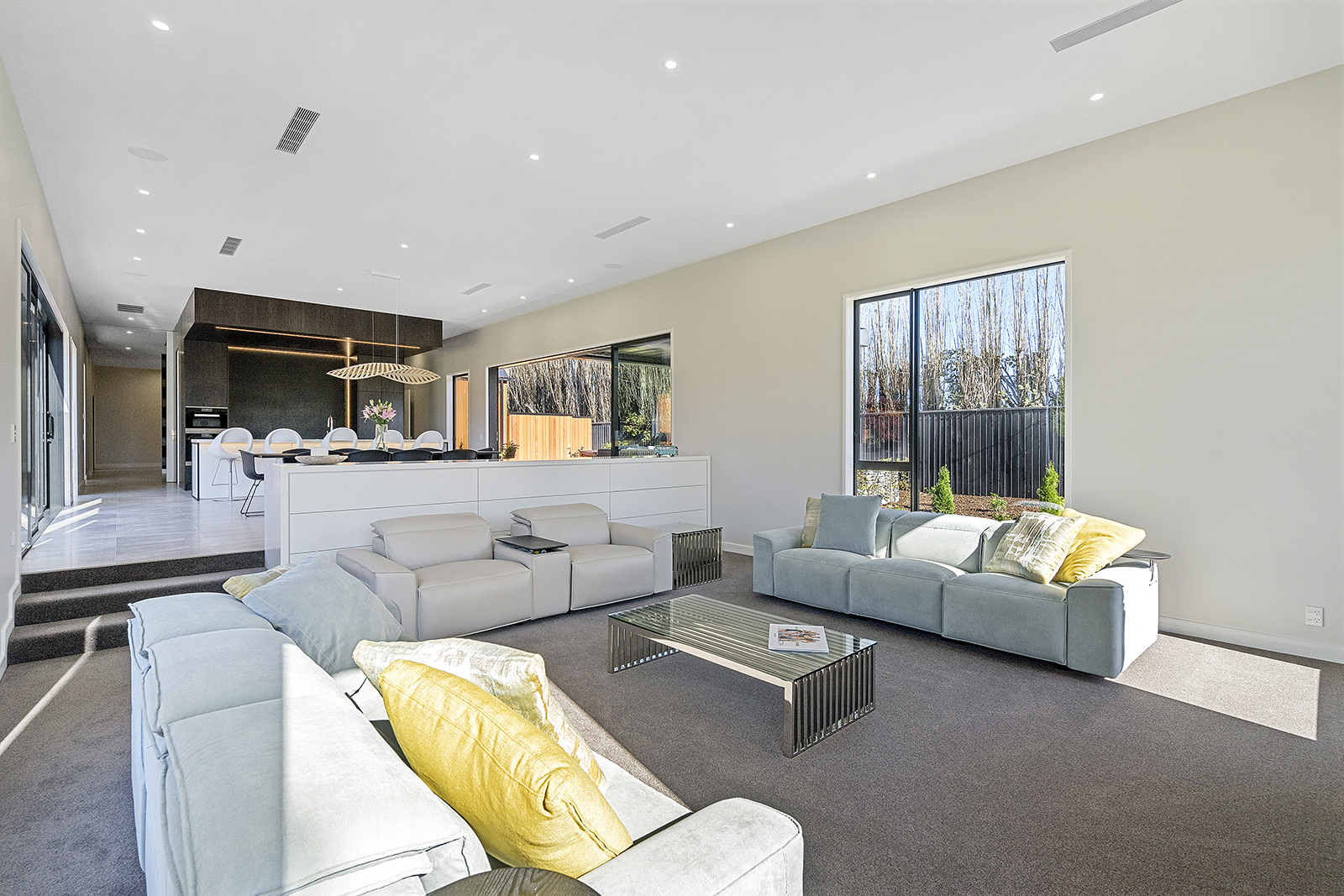 First impressions count as you drive up past the pond to reach this one-level double pavilion-style home. An expansive 373sqm, with loft space for storage above the garage, the Christchurch house’s vertical cedar shiplap weatherboard exterior is imposing. Pass through the grand entrance, which includes a pergola, garden feature and substantial wooden front door, to two living areas (one a full media room), then to a monotone kitchen with walk-through scullery and dining area for an enviably configured family living space. Through a vast slider there is an impressive all-weather outdoor dining area and fireplace. Three light and airy bedrooms are sanctuaries for family members wanting quiet time. The master bedroom is a self-contained retreat, complete with a walk-in robe, ensuite, tea and coffee station and private outdoor deck. The dark wood and crisp white colour features throughout the house create a cohesive and harmonious feel.