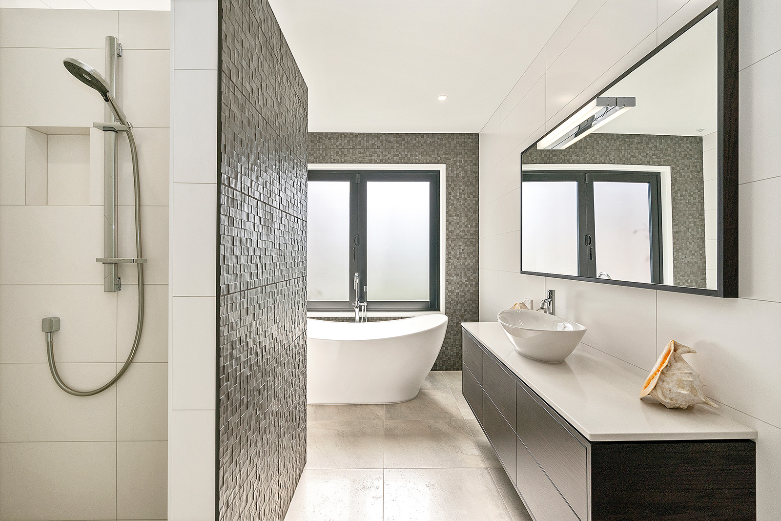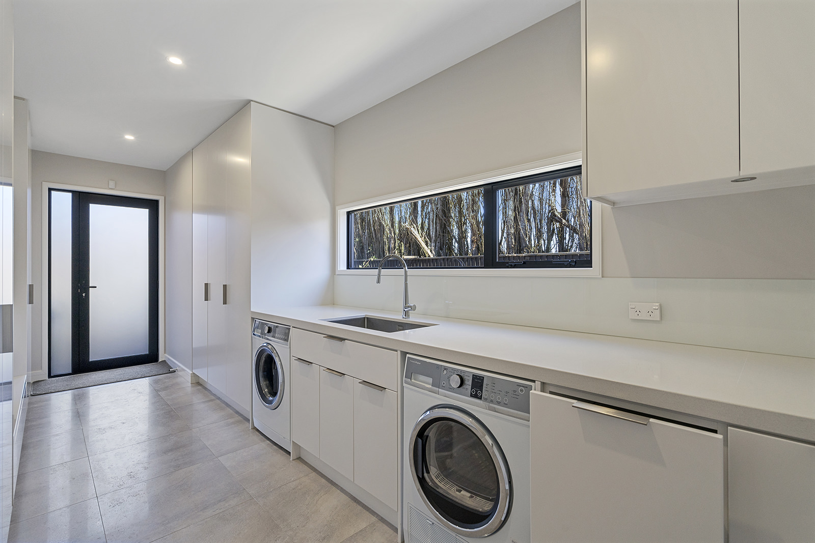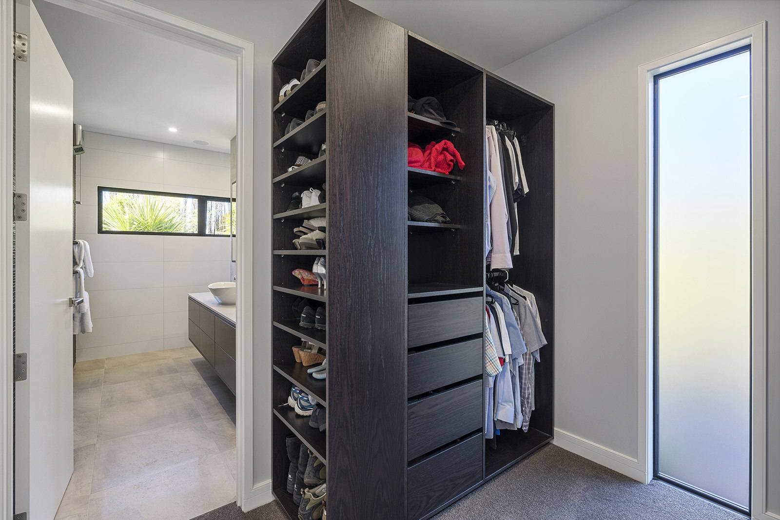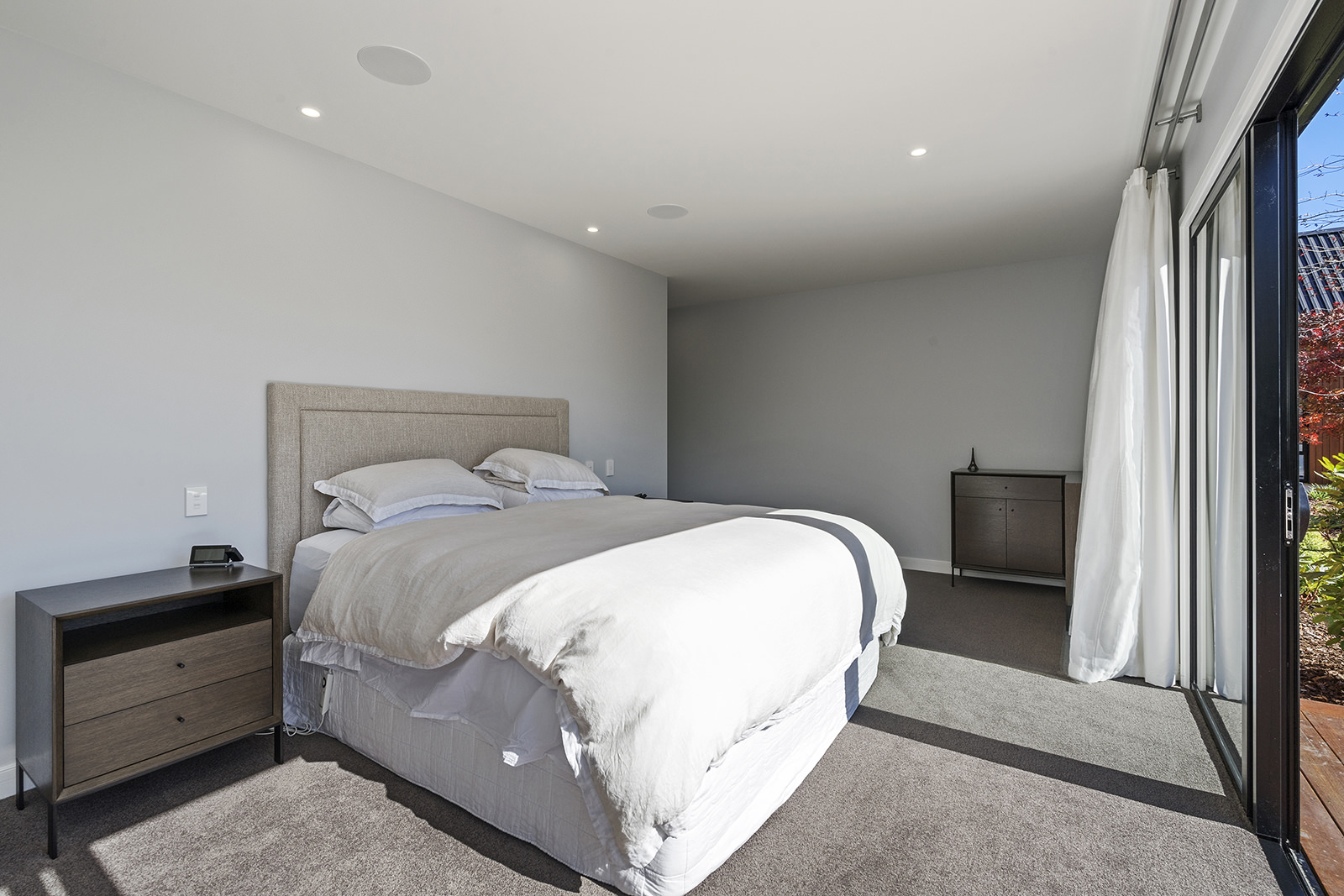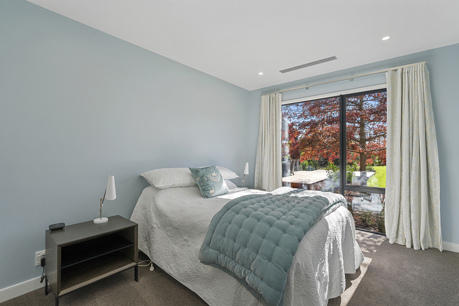First impressions count as you drive up past the pond to reach this one-level double pavilion-style home. An expansive 373sqm, with loft space for storage above the garage, the Christchurch house’s vertical cedar shiplap weatherboard exterior is imposing. Pass through the grand entrance, which includes a pergola, garden feature and substantial wooden front door, to two living areas (one a full media room), then to a monotone kitchen with walk-through scullery and dining area for an enviably configured family living space. Through a vast slider there is an impressive all-weather outdoor dining area and fireplace. Three light and airy bedrooms are sanctuaries for family members wanting quiet time. The master bedroom is a self-contained retreat, complete with a walk-in robe, ensuite, tea and coffee station and private outdoor deck. The dark wood and crisp white colour features throughout the house create a cohesive and harmonious feel.