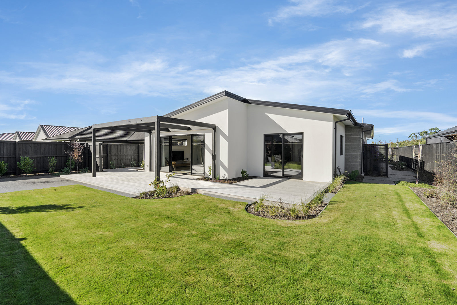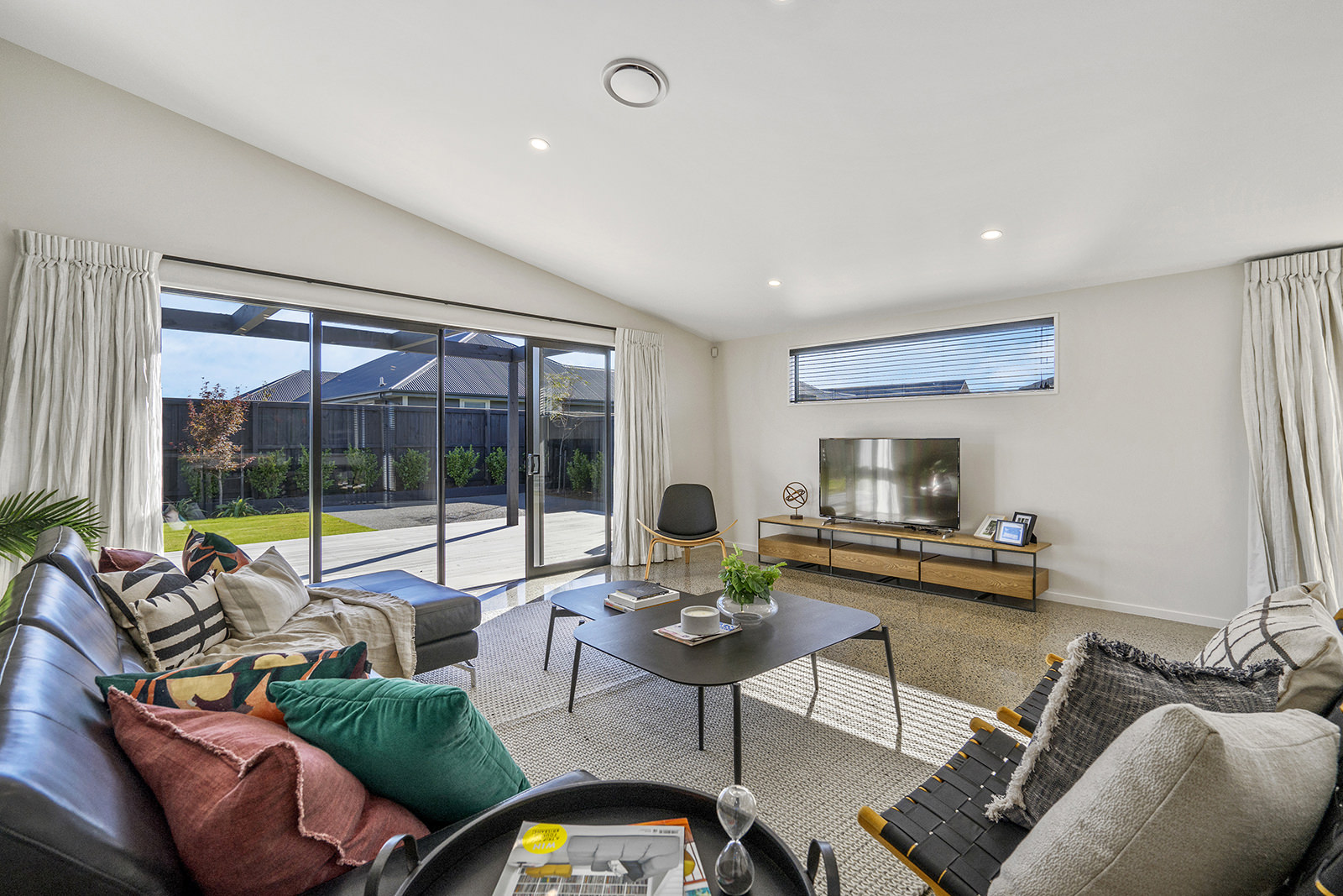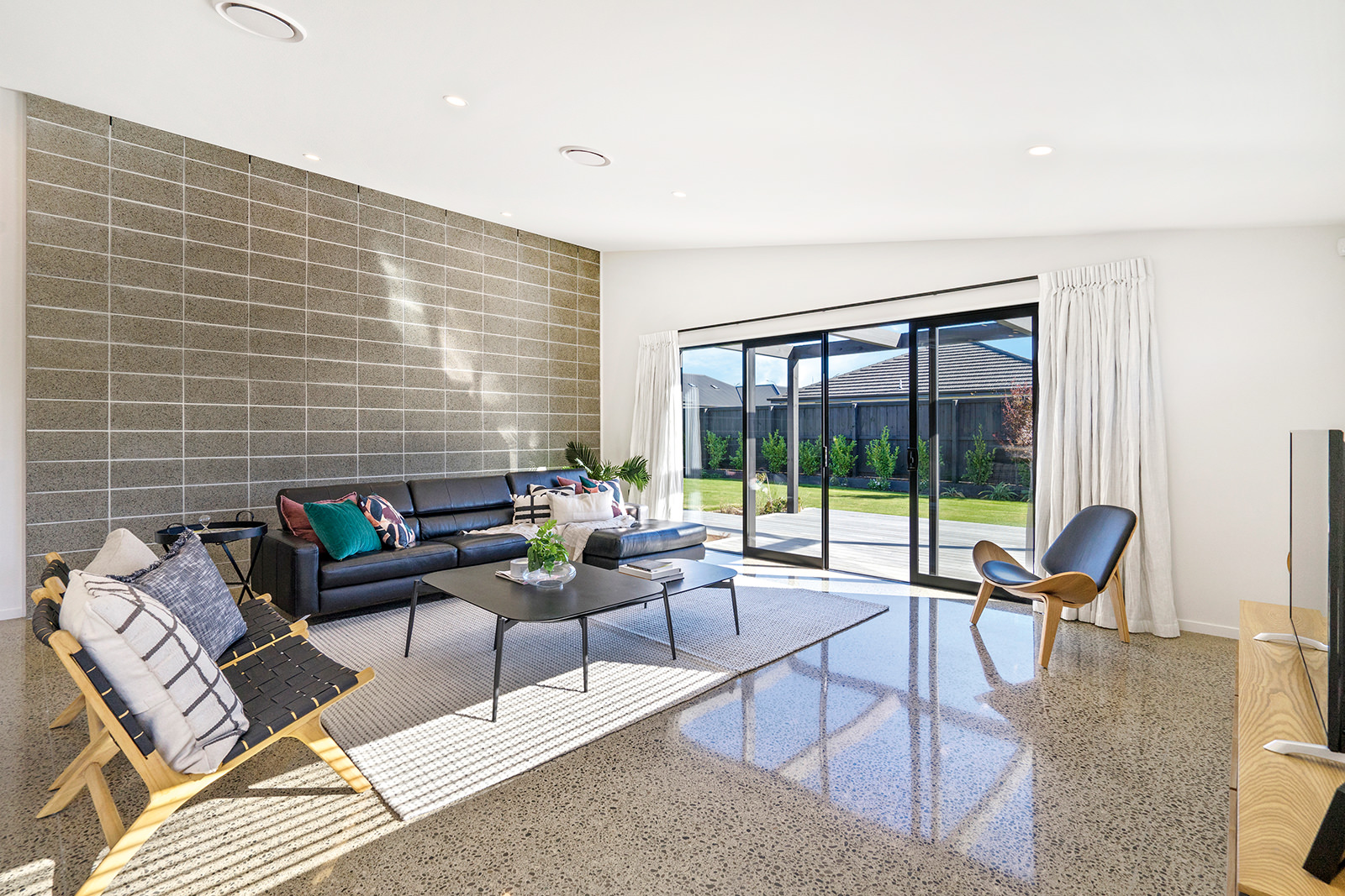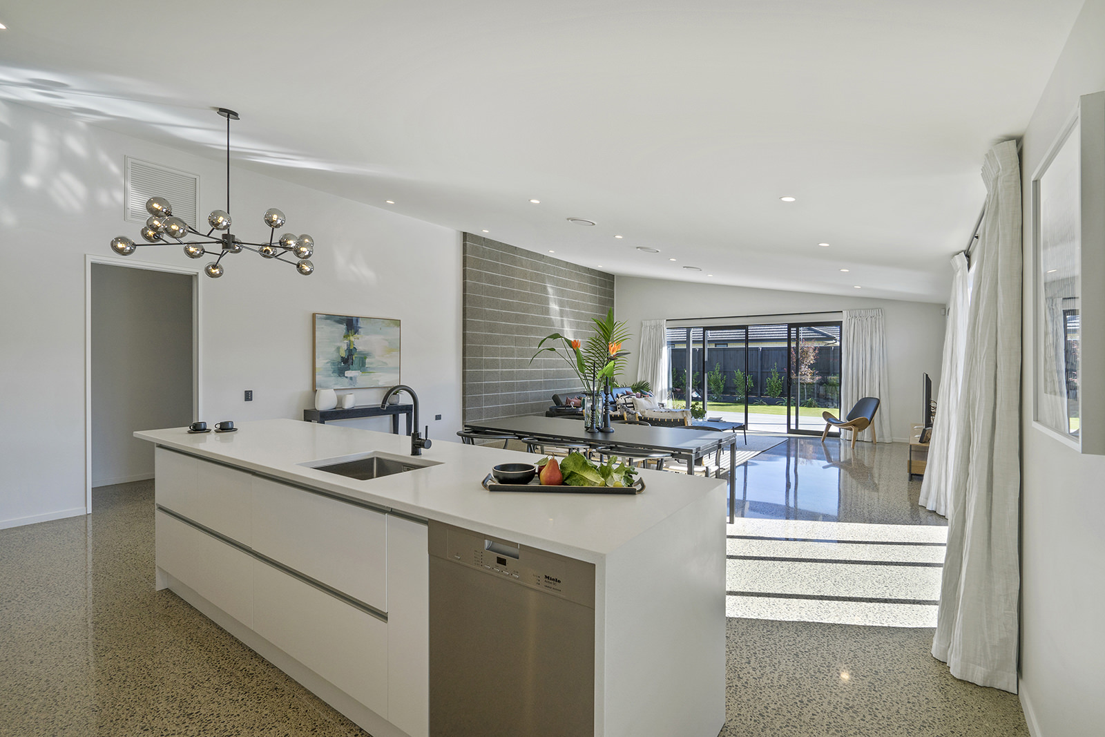 As easy on the eye as it is on its environment, this four-bedroom, two-bathroom show home epitomises Green Homes’ eco-friendly ethos – without compromising on contemporary living. This is the only residential builder in the country to be accredited the ISO 50001 certification for design and construction of energy efficient homes. Sitting south of Christchurch, this 245sqm show home is all about green design and energy conservation. From insulating the foundation’s peripheral edges to low-usage appliances, heat exchange ventilation and optimal airflow throughout – this home commits its owners to a lower carbon footprint and a healthy family environment. It’s a win-win for everyone. The interior conveys unadulterated style from the polished concrete floors to the white, minimalist kitchen and spacious living area with generous sliding doors, opening out to the deck. This house proves that building sustainably doesn’t have to be more expensive than a traditional build. It can be achieved slickly on a modest budget.
