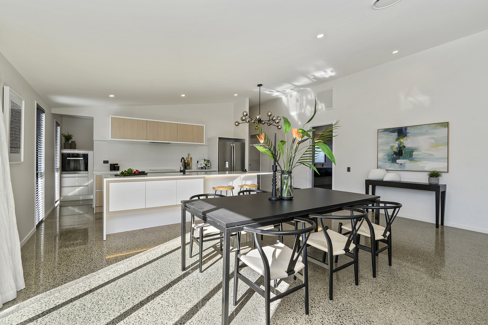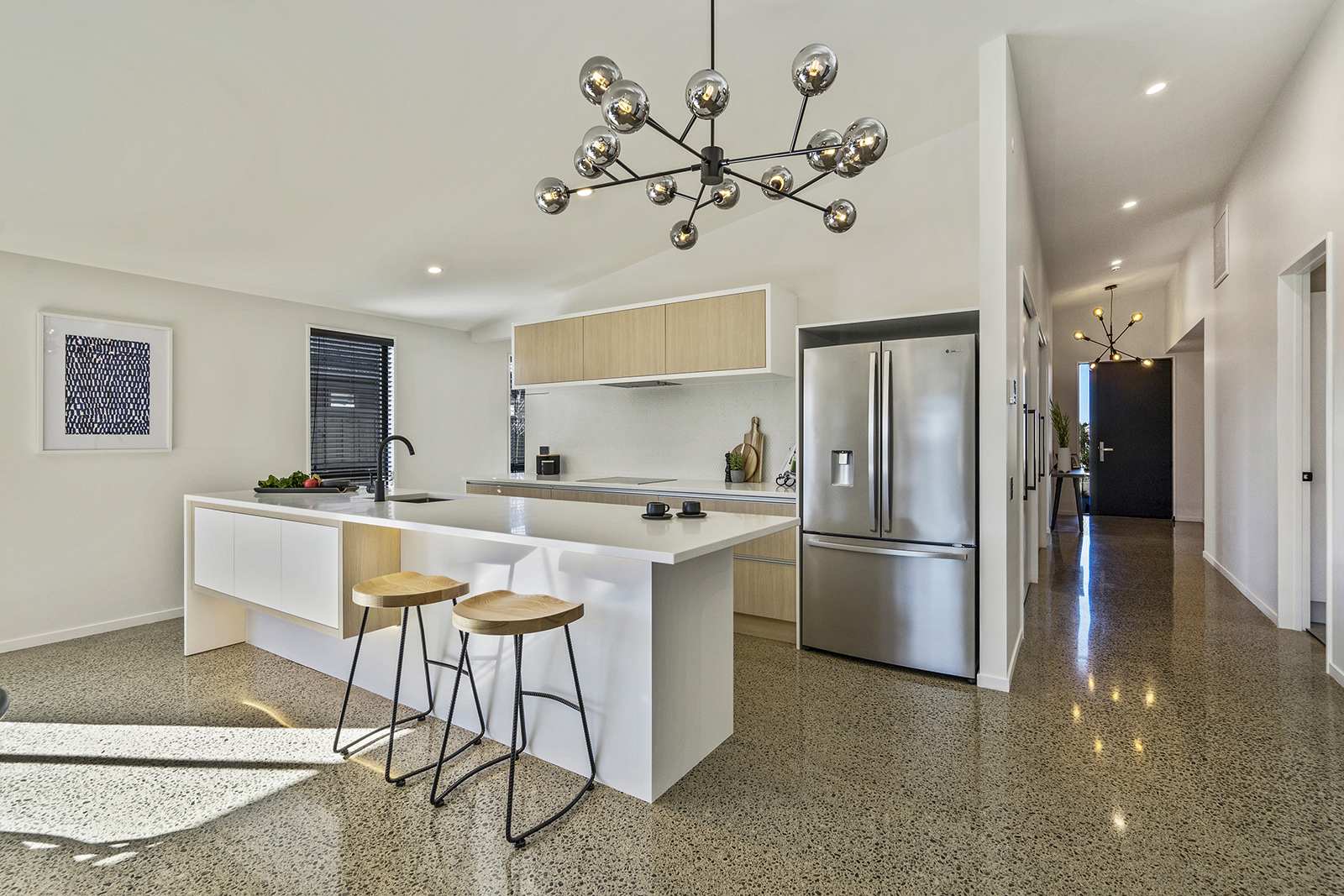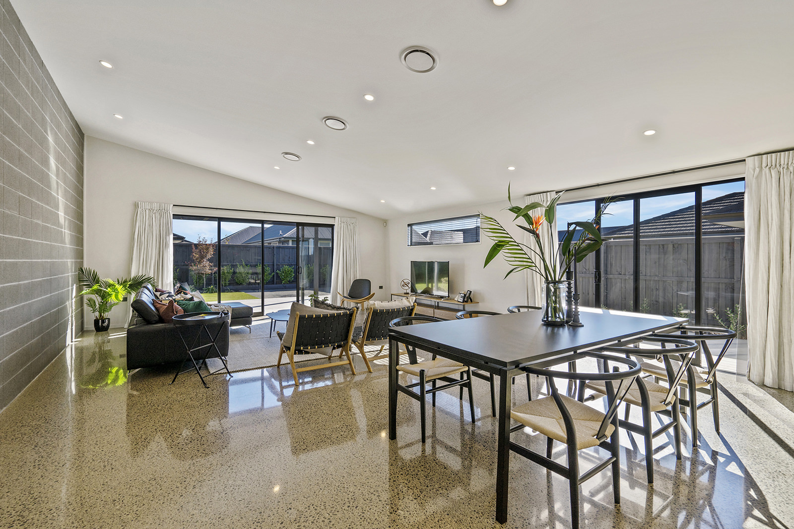 As easy on the eye as it is on its environment, this four-bedroom, two-bathroom show home epitomises Green Homes’ eco-friendly ethos – without compromising on contemporary living. This is the only residential builder in the country to be accredited the ISO 50001 certification for design and construction of energy efficient homes. Sitting south of Christchurch, this 245sqm show home is all about green design and energy conservation. From insulating the foundation’s peripheral edges to low-usage appliances, heat exchange ventilation and optimal airflow throughout – this home commits its owners to a lower carbon footprint and a healthy family environment. It’s a win-win for everyone. The interior conveys unadulterated style from the polished concrete floors to the white, minimalist kitchen and spacious living area with generous sliding doors, opening out to the deck. This house proves that building sustainably doesn’t have to be more expensive than a traditional build. It can be achieved slickly on a modest budget.