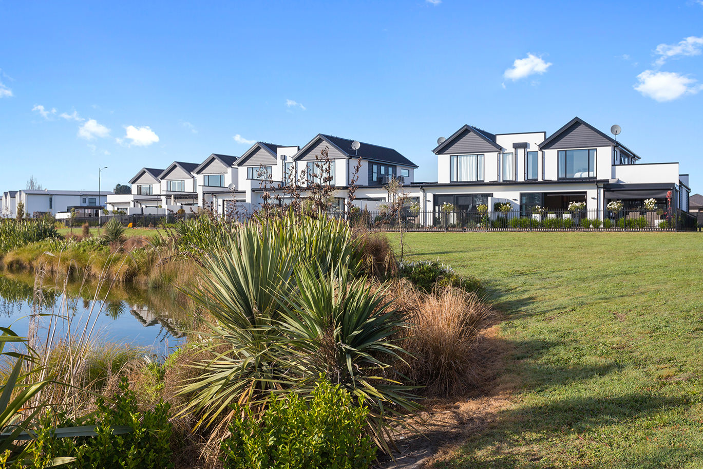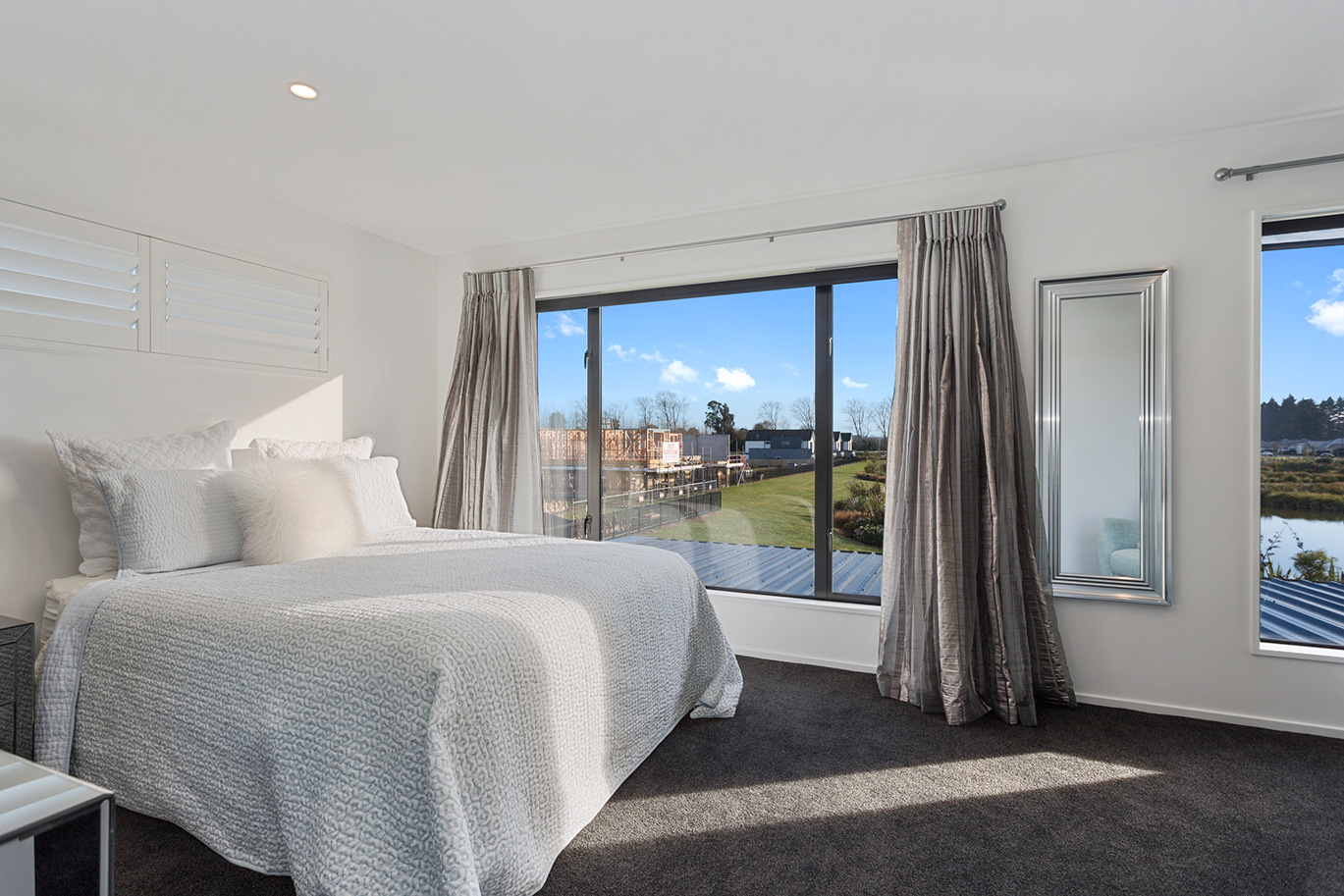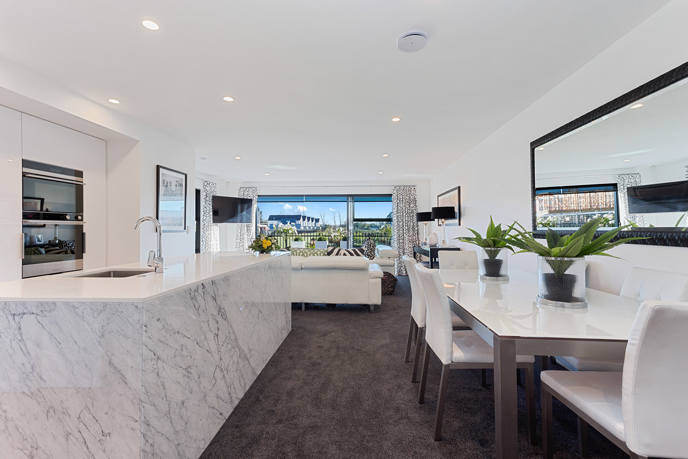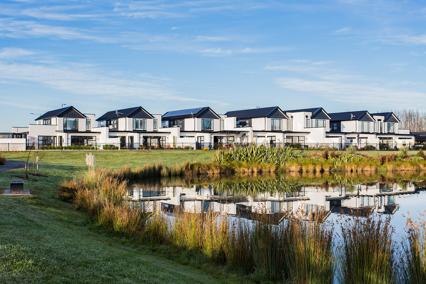 Cleverly arranged on a boomerang-shaped parcel of land, this set of seven lakeside apartments will have viewers coming right back. The design offers the best in country views with all the benefits of private, modern lock-up-and-leave city living. Facing north, these executive homes on the fringe of Christchurch are blessed with all-day sun. Designed for laidback or later-life living, emphasis was put on the use of low-maintenance materials. Level entries between interior and exterior living spaces are another thoughtful touch. The seamless transition enhances the open, flowing feel of the apartments. Each unit has a master bedroom with ensuite and walk-in robe both upstairs and down, future proofing the sleeping quarters. The street-facing hobby room promises flexible use – think gym, den or craft room. The apartments have private front entries, internal access double garages, plus amenity areas and laundry chutes for streamlined living. Modern designer kitchens with stone benchtops and walk-in pantries round out the style.