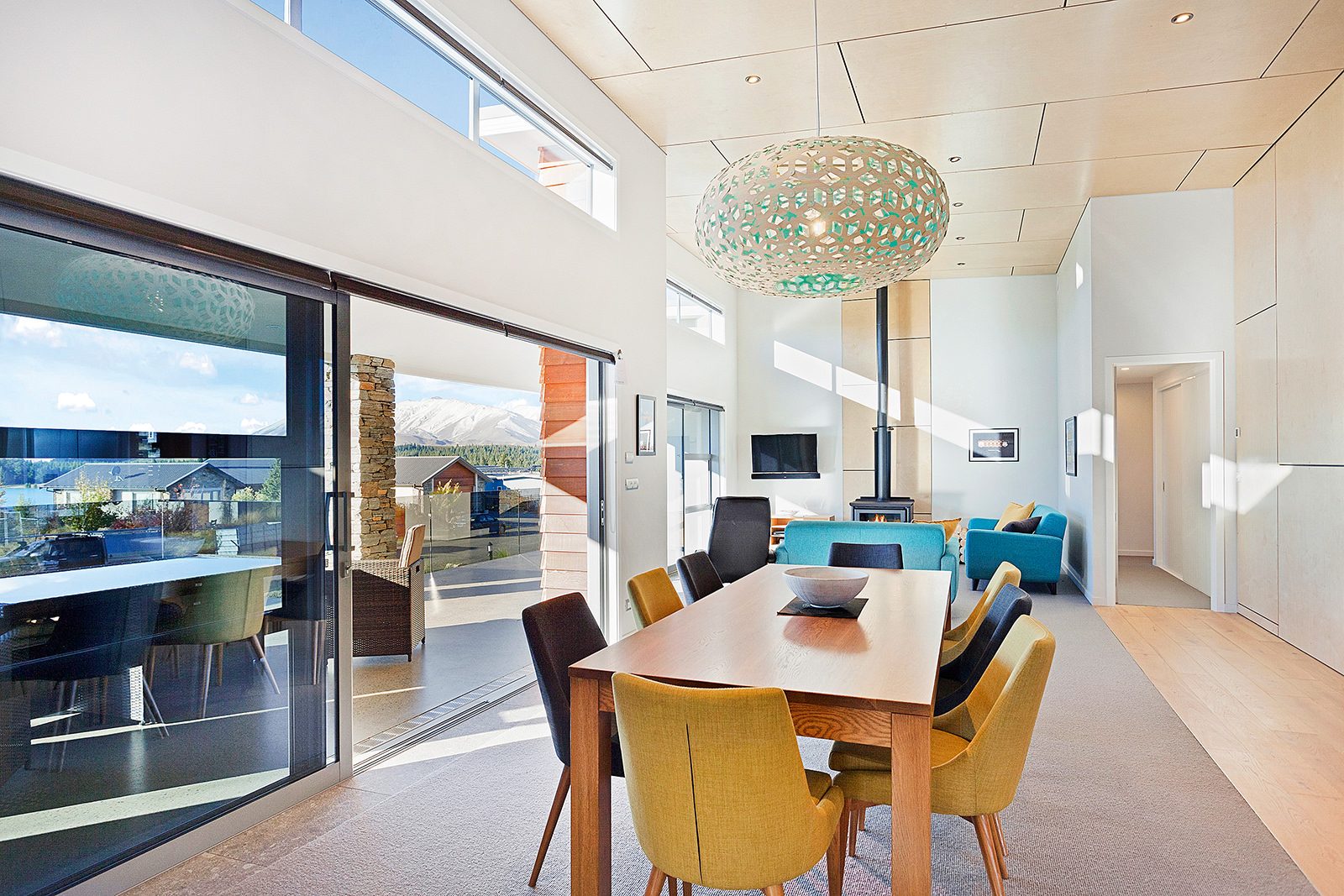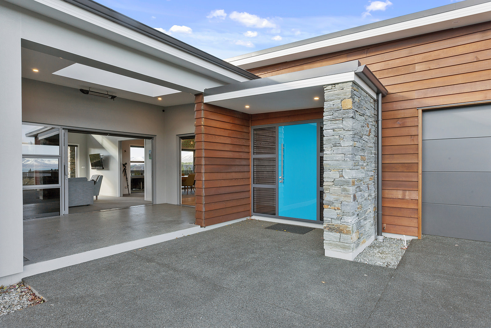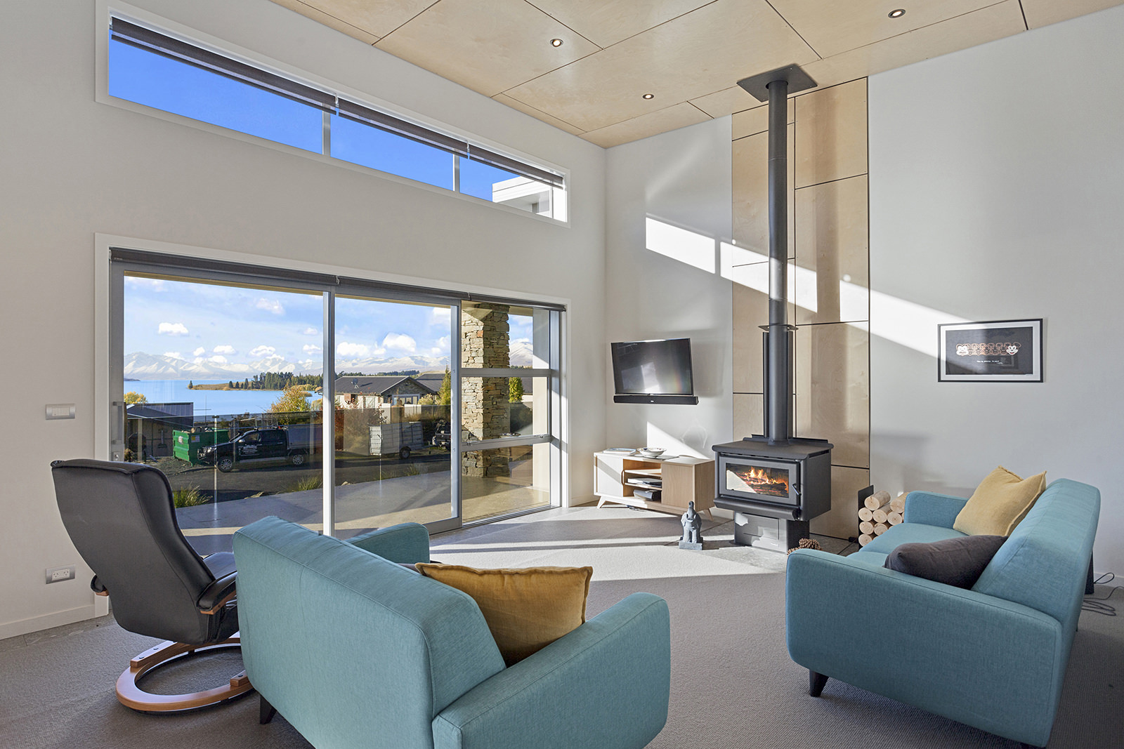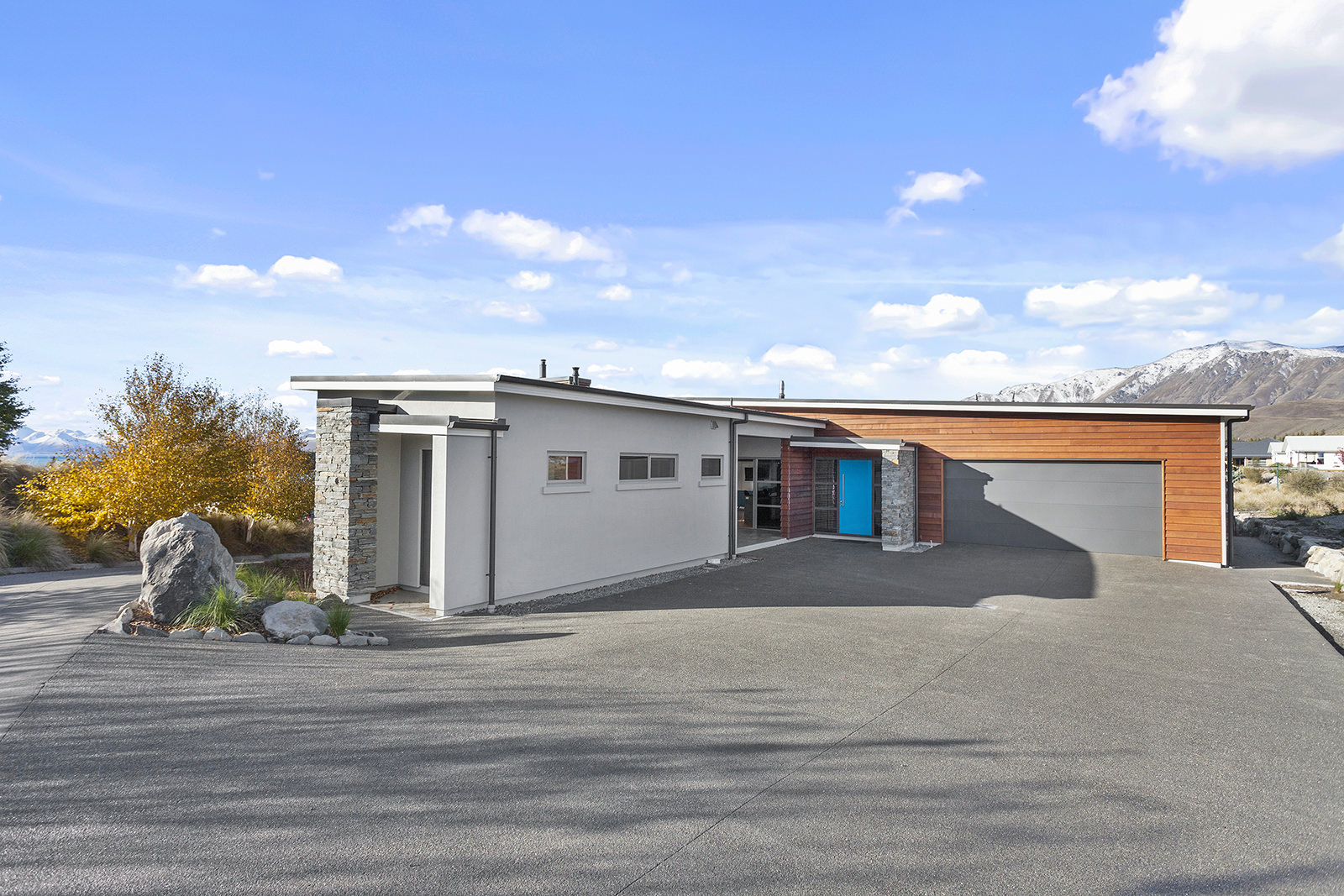 Perfectly positioned for sun and sweeping views, this 302sqm Mackenzie Country home speaks of modern comfort and luxury. Designed to share, the gorgeous three-bedroom residence with three bathrooms includes a well-appointed master bedroom and a guest suite with kitchenette and breathtaking vista. A turquoise glass front door gives a nod to the lake setting. Step inside and slip off your coat – this home is exceptionally warm. Continue through a sliding door and make yourself at home in the open-plan zone with its designer kitchen and wood-burner. Gaze through extensive glass to the lake and Southern Alps beyond. Let the views sink in, then marvel at the birch ply ceilings high overhead. The separate lounge with fireplace is a self-contained sanctuary. Large stacker slider doors open the main living area to polished concrete patios to the north and south, providing alfresco options for varying conditions. Clad in cedar, plaster and locally sourced schist, the house is in harmony with the surrounding mountains. Its bursts of blue bring the natural colour palette to life.
