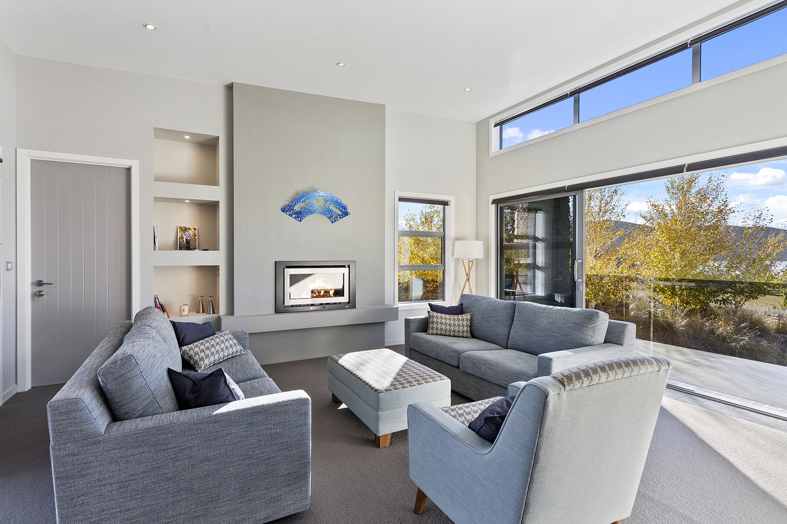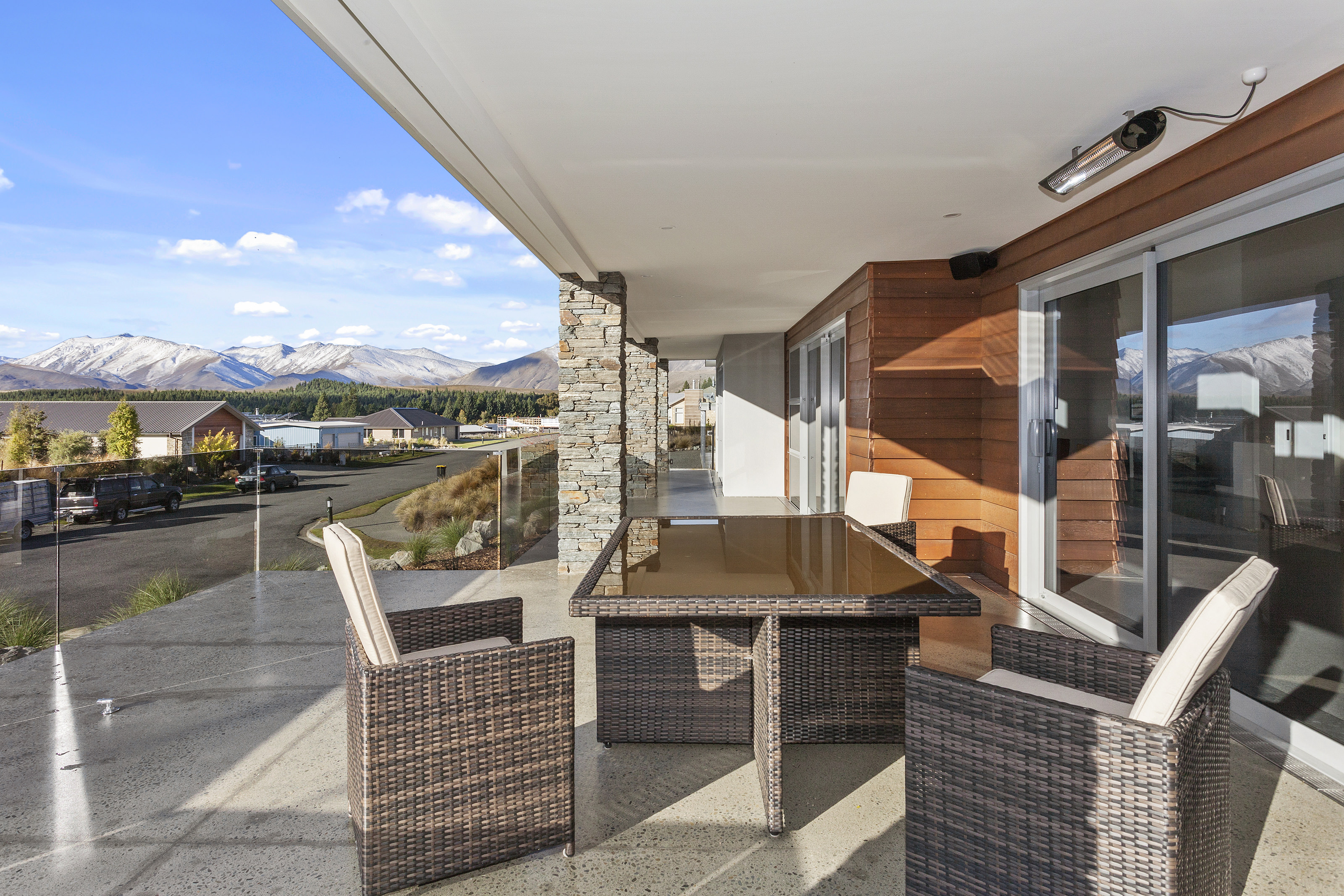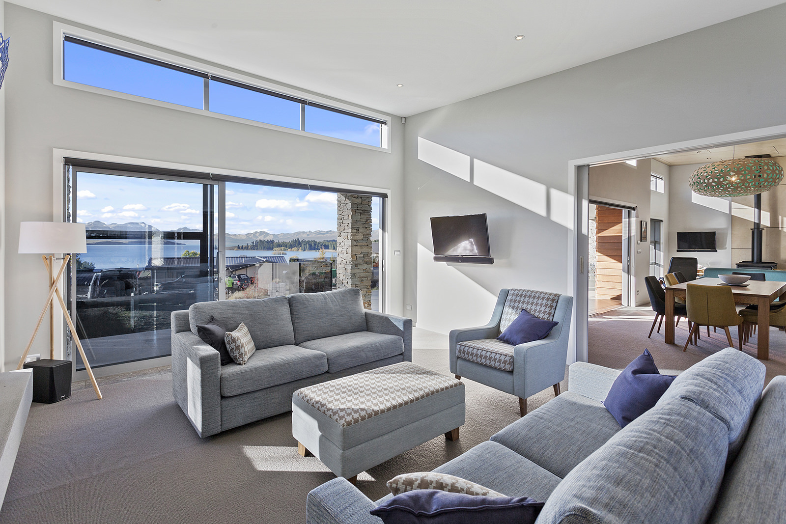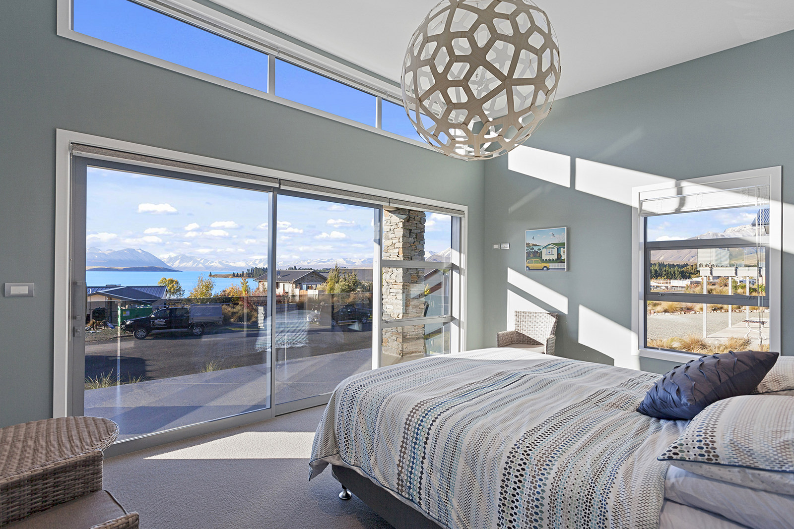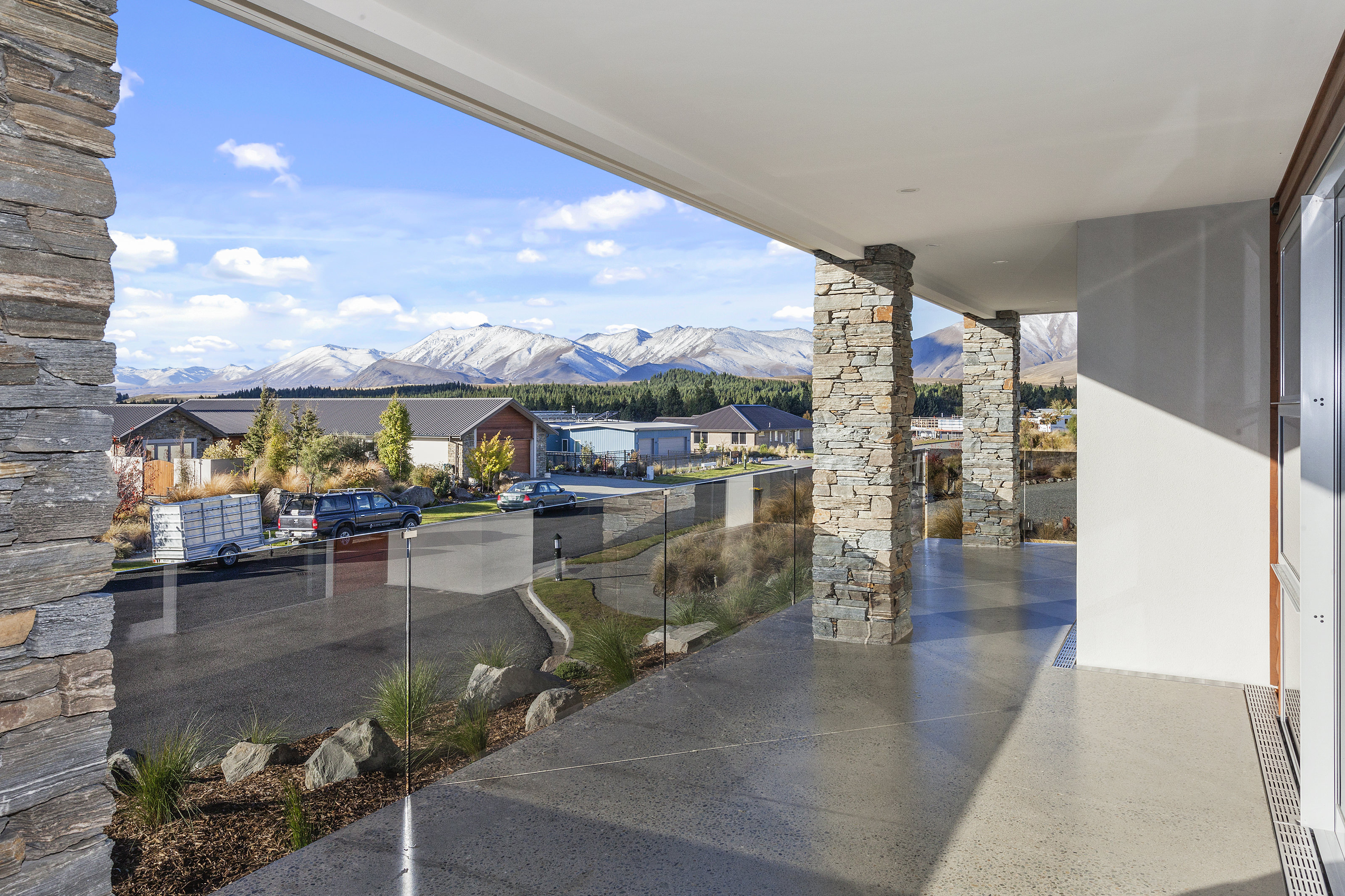 Perfectly positioned for sun and sweeping views, this 302sqm Mackenzie Country home speaks of modern comfort and luxury. Designed to share, the gorgeous three-bedroom residence with three bathrooms includes a well-appointed master bedroom and a guest suite with kitchenette and breathtaking vista. A turquoise glass front door gives a nod to the lake setting. Step inside and slip off your coat – this home is exceptionally warm. Continue through a sliding door and make yourself at home in the open-plan zone with its designer kitchen and wood-burner. Gaze through extensive glass to the lake and Southern Alps beyond. Let the views sink in, then marvel at the birch ply ceilings high overhead. The separate lounge with fireplace is a self-contained sanctuary. Large stacker slider doors open the main living area to polished concrete patios to the north and south, providing alfresco options for varying conditions. Clad in cedar, plaster and locally sourced schist, the house is in harmony with the surrounding mountains. Its bursts of blue bring the natural colour palette to life.