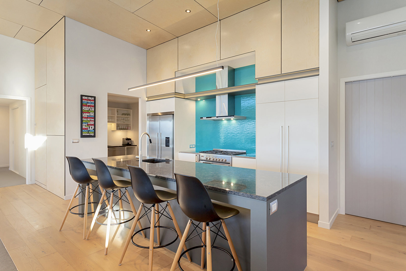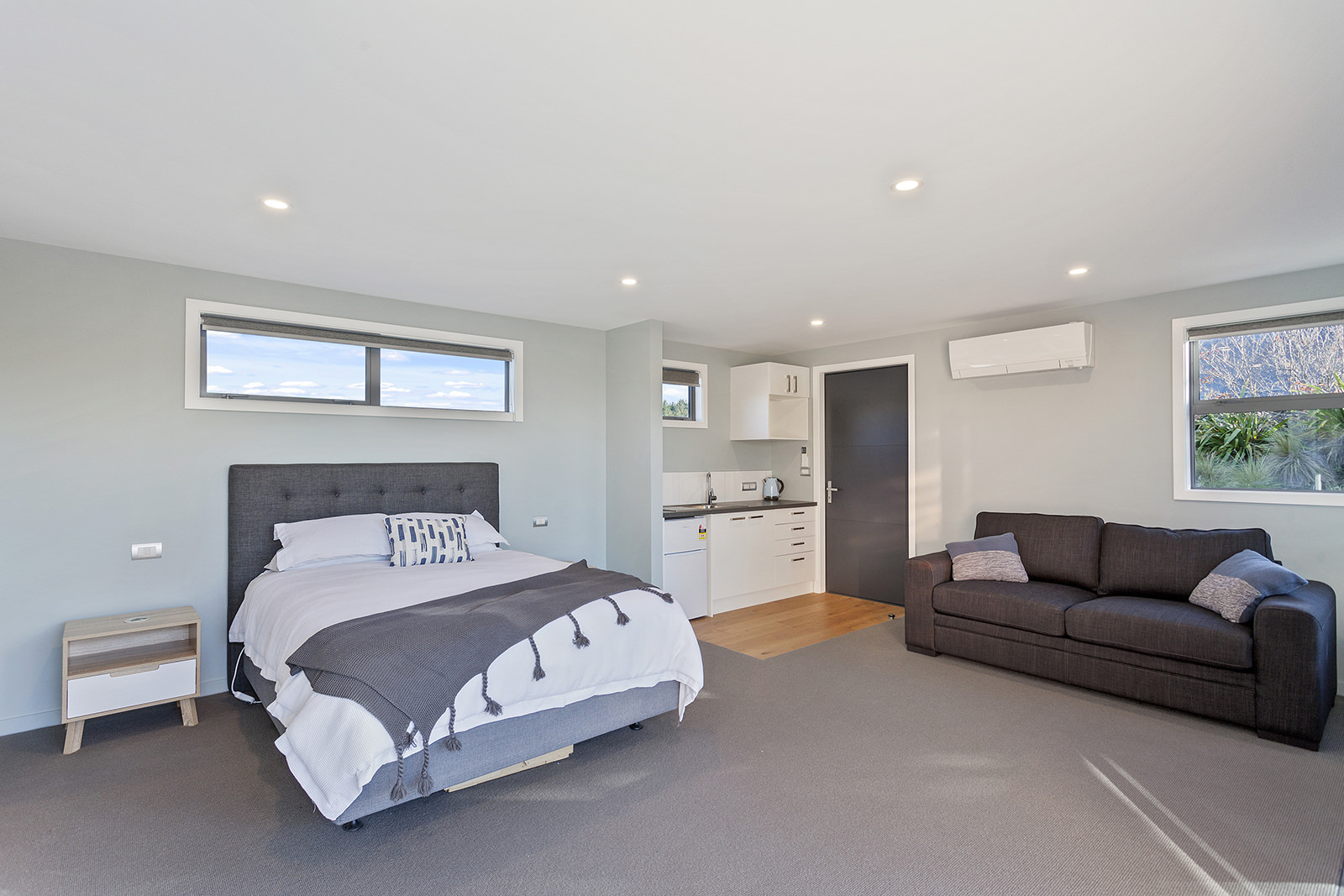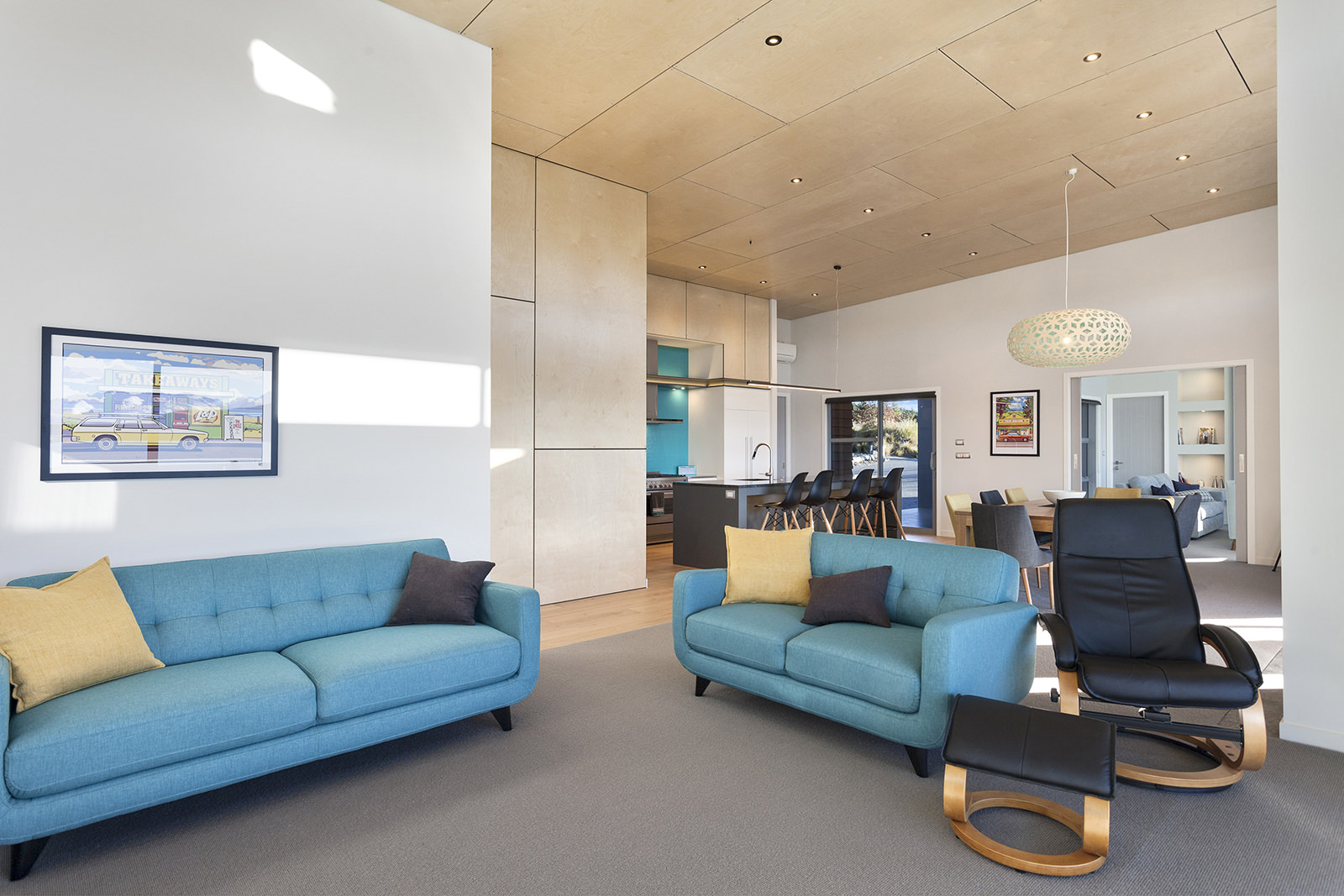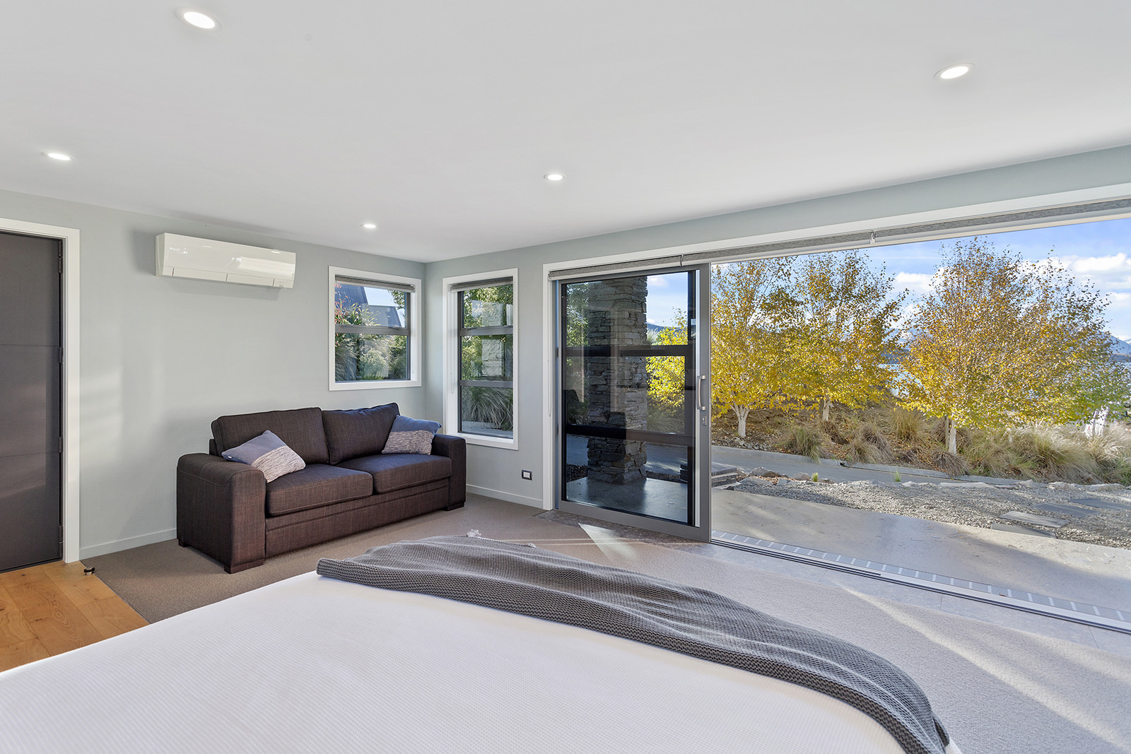 Perfectly positioned for sun and sweeping views, this 302sqm Mackenzie Country home speaks of modern comfort and luxury. Designed to share, the gorgeous three-bedroom residence with three bathrooms includes a well-appointed master bedroom and a guest suite with kitchenette and breathtaking vista. A turquoise glass front door gives a nod to the lake setting. Step inside and slip off your coat – this home is exceptionally warm. Continue through a sliding door and make yourself at home in the open-plan zone with its designer kitchen and wood-burner. Gaze through extensive glass to the lake and Southern Alps beyond. Let the views sink in, then marvel at the birch ply ceilings high overhead. The separate lounge with fireplace is a self-contained sanctuary. Large stacker slider doors open the main living area to polished concrete patios to the north and south, providing alfresco options for varying conditions. Clad in cedar, plaster and locally sourced schist, the house is in harmony with the surrounding mountains. Its bursts of blue bring the natural colour palette to life.