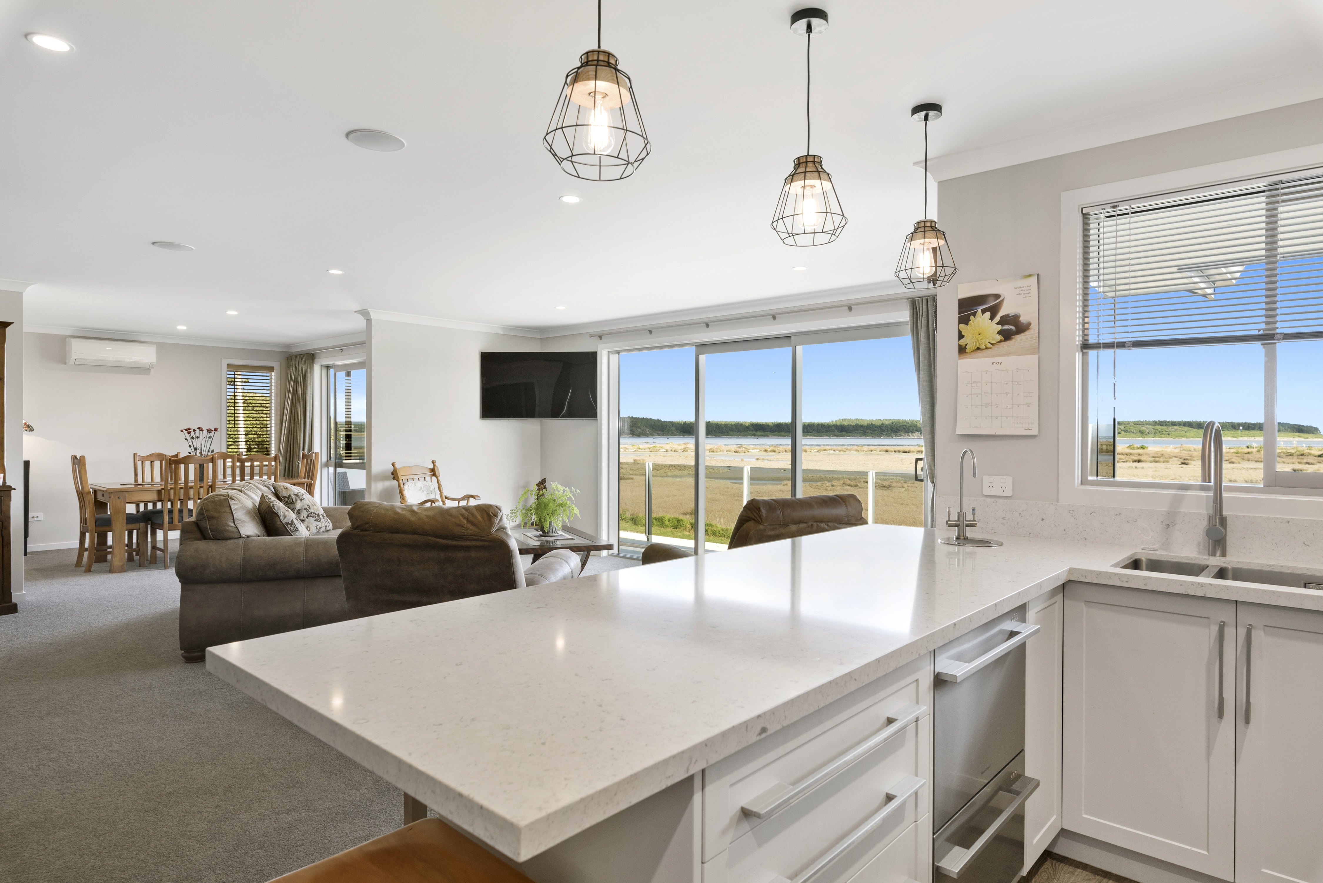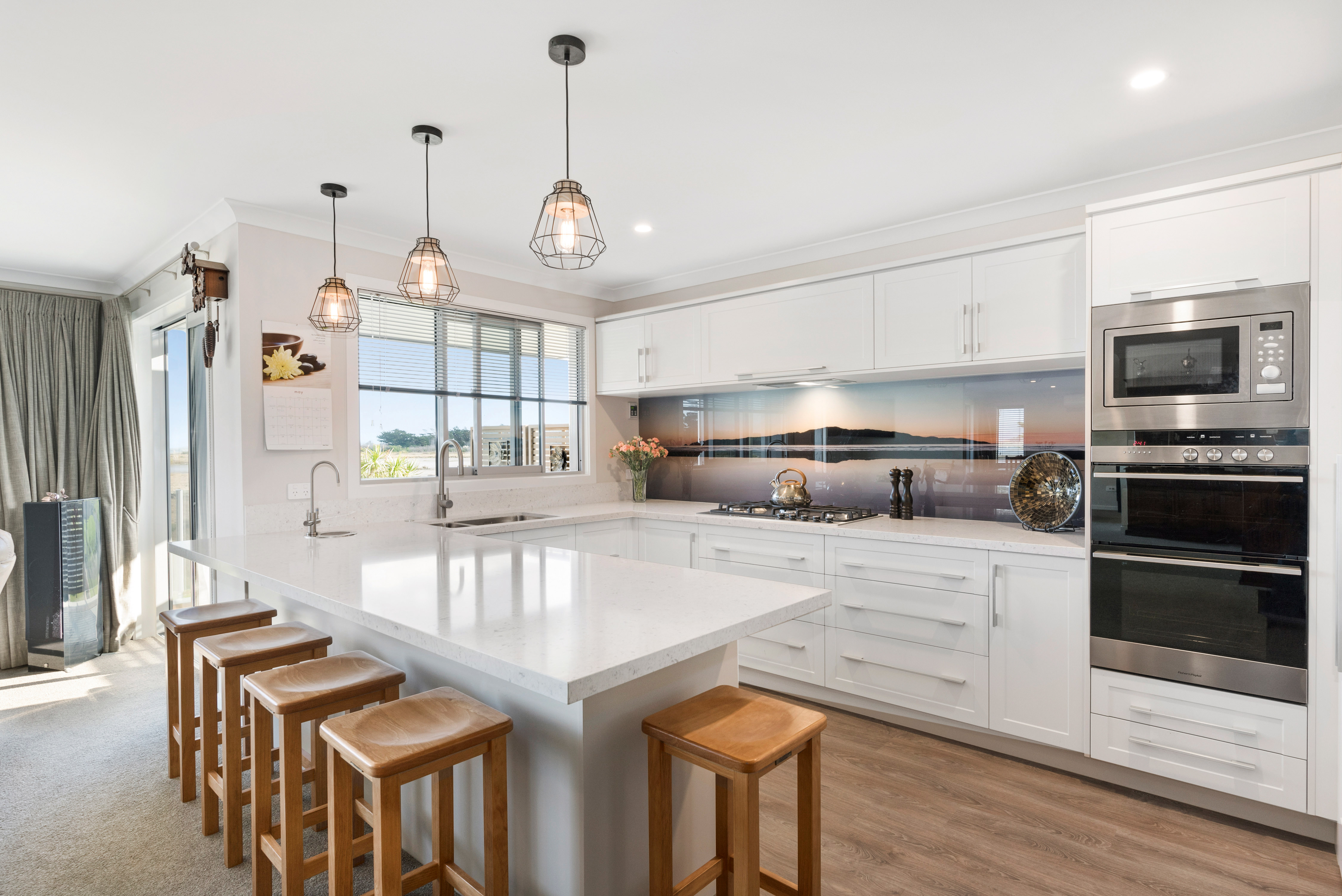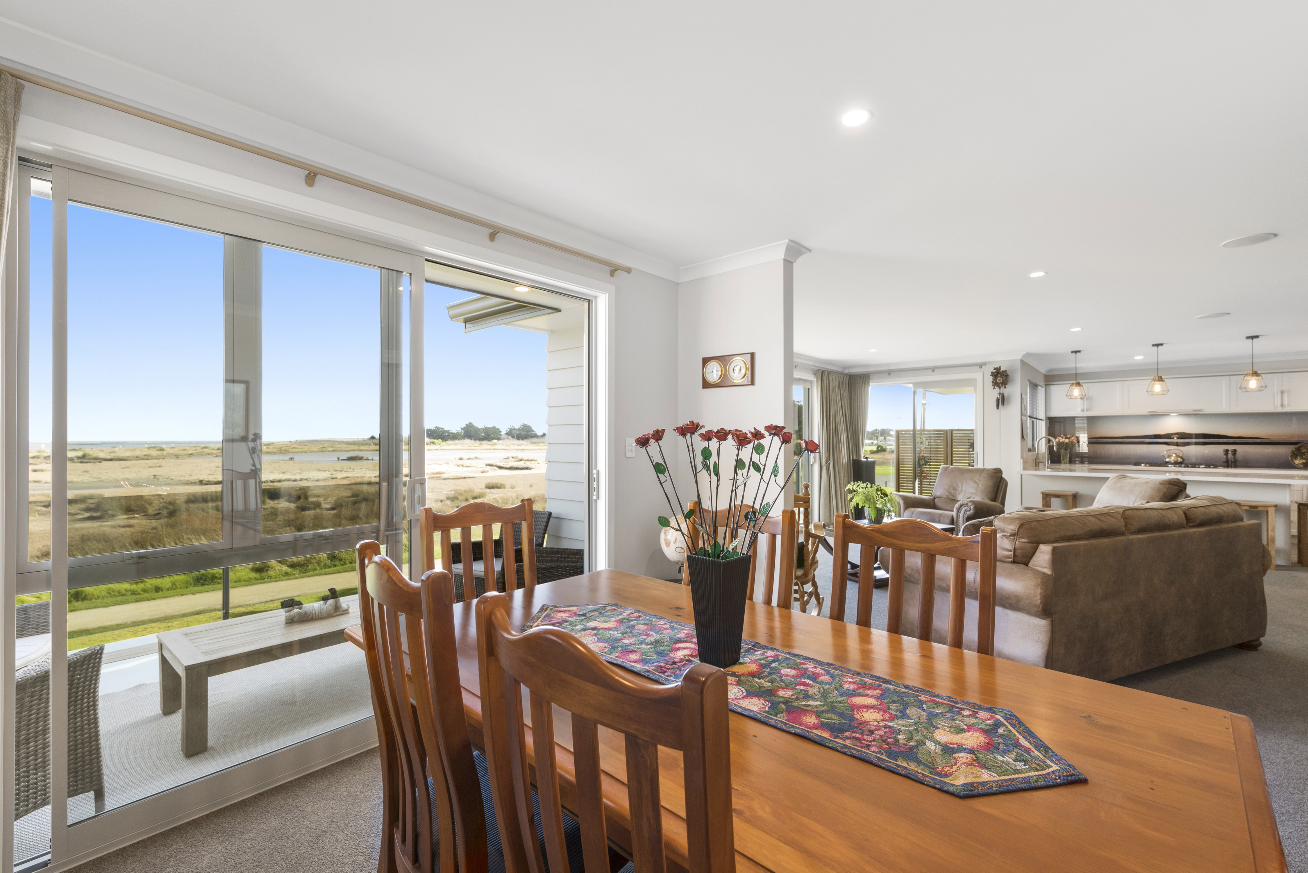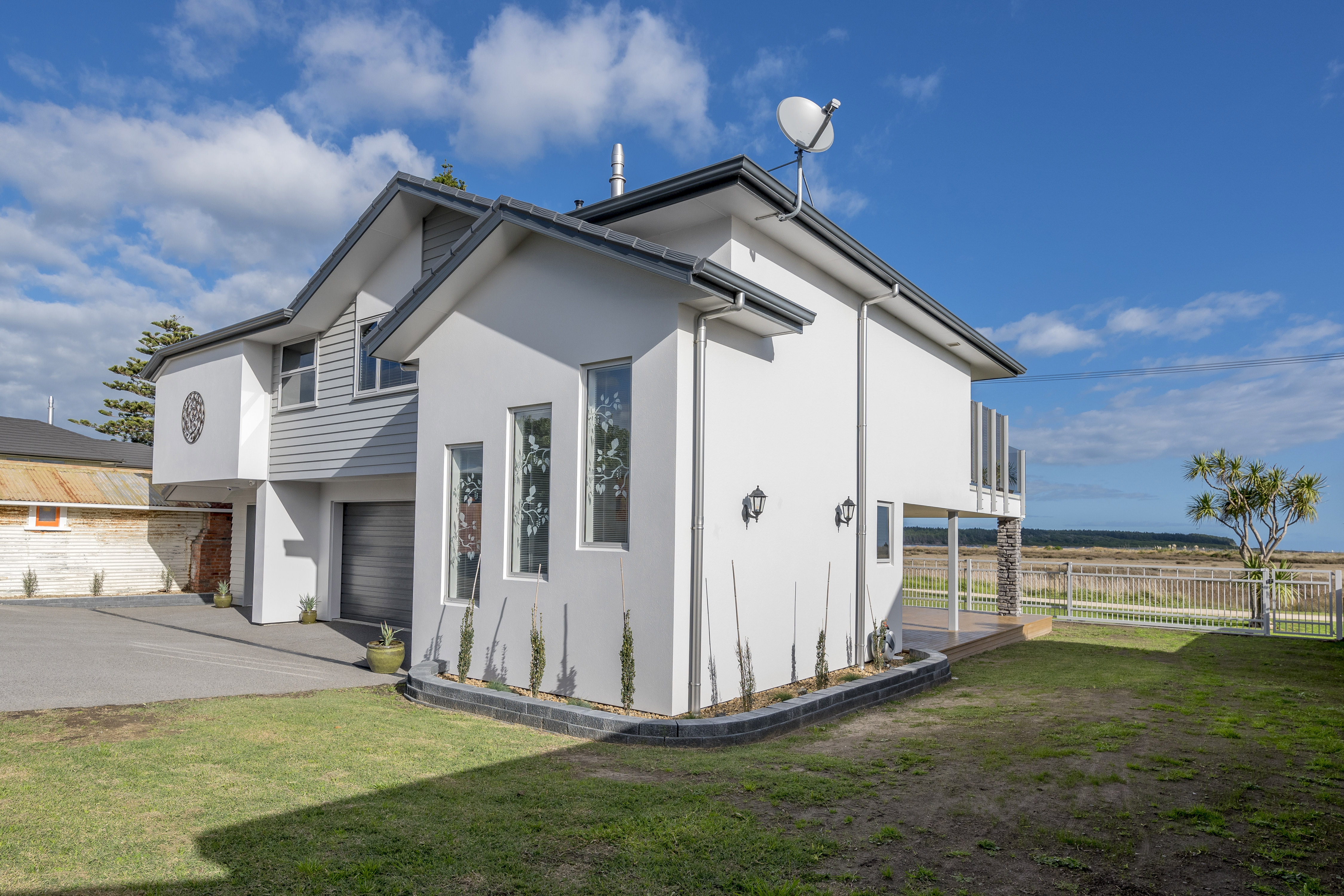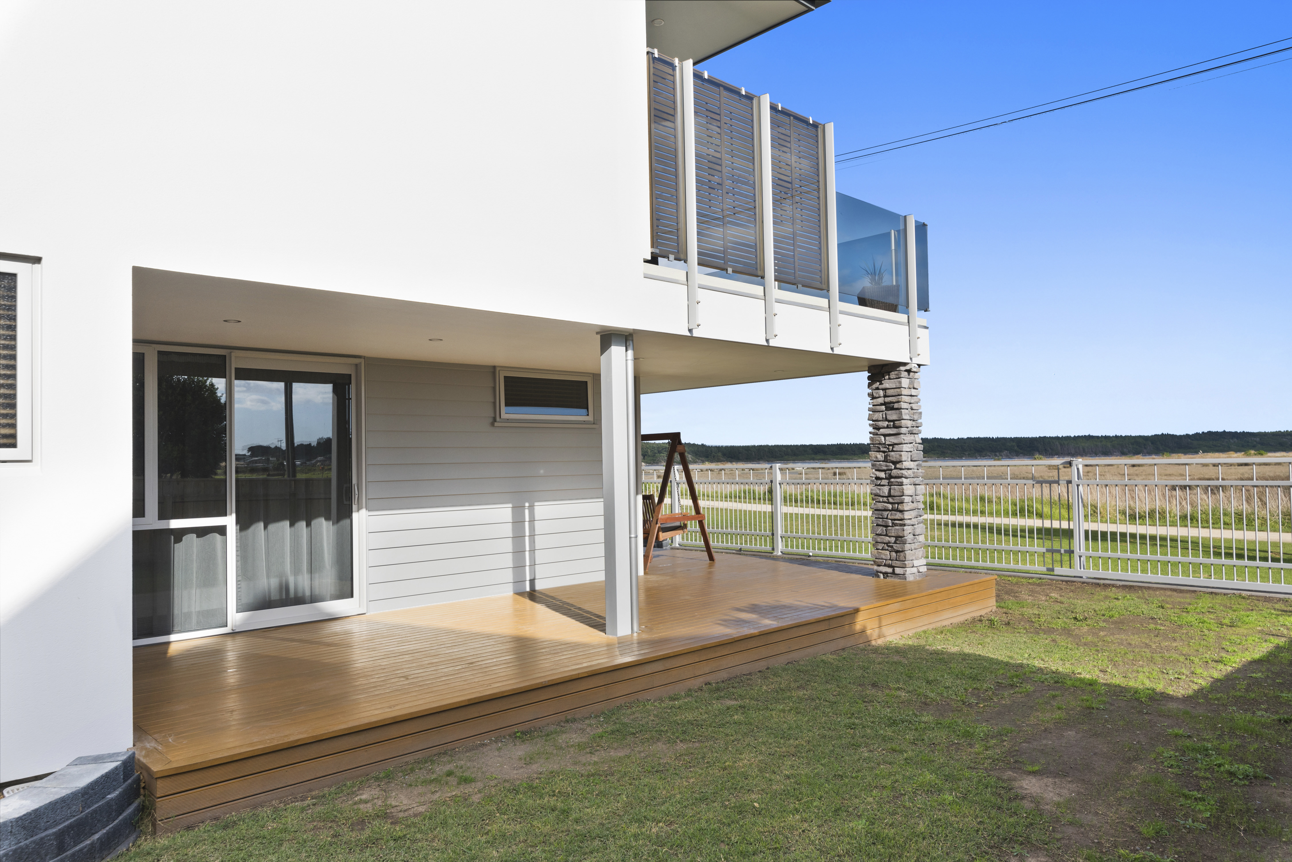 With views of the river-mouth and wildlife bird sanctuary, this is one well-situated home. The two-storey design, with gable ends and satin-finish steel roof tiles, sets the tone for the entire home. Low-maintenance weatherboard and stone add interest to the exterior – a mix of traditional and down-to-earth appeal. The front entrance is lit by a trio of windows, leading upstairs. Or you can take the home’s lift. At the top, step into the warm embrace of open-plan living with river views to foster conversation around a freestanding wood burner. Large glass sliding doors span the length of the living space flowing out to the balcony for wining and dining. The designer kitchen has its own picture-perfect view with a digital glass splashback featuring Kapiti Island. The master bedroom includes a well-designed double wardrobe and adjoining ensuite. Guests are accommodated with a large bedroom and bathroom also on this level. The fully tiled spa bath is a splendid place to relax and reflect in this wonderful home.