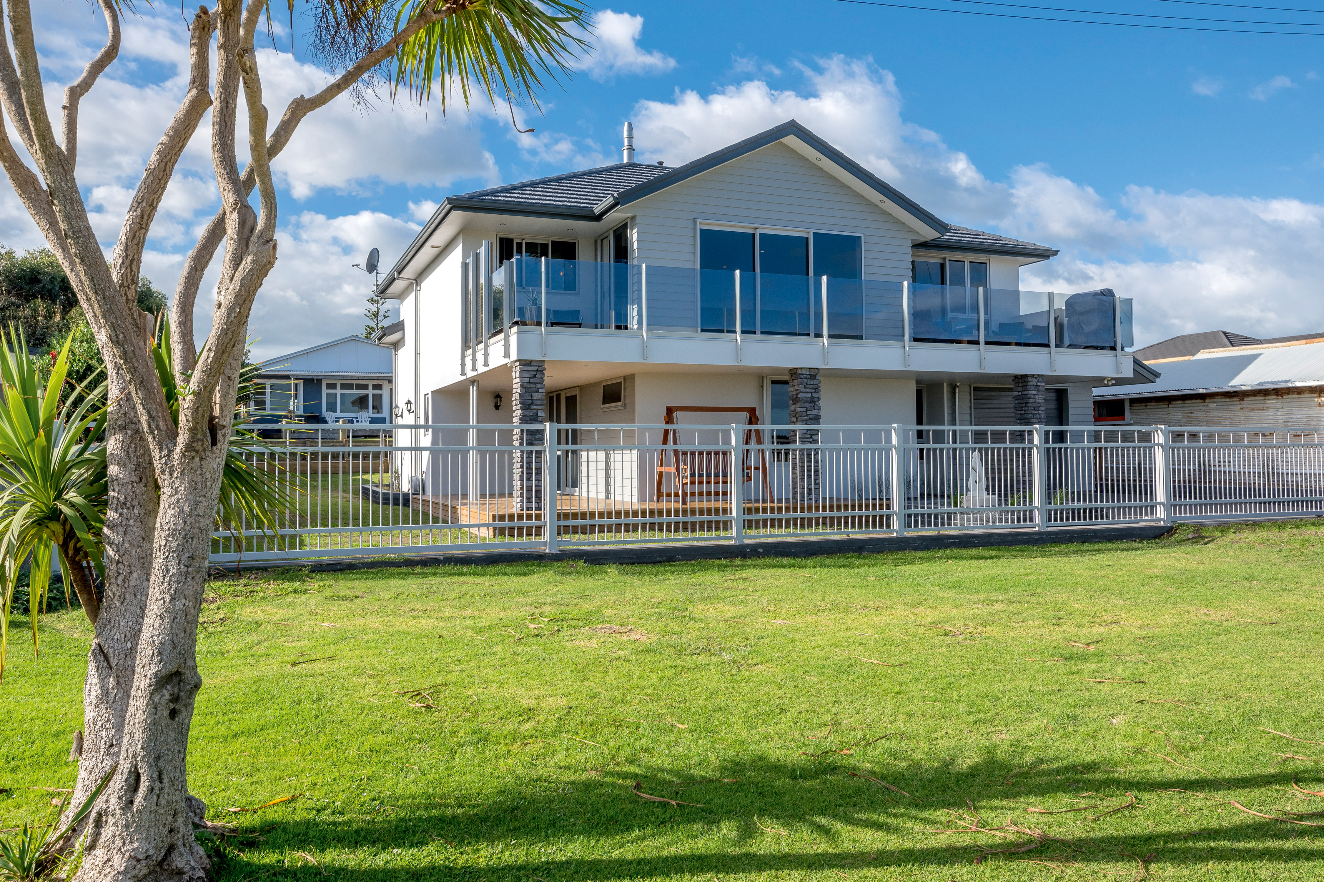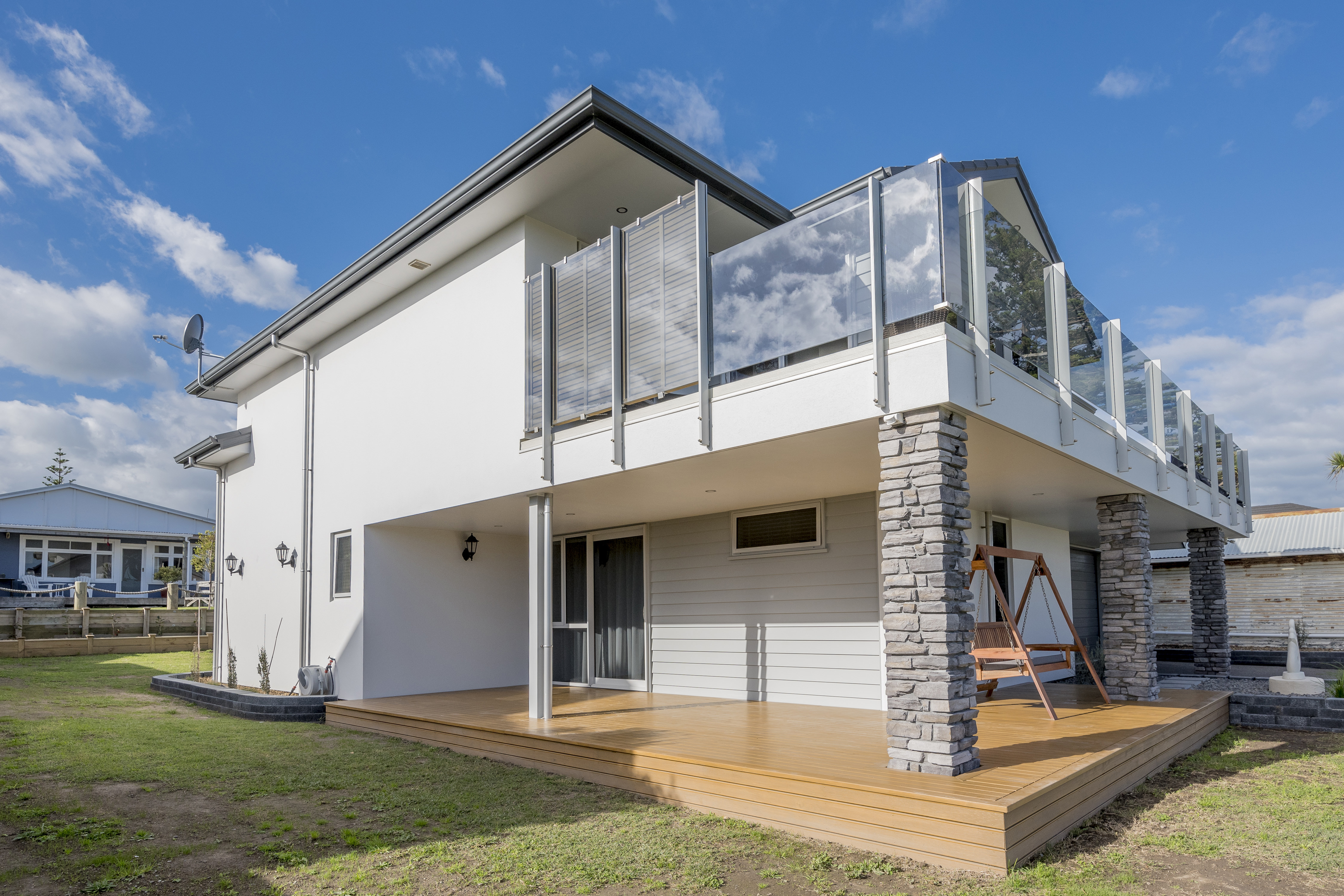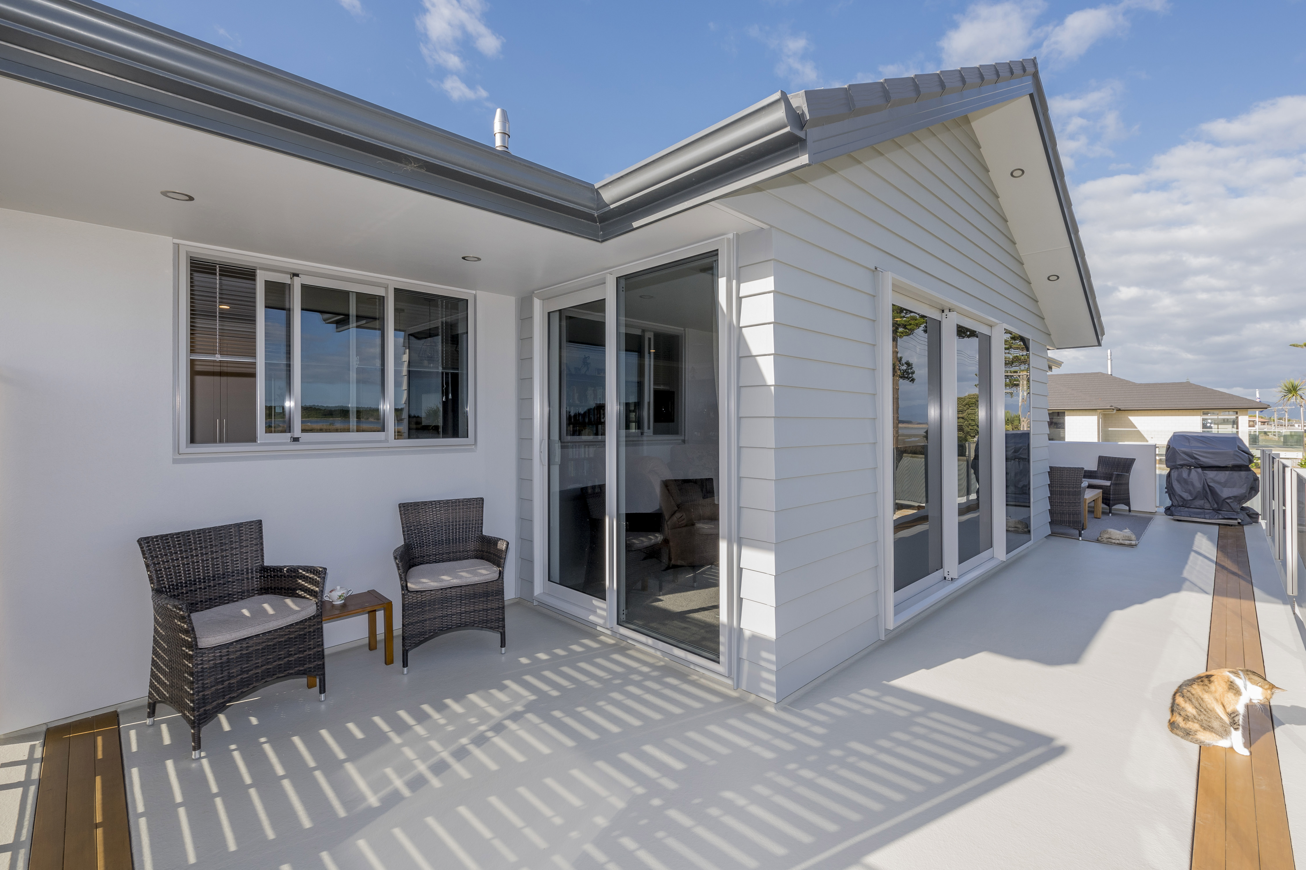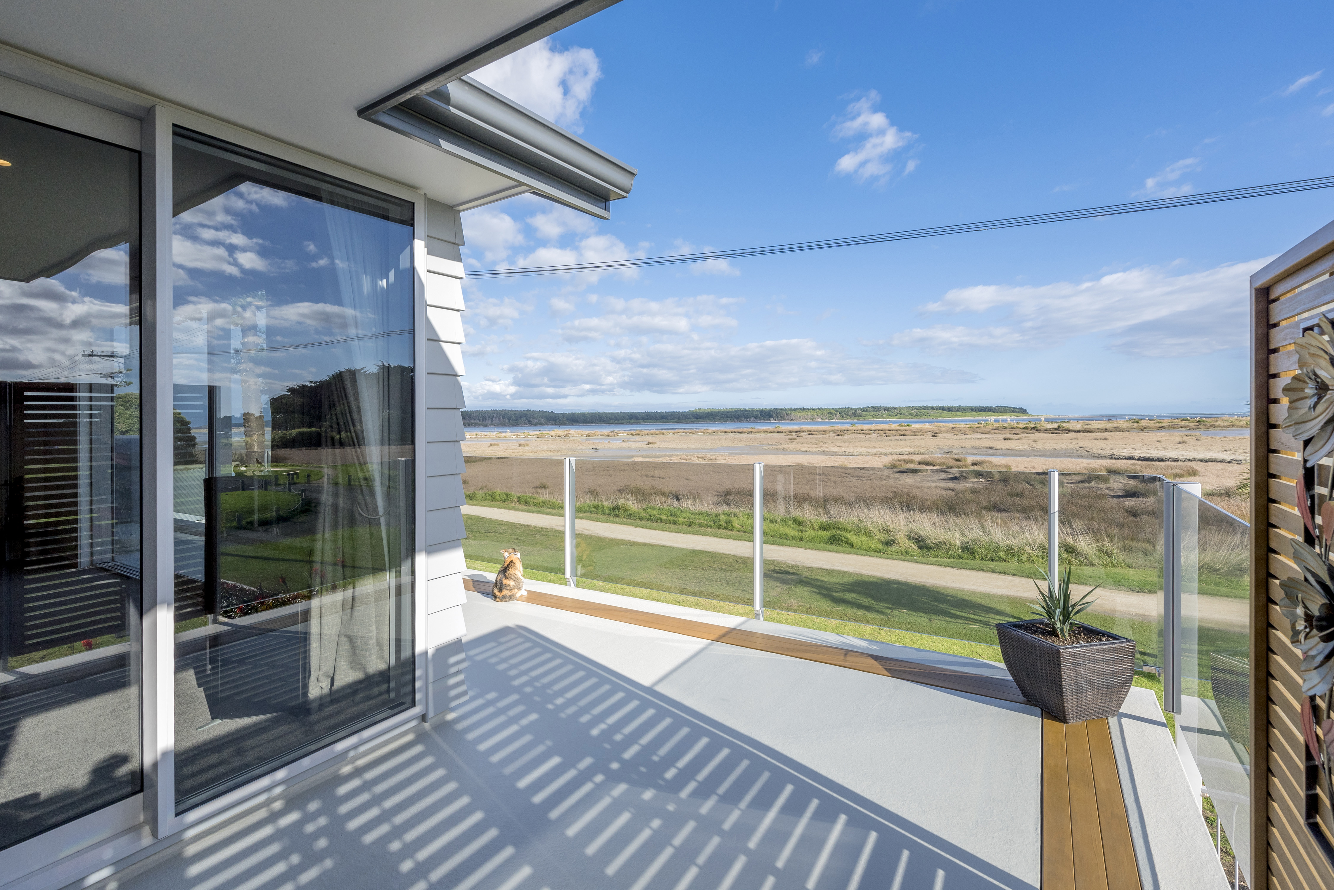 With views of the river-mouth and wildlife bird sanctuary, this is one well-situated home. The two-storey design, with gable ends and satin-finish steel roof tiles, sets the tone for the entire home. Low-maintenance weatherboard and stone add interest to the exterior – a mix of traditional and down-to-earth appeal. The front entrance is lit by a trio of windows, leading upstairs. Or you can take the home’s lift. At the top, step into the warm embrace of open-plan living with river views to foster conversation around a freestanding wood burner. Large glass sliding doors span the length of the living space flowing out to the balcony for wining and dining. The designer kitchen has its own picture-perfect view with a digital glass splashback featuring Kapiti Island. The master bedroom includes a well-designed double wardrobe and adjoining ensuite. Guests are accommodated with a large bedroom and bathroom also on this level. The fully tiled spa bath is a splendid place to relax and reflect in this wonderful home.