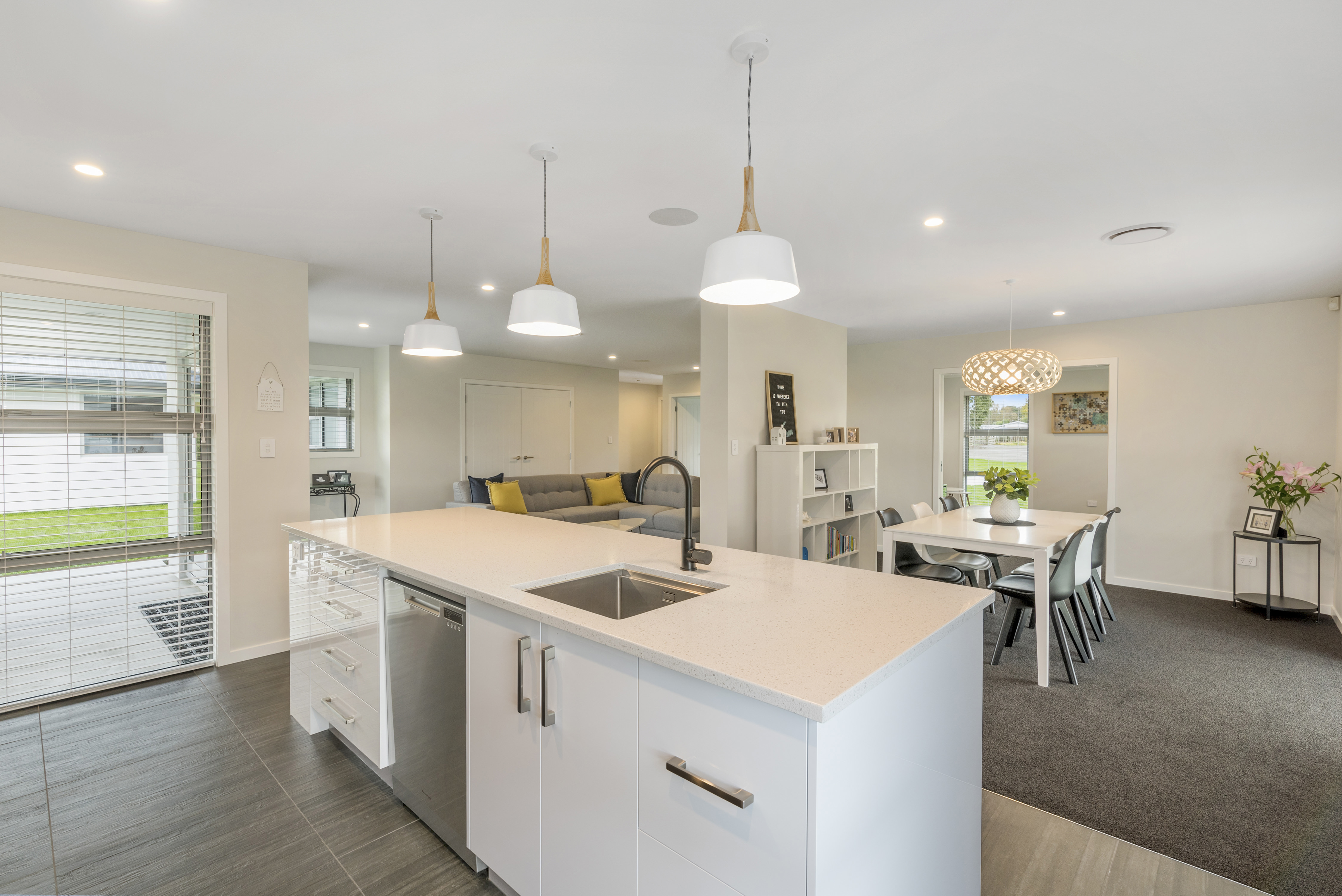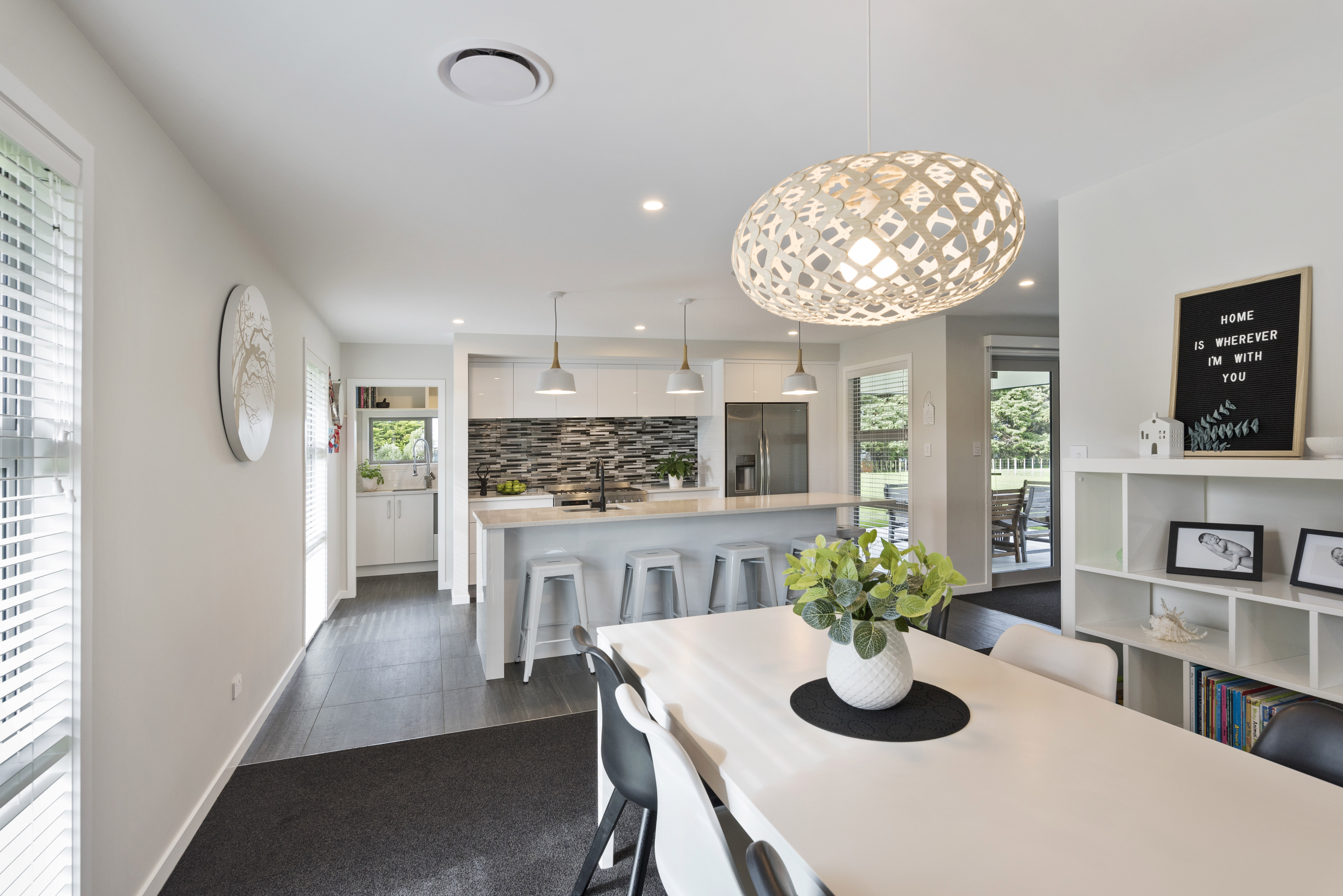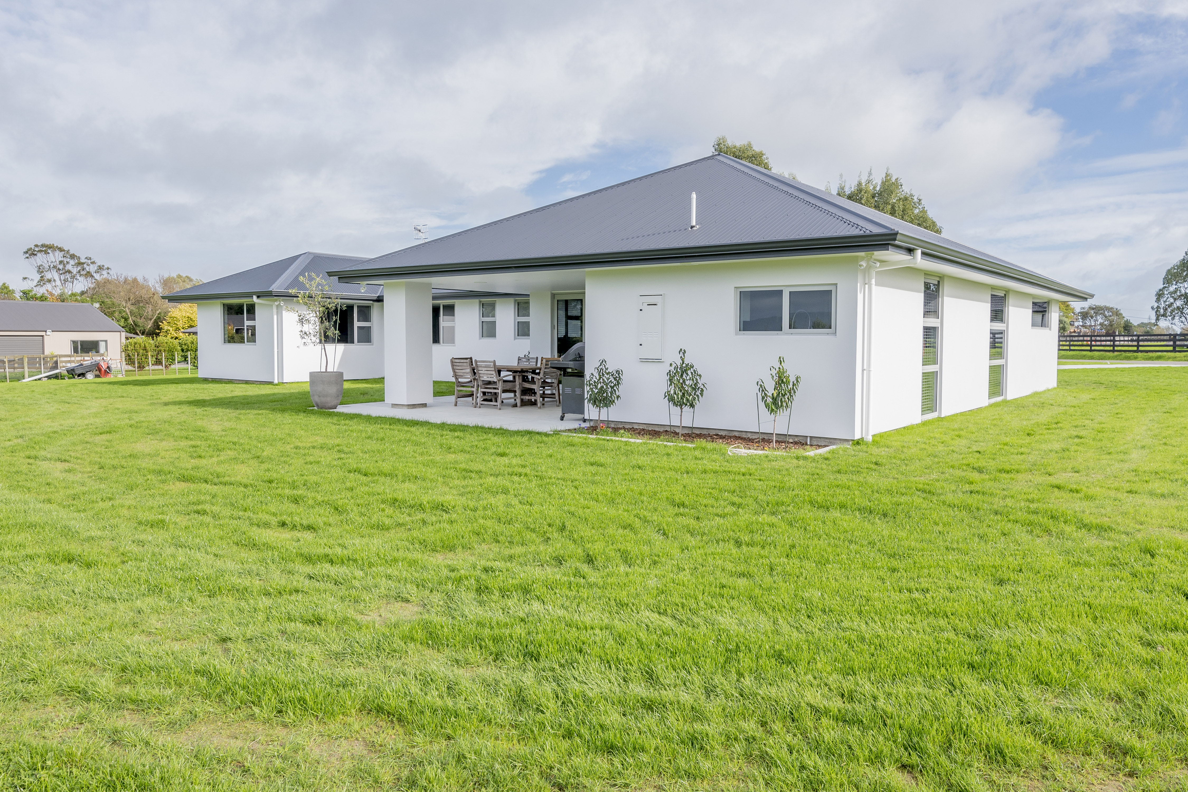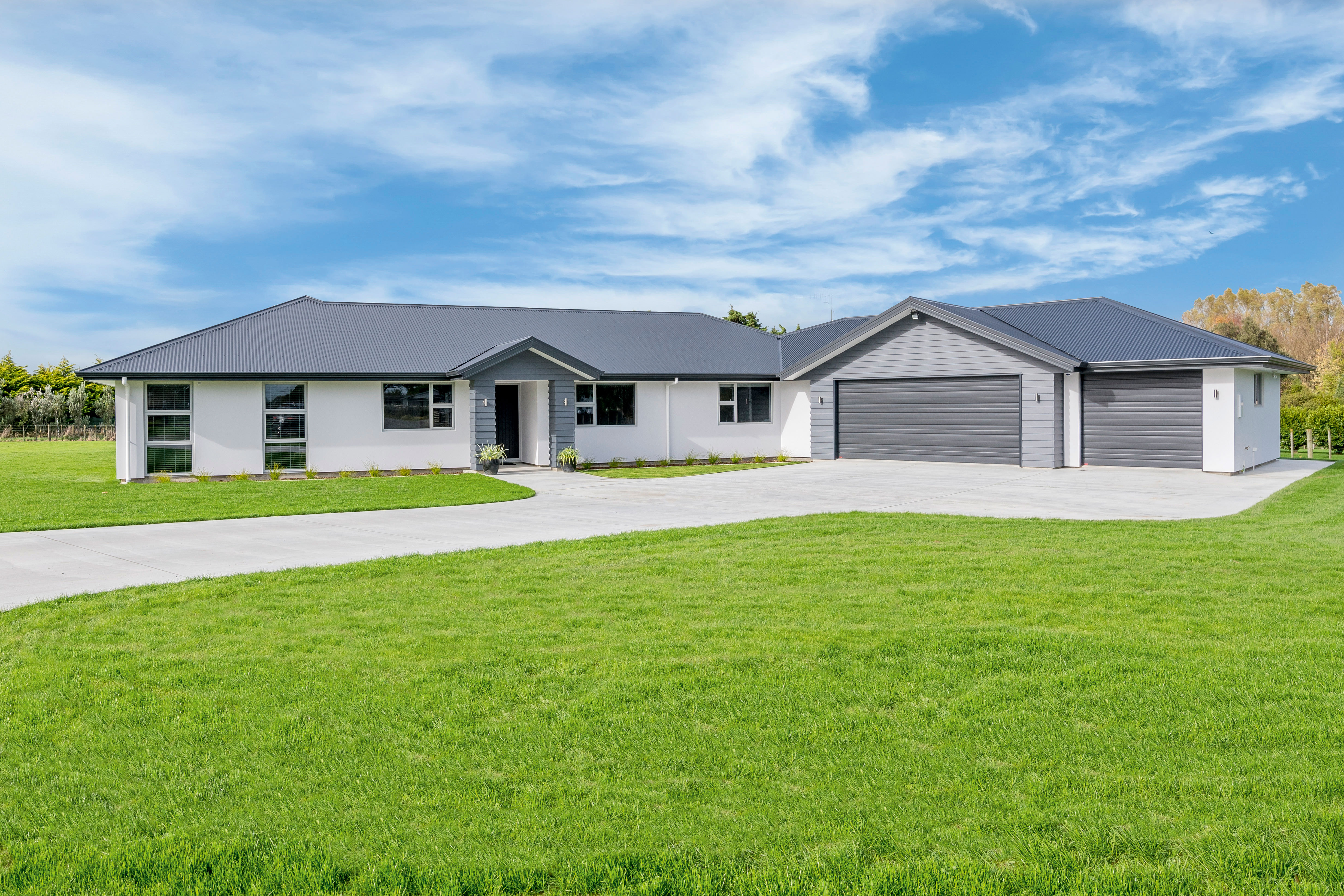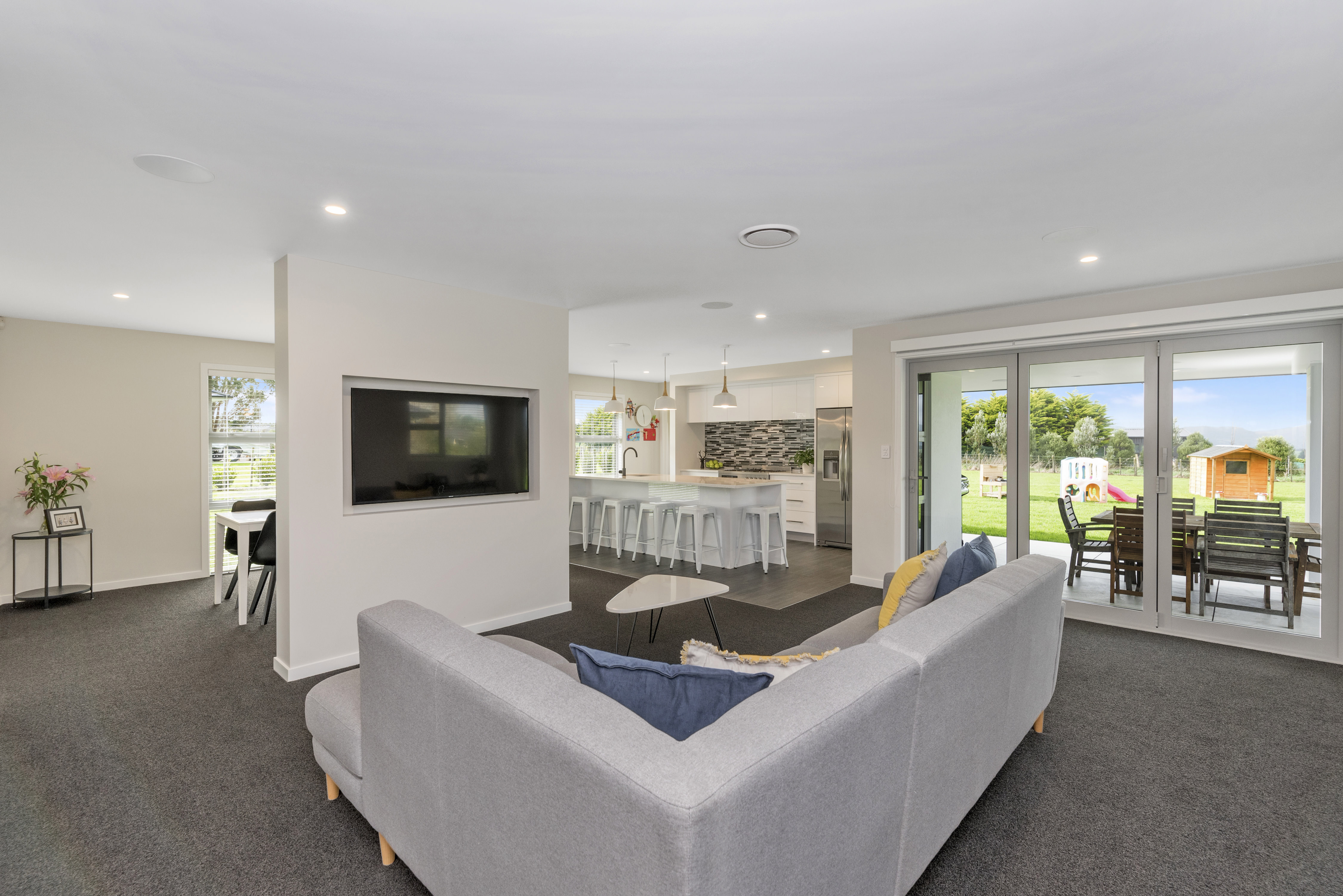 Designed to take advantage of the tranquil outlook, this well-designed home rests in the rolling meadows of Hiwinui, outside Palmerston North. Lifestyle, functionality and aesthetics go hand in hand, delivering a superb environment for a growing family. The entrance beckons you in with its feature wallpaper and lovely tiles. Plush carpet graces the open-plan living area, as do magical views captured through large bifold doors. The roofline extends to create an alfresco entertainment area that’s protected from the elements. Subtle divisions foster an appealing feeling of space in the living area. A formal lounge and study nook can both be opened or closed off from the main living zone. The high-gloss kitchen features a scullery with views. The main passageway leads to a triple garage, laundry, fully tiled main bathroom and four bedrooms. The master suite is spectacular with a double walk-in robe and fully tiled ensuite with level entry shower. A ducted heating system doubles as a cooling device in summer. This is a home for all seasons.